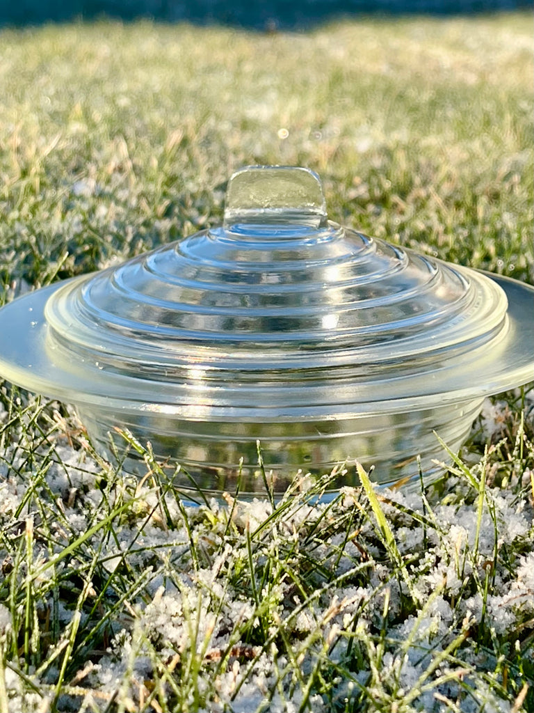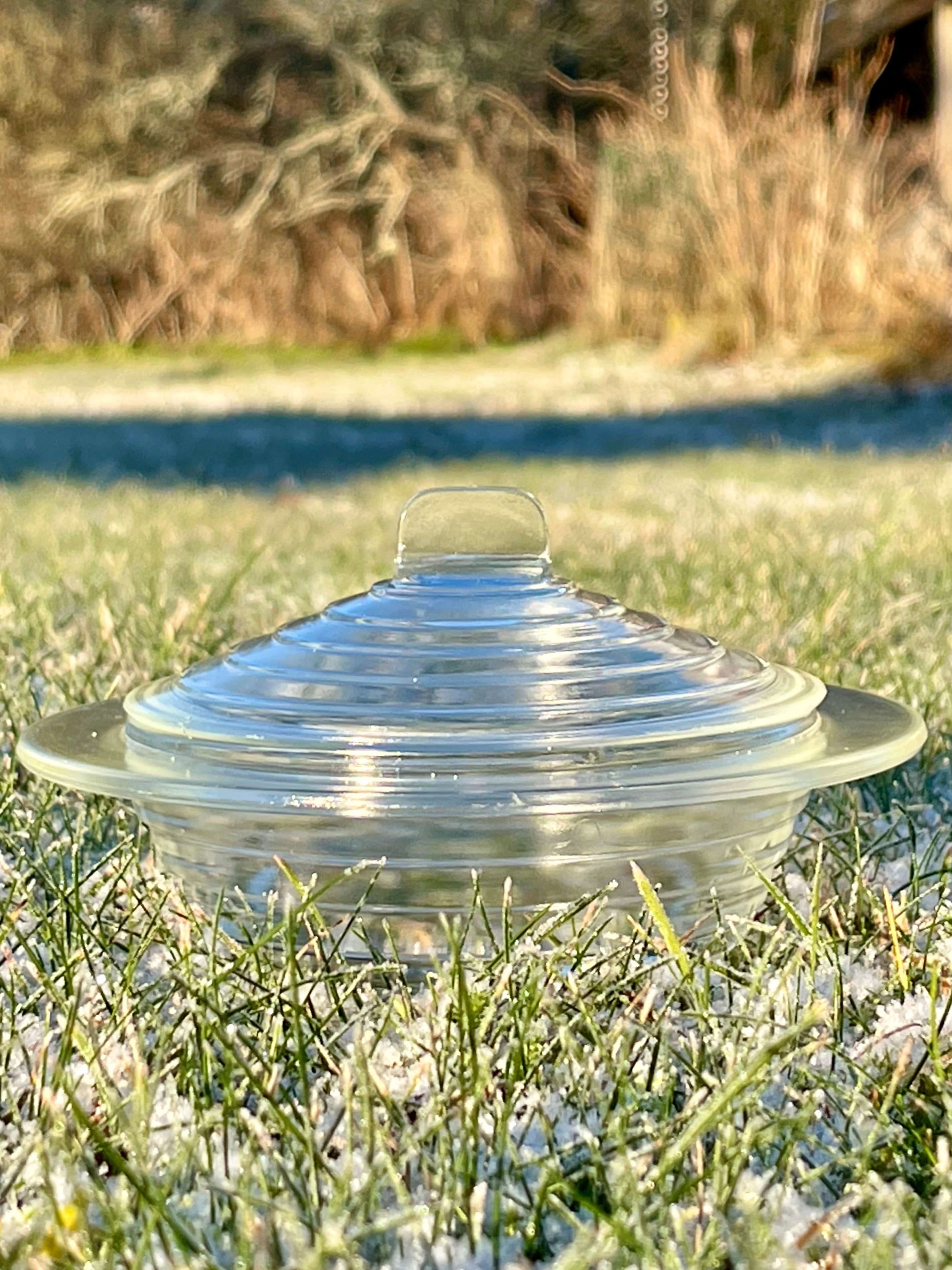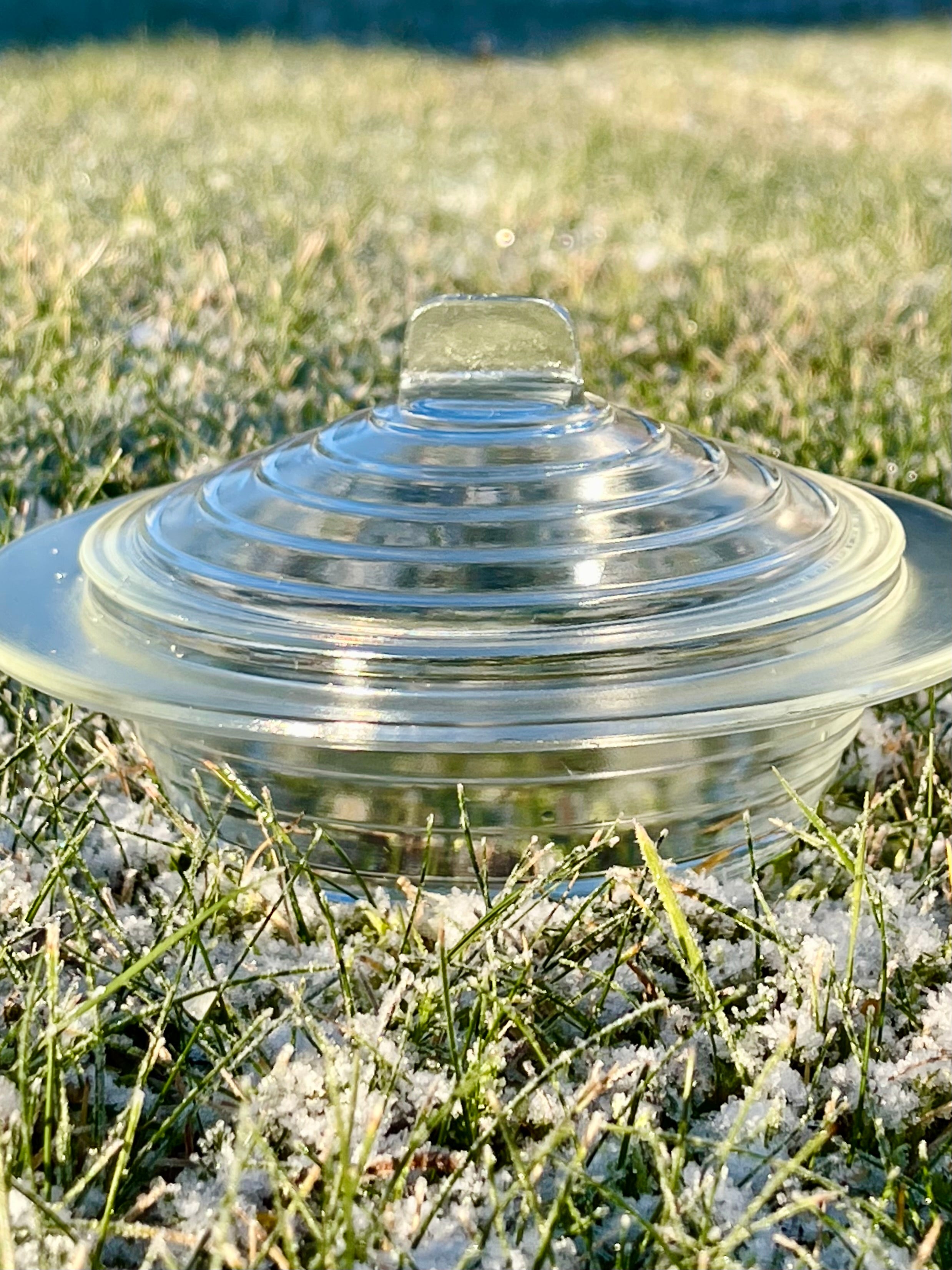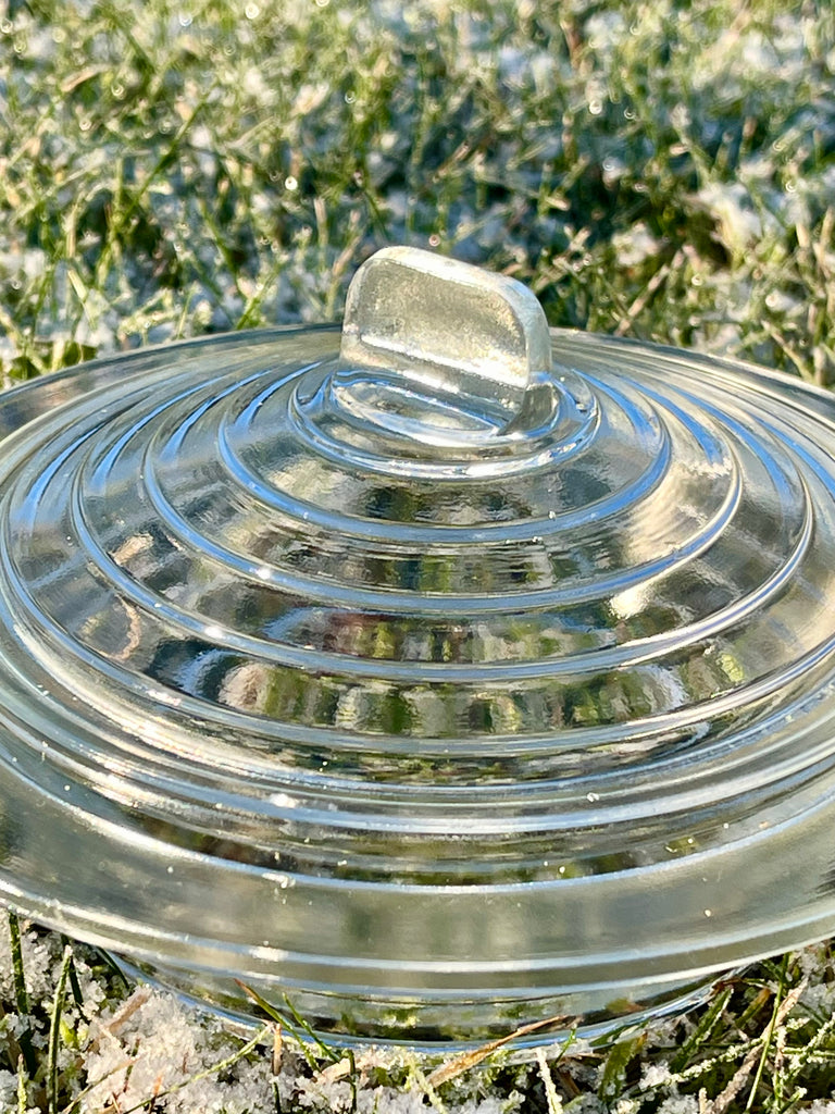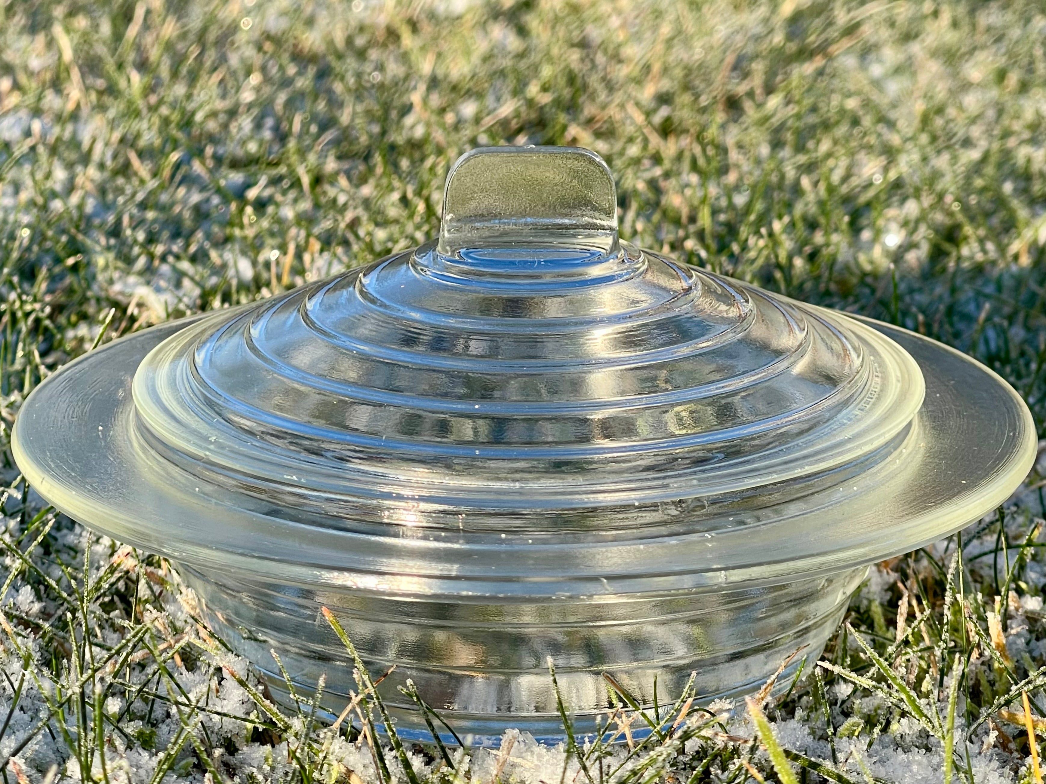 Tillverkad av Iittala/Karhula, smörask i glas formgiven av Aino Aalto. Observera att det finns ett nagg i skålens inre kant. Utöver det i gott skick.