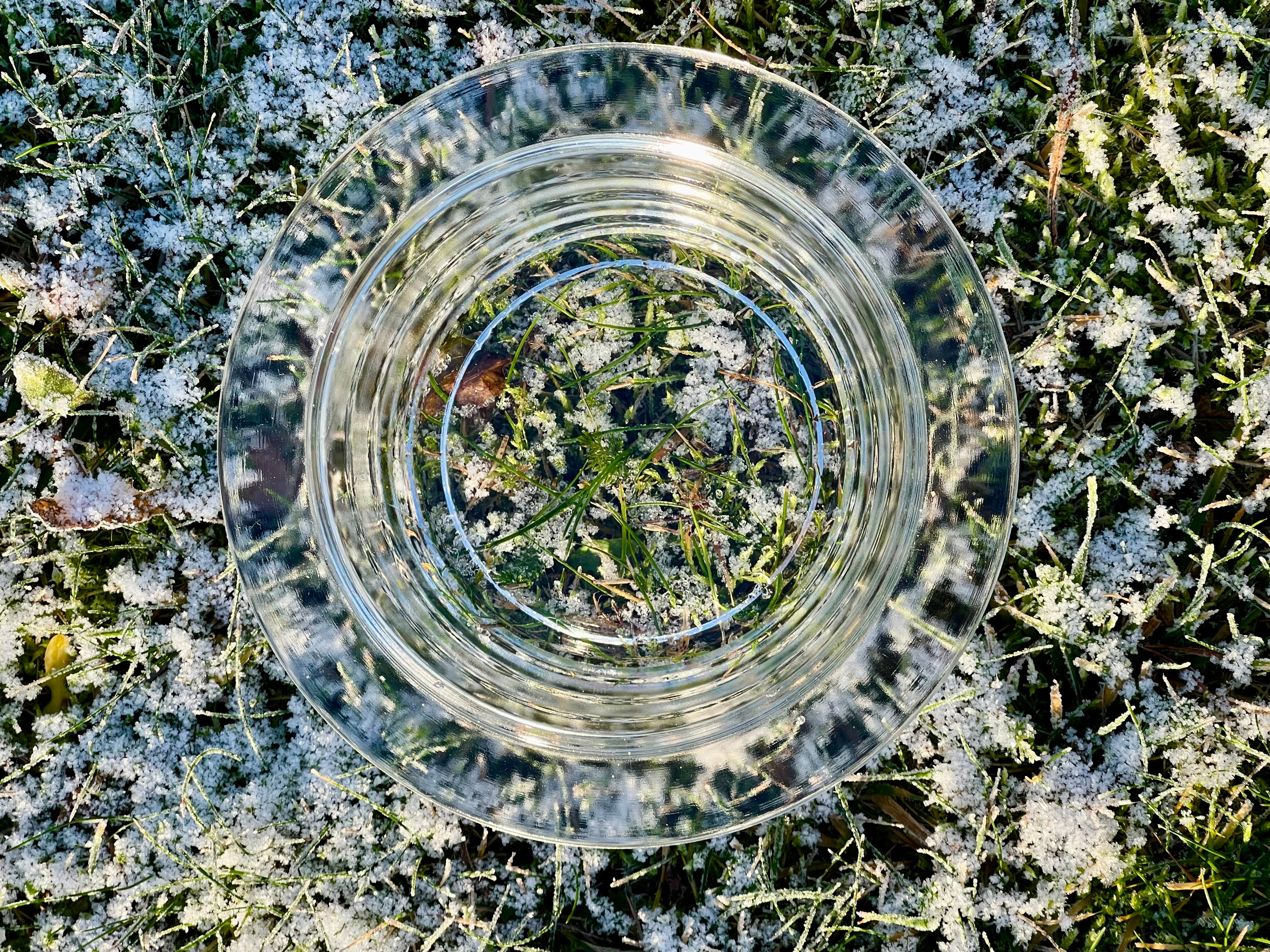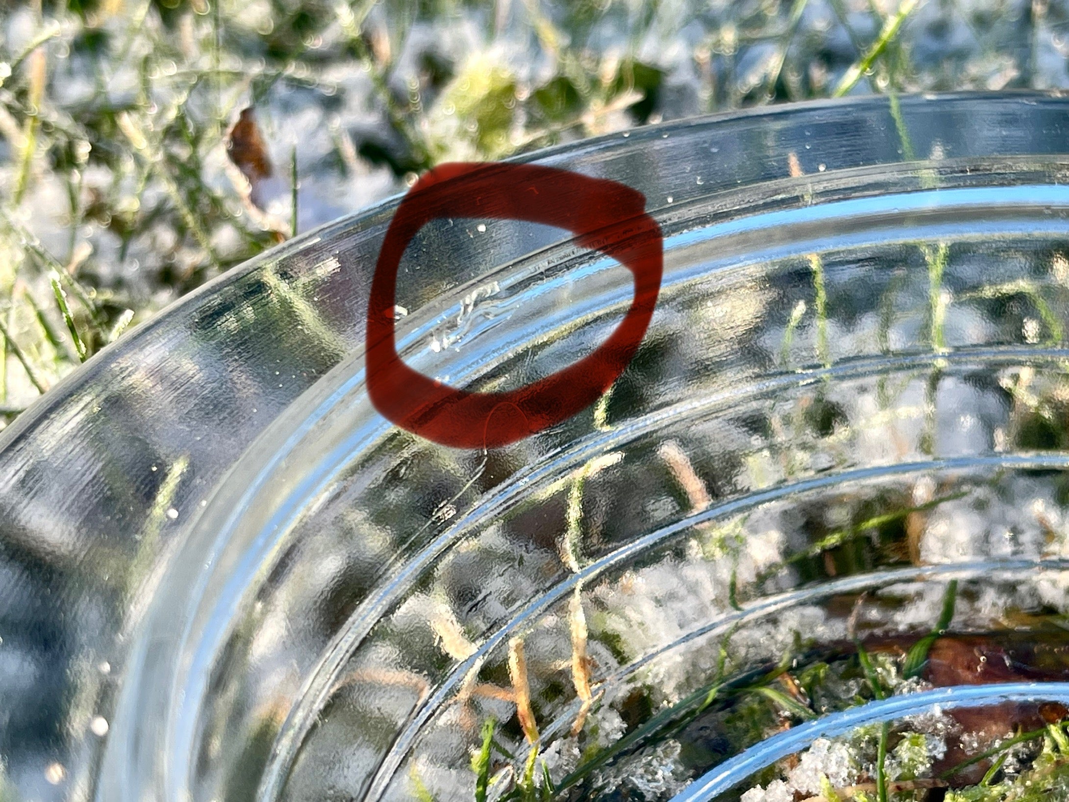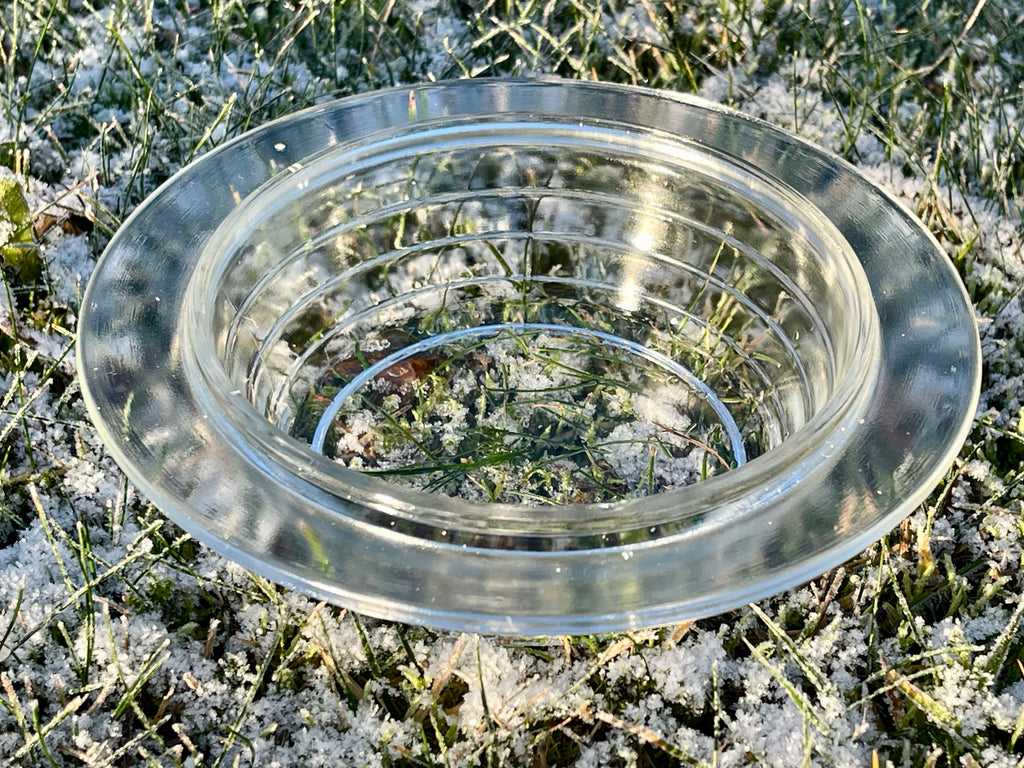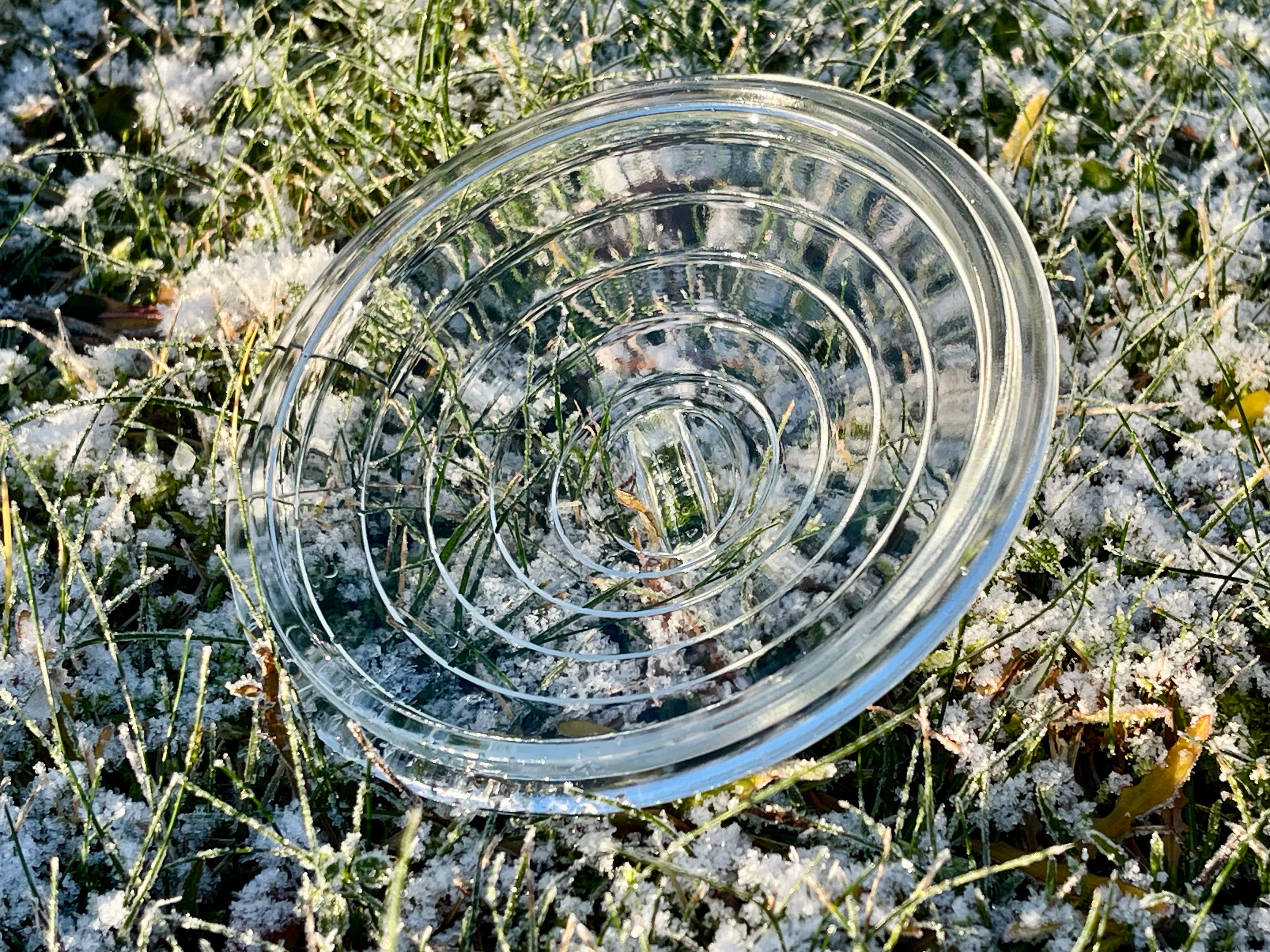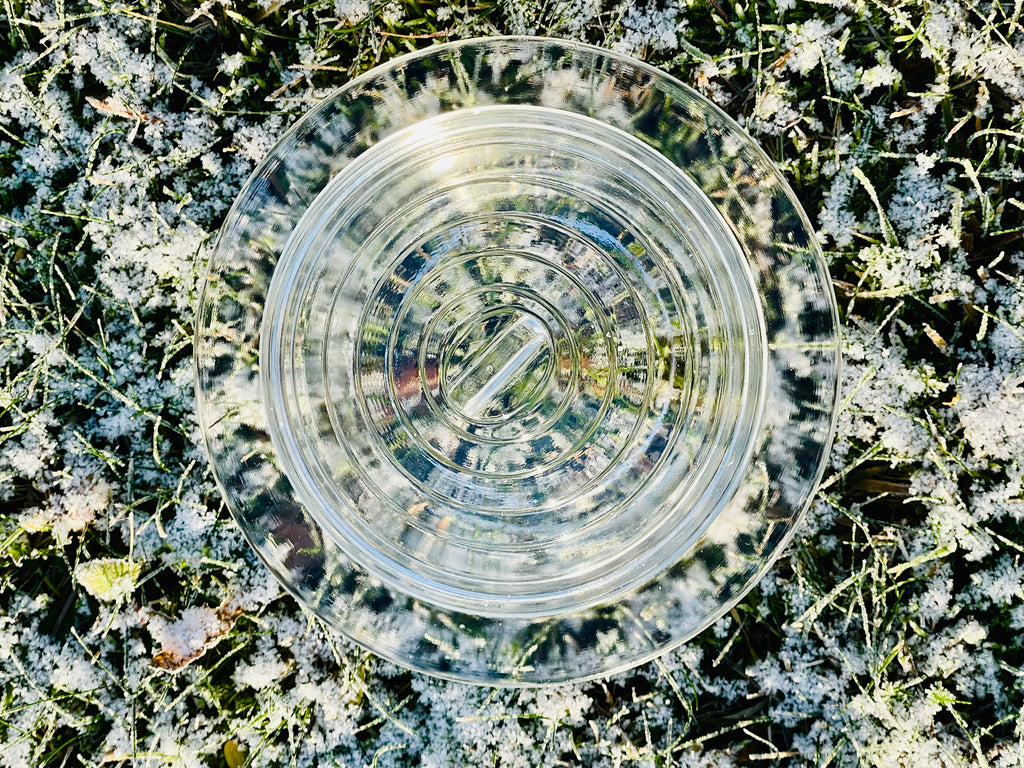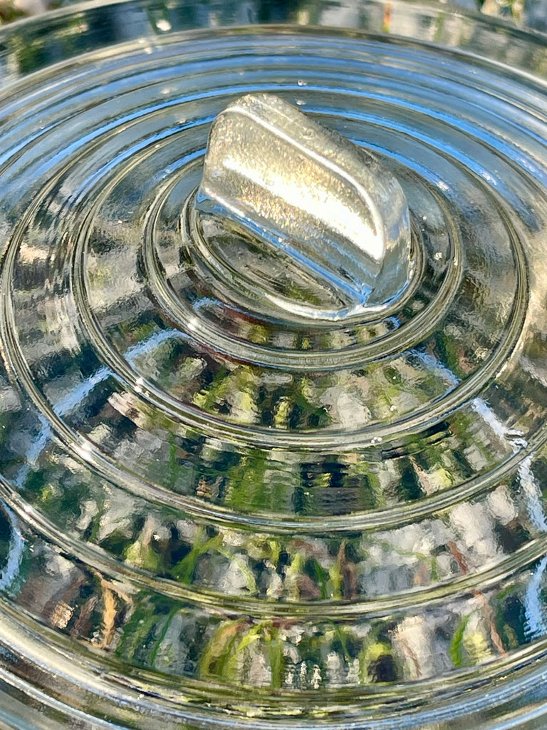 Tillverkad av Iittala/Karhula, smörask i glas formgiven av Aino Aalto. Observera att det finns ett nagg i skålens inre kant. Utöver det i gott skick.