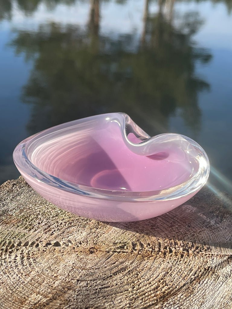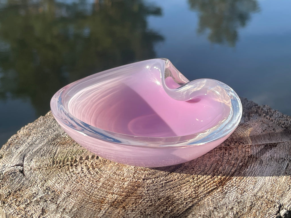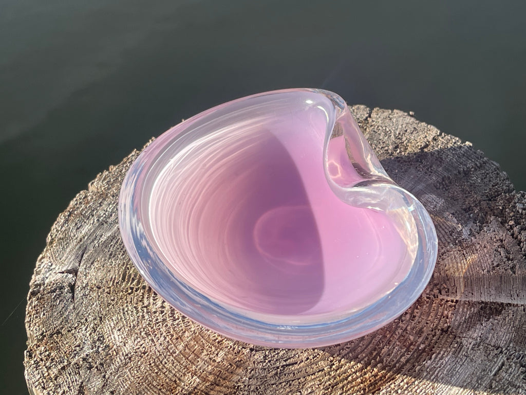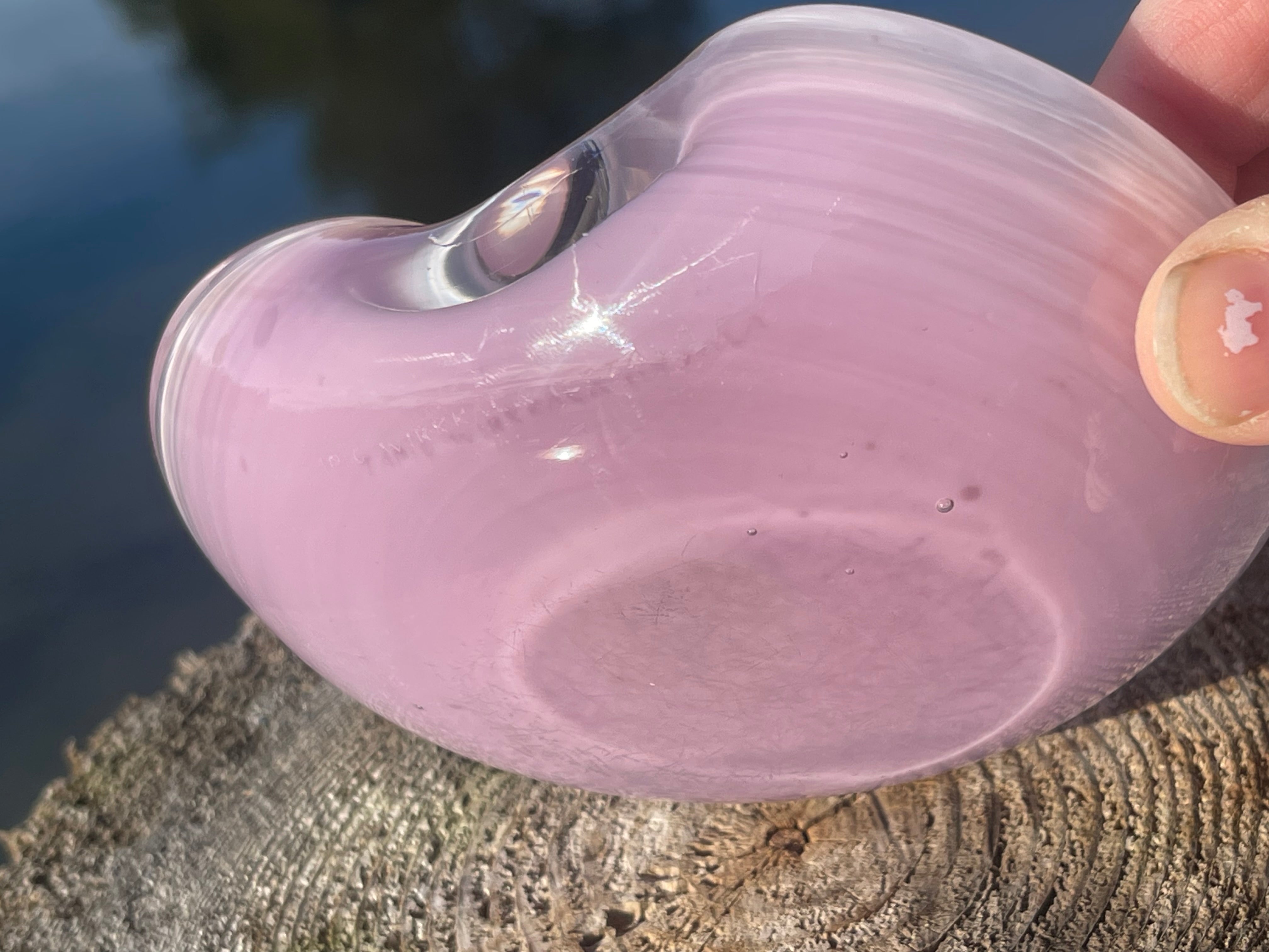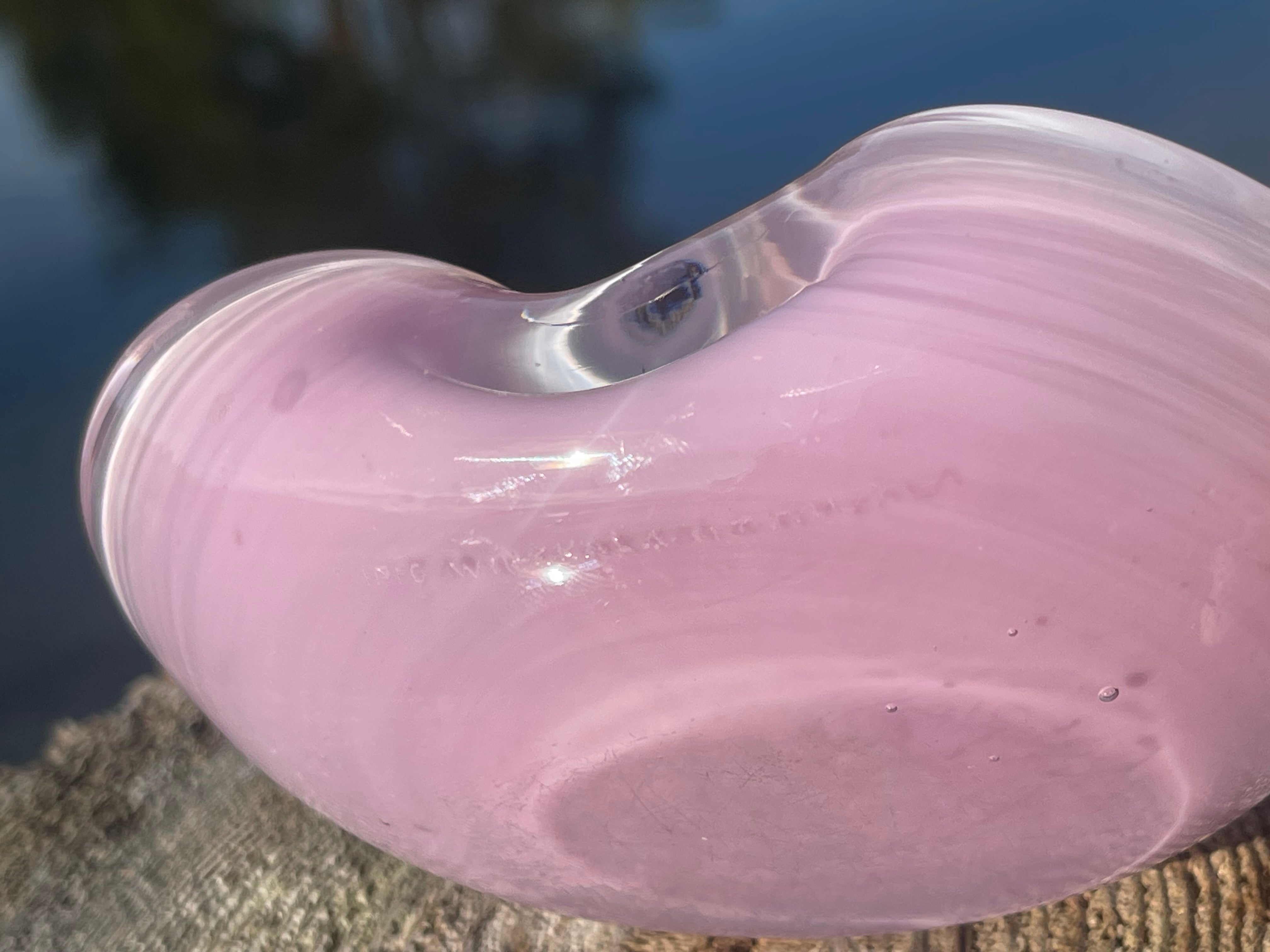 i allmänt gott skick, hel och fin men små repor förekommer både undertill och i själva skålen. 6 st. små luftbubblor finns i glasmassan undertill.