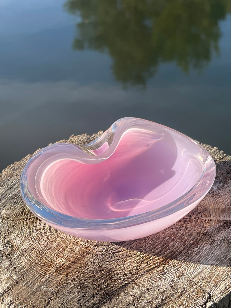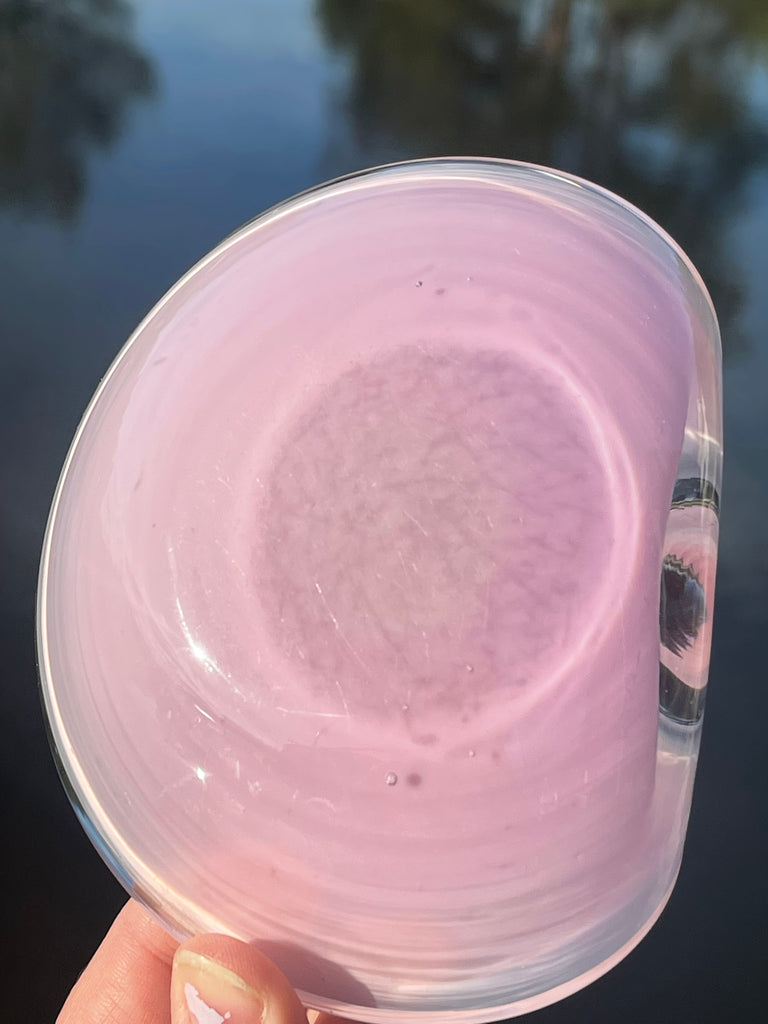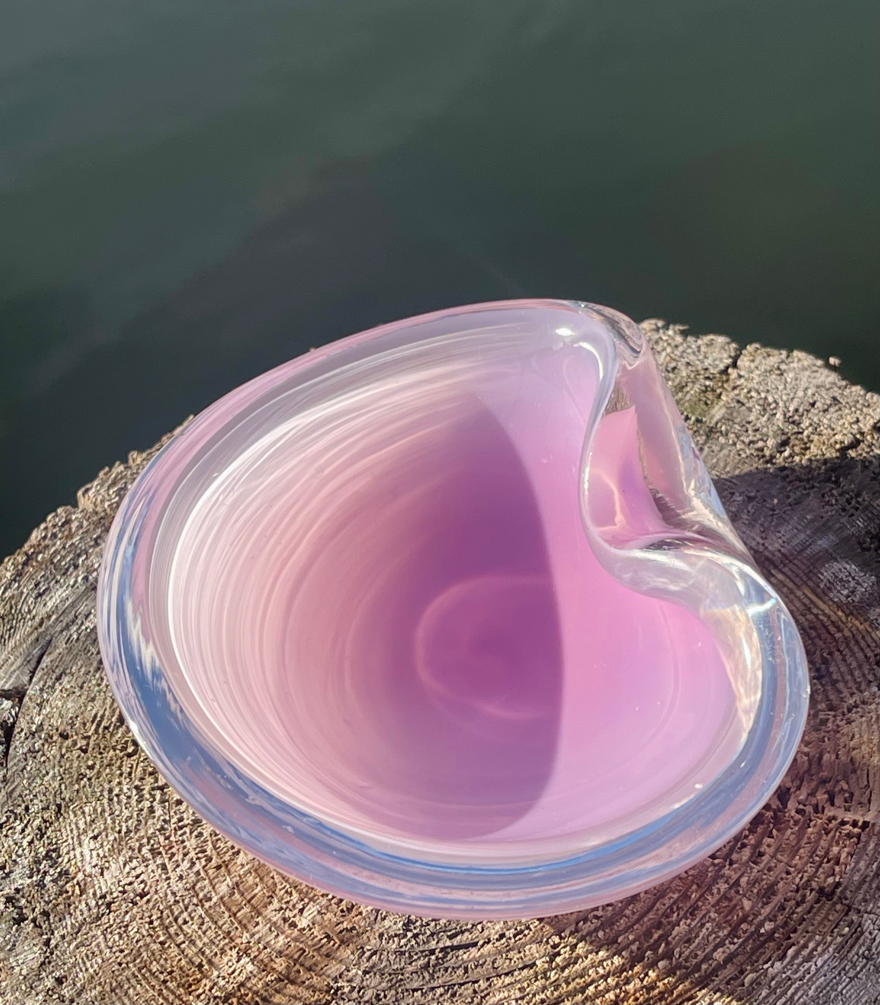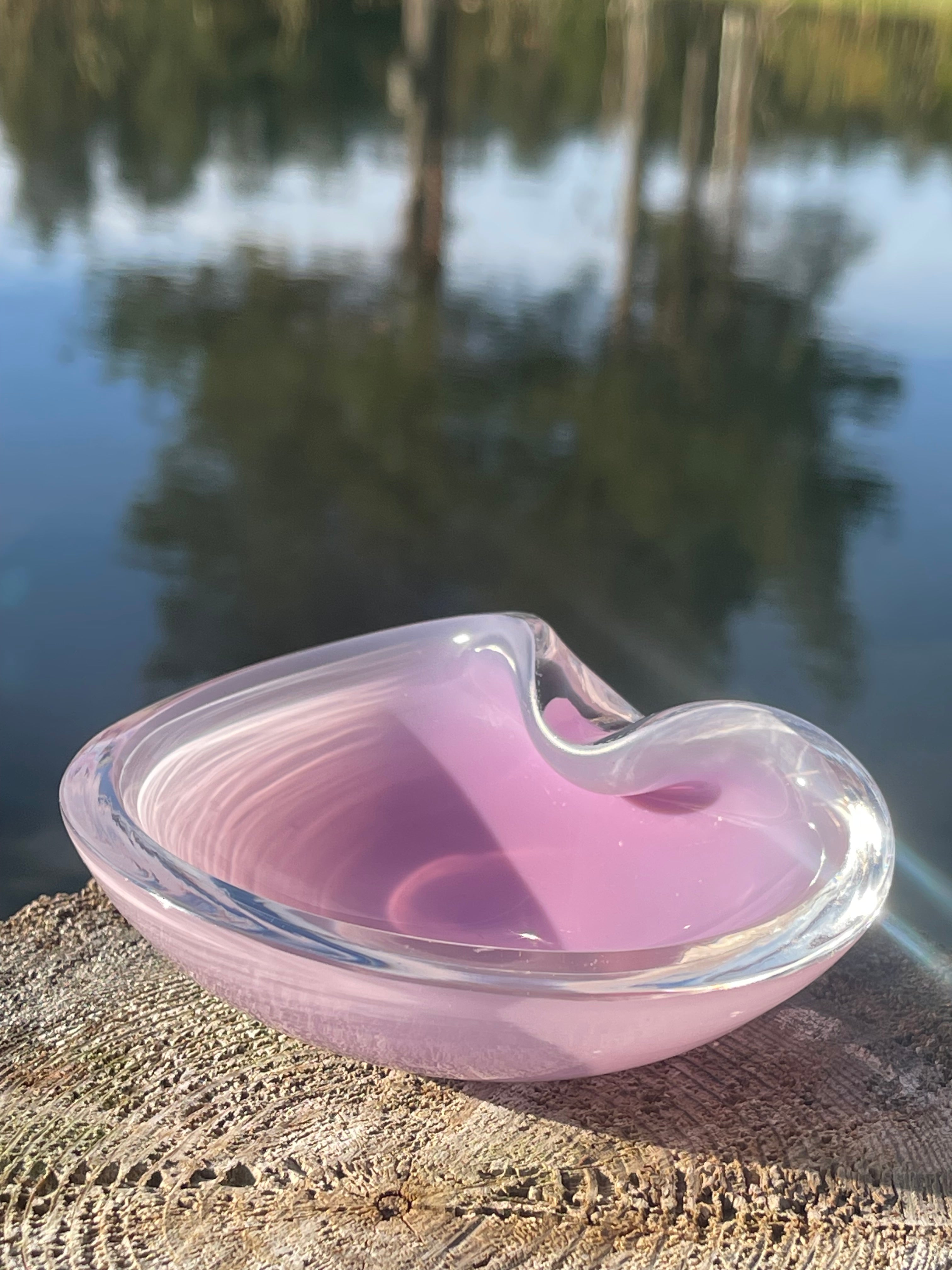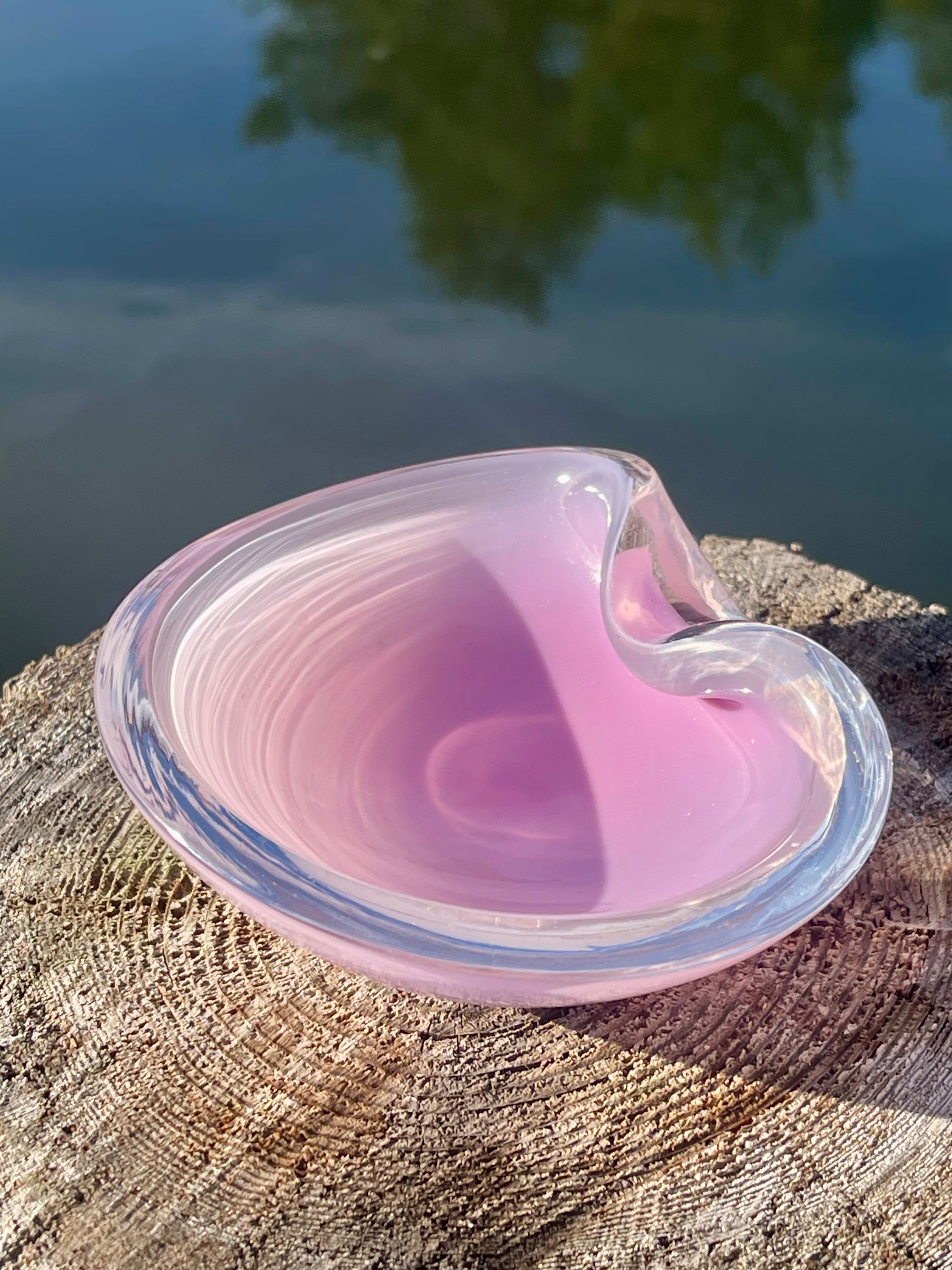 i allmänt gott skick, hel och fin men små repor förekommer både undertill och i själva skålen. 6 st. små luftbubblor finns i glasmassan undertill.