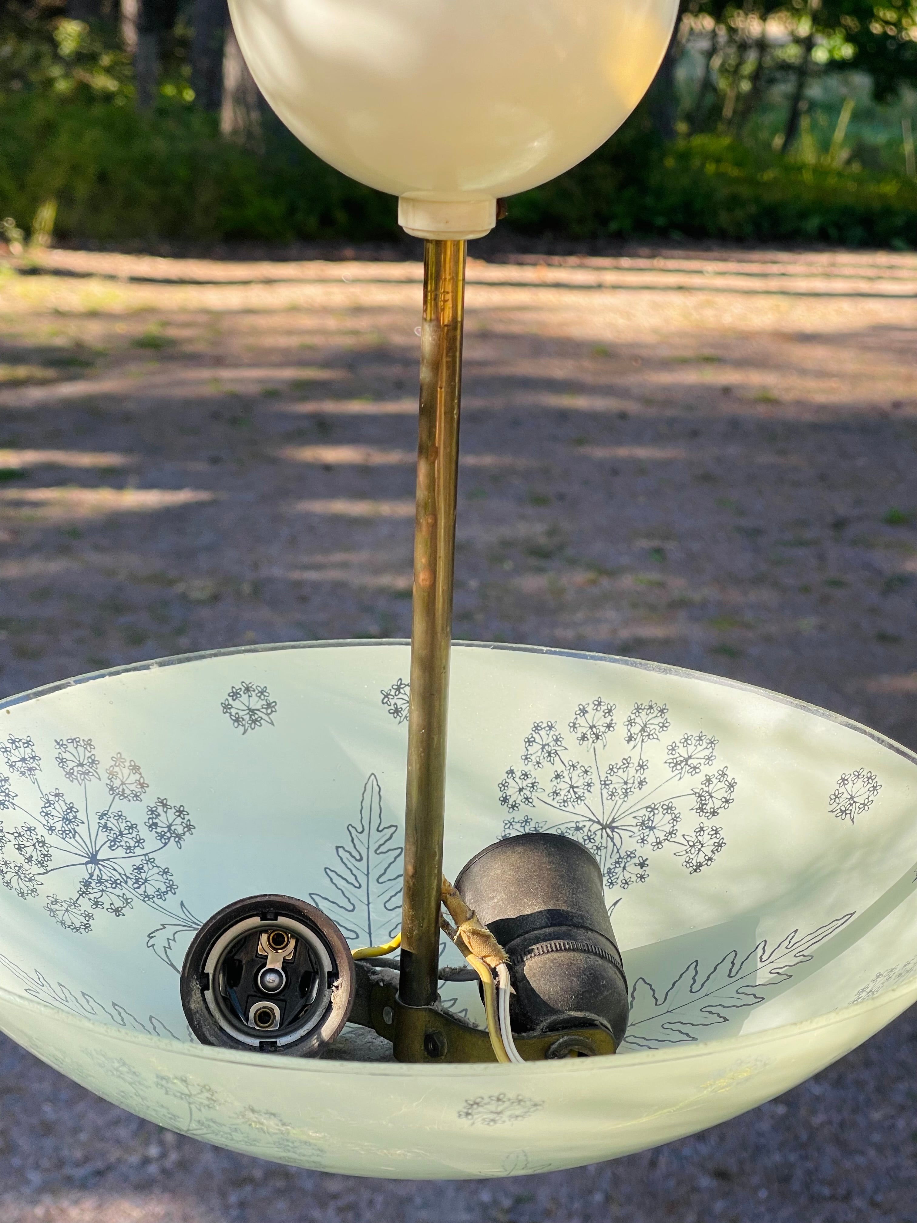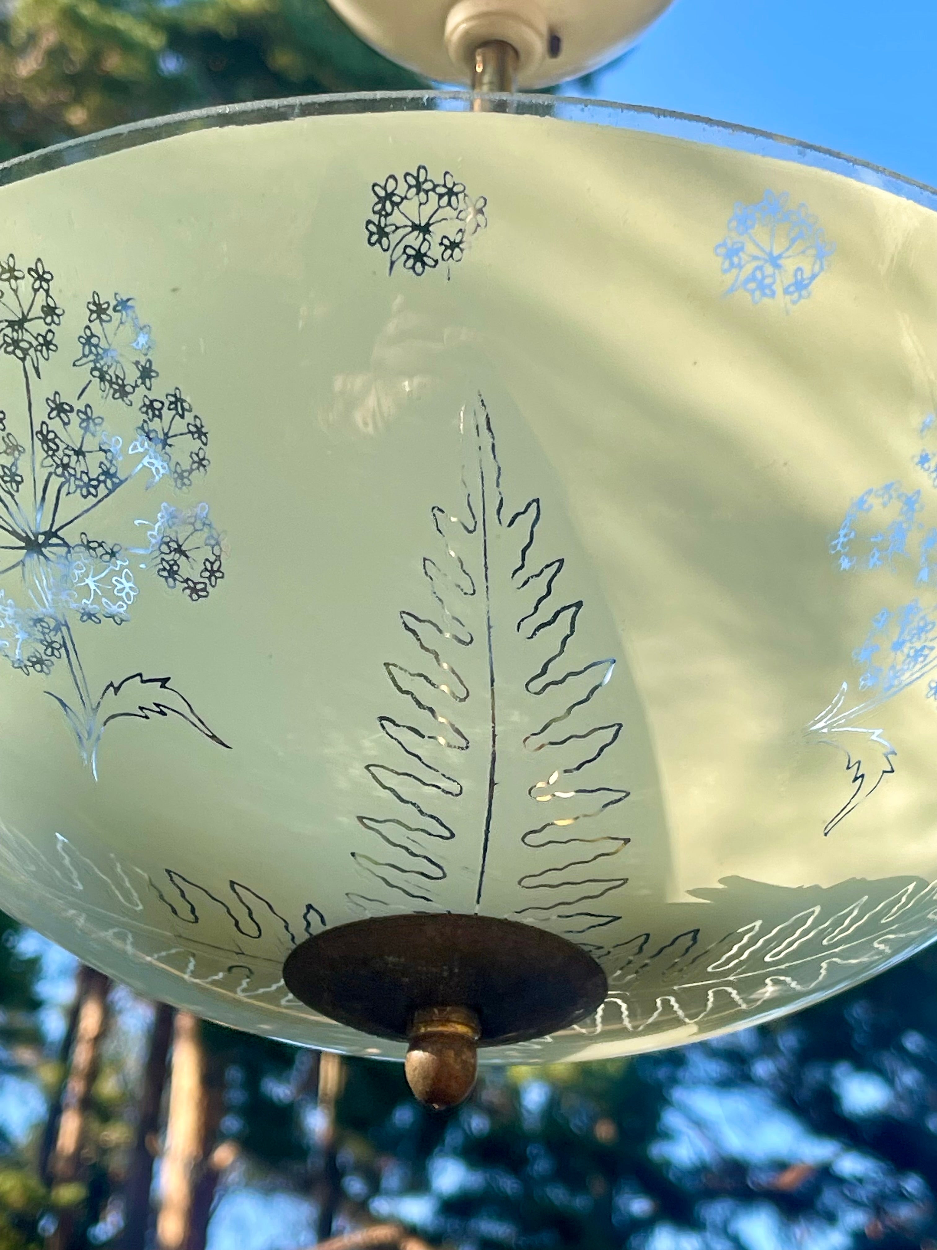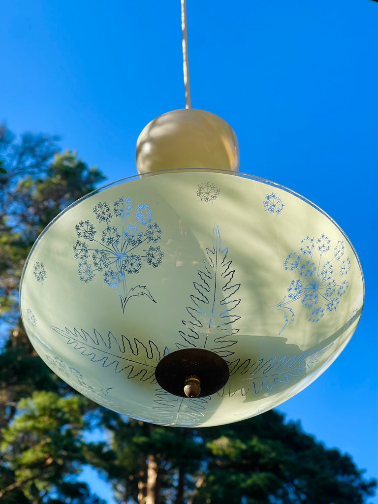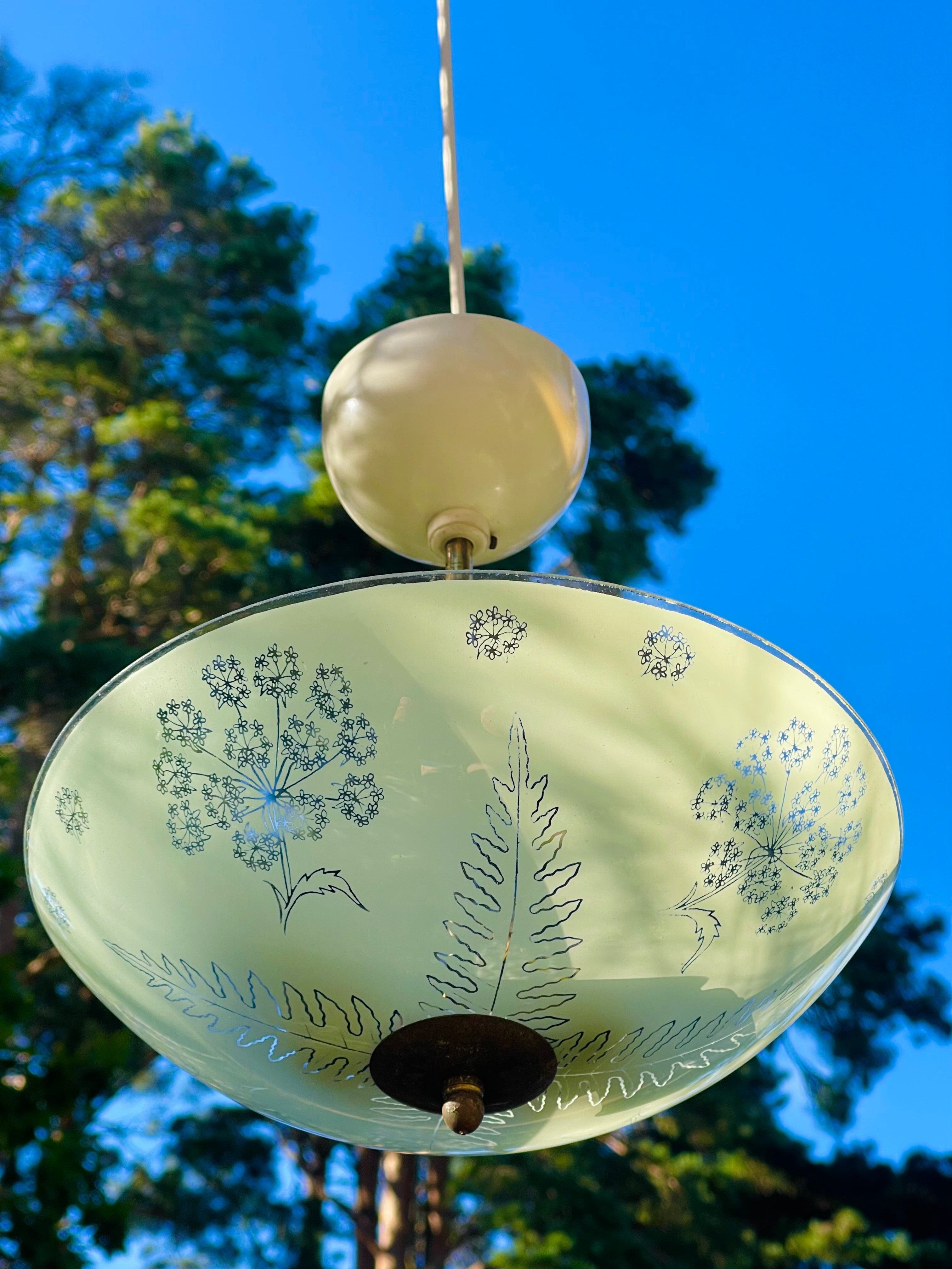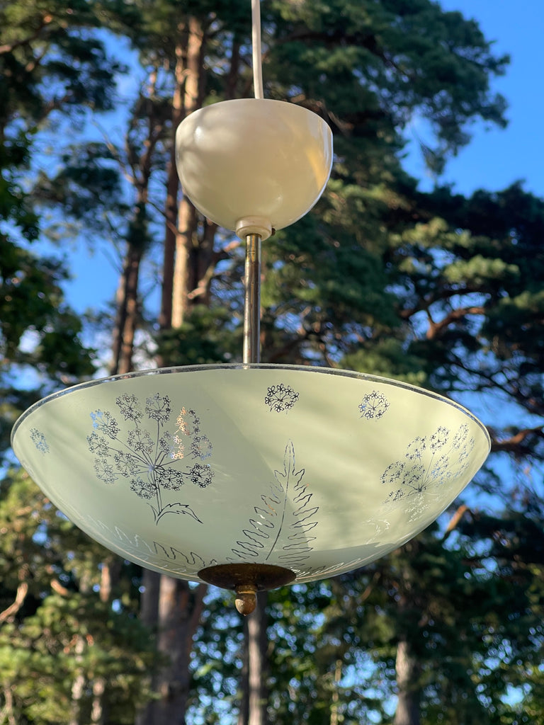 Vacker och skir taklampa tillverkad av finska Lasipaino Oy, ca. 1940-tal.