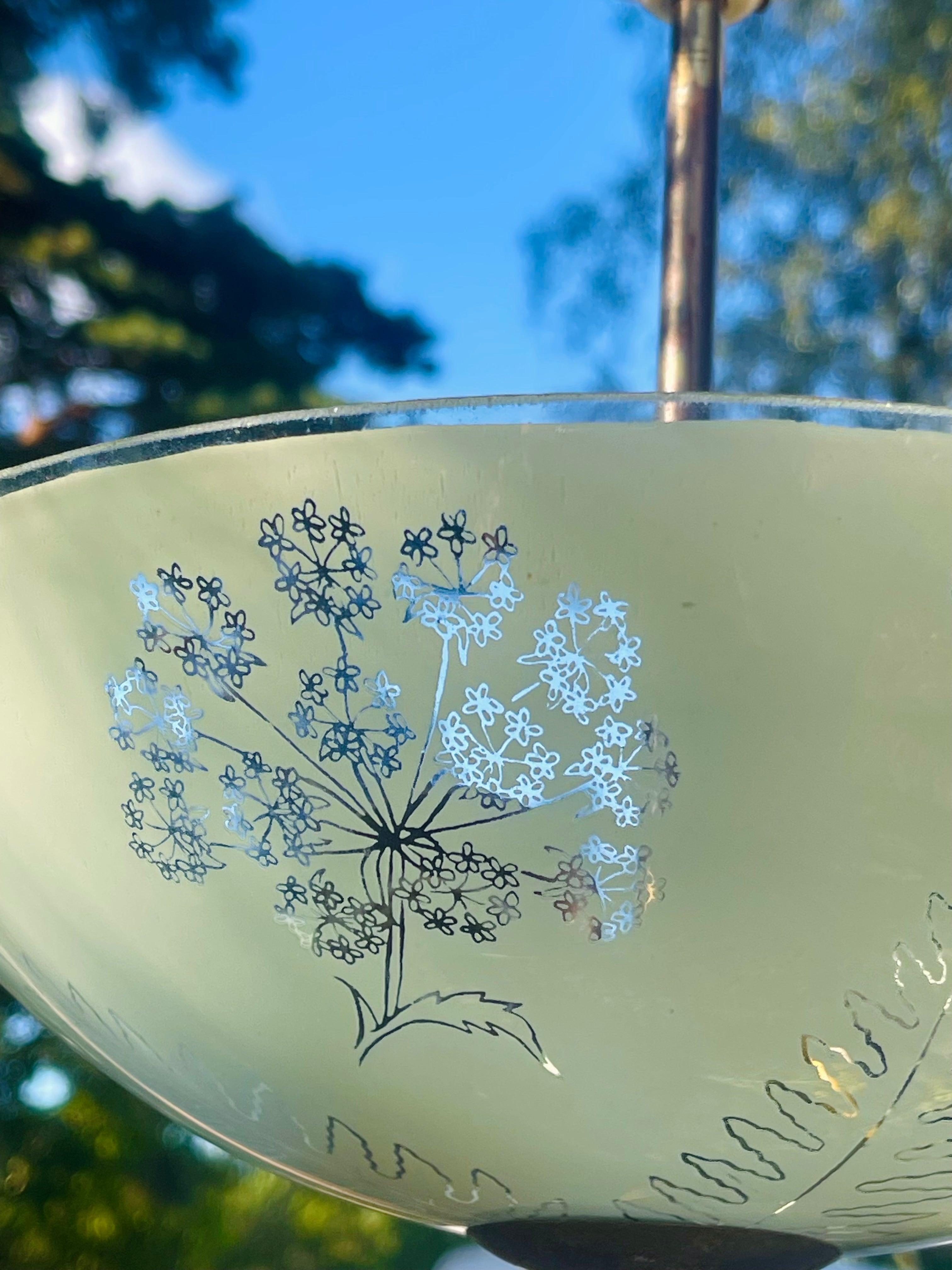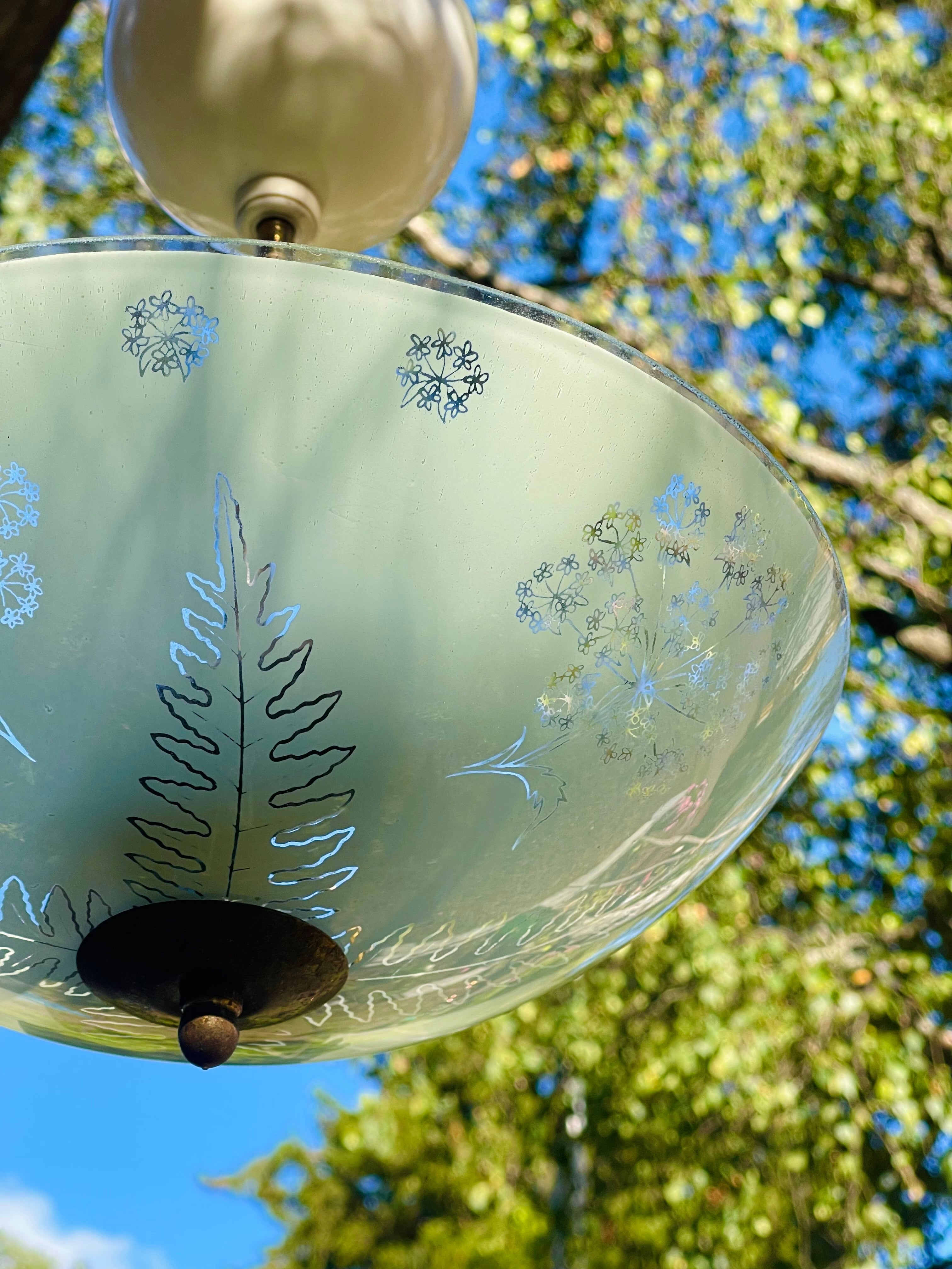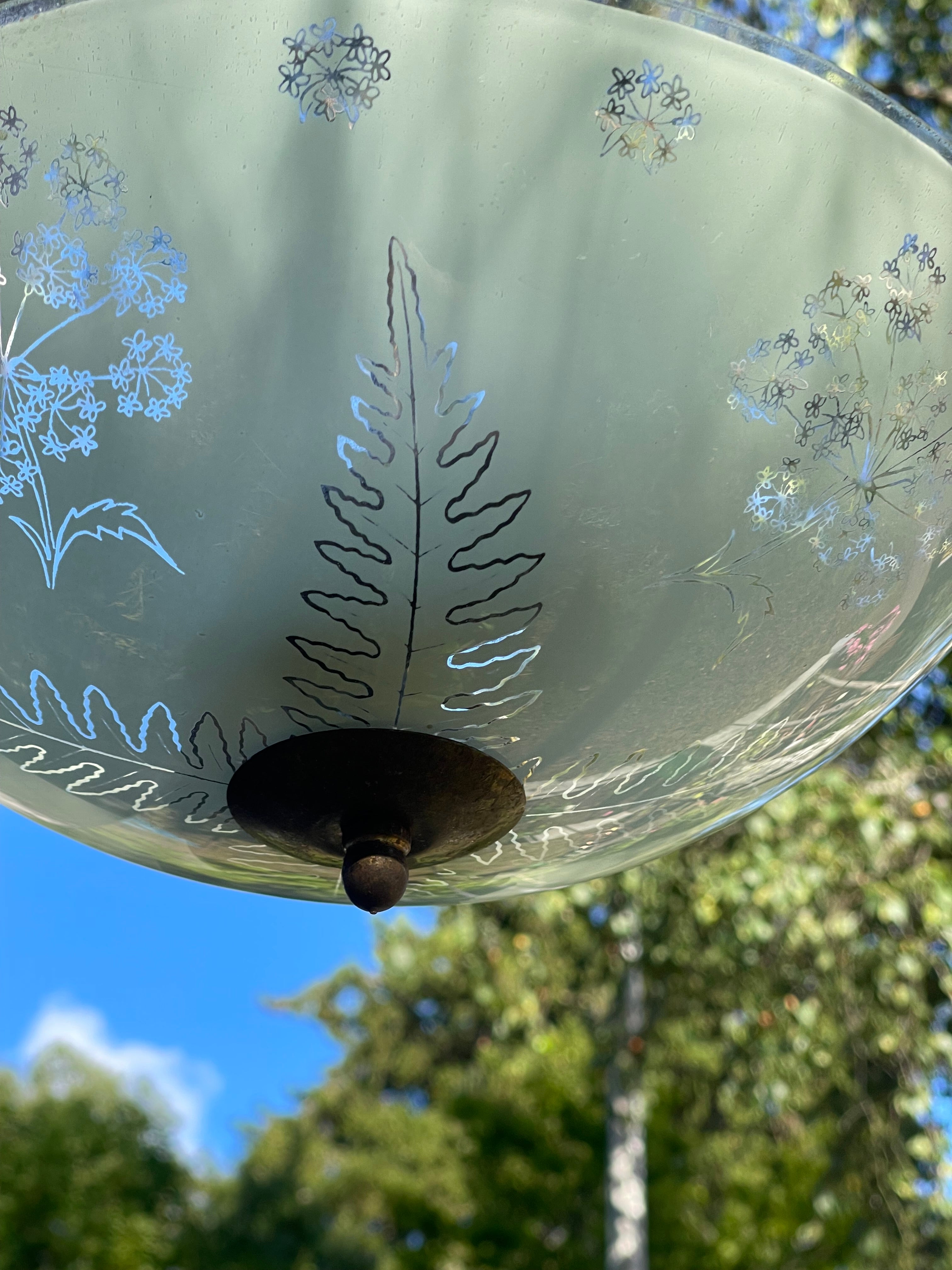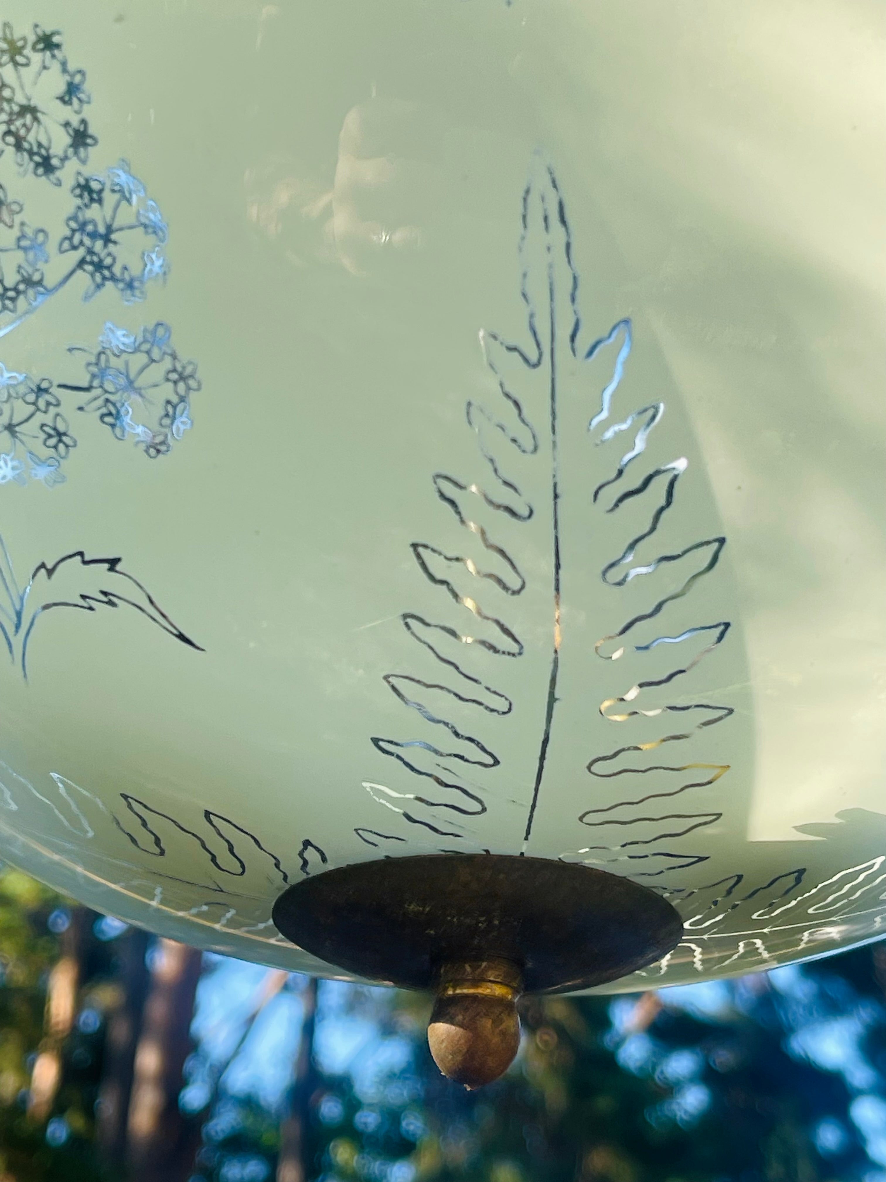 Vacker och skir taklampa tillverkad av finska Lasipaino Oy, ca. 1940-tal.