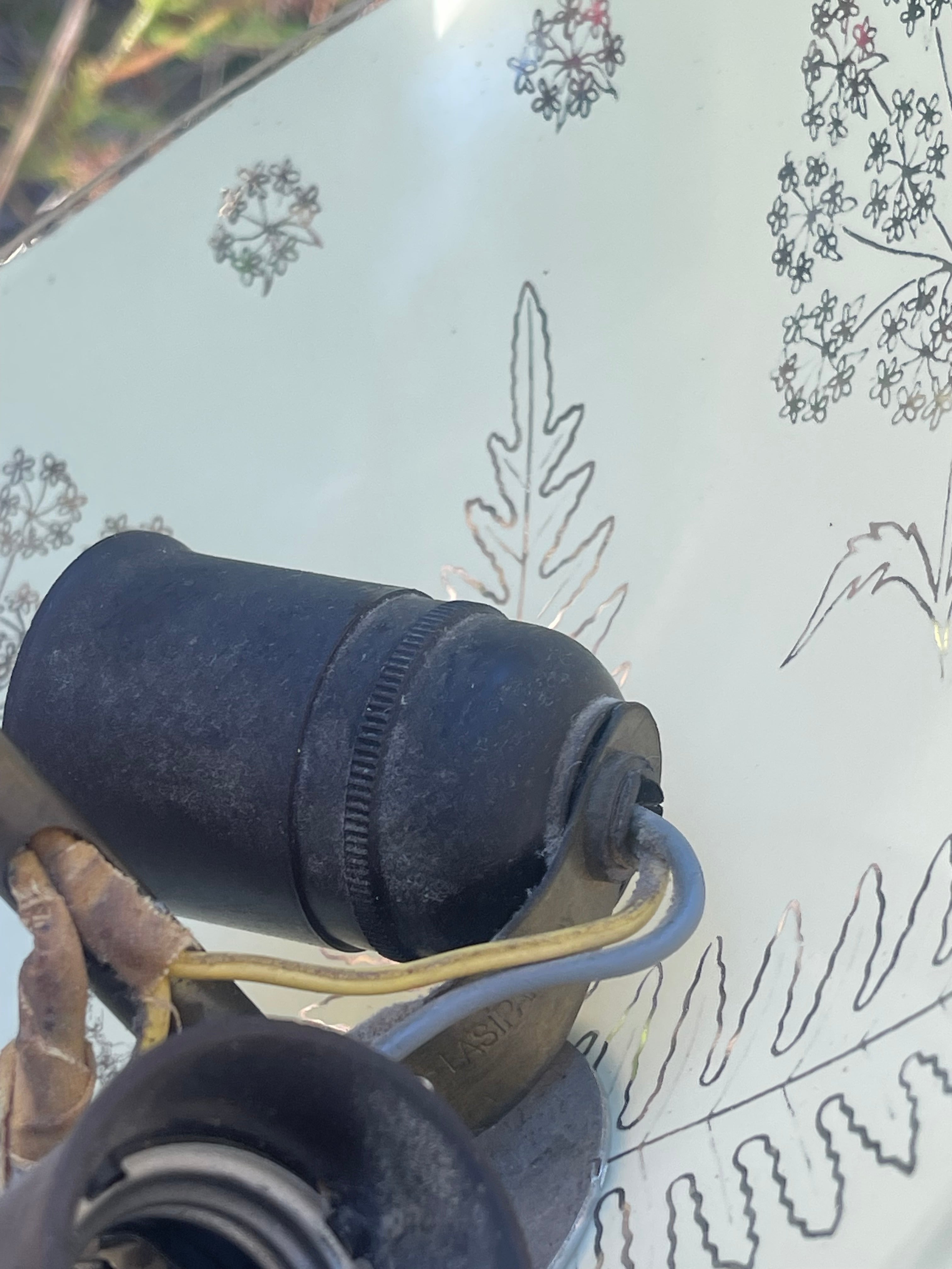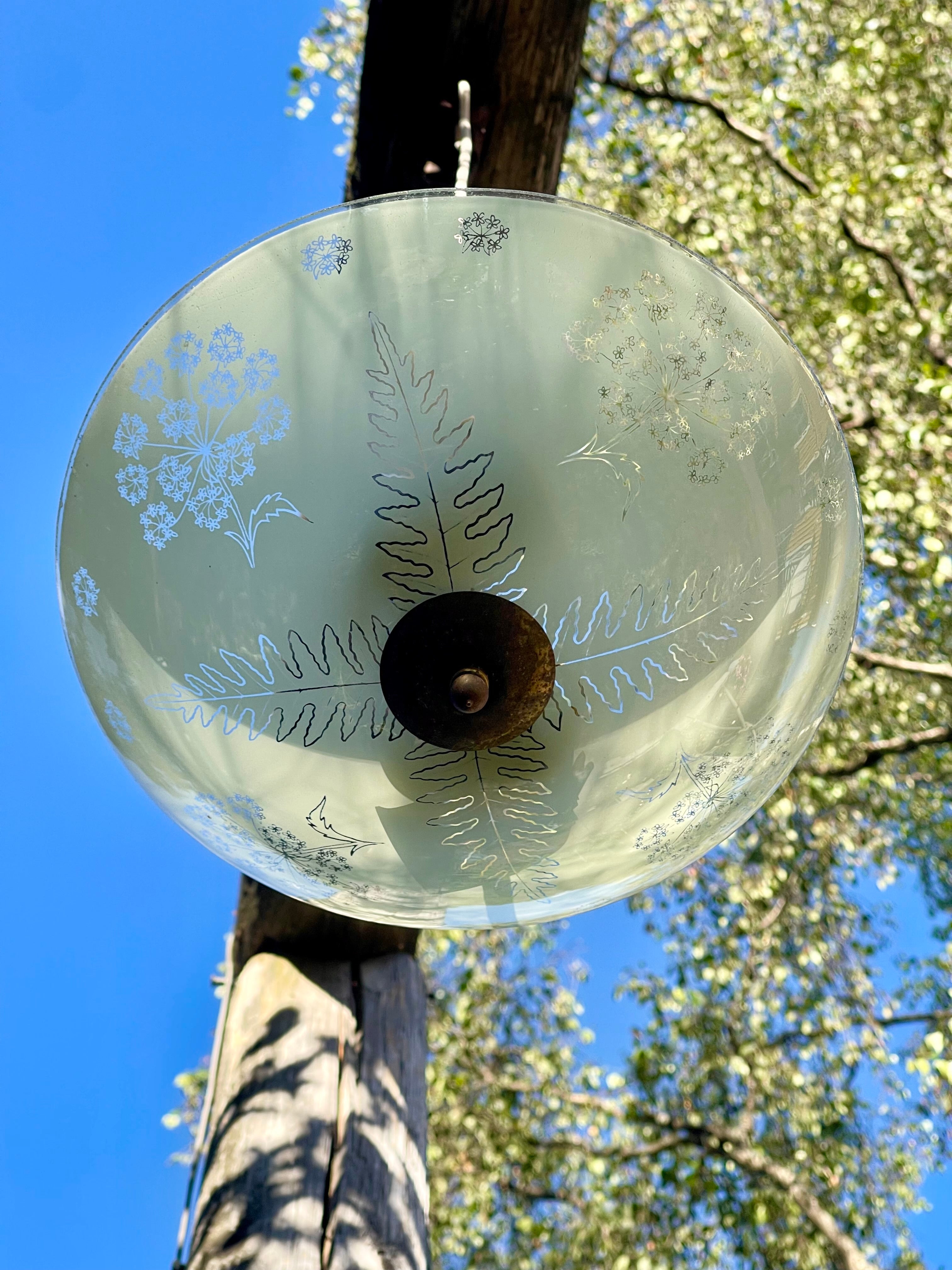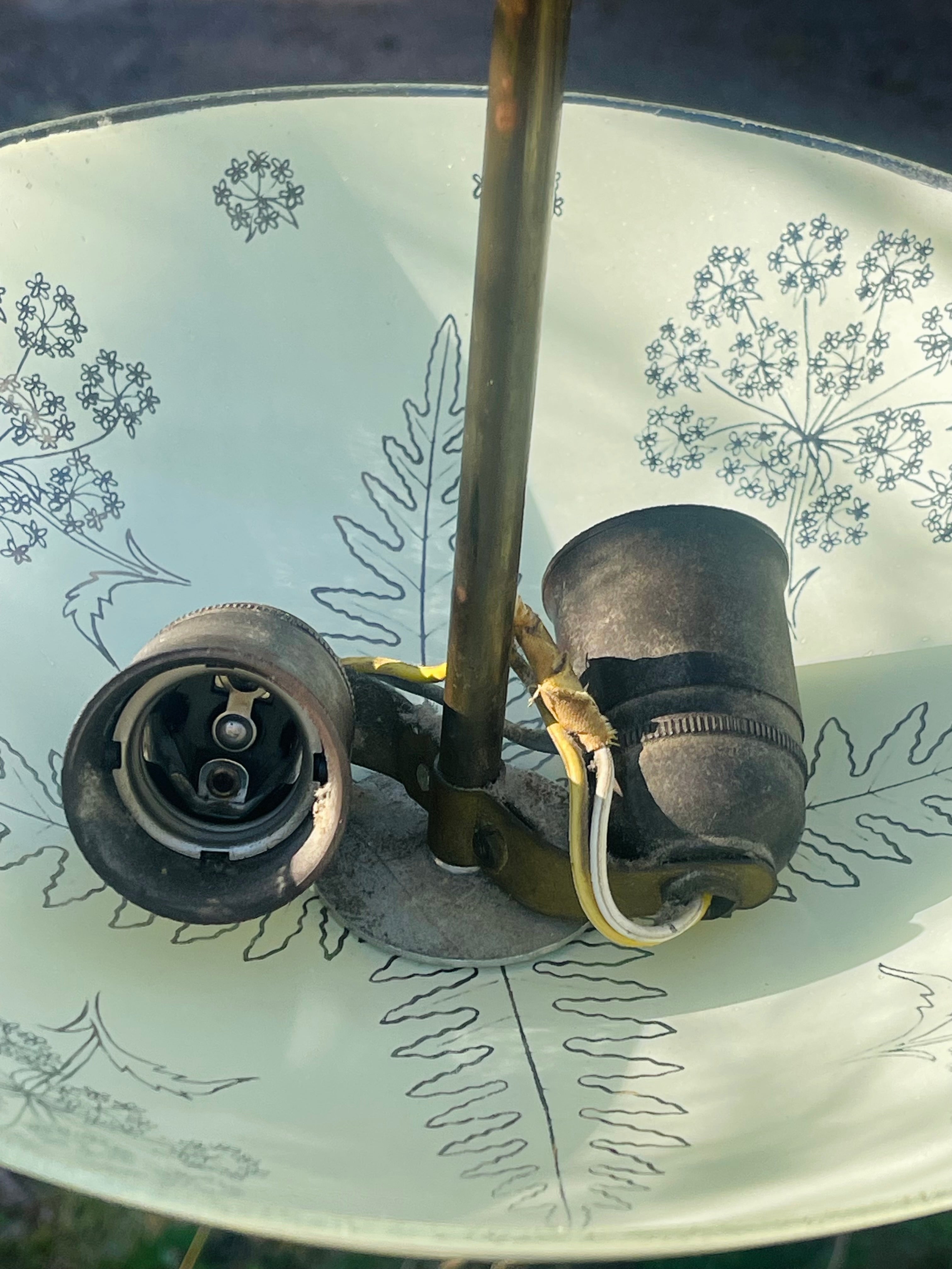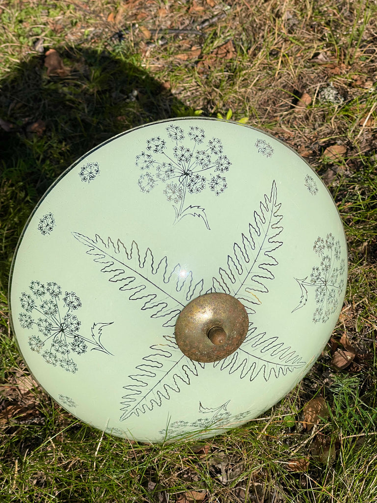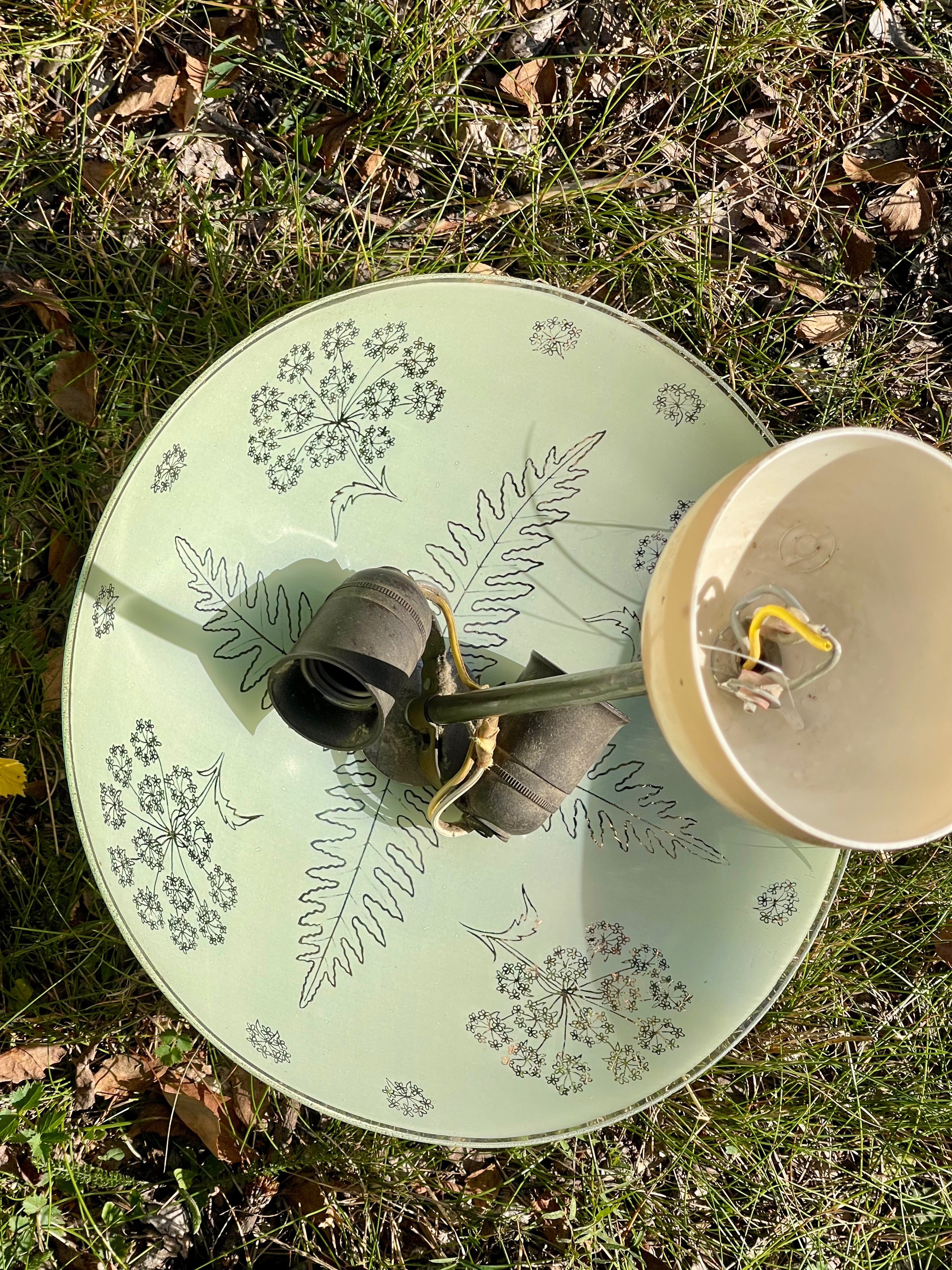 Vacker och skir taklampa tillverkad av finska Lasipaino Oy, ca. 1940-tal.