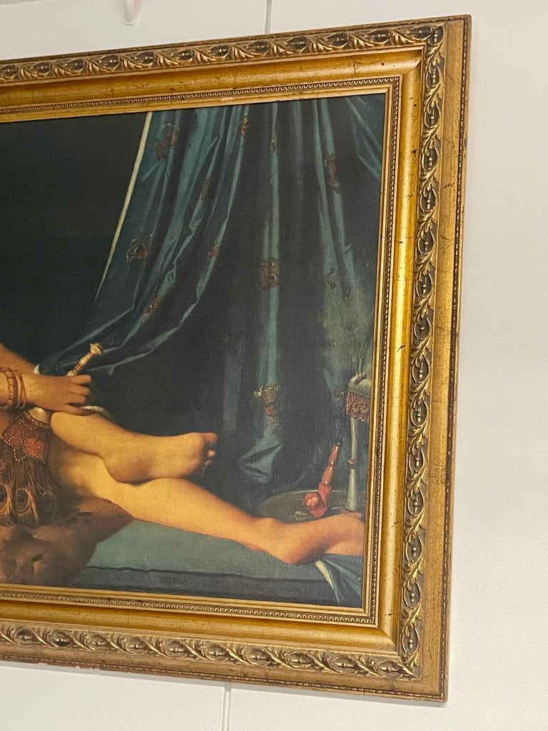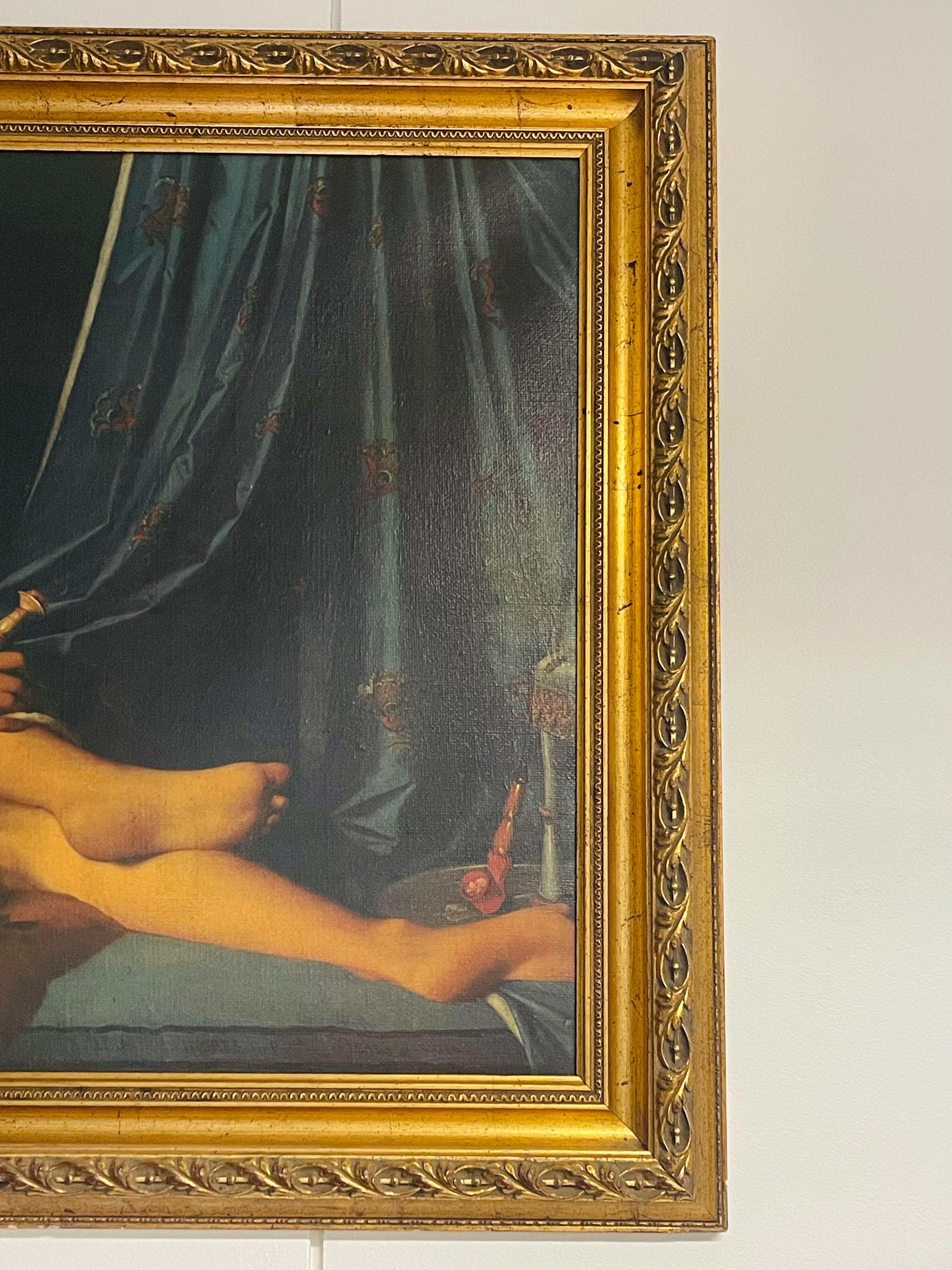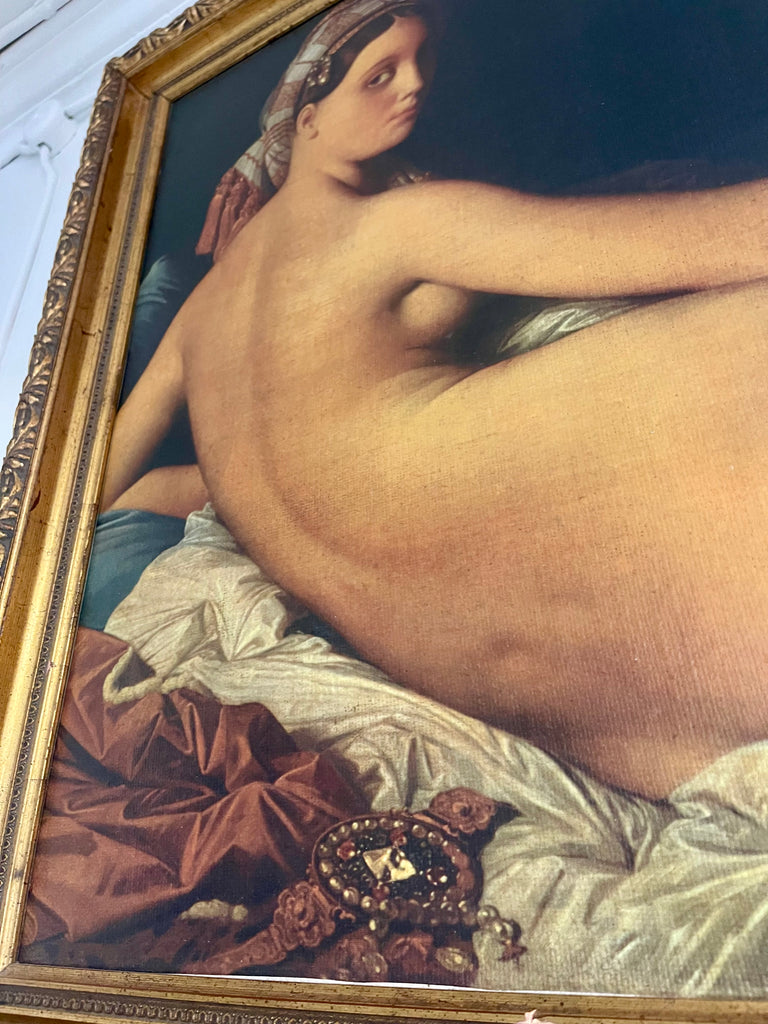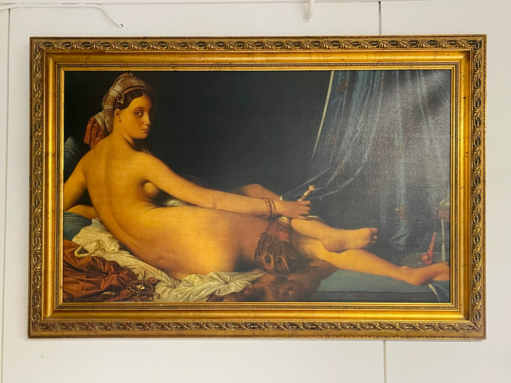 Stor tavla med reproduktion av La Grande Odalisque, ursprungligen målad av Jean Auguste Dominique Ingres.