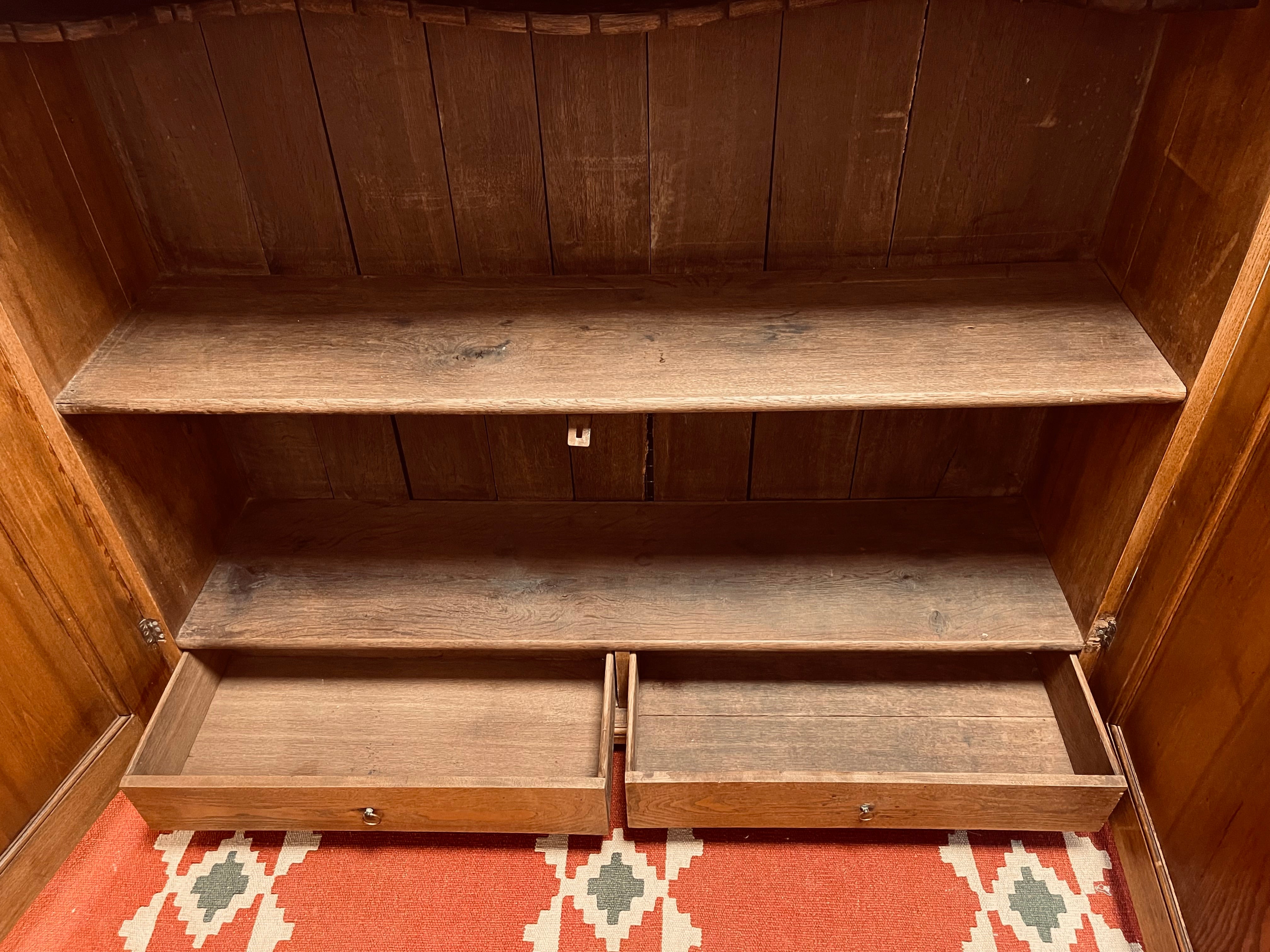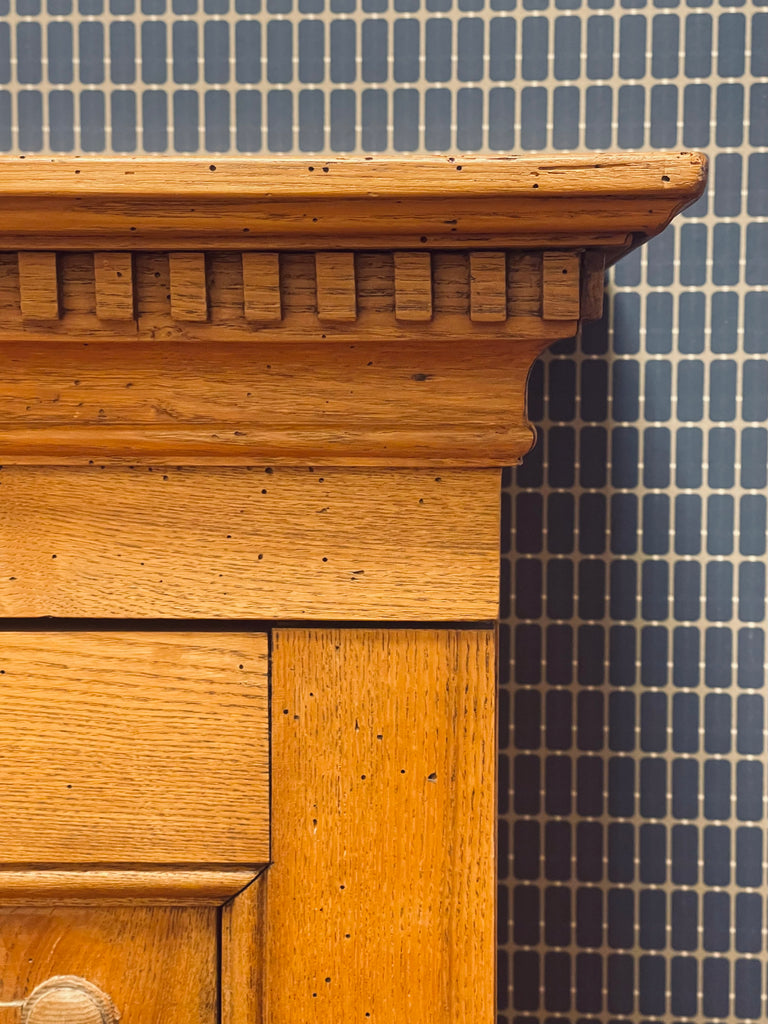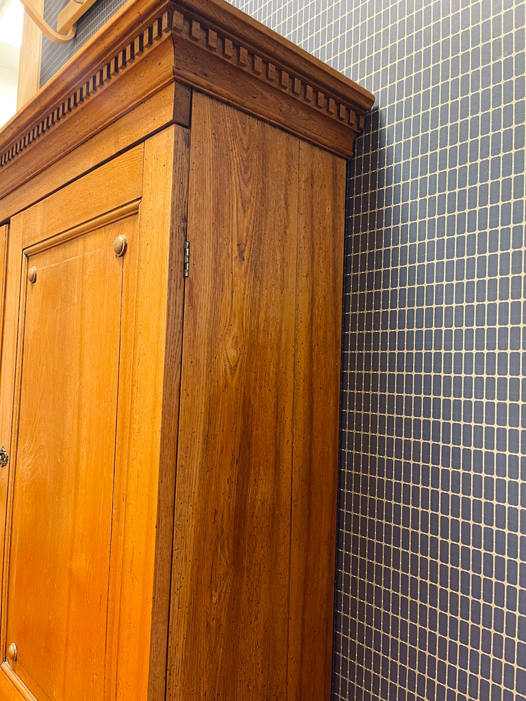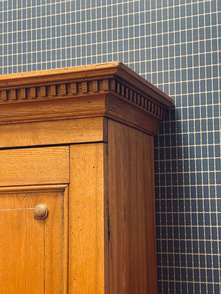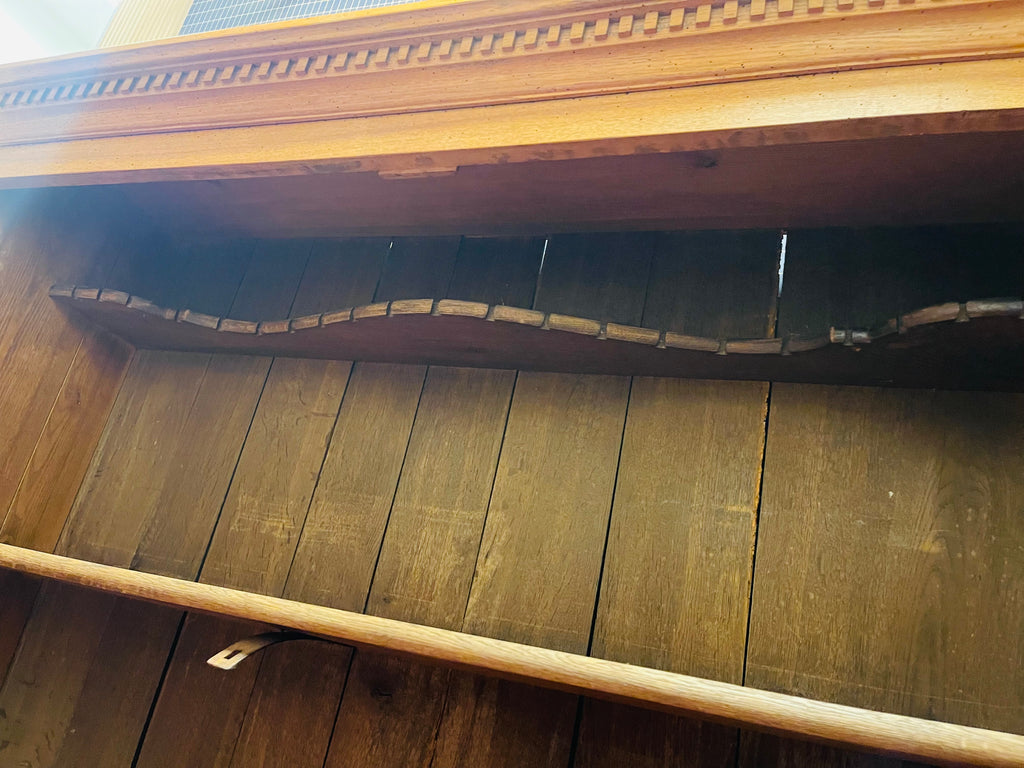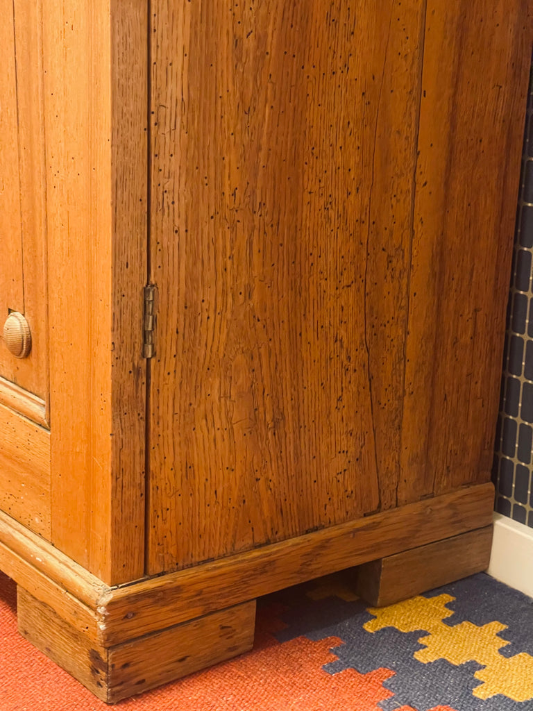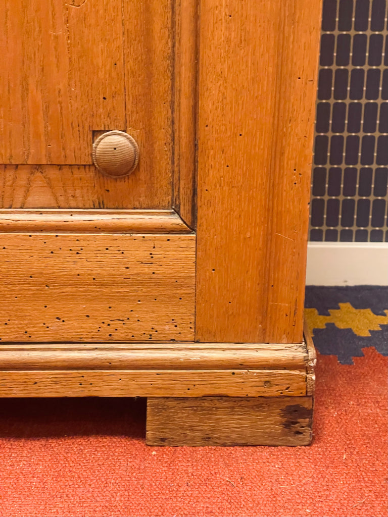 Vackert, gediget, gammalt skåp i ek. Engelsk stil, troligtvis 1800-talets första hälft. I gott skick, lite maskstunget men ingenting som stör, de är behandlade och träet är friskt och i gott skick.