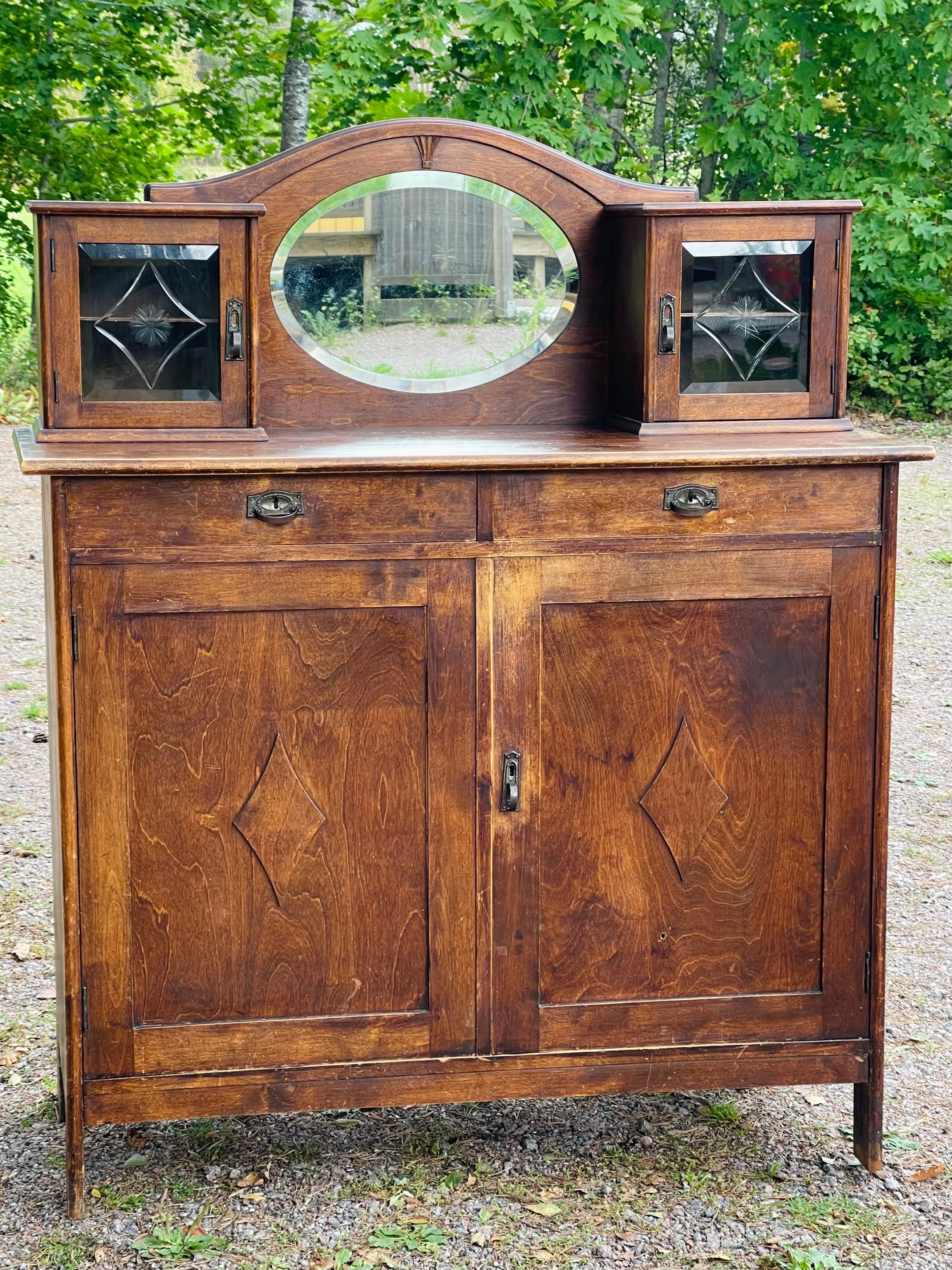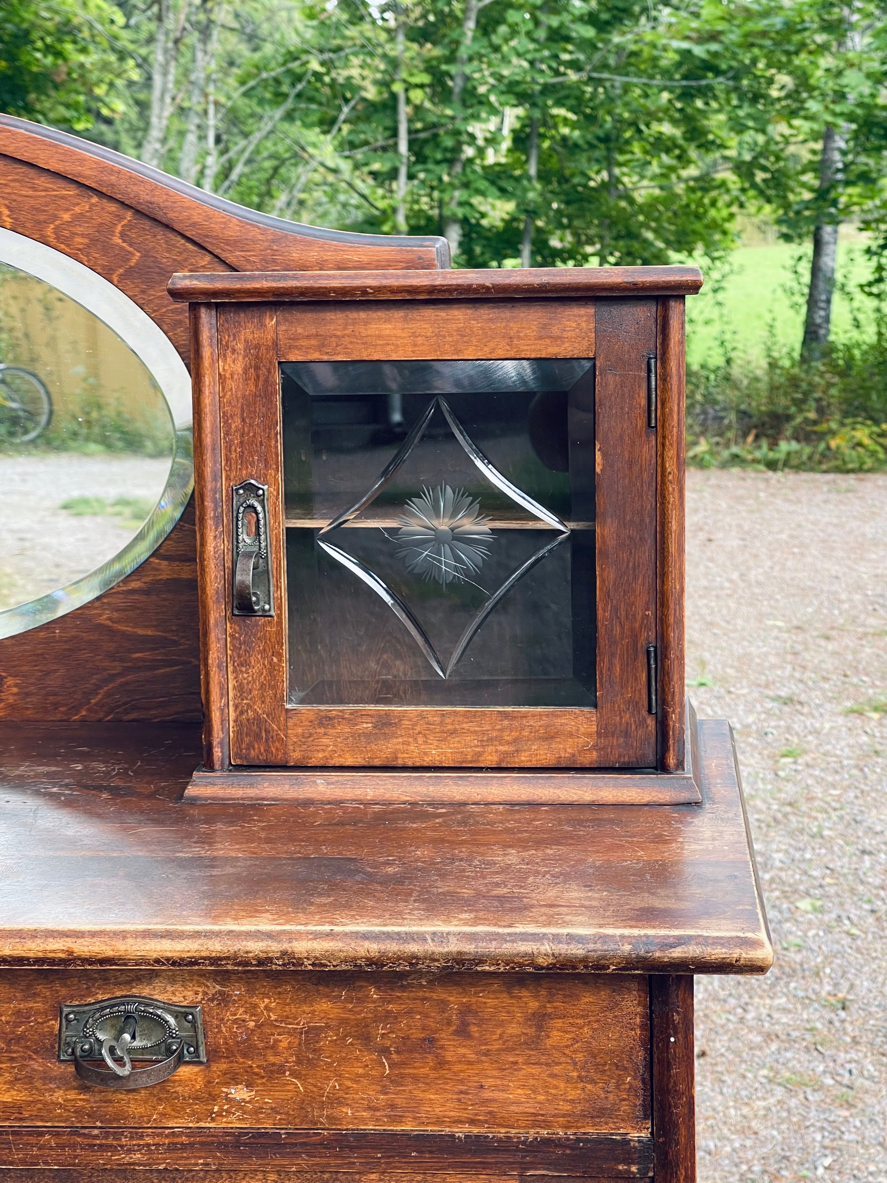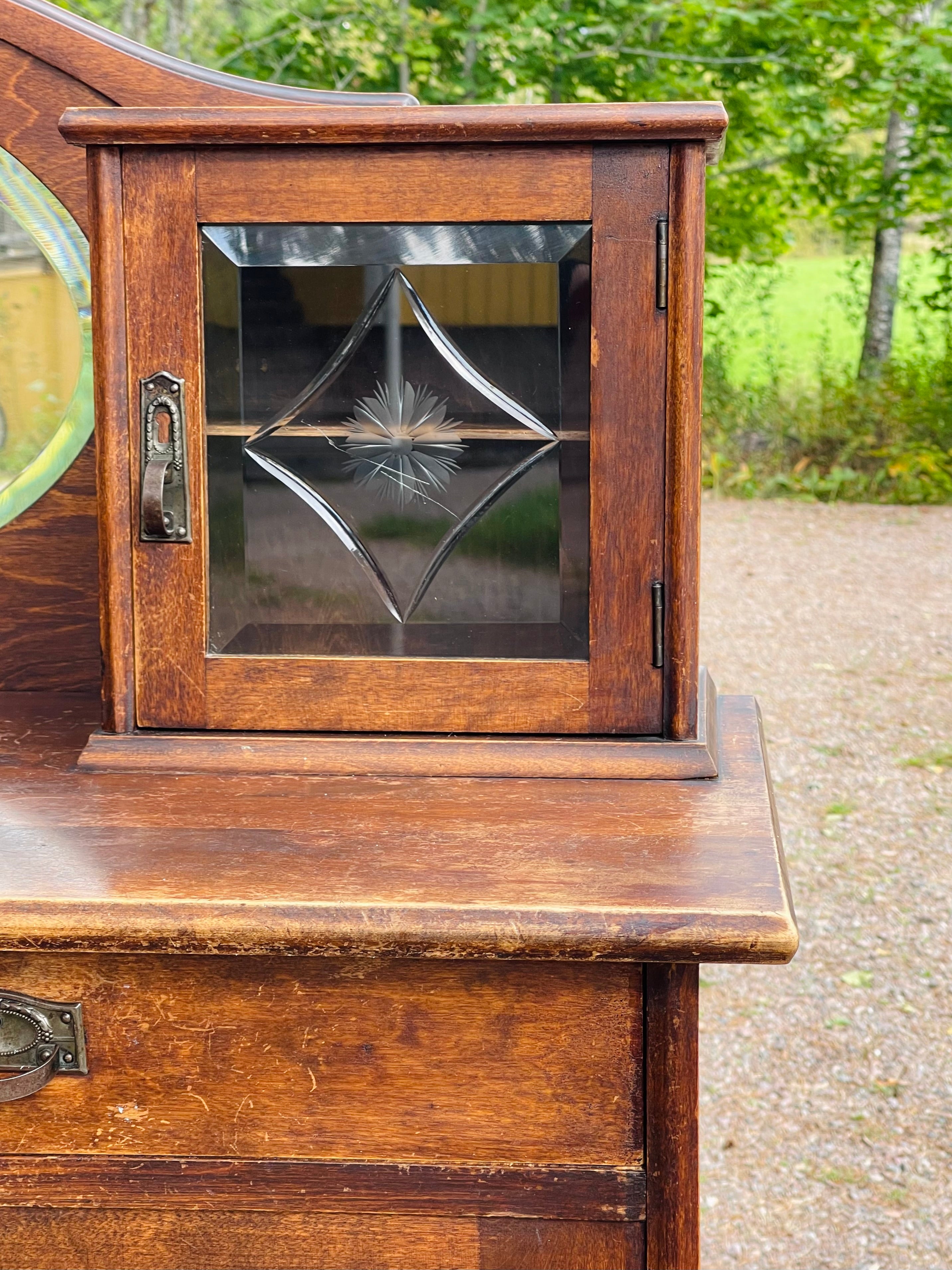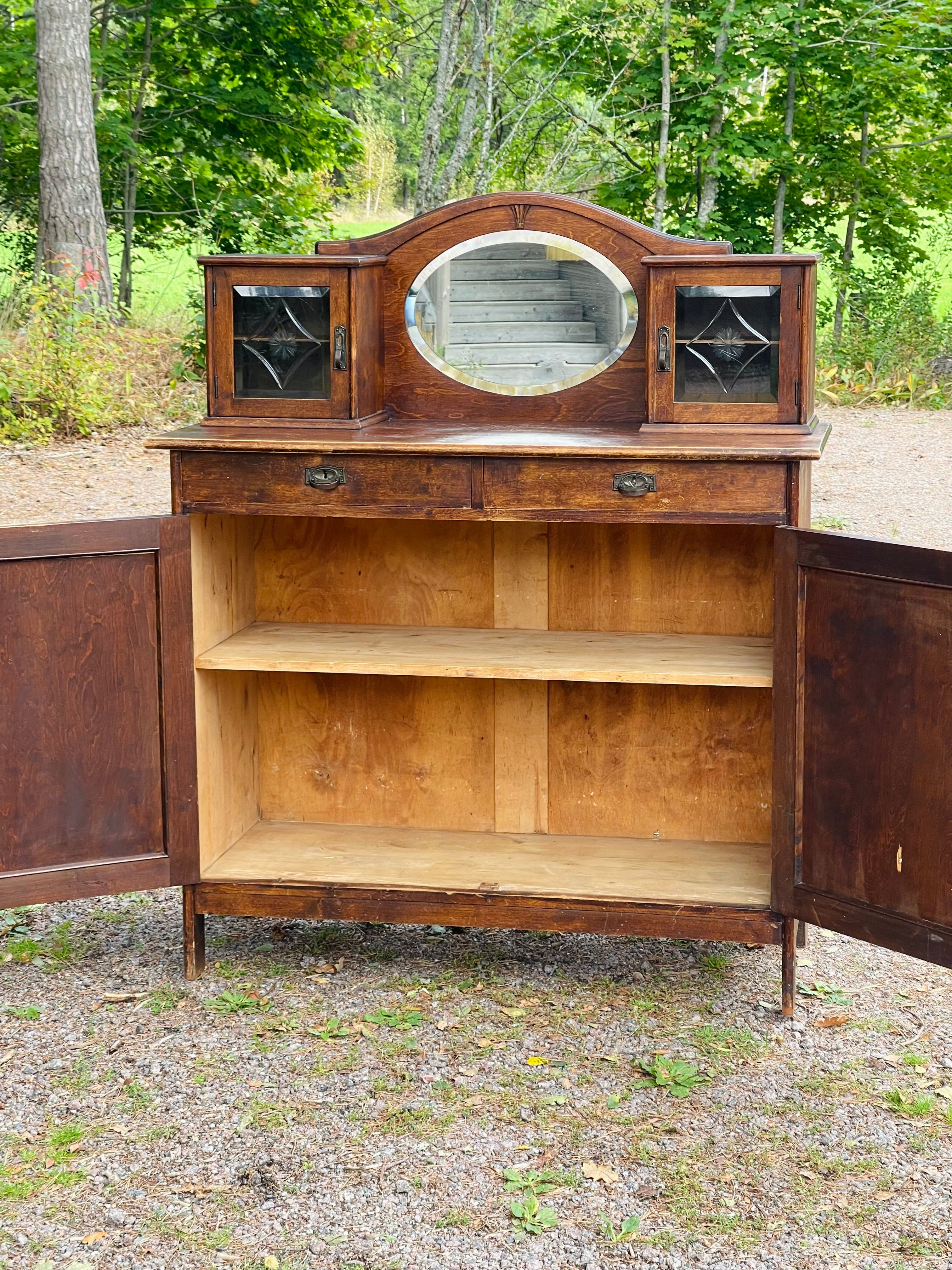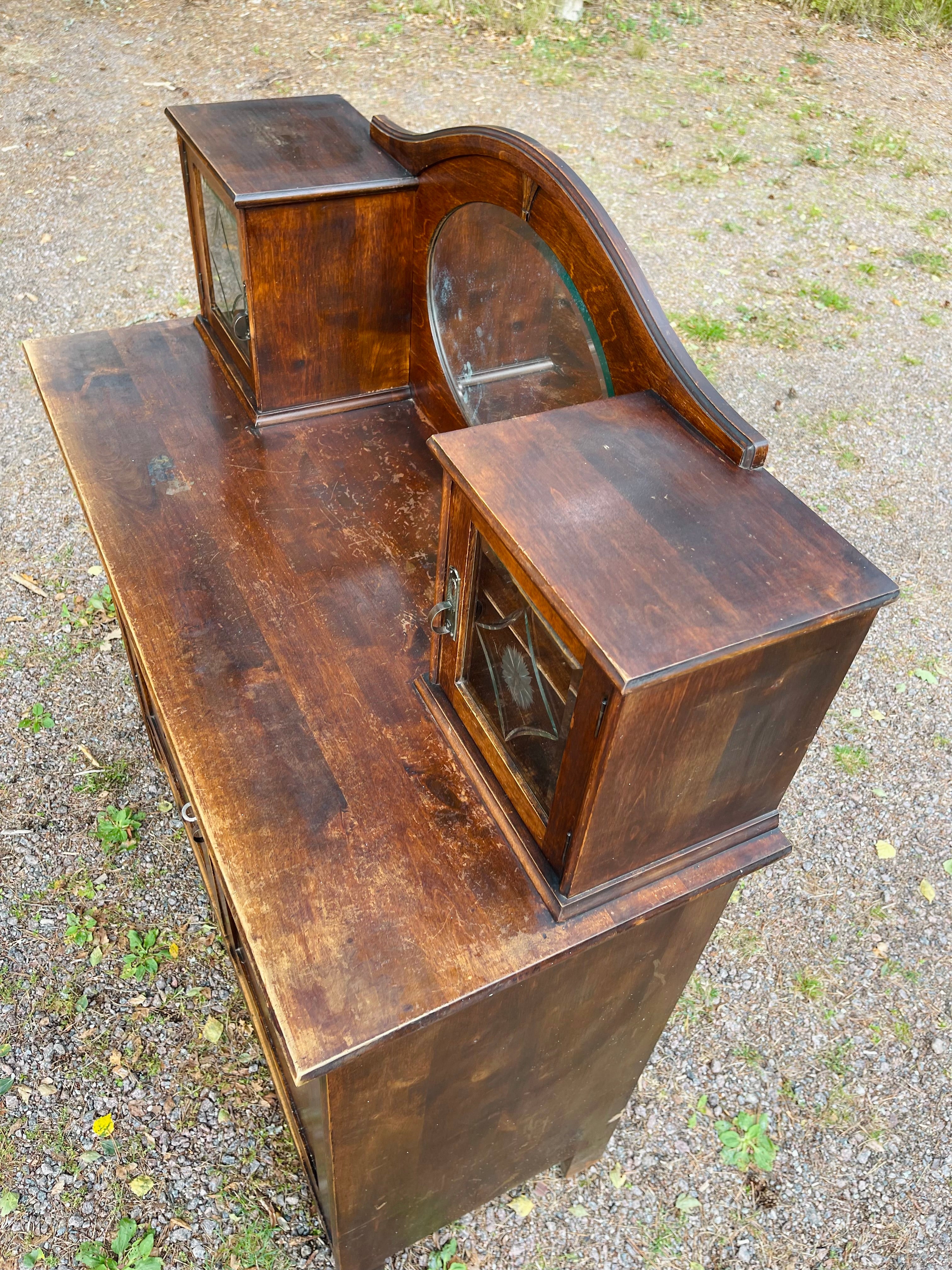 Dessa skänkar har i tiderna funnits i nästan alla hem men denna version är ovanligt liten och smäcker men också ovanligt vackert patinerad. Beslagen är jugend vilket skvallrar om att detta är en tidig modell, glasen vackert slipade i någonting som skvallrar om influenser av art deco och spegeln är facettslipad.