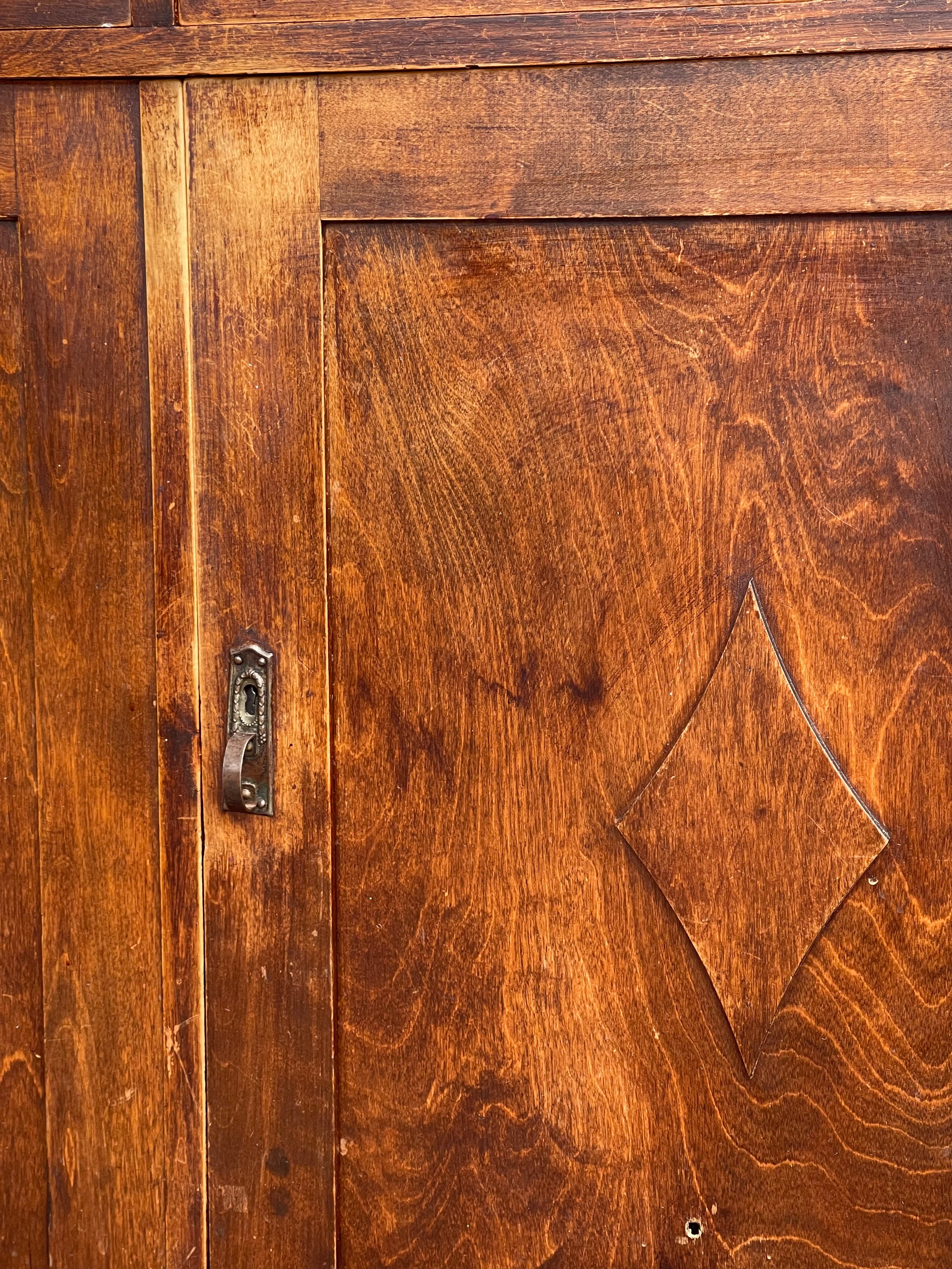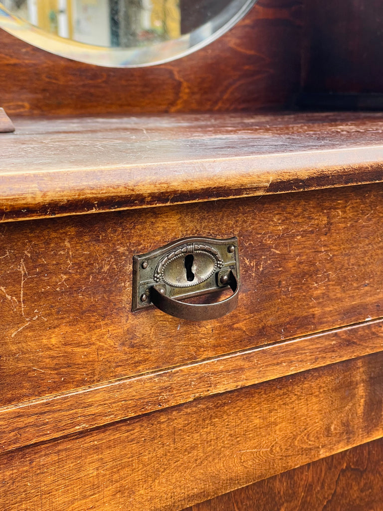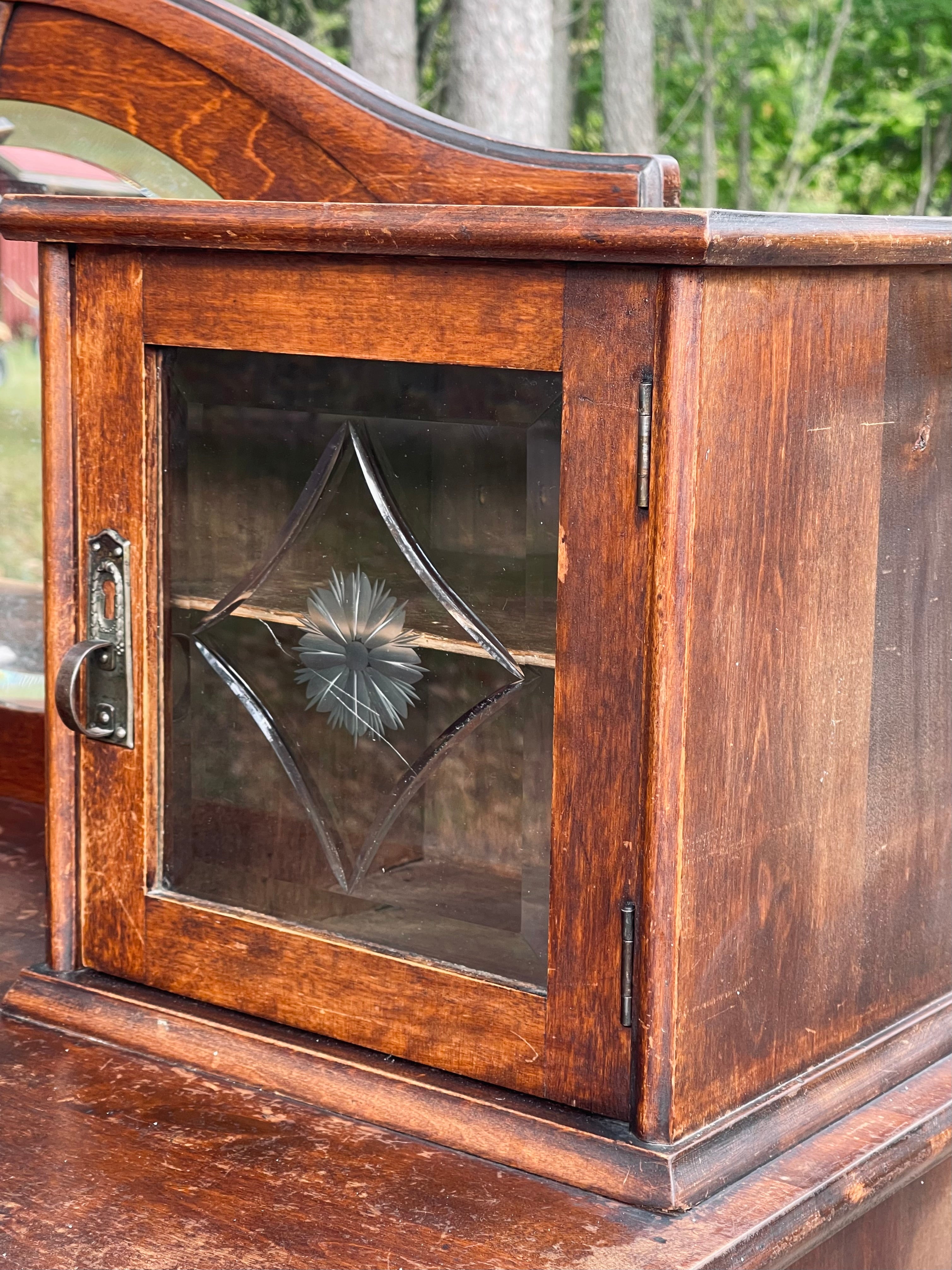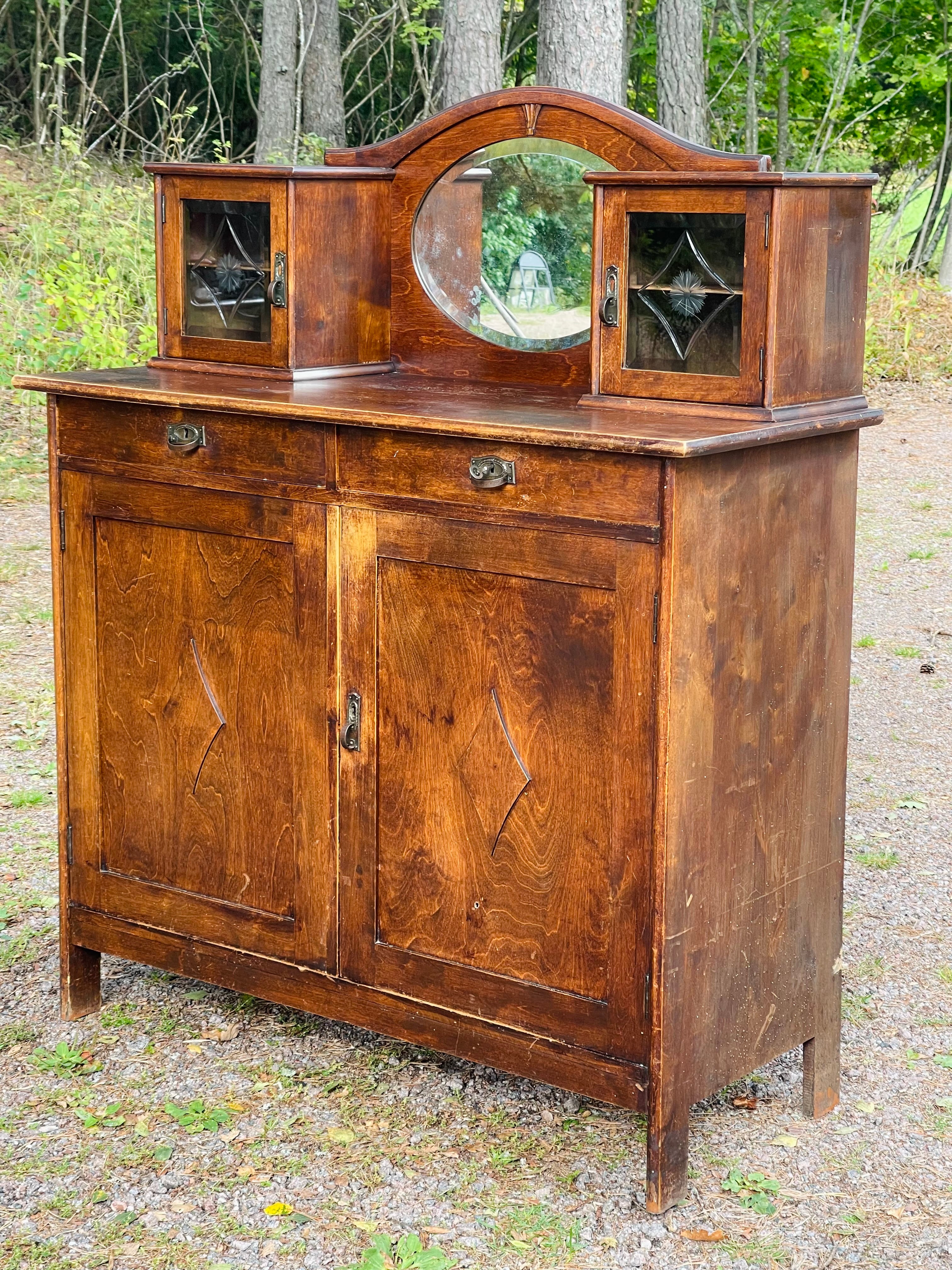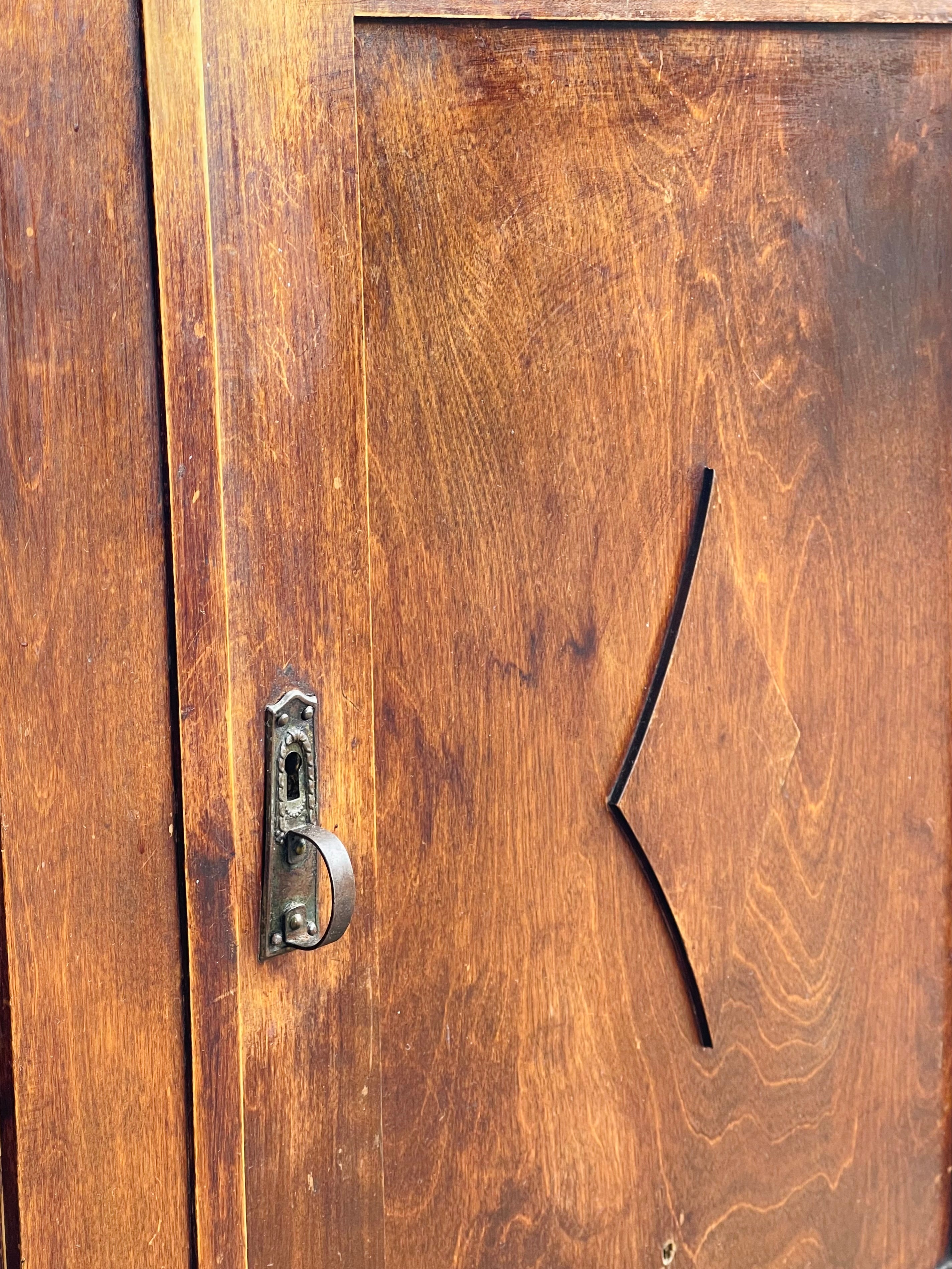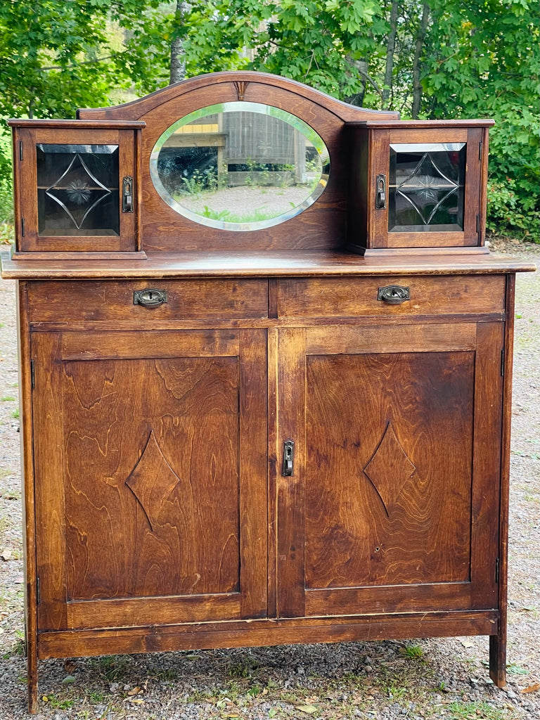 Dessa skänkar har i tiderna funnits i nästan alla hem men denna version är ovanligt liten och smäcker men också ovanligt vackert patinerad. Beslagen är jugend vilket skvallrar om att detta är en tidig modell, glasen vackert slipade i någonting som skvallrar om influenser av art deco och spegeln är facettslipad.