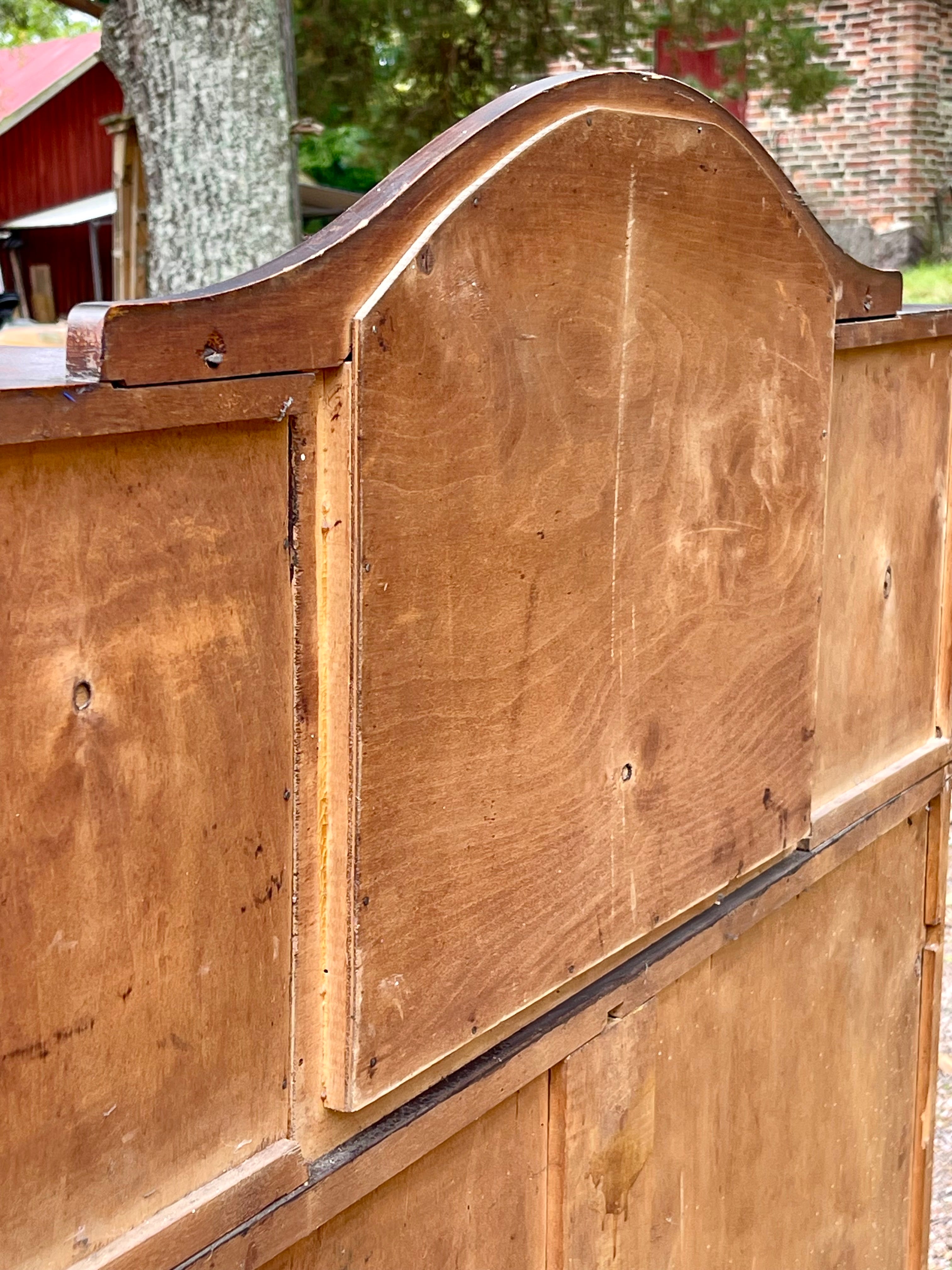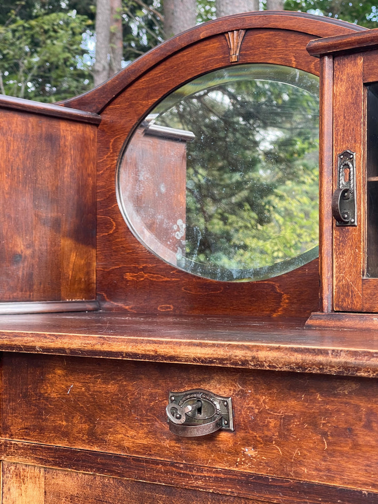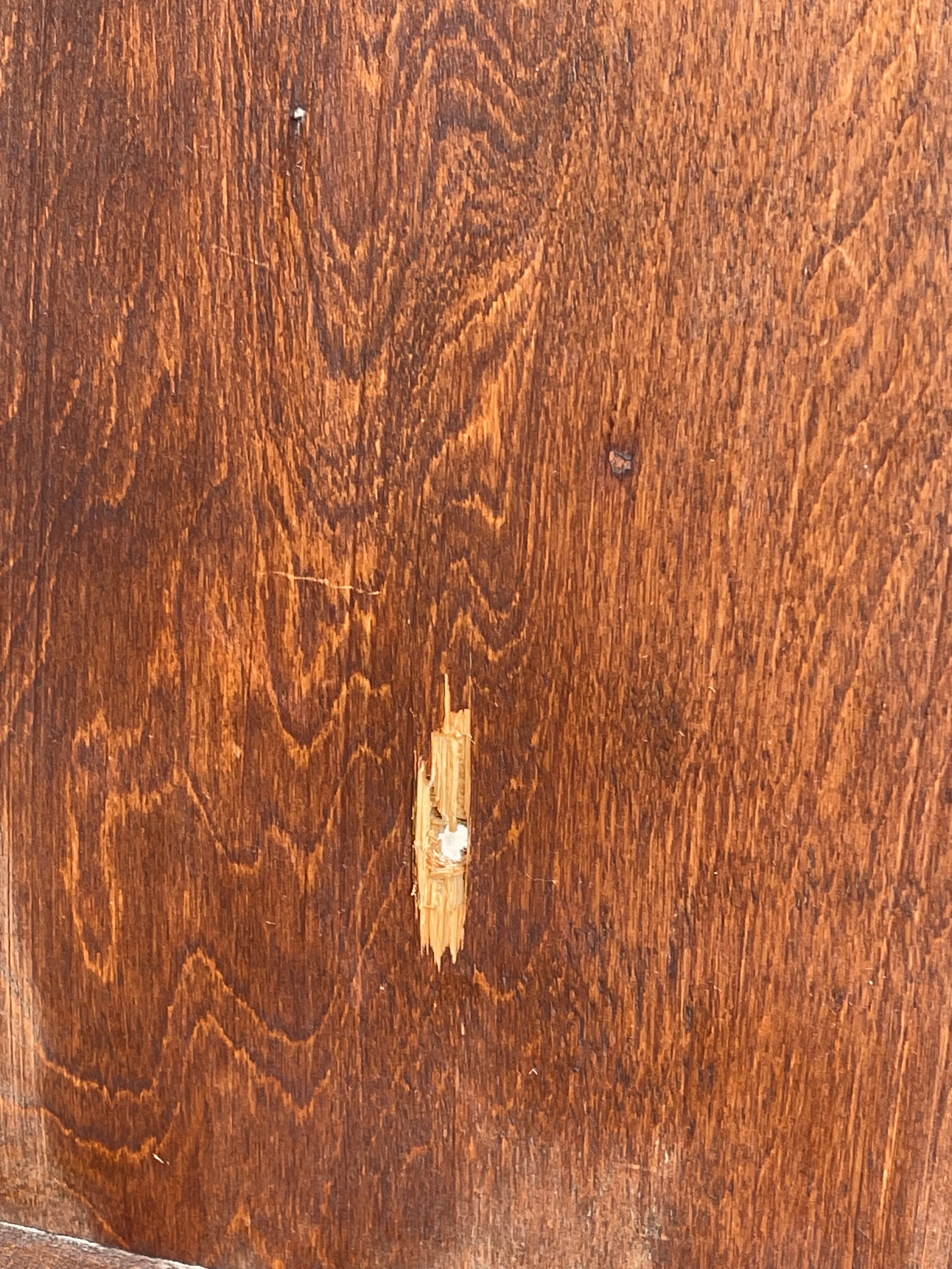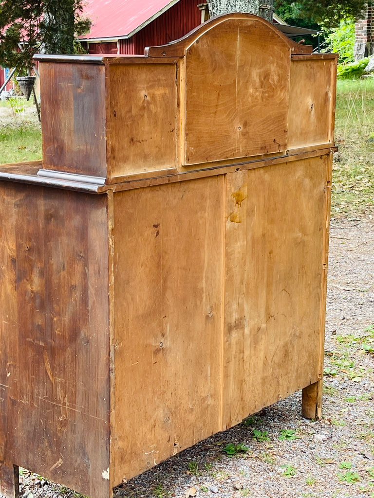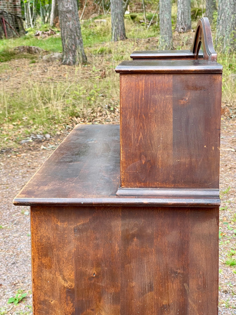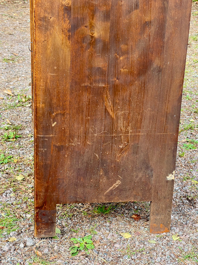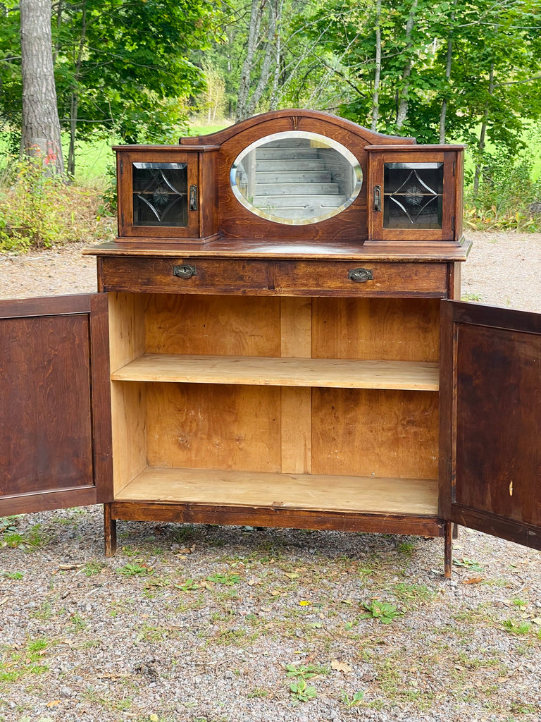 Glasdörrarna har några djupare repor och spegeln har spår av fukt i folieringen men det enda som egentligen är att anmärka är att någon i tiderna gjort ett hål (av okänd anledning) i ena dörren (se bilder). Uppe på bordsskivan finns lämningarna efter en gammal tidning, det var så charmigt så jag har inte brytt mig om att skrapa bort den. Utöver det är det en ovanligt trevlig skänk med fin patina.