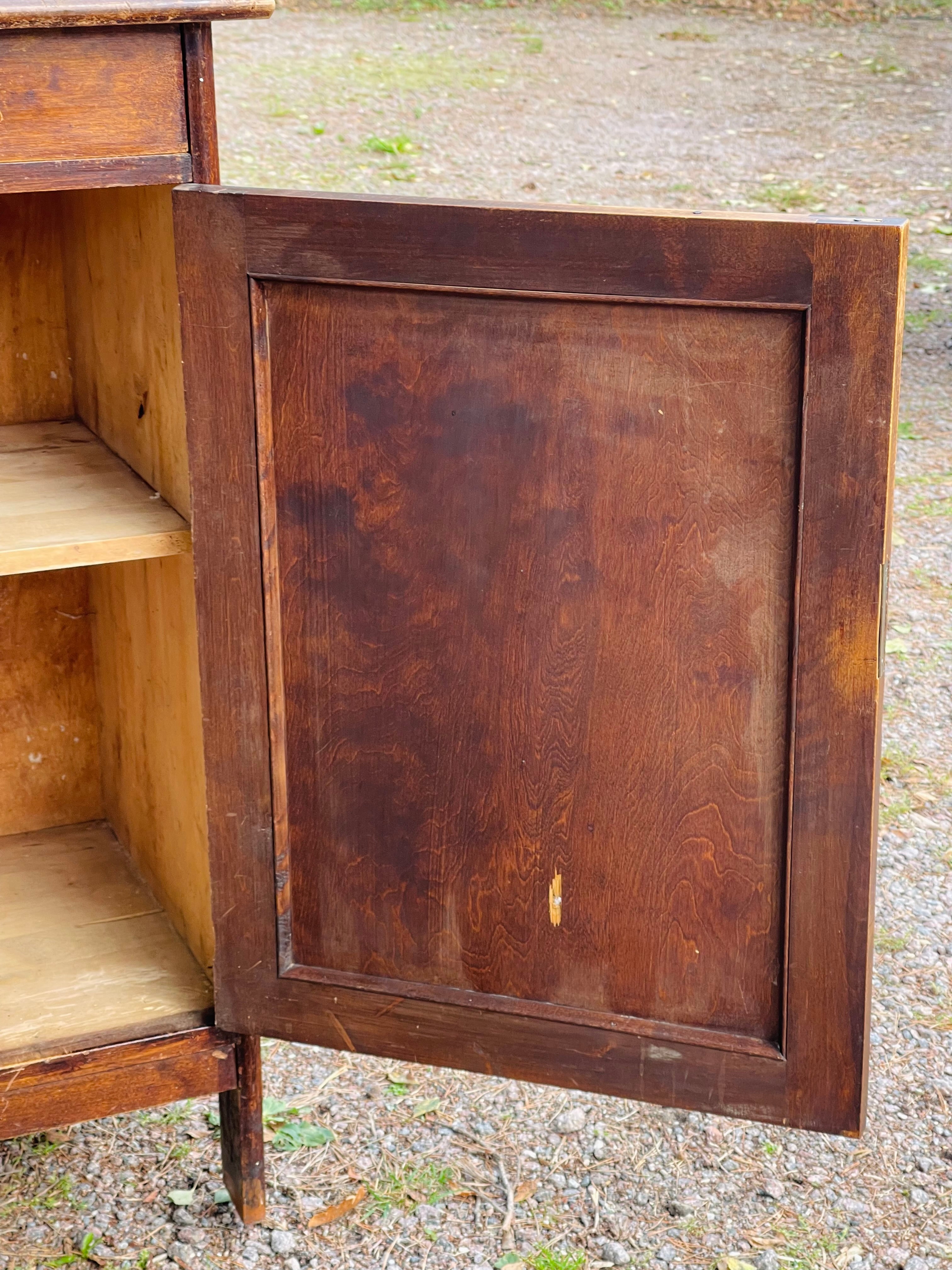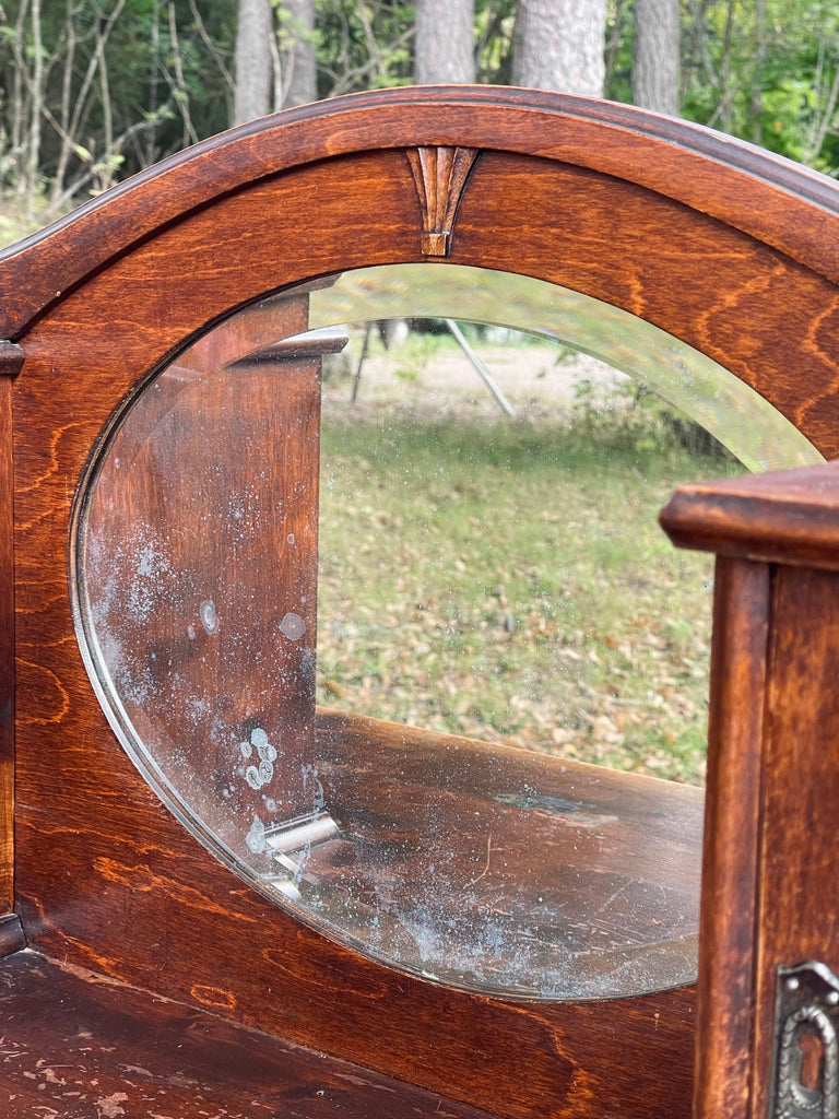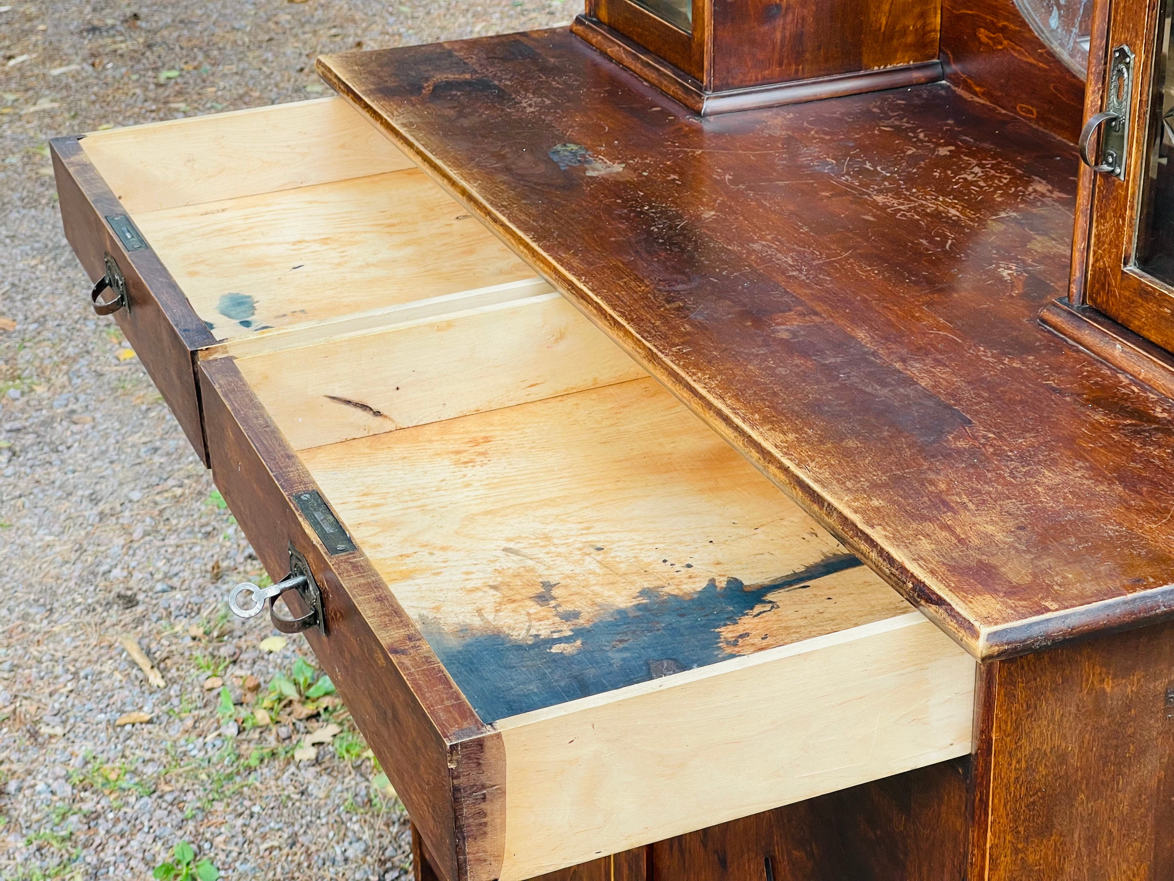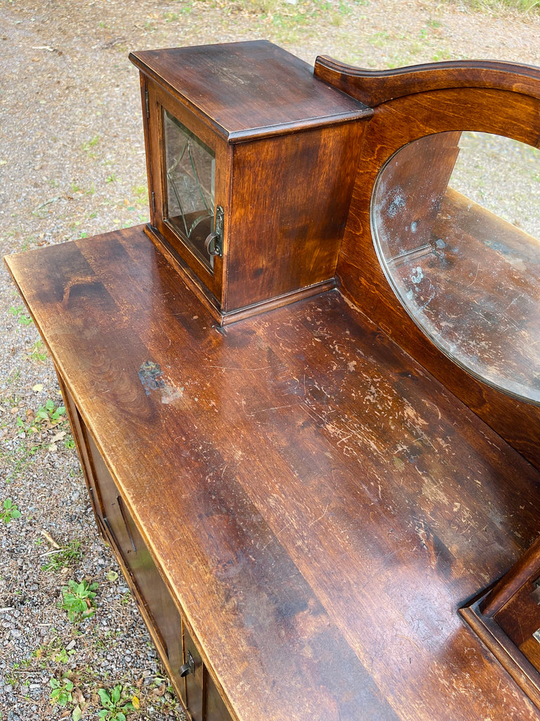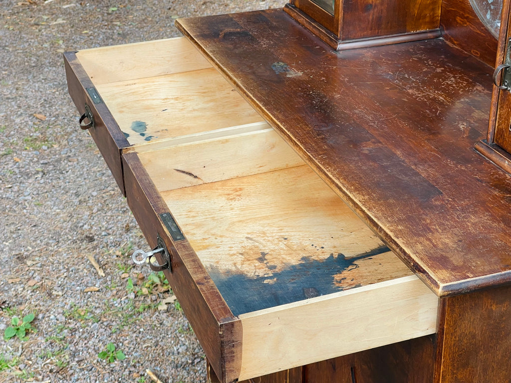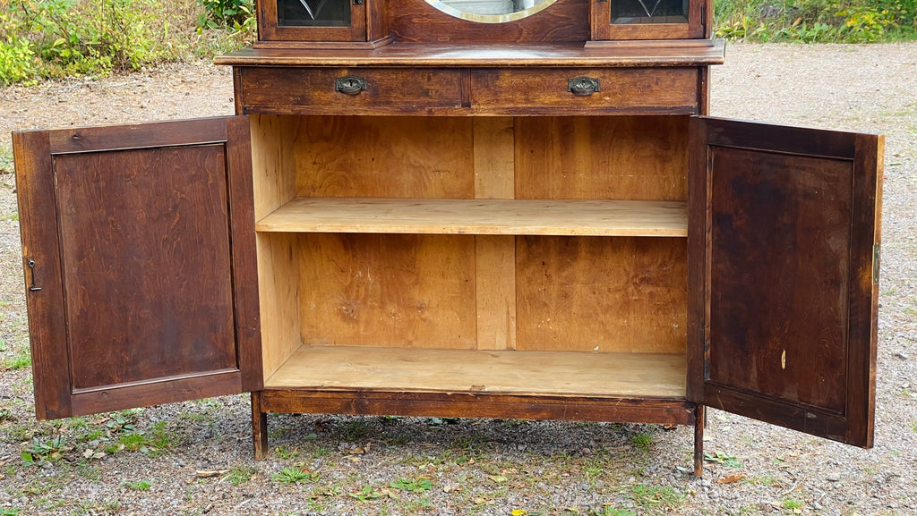 Glasdörrarna har några djupare repor och spegeln har spår av fukt i folieringen men det enda som egentligen är att anmärka är att någon i tiderna gjort ett hål (av okänd anledning) i ena dörren (se bilder). Uppe på bordsskivan finns lämningarna efter en gammal tidning, det var så charmigt så jag har inte brytt mig om att skrapa bort den. Utöver det är det en ovanligt trevlig skänk med fin patina.