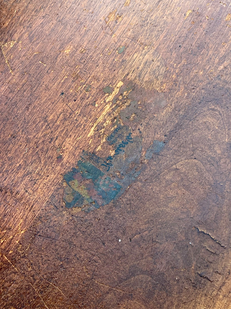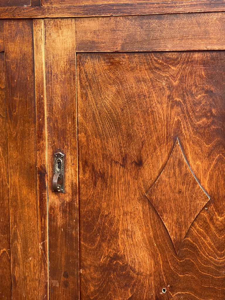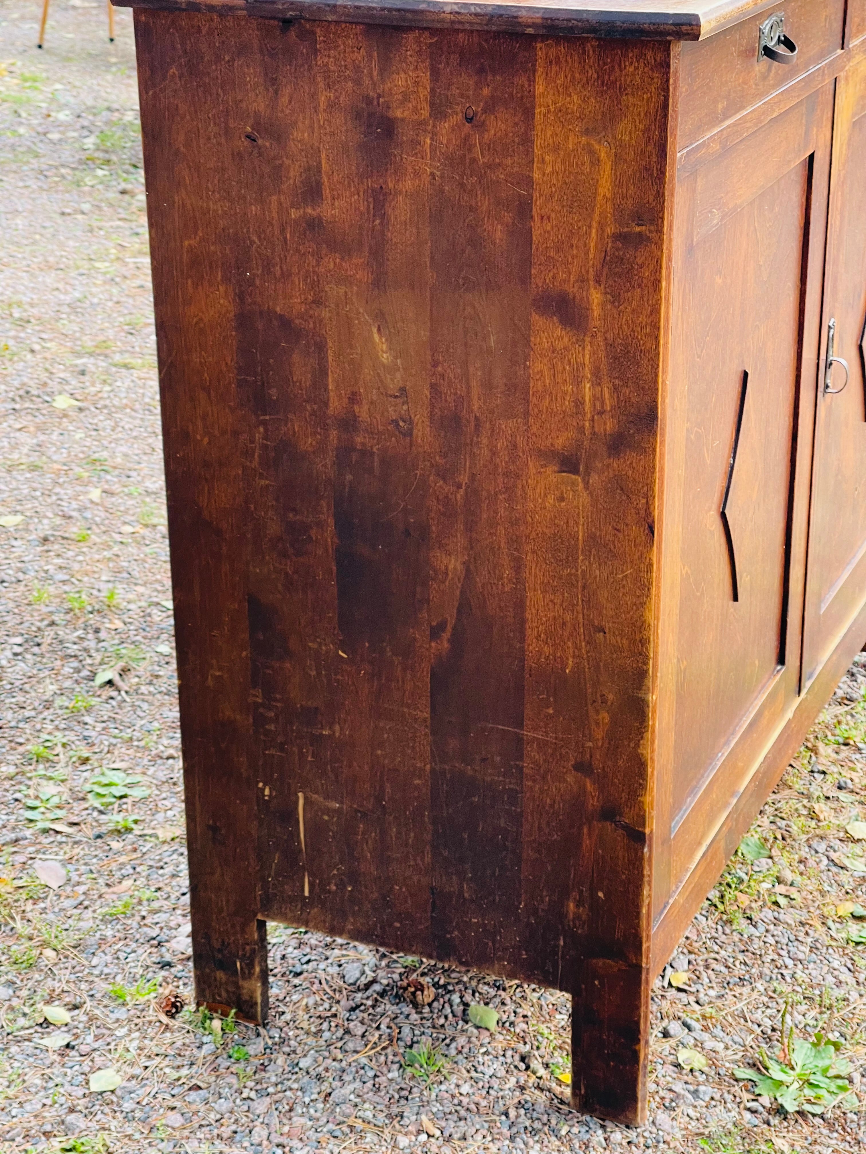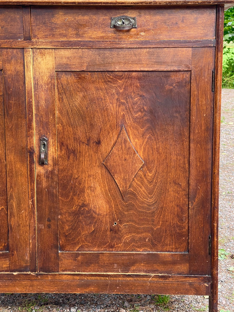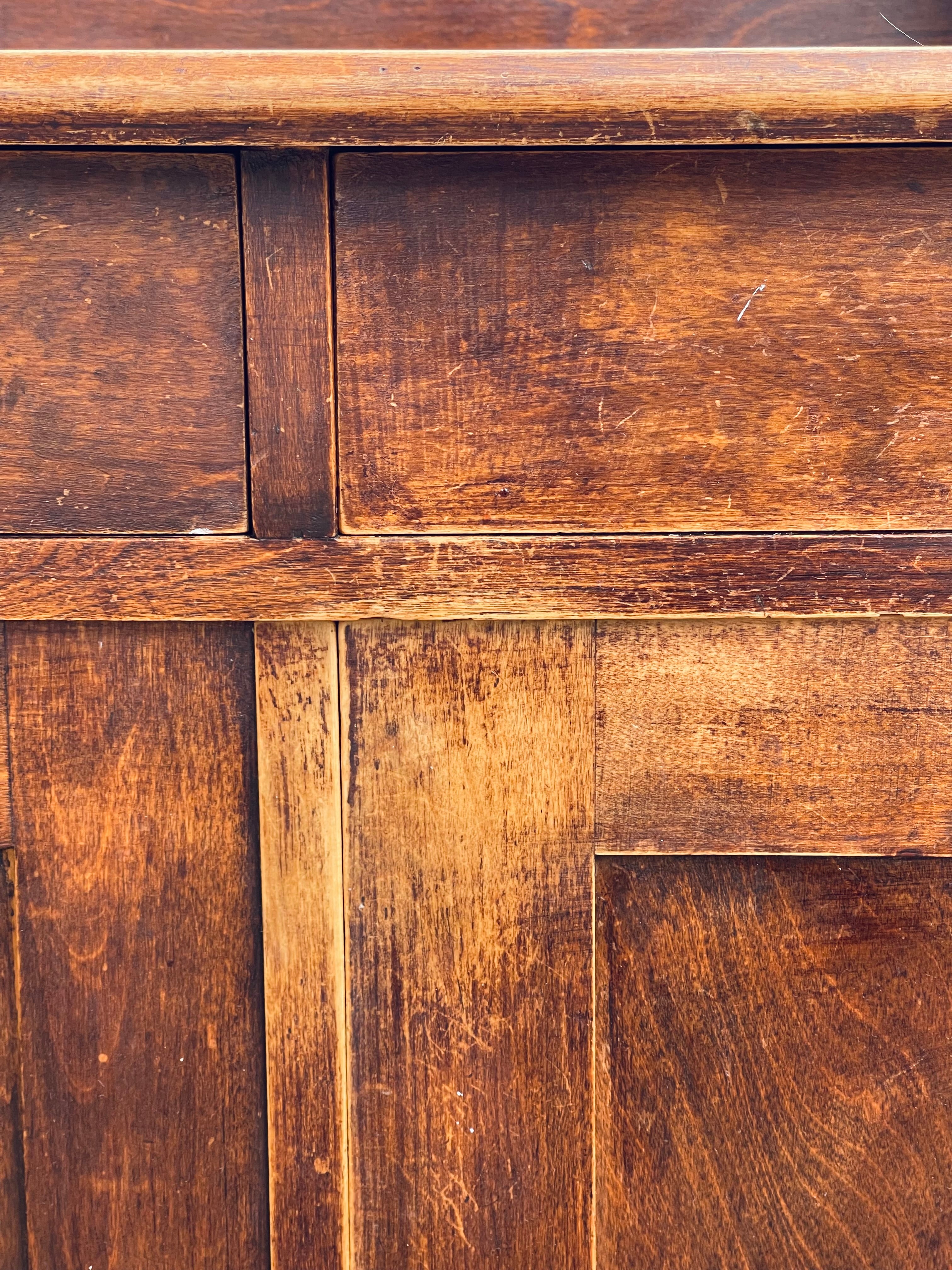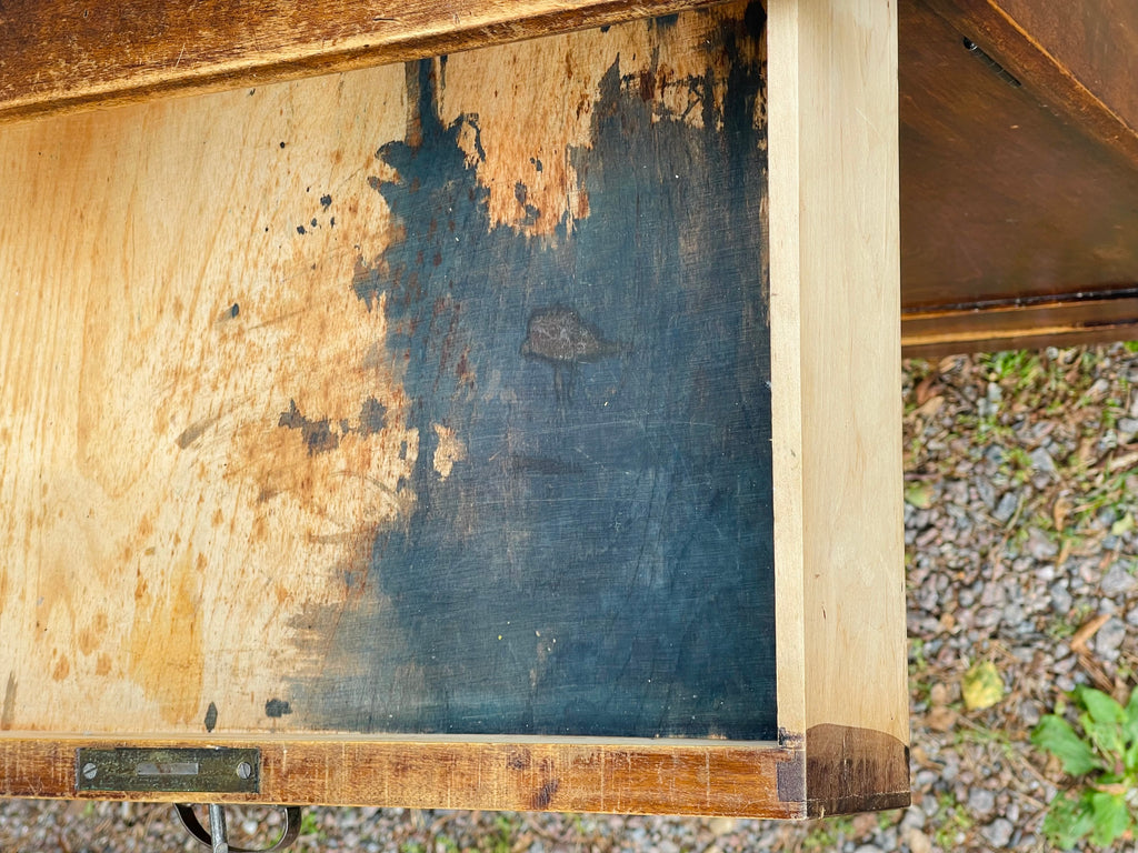Glasdörrarna har några djupare repor och spegeln har spår av fukt i folieringen men det enda som egentligen är att anmärka är att någon i tiderna gjort ett hål (av okänd anledning) i ena dörren (se bilder). Uppe på bordsskivan finns lämningarna efter en gammal tidning, det var så charmigt så jag har inte brytt mig om att skrapa bort den. Utöver det är det en ovanligt trevlig skänk med fin patina.