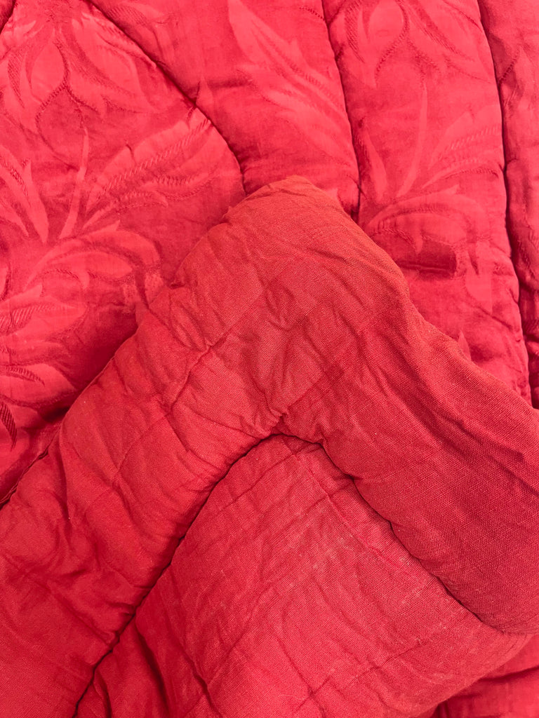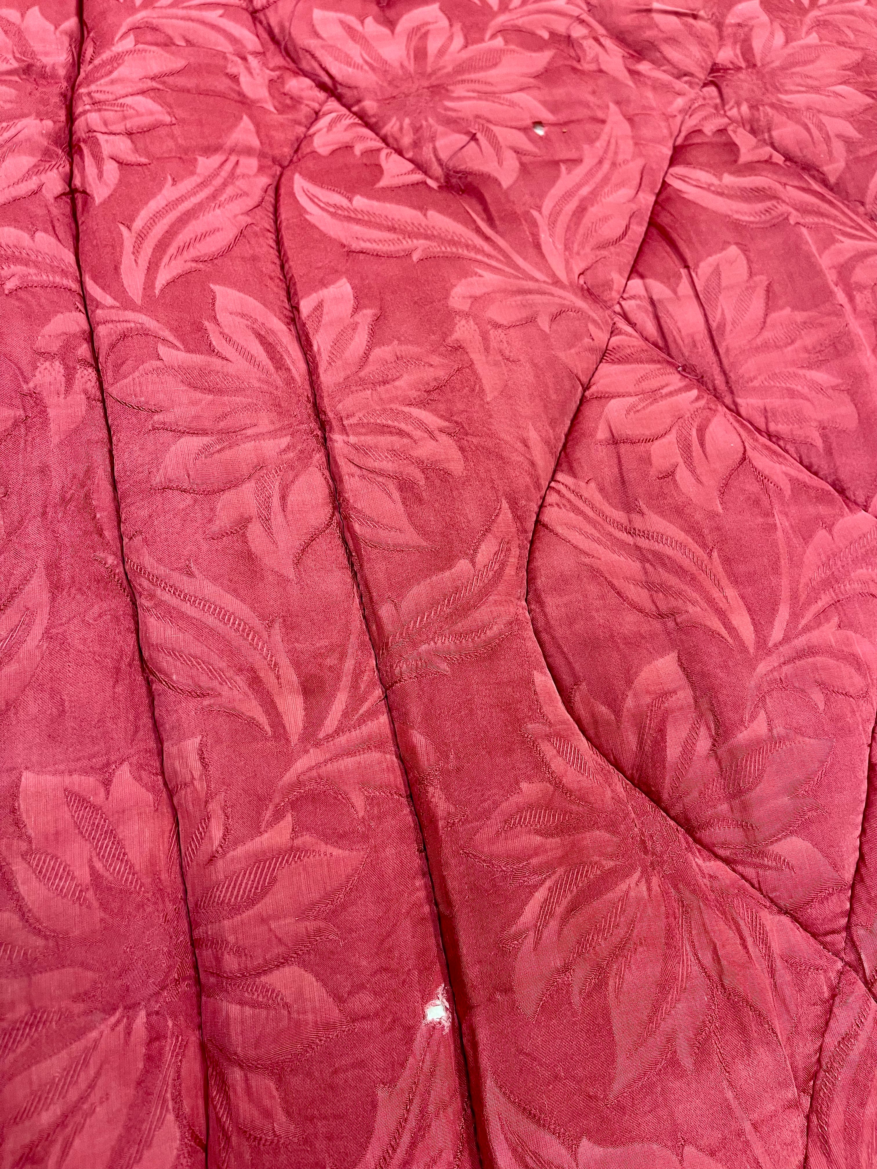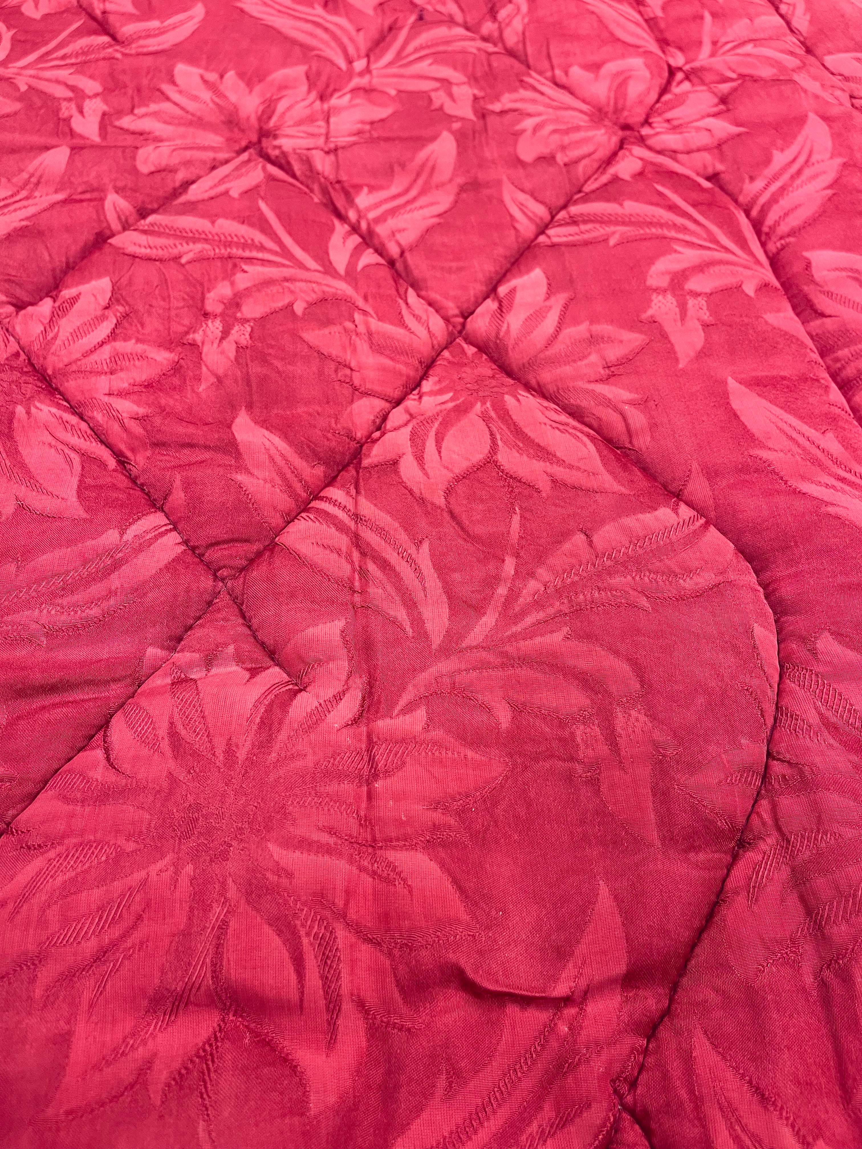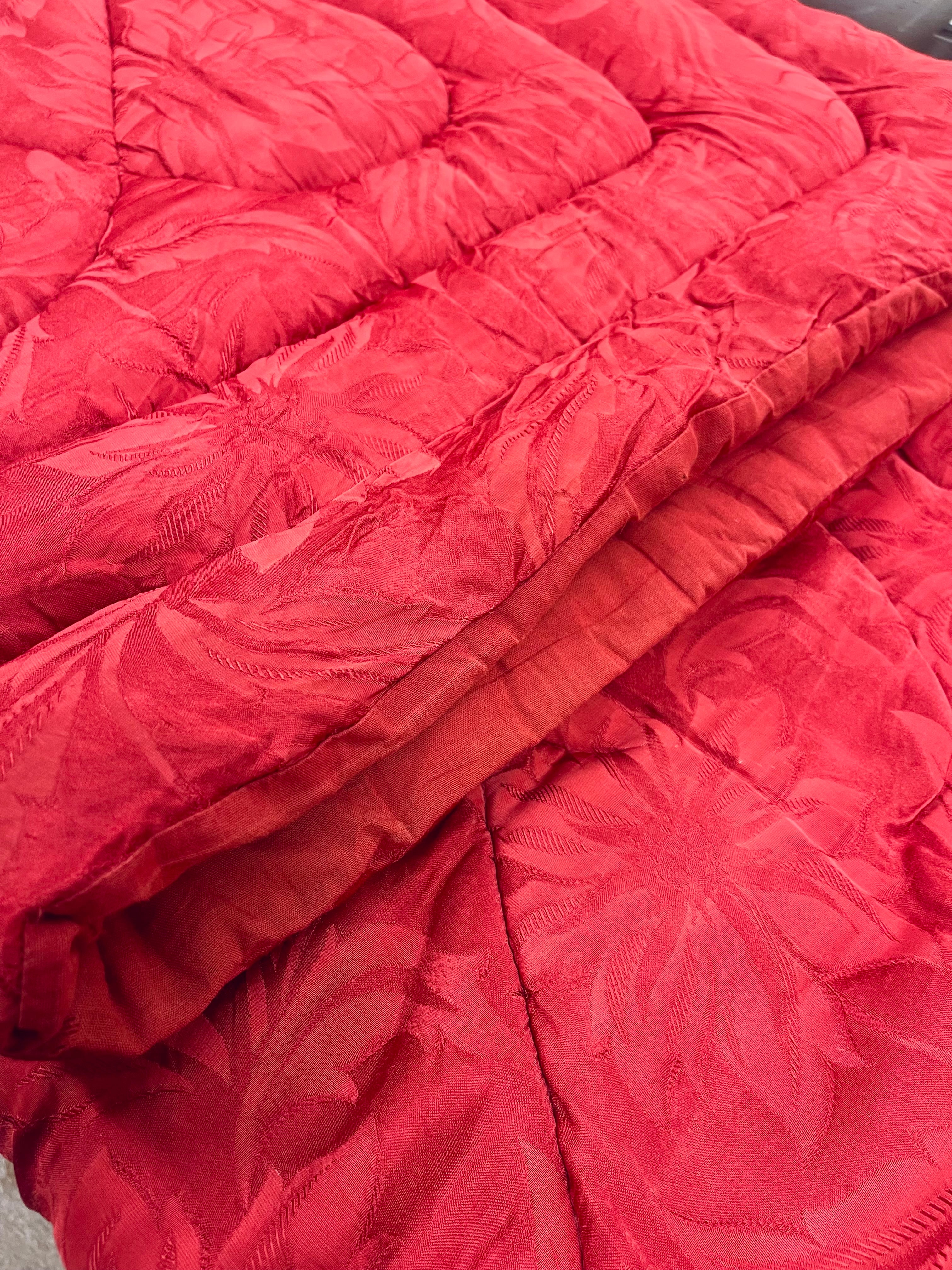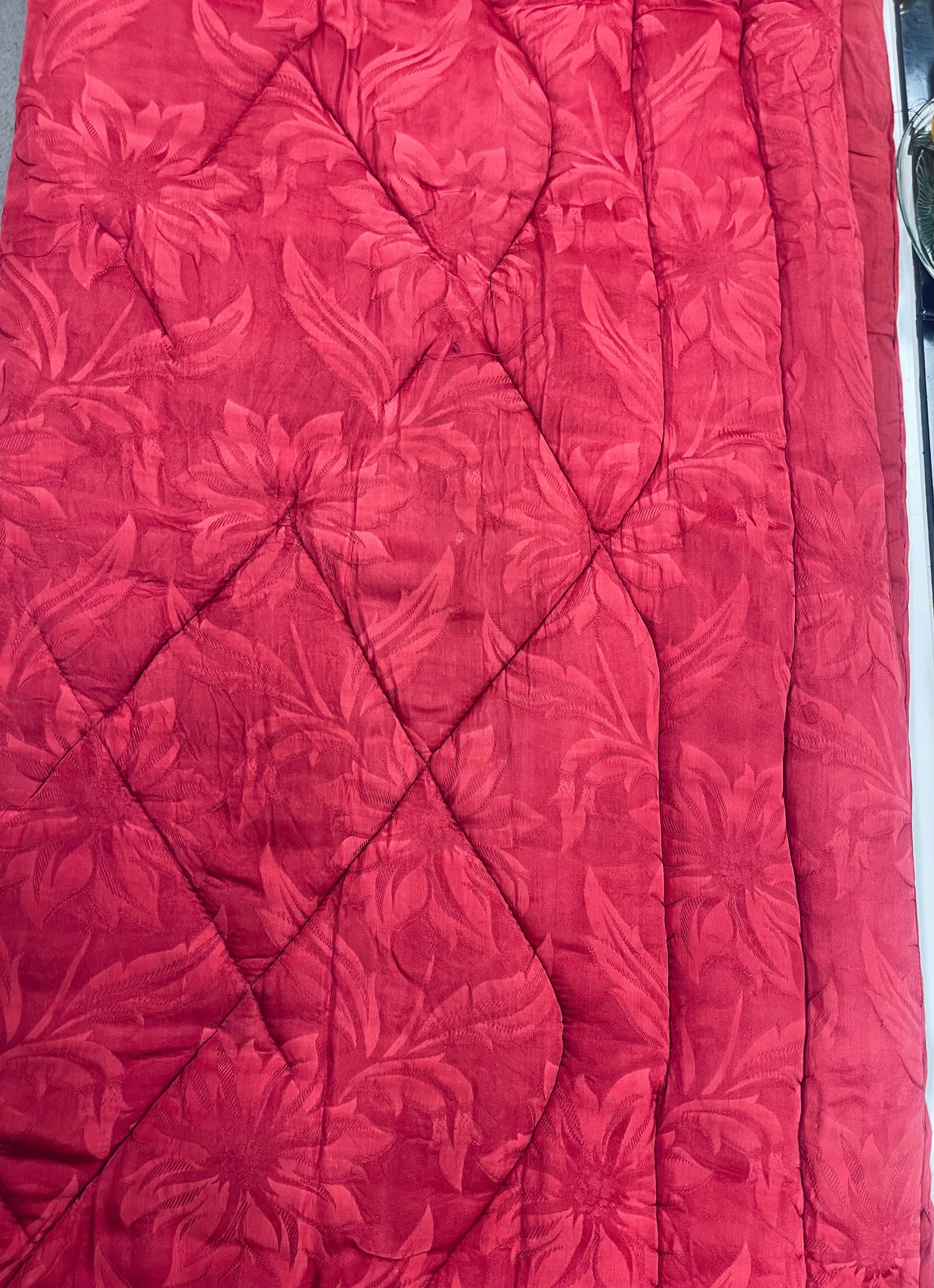 Vintage täcke i rött med blommigt mönster. Bruksskick, några små hål, några fläckar och spår av tidens tand, se bilder. Nytvättat och ingen lukt. Lite tyngre än vanliga täcken.