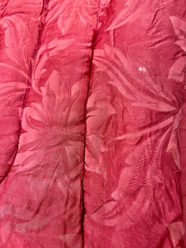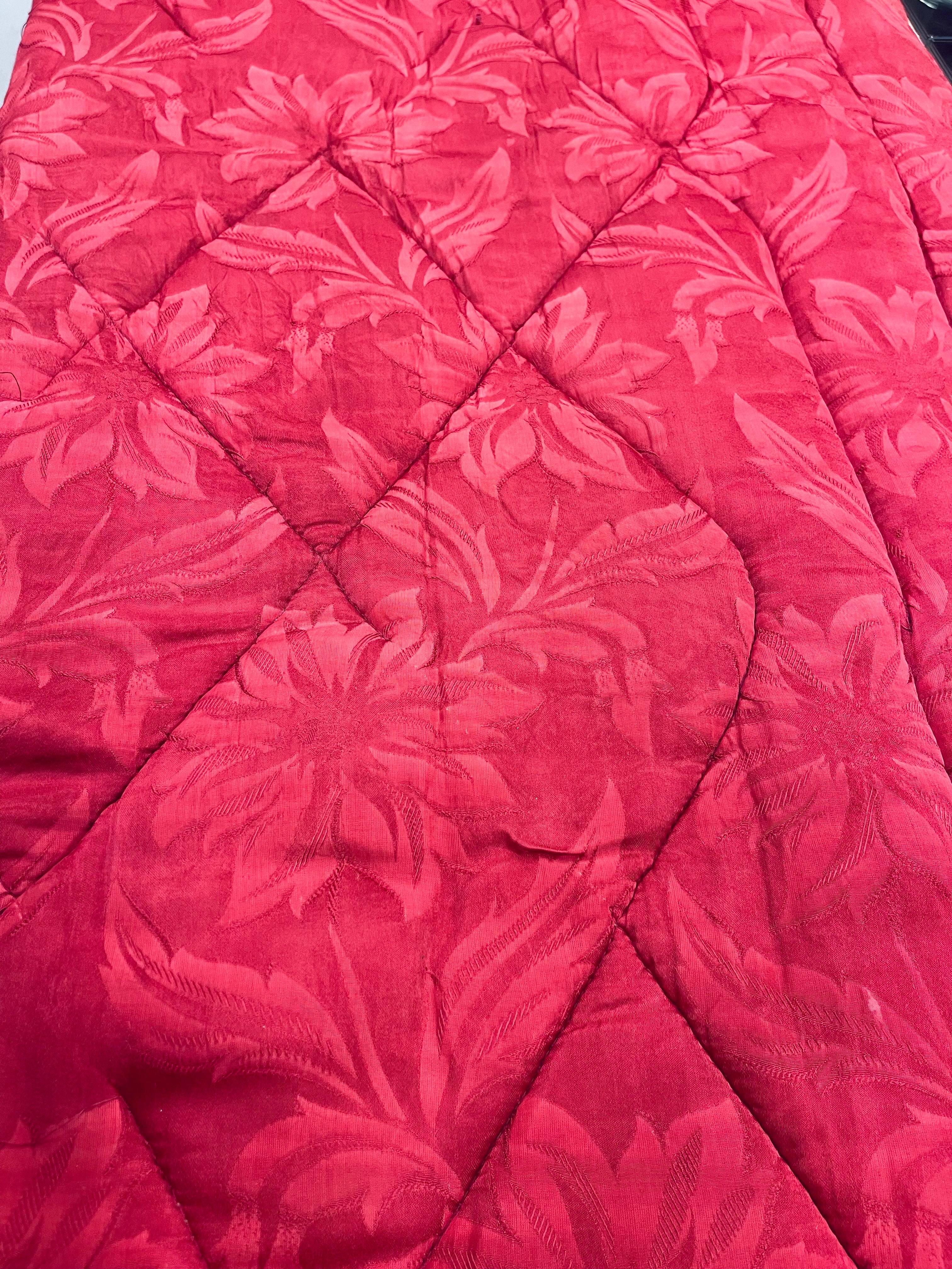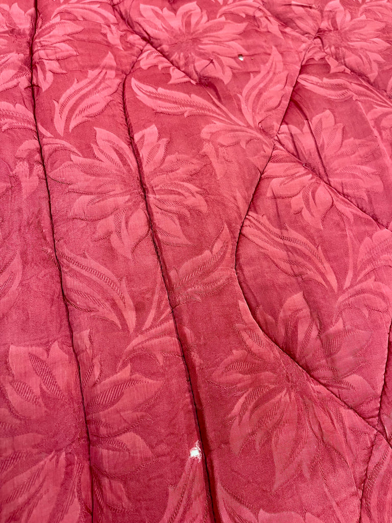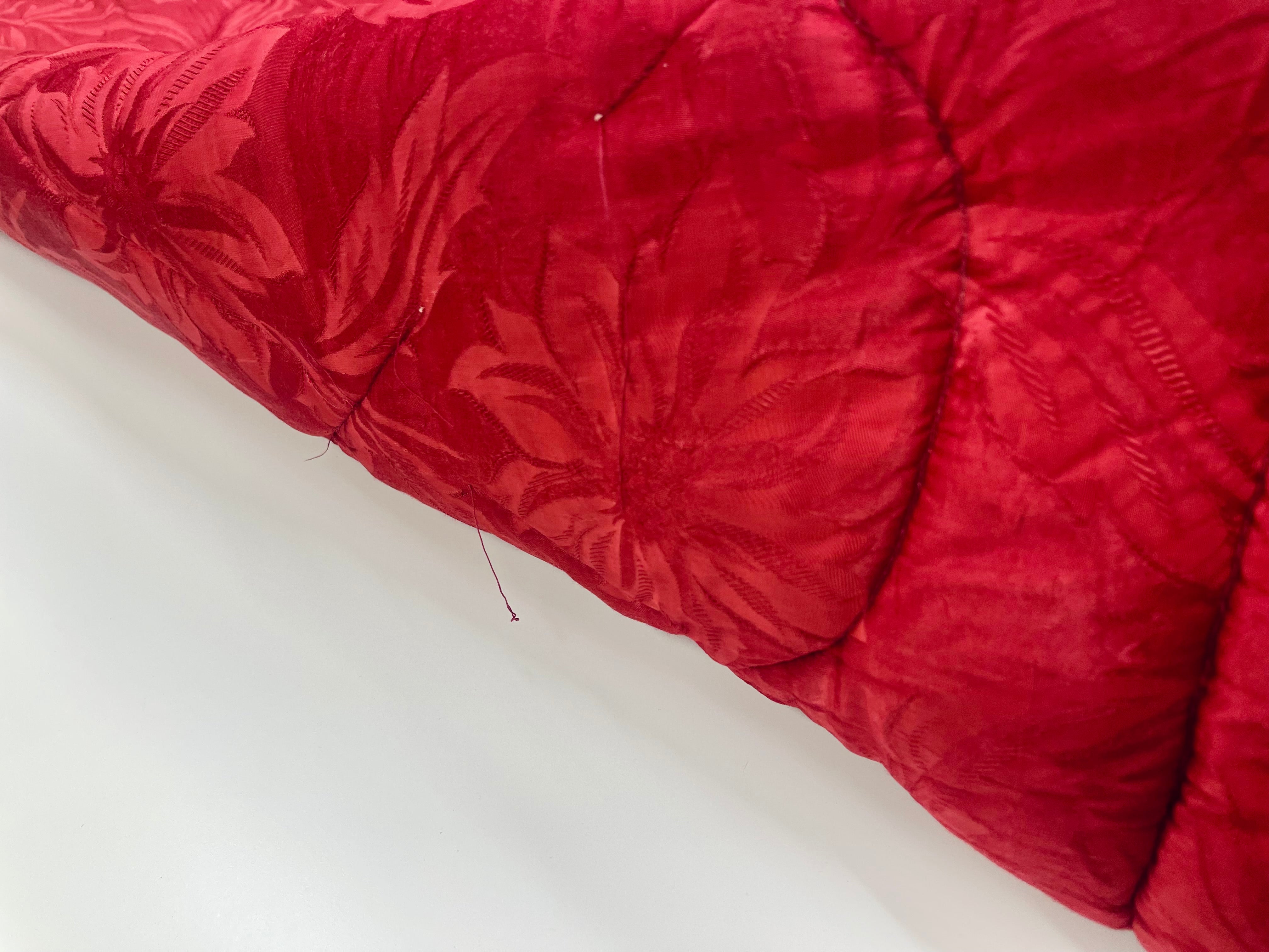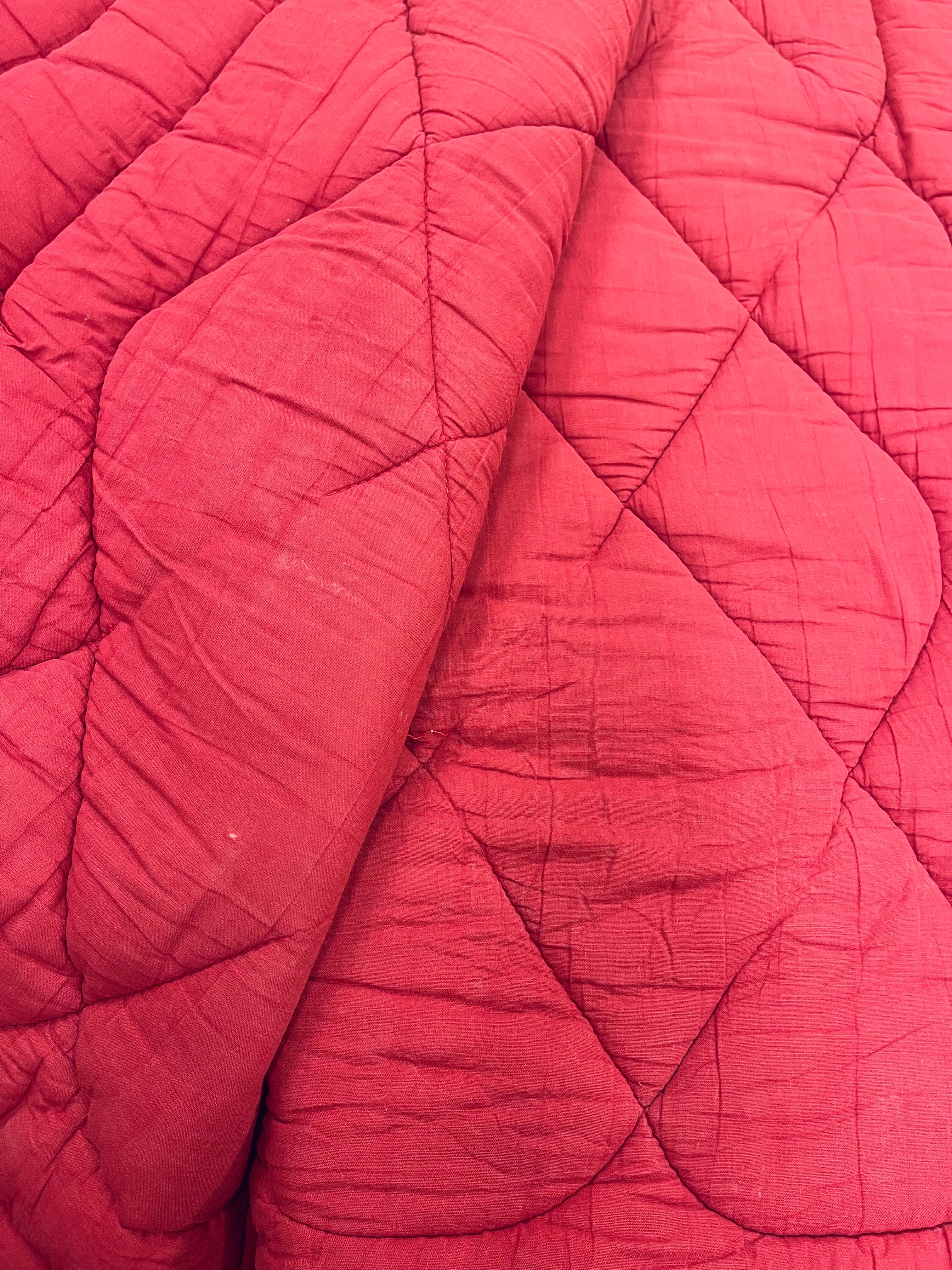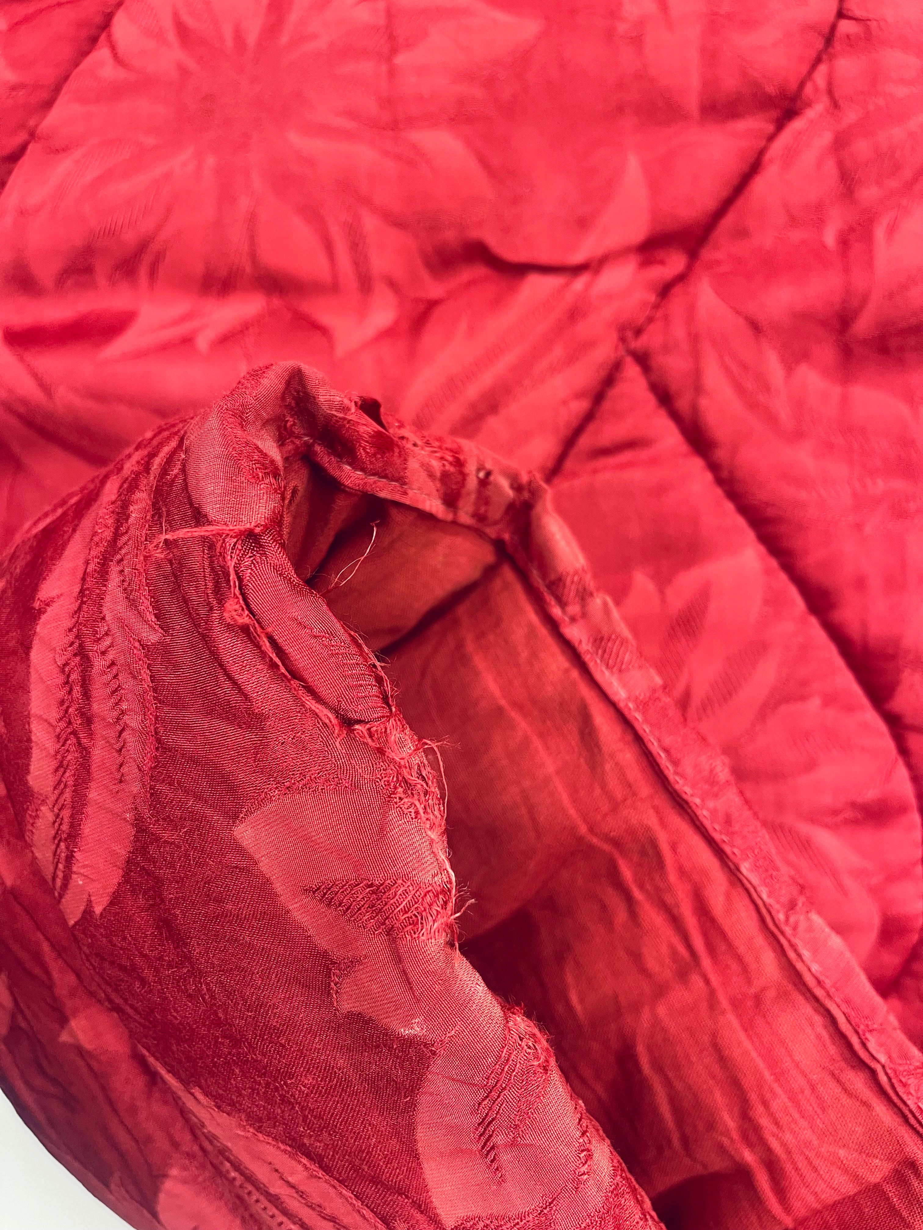 Vintage täcke i rött med blommigt mönster. Bruksskick, några små hål, några fläckar och spår av tidens tand, se bilder. Nytvättat och ingen lukt. Lite tyngre än vanliga täcken.