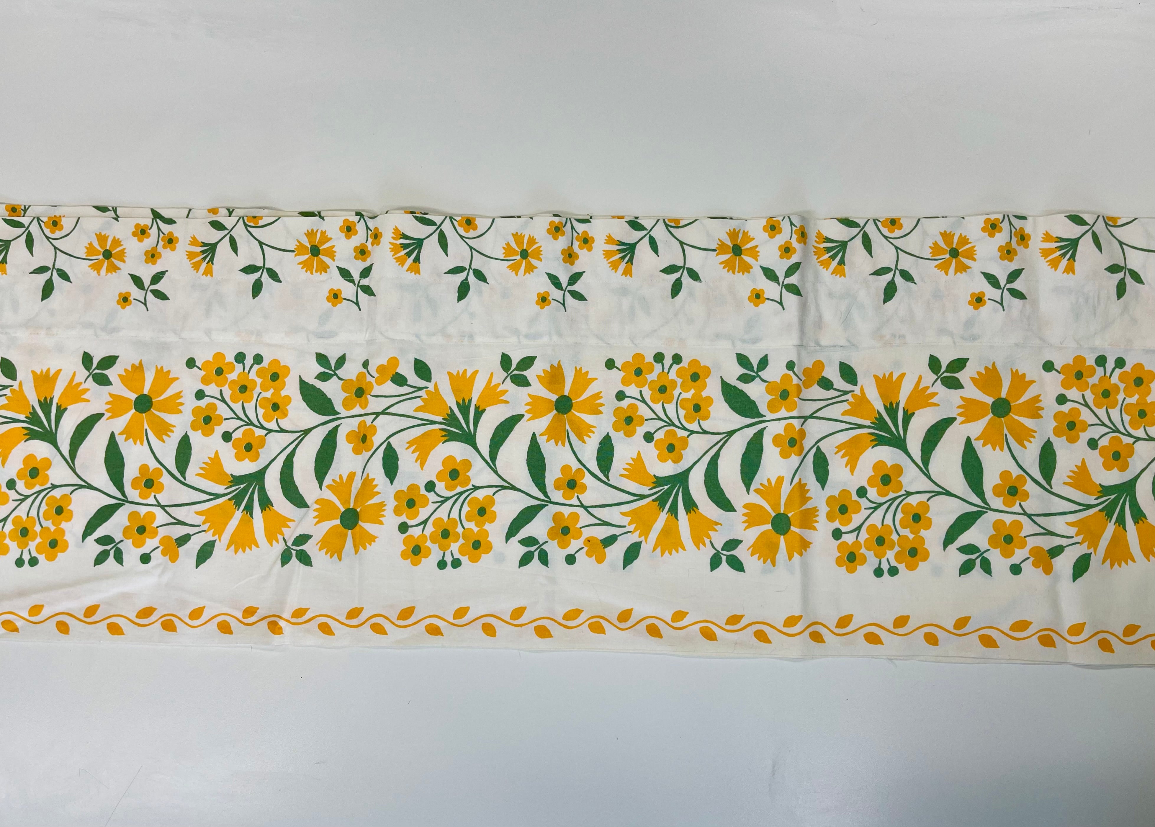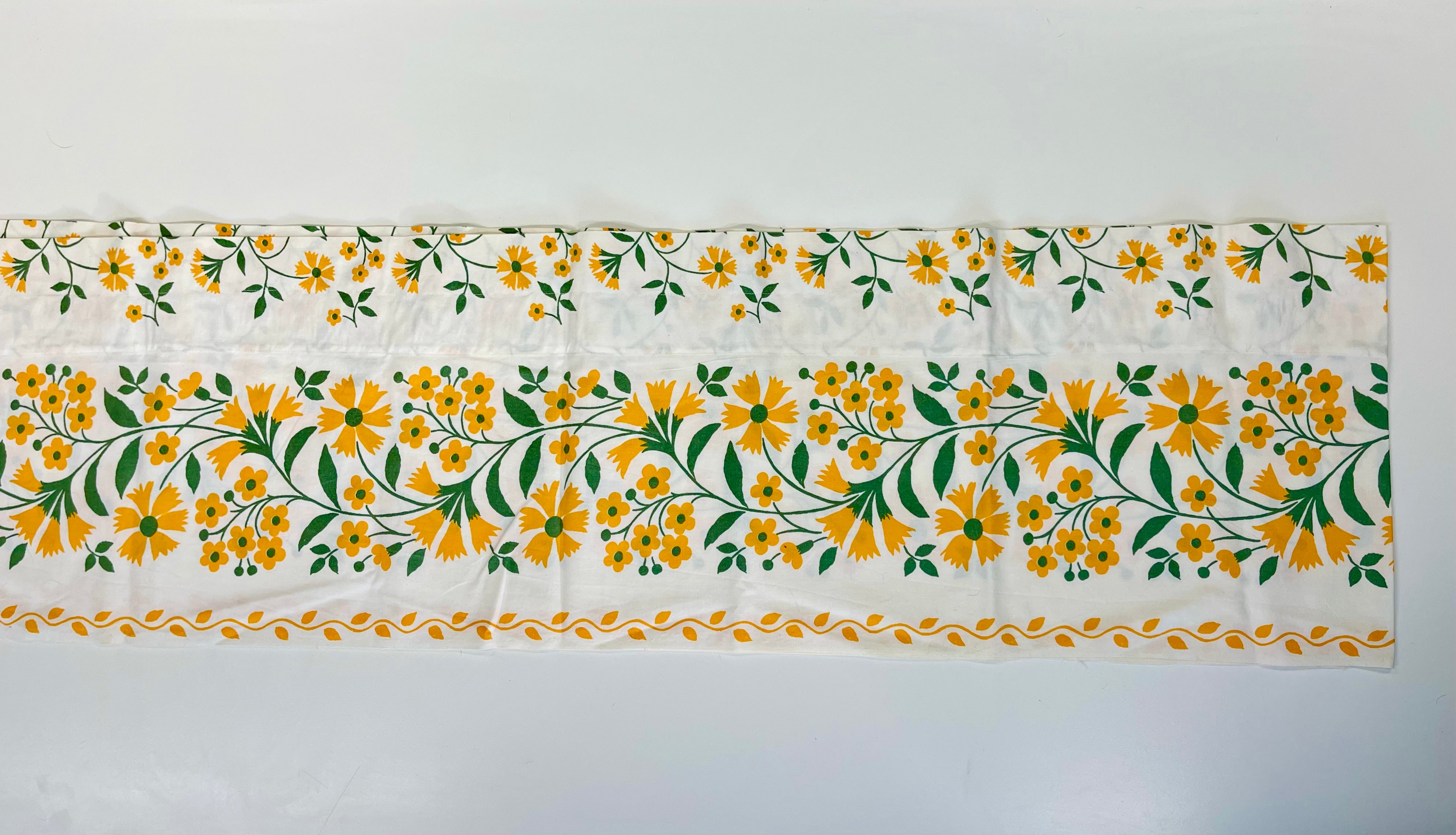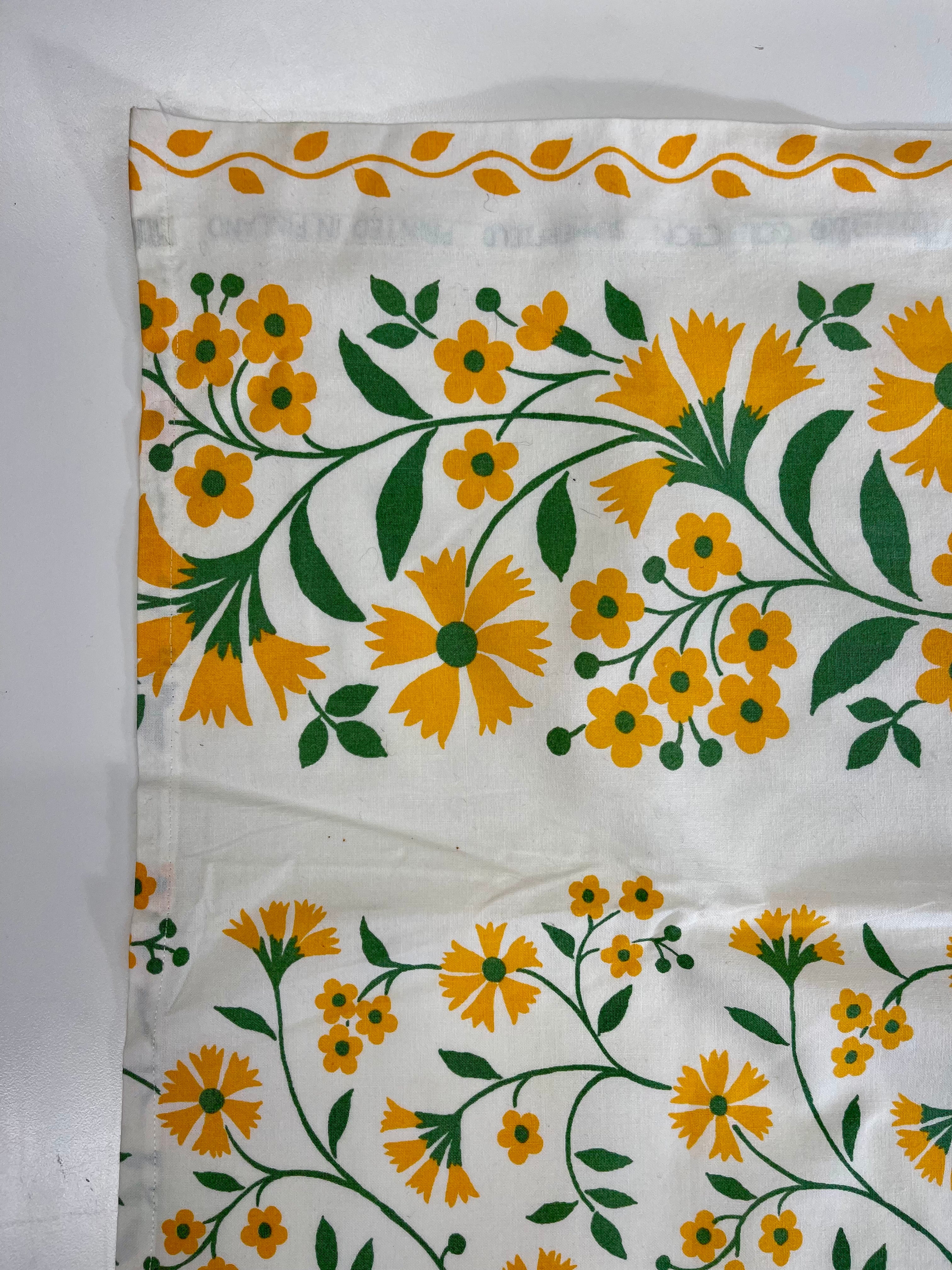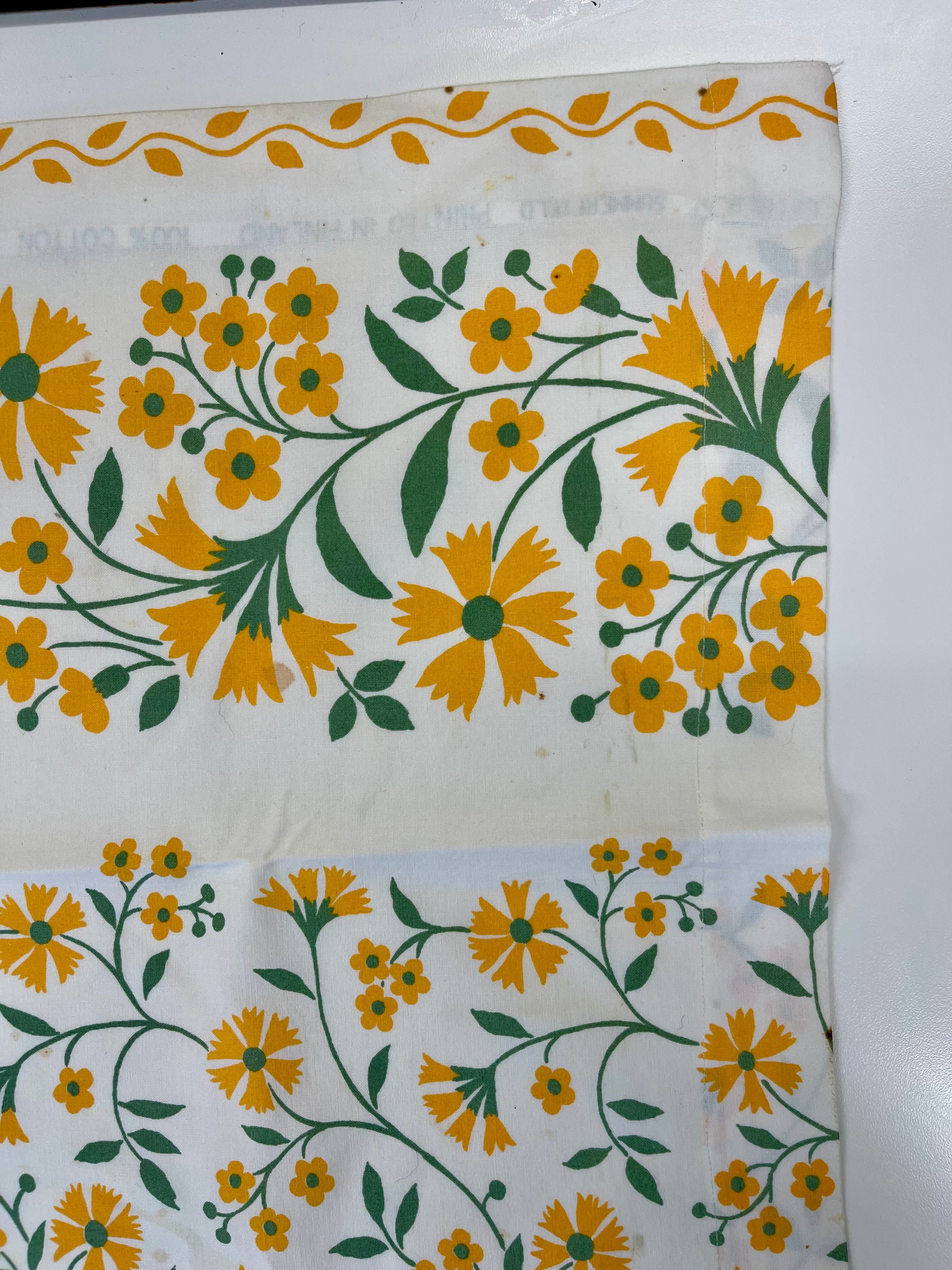 Jättefina vintagegardiner i bomullstyg, troligtvis från 1960-talet. Vitt botten, dekorerat med gul-orange blommor (varm gul färg). 🌼 Två längder och en kappa. Några små fläckar förekommer men överlag i jättefint skick. Hemmagjorda men tyget är tryckt och tillverkat i Finland. 🇫🇮