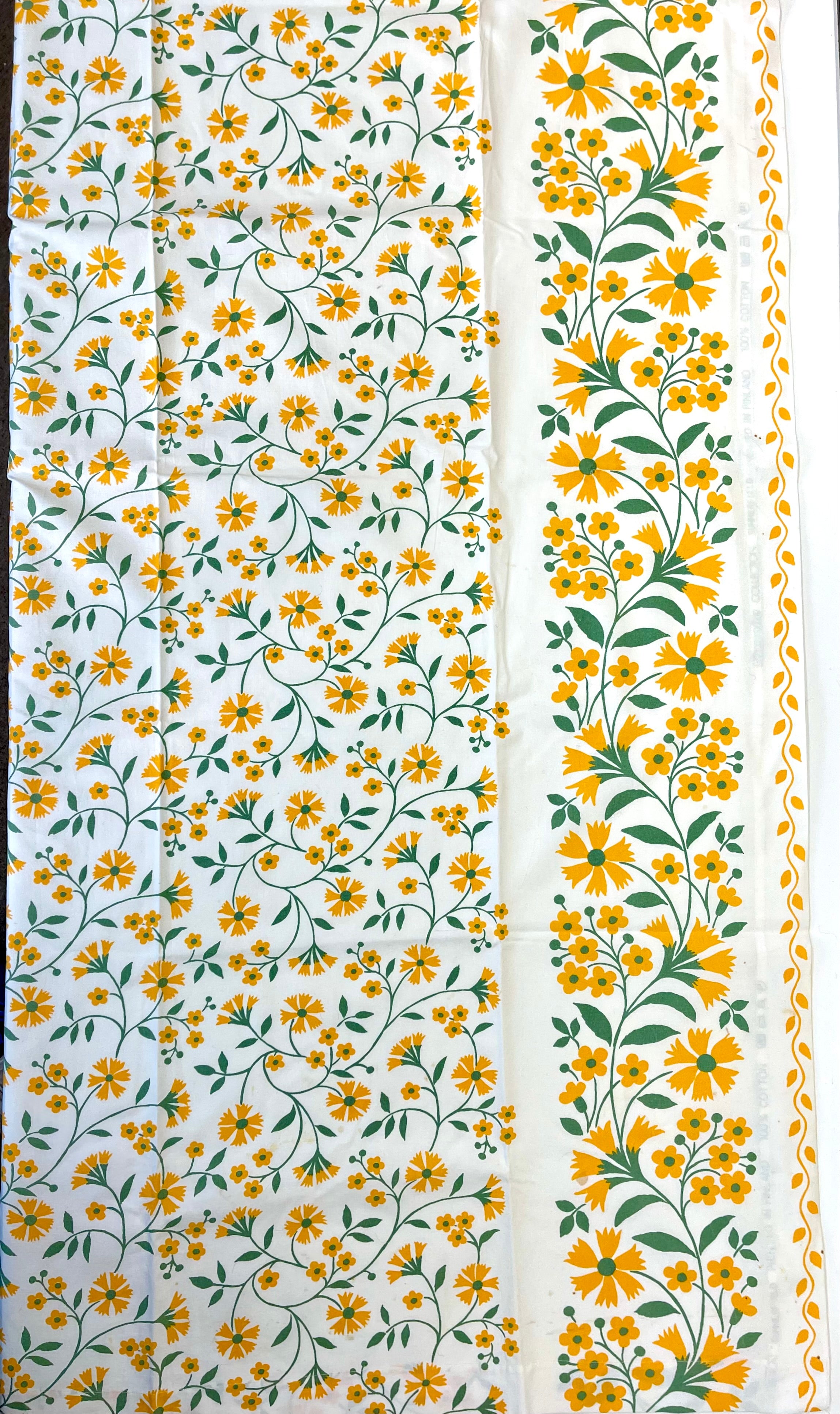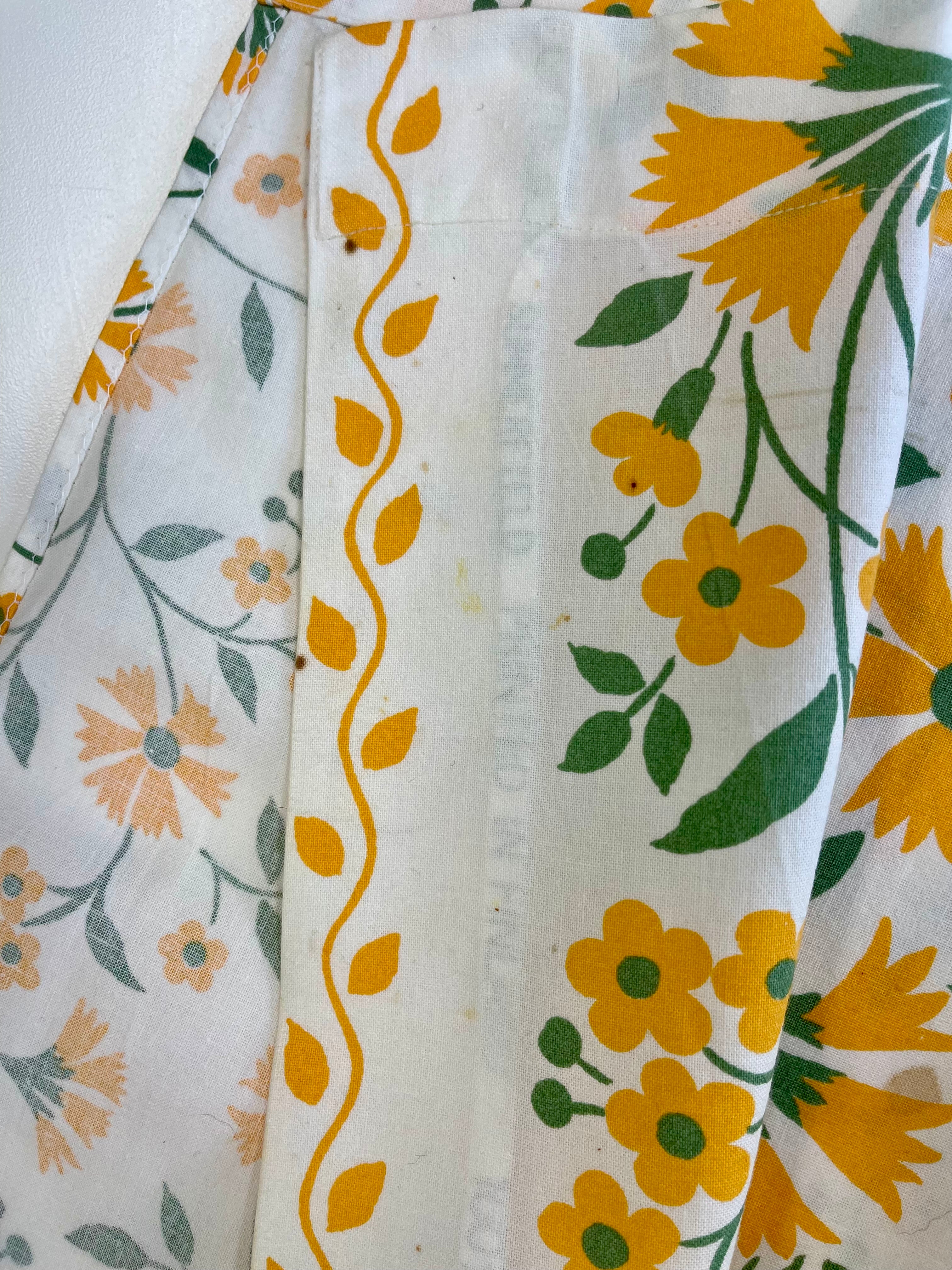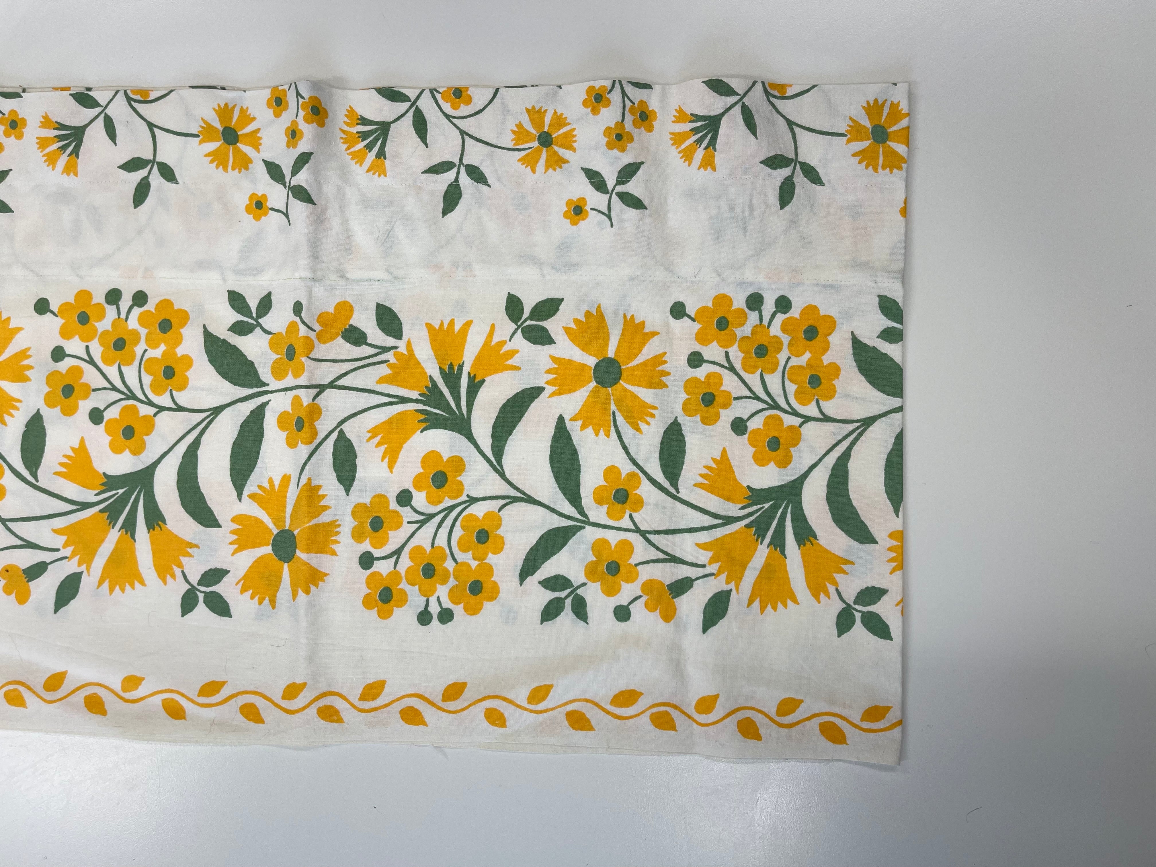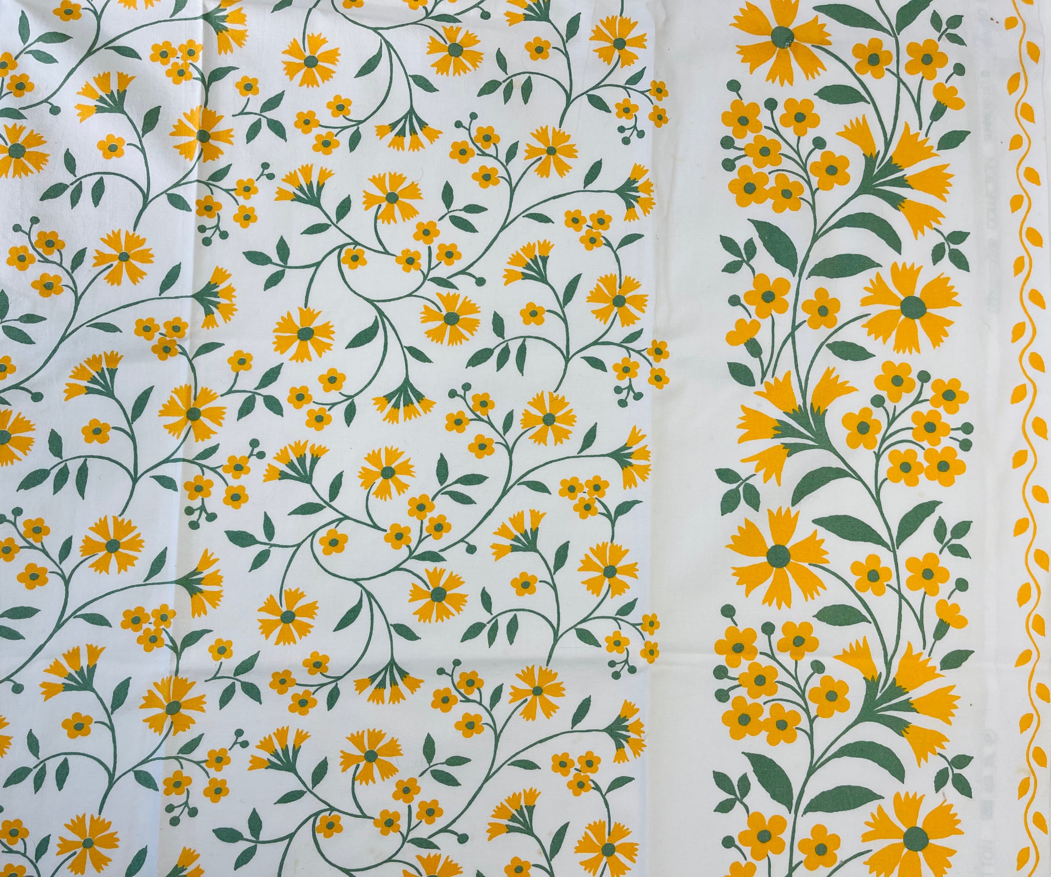 Jättefina vintagegardiner i bomullstyg, troligtvis från 1960-talet. Vitt botten, dekorerat med gul-orange blommor (varm gul färg). 🌼 Två längder och en kappa. Några små fläckar förekommer men överlag i jättefint skick. Hemmagjorda men tyget är tryckt och tillverkat i Finland. 🇫🇮