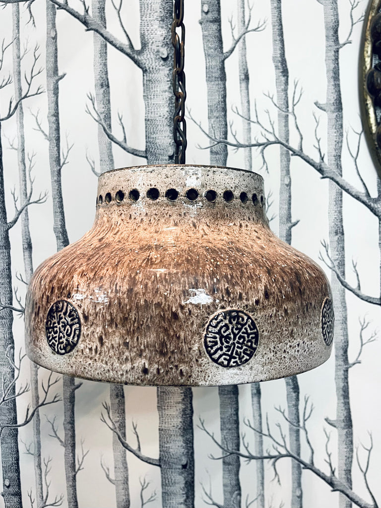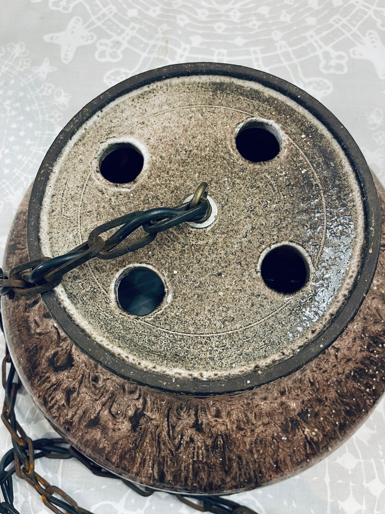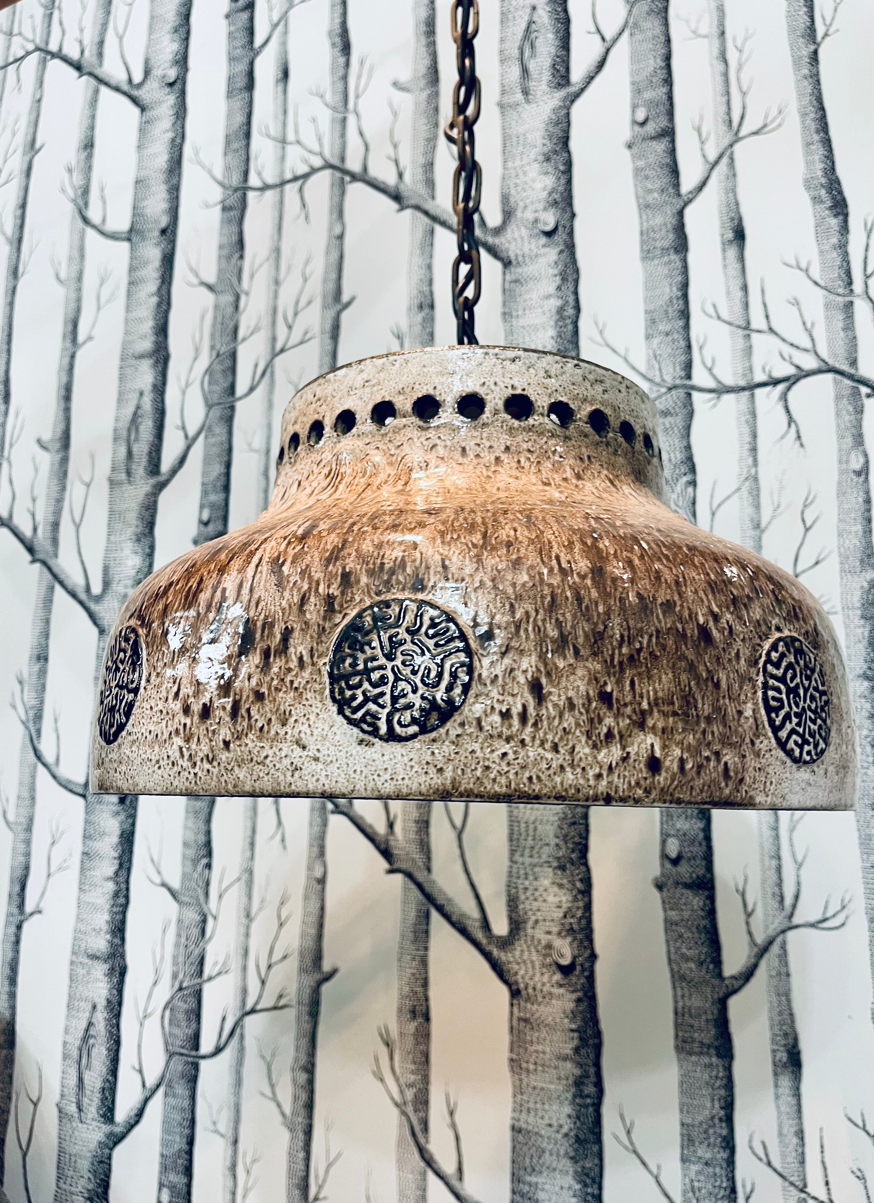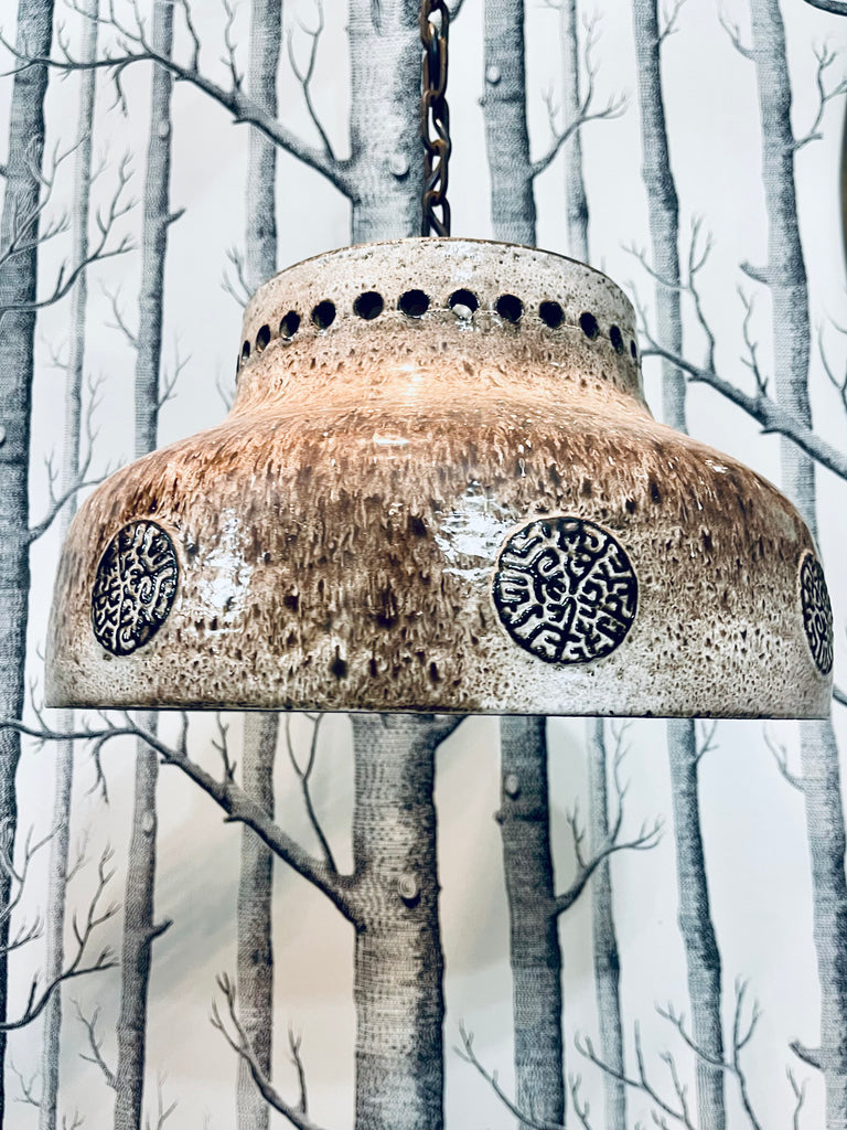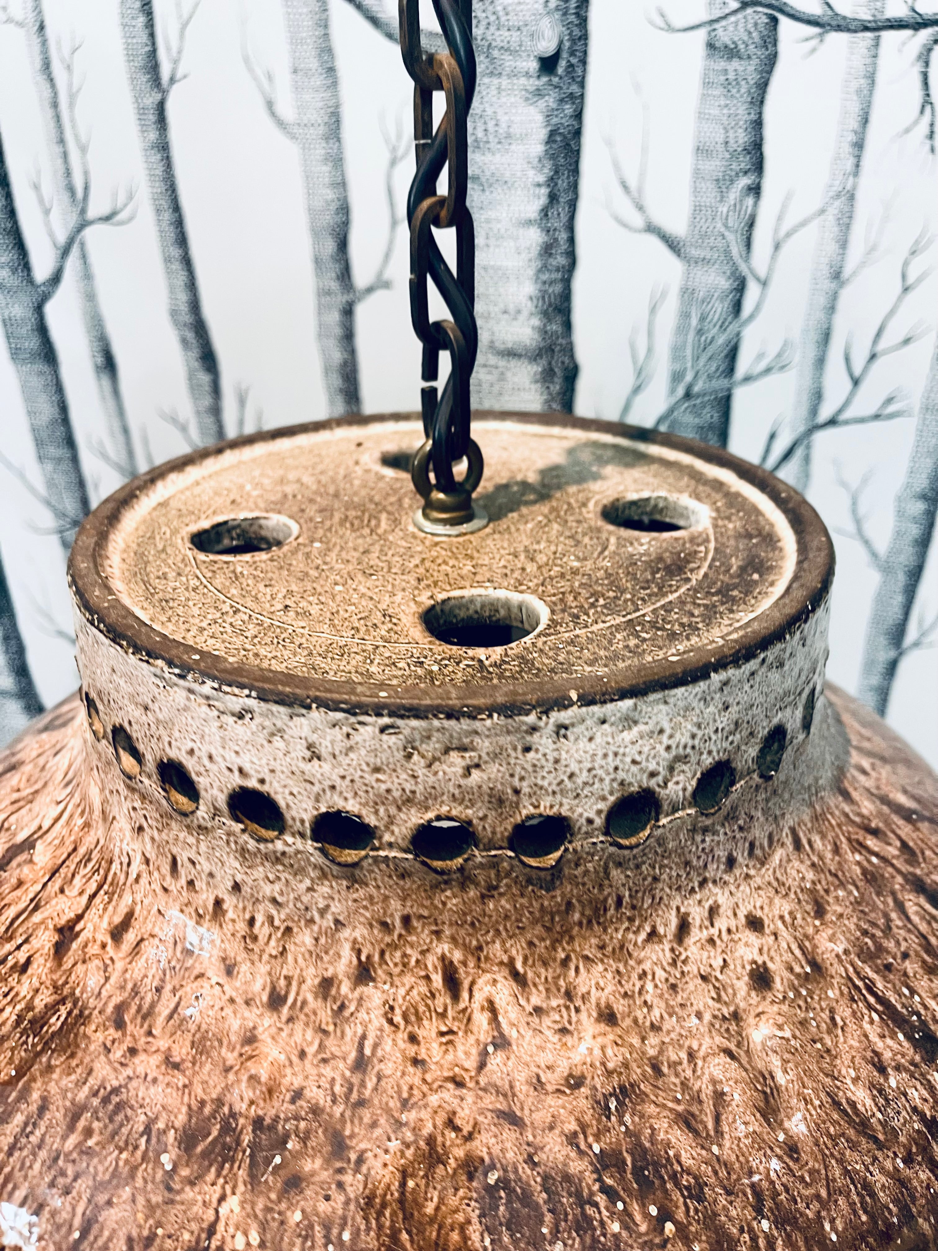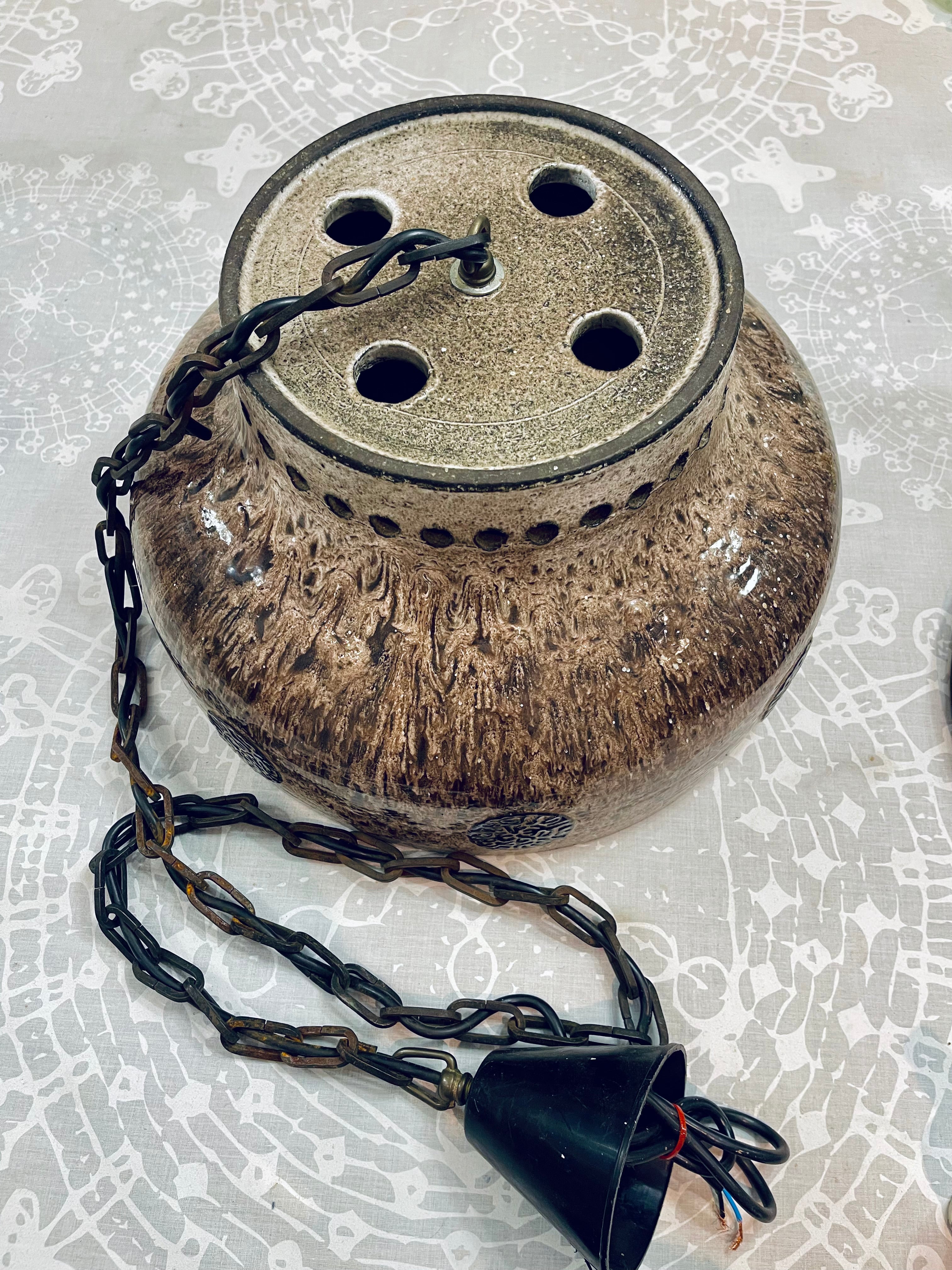 Tung och massiv taklampa i brutalistisk stil. Troligtvis tillverkad i Danmark, ca. 1970-tal. Lång lettisk för upphängning, i priset ingår att vår elektriker lägger till önskad takkontakt till lampan.
