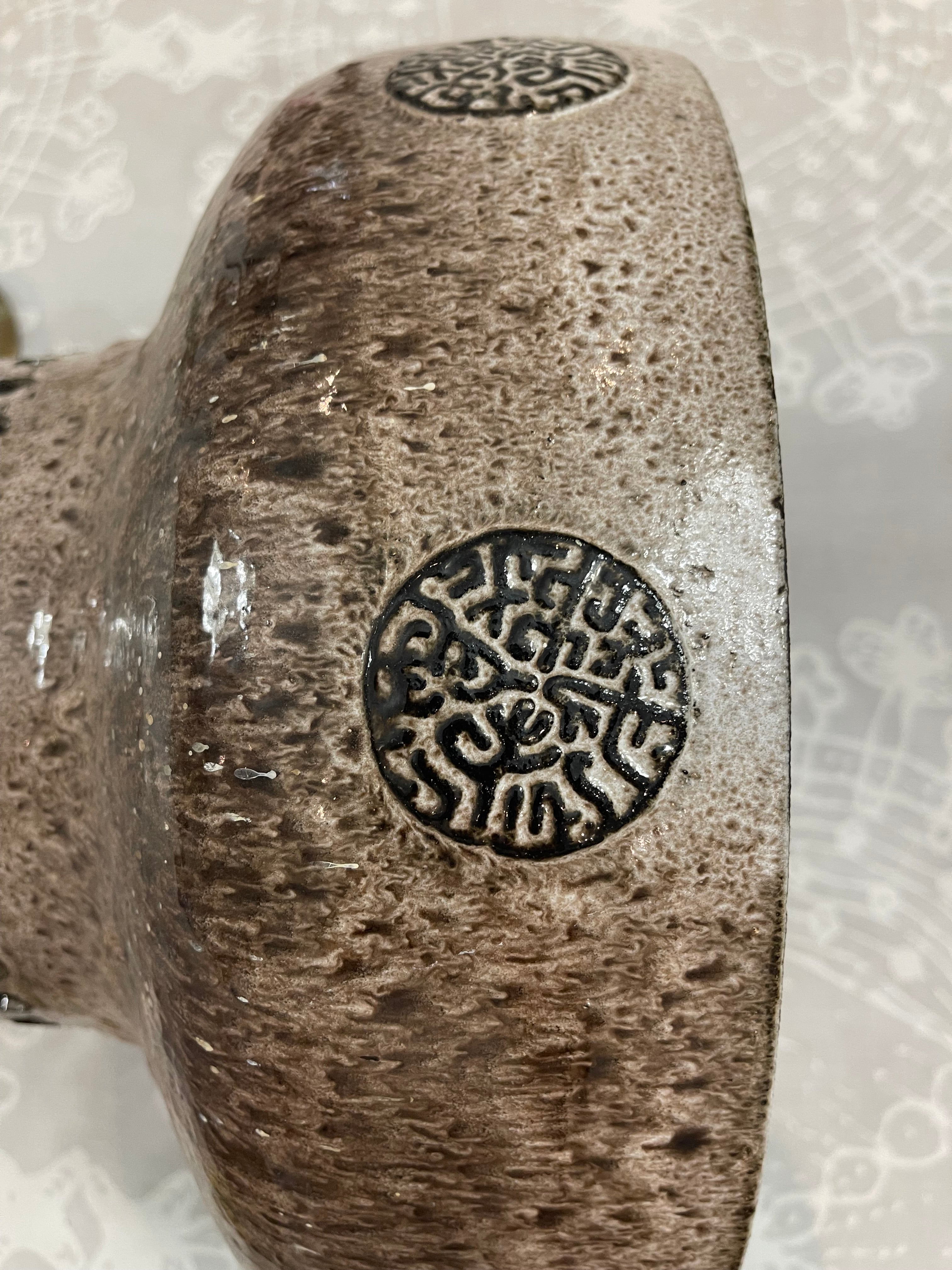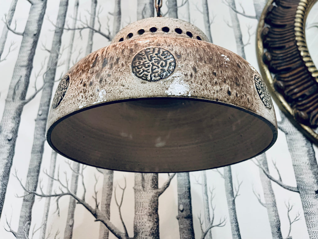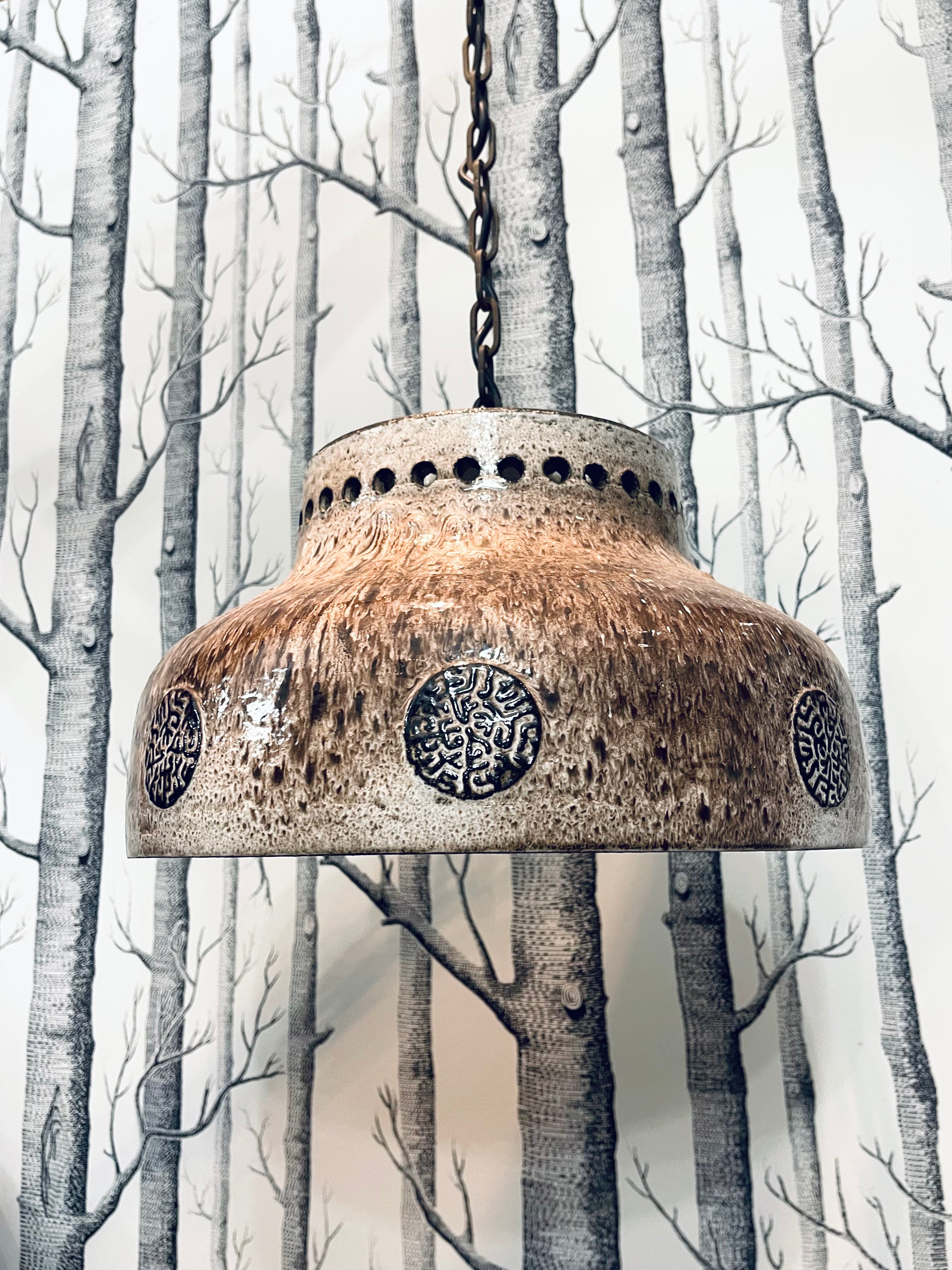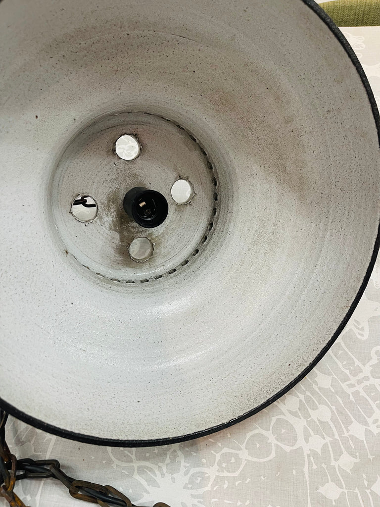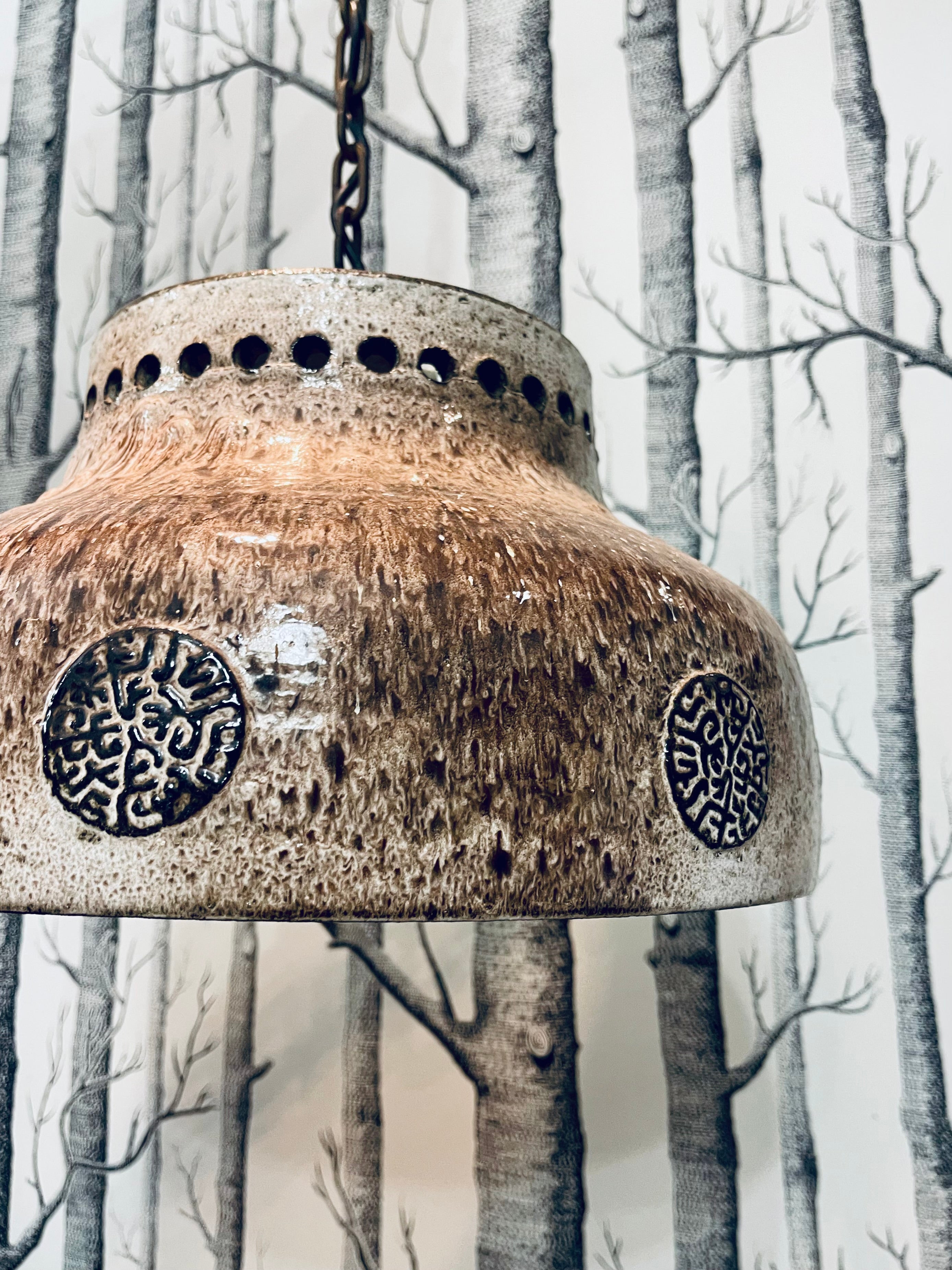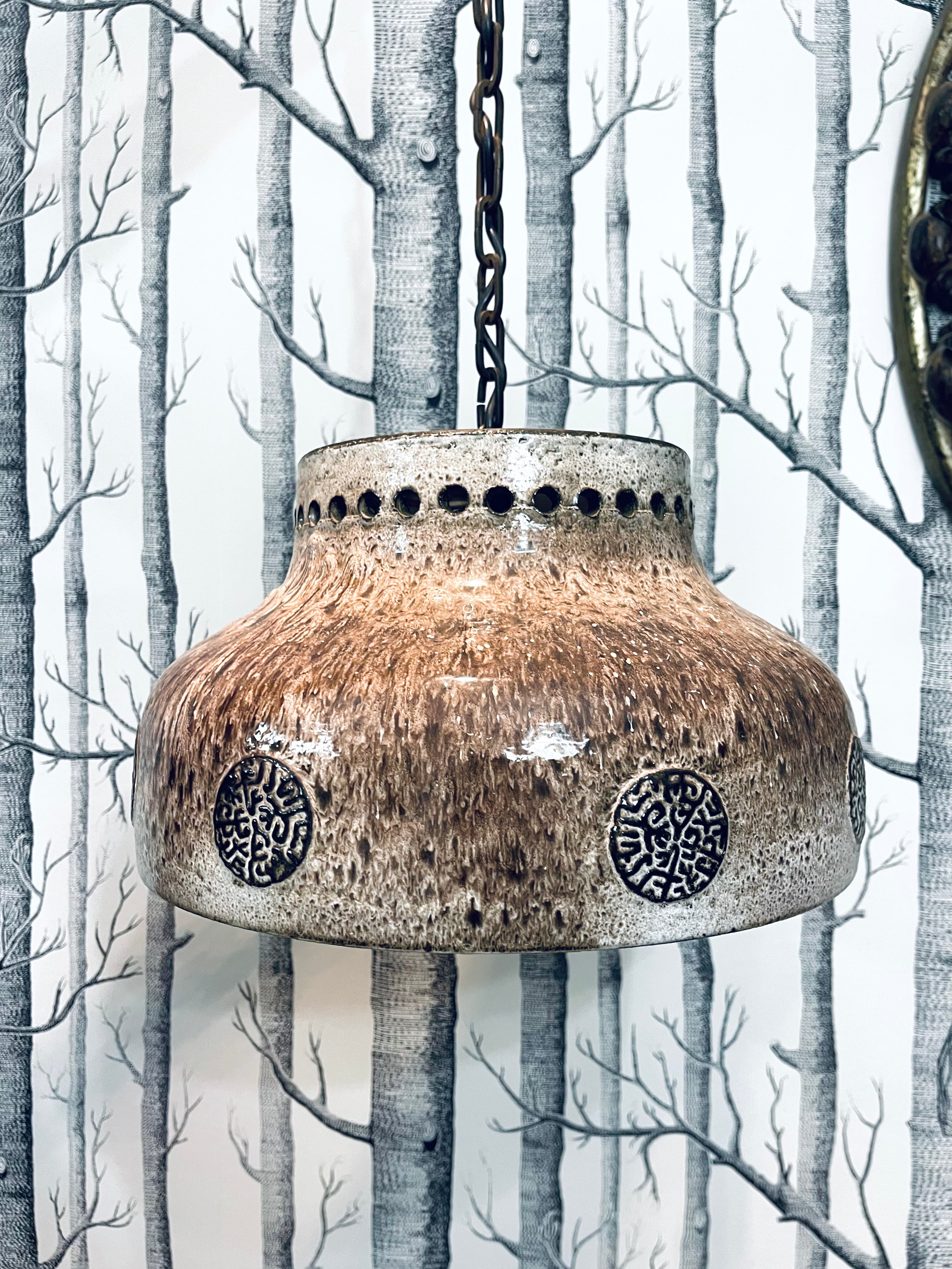 Tung och massiv taklampa i brutalistisk stil. Troligtvis tillverkad i Danmark, ca. 1970-tal. Lång lettisk för upphängning, i priset ingår att vår elektriker lägger till önskad takkontakt till lampan.