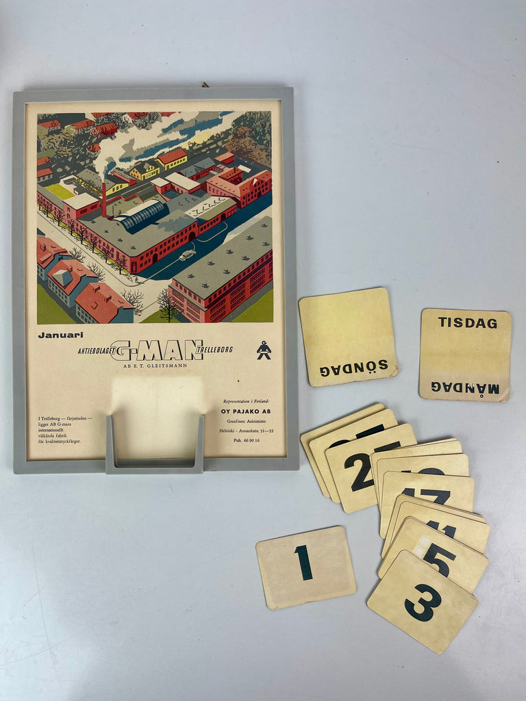 Skick enligt bilder. Det syns var dagarna har skymt bakgrunden och måndag och 1 är betydligt mer solblekt än resten. Ändå i allmänt gott skick för sin ålder. Troligtvis från 1950-talet.