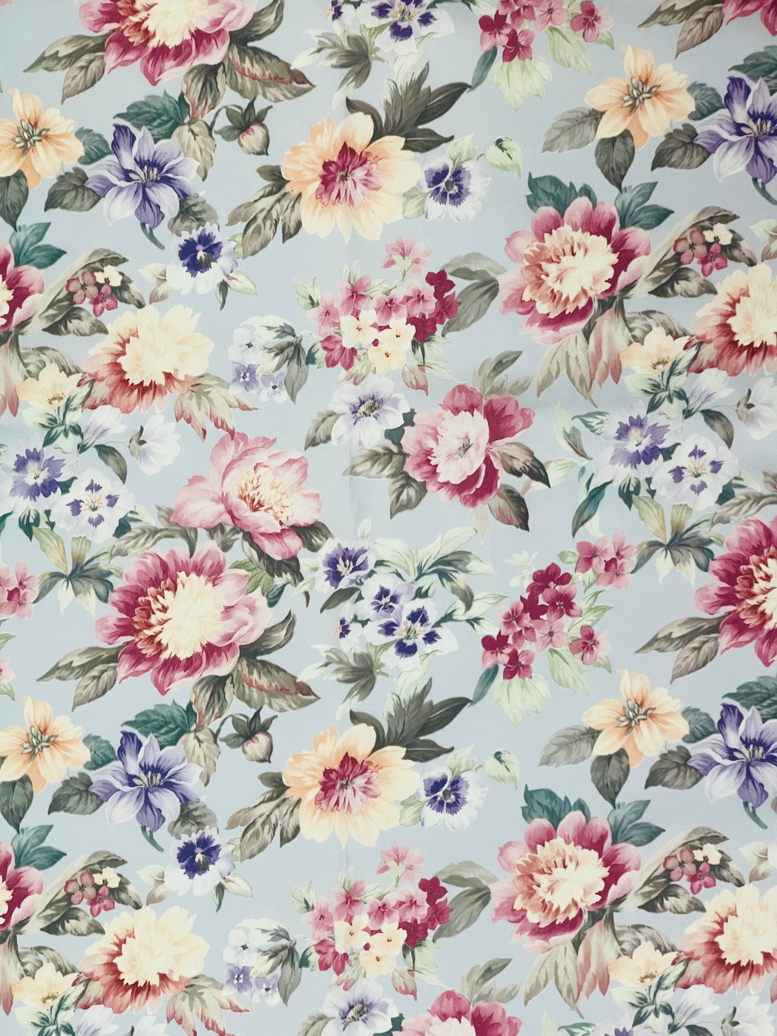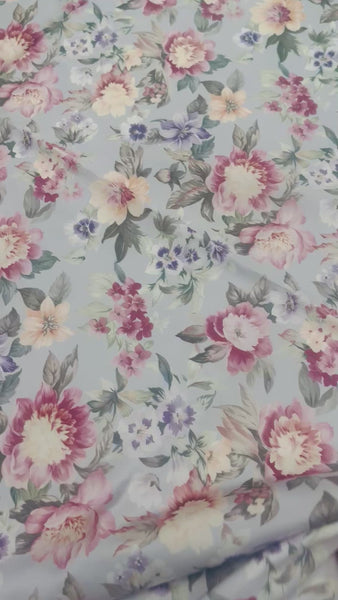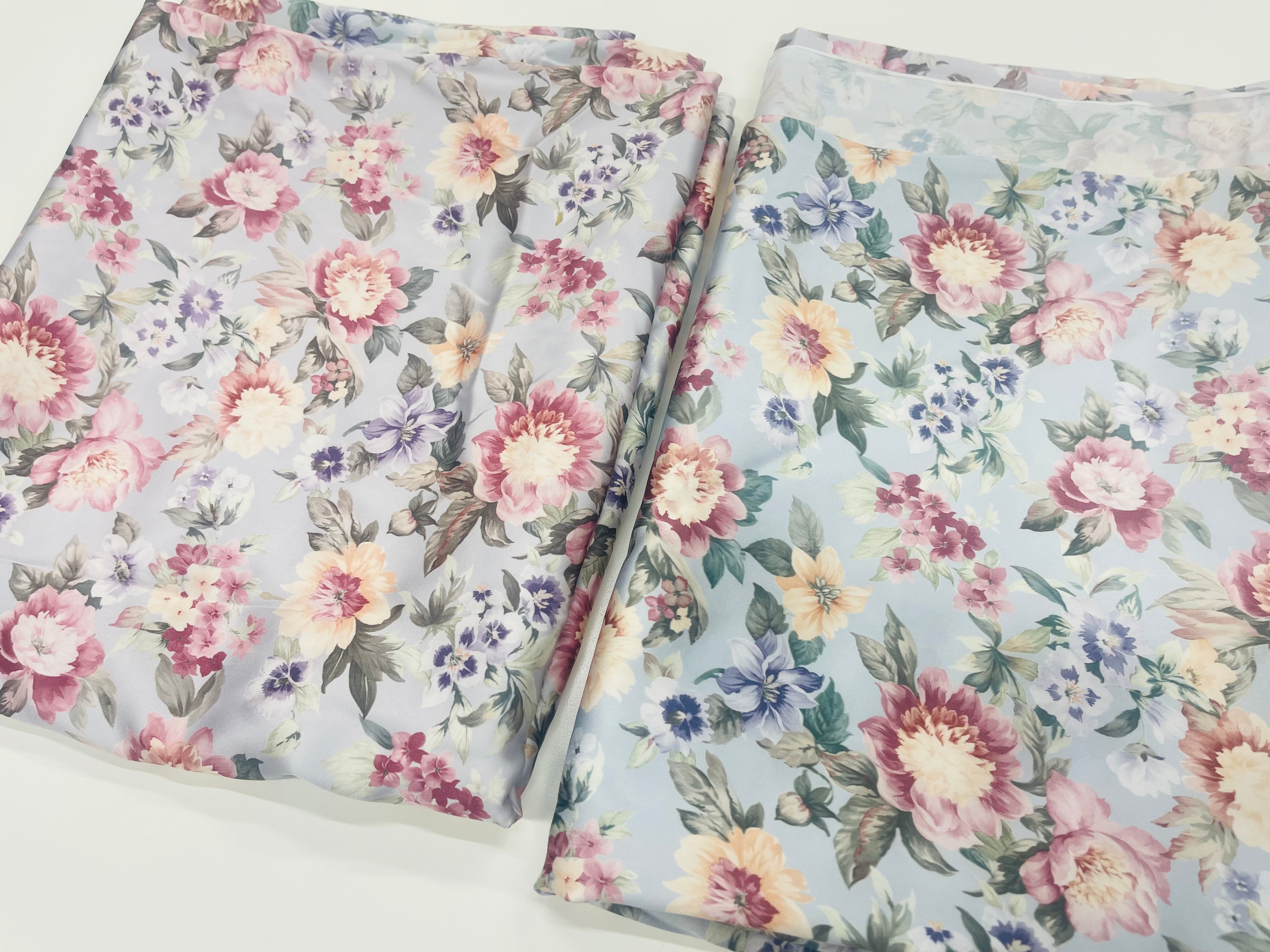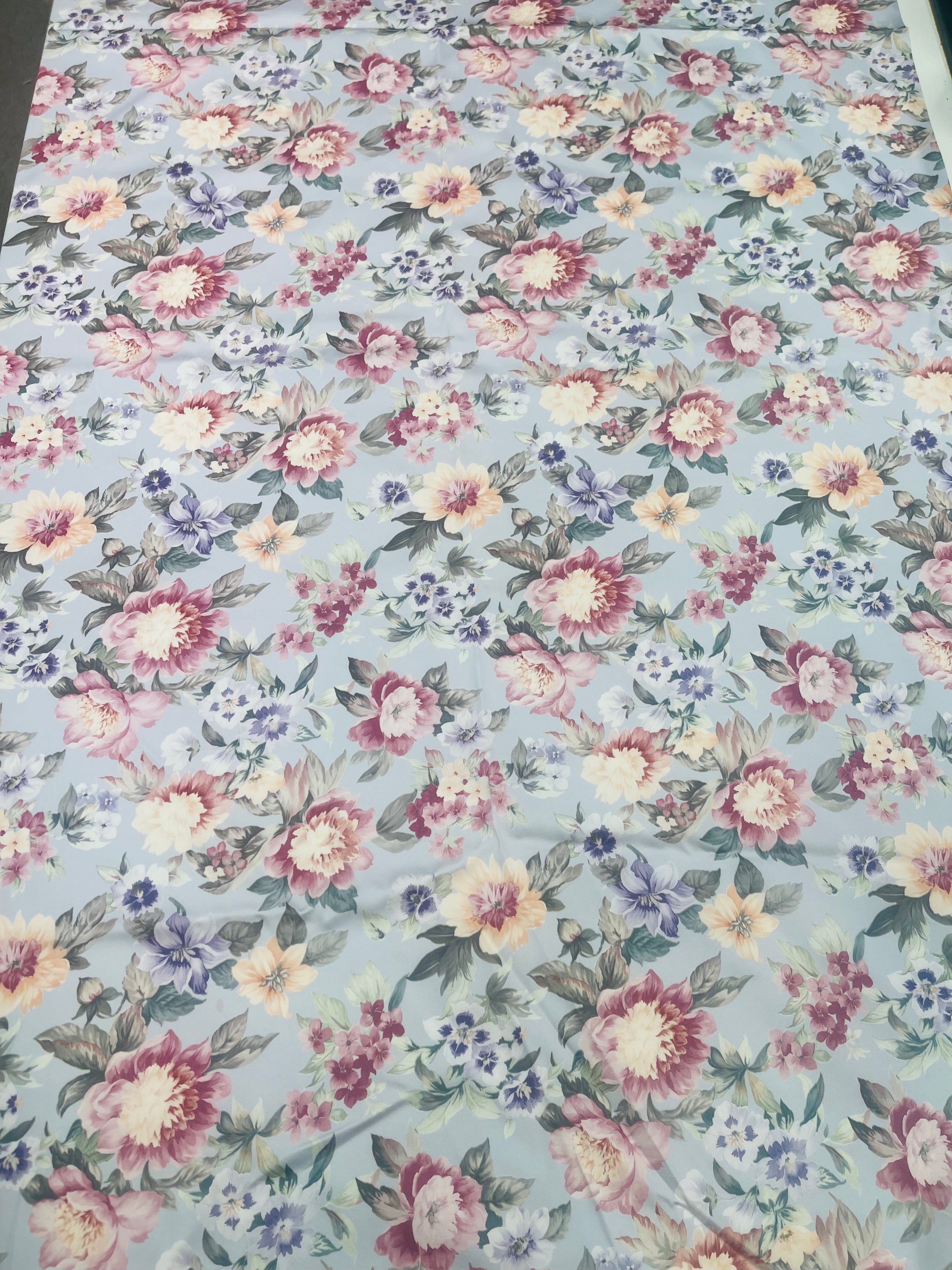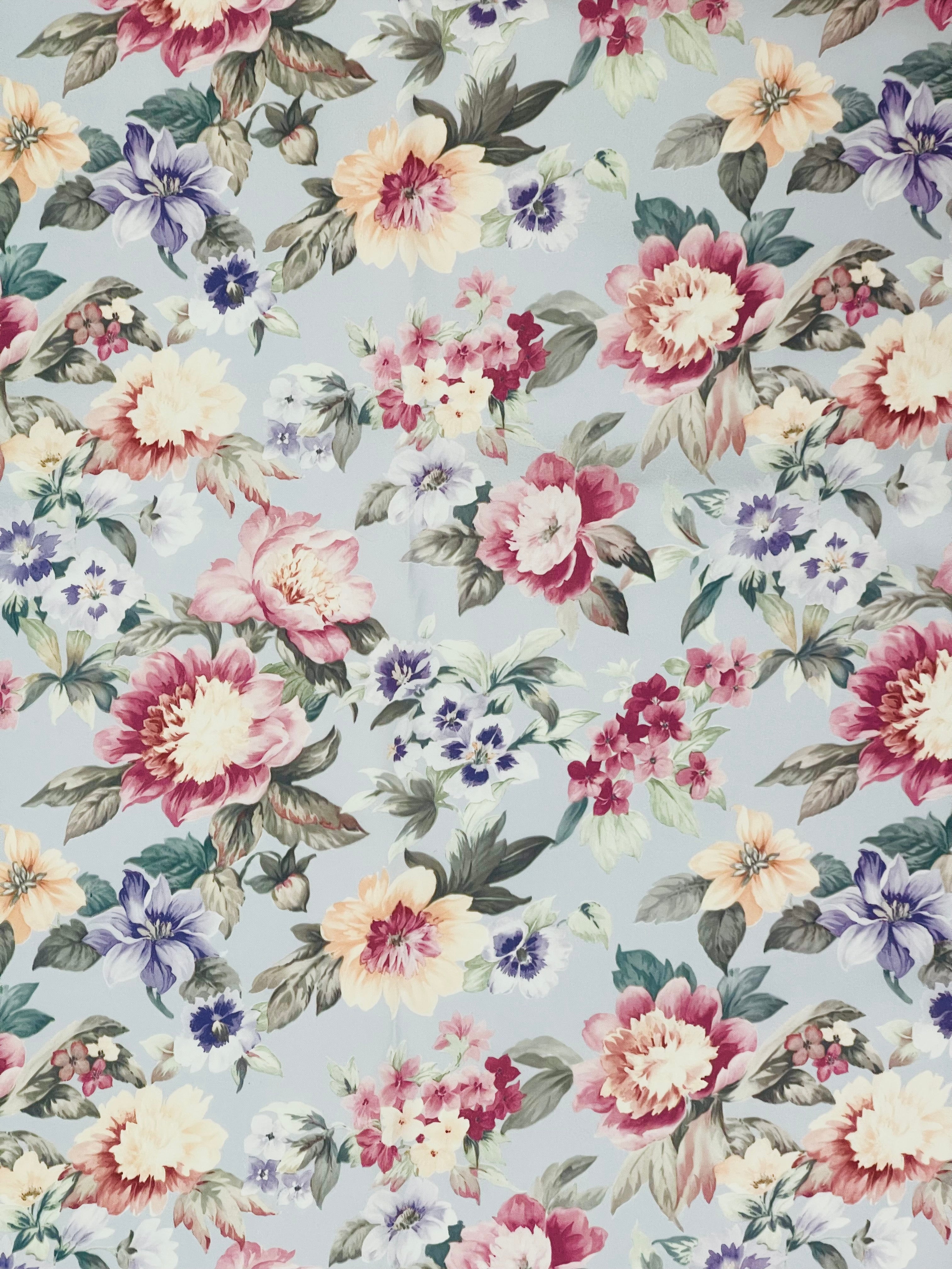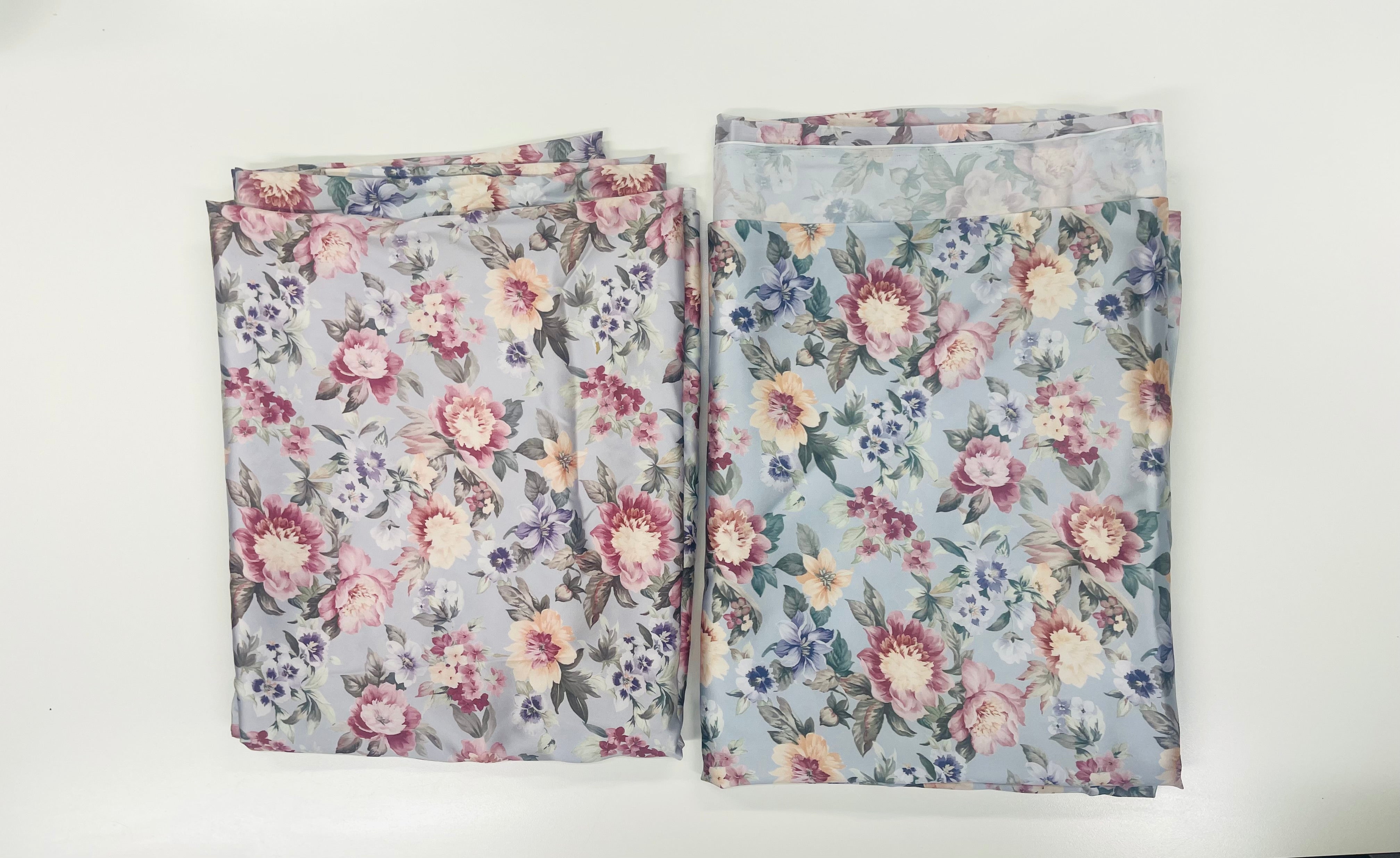 Blommiga gardiner i glatt, lent tyg. Botten är gråblått till grålila, beroende på var i längden man ser.