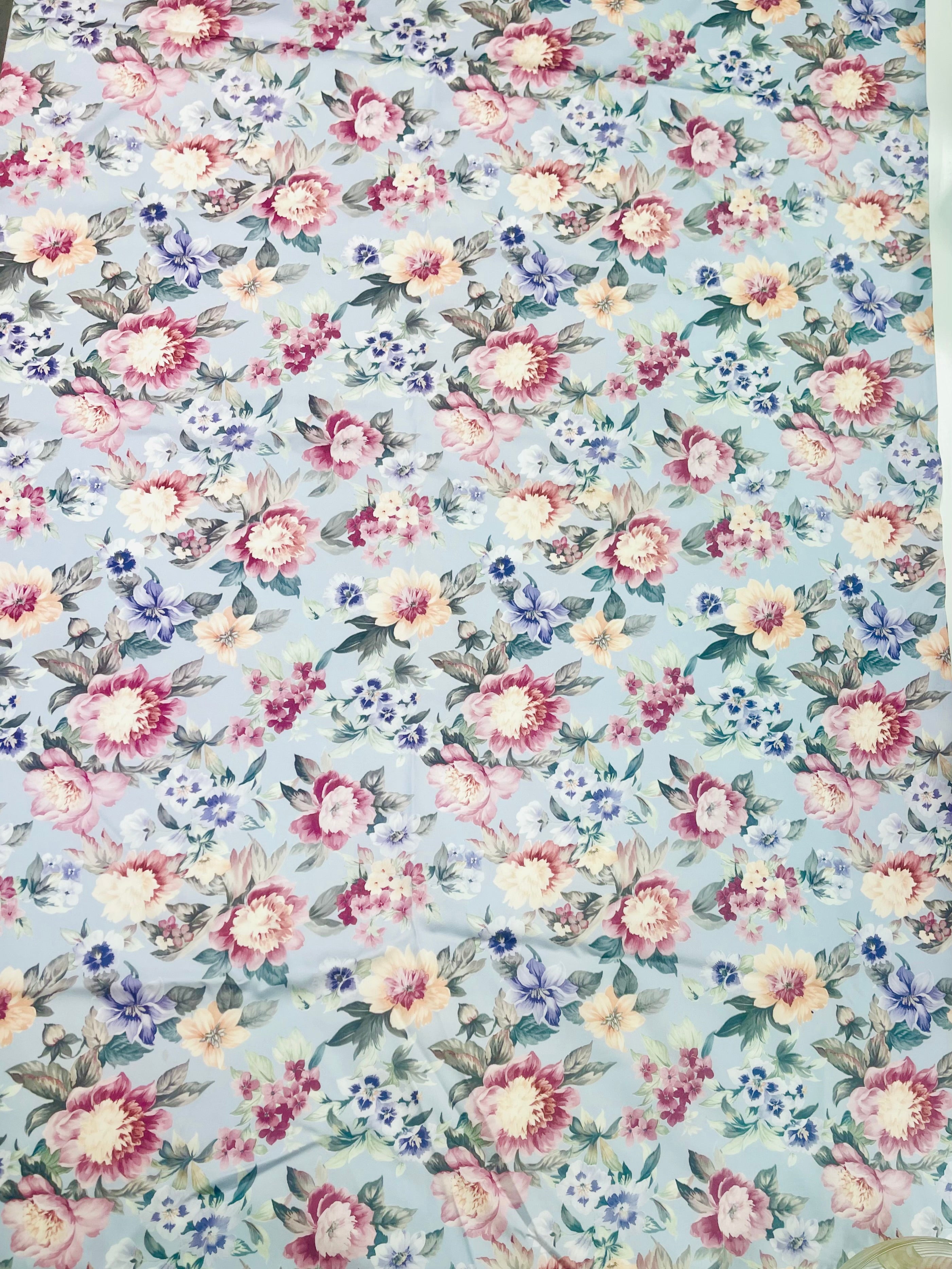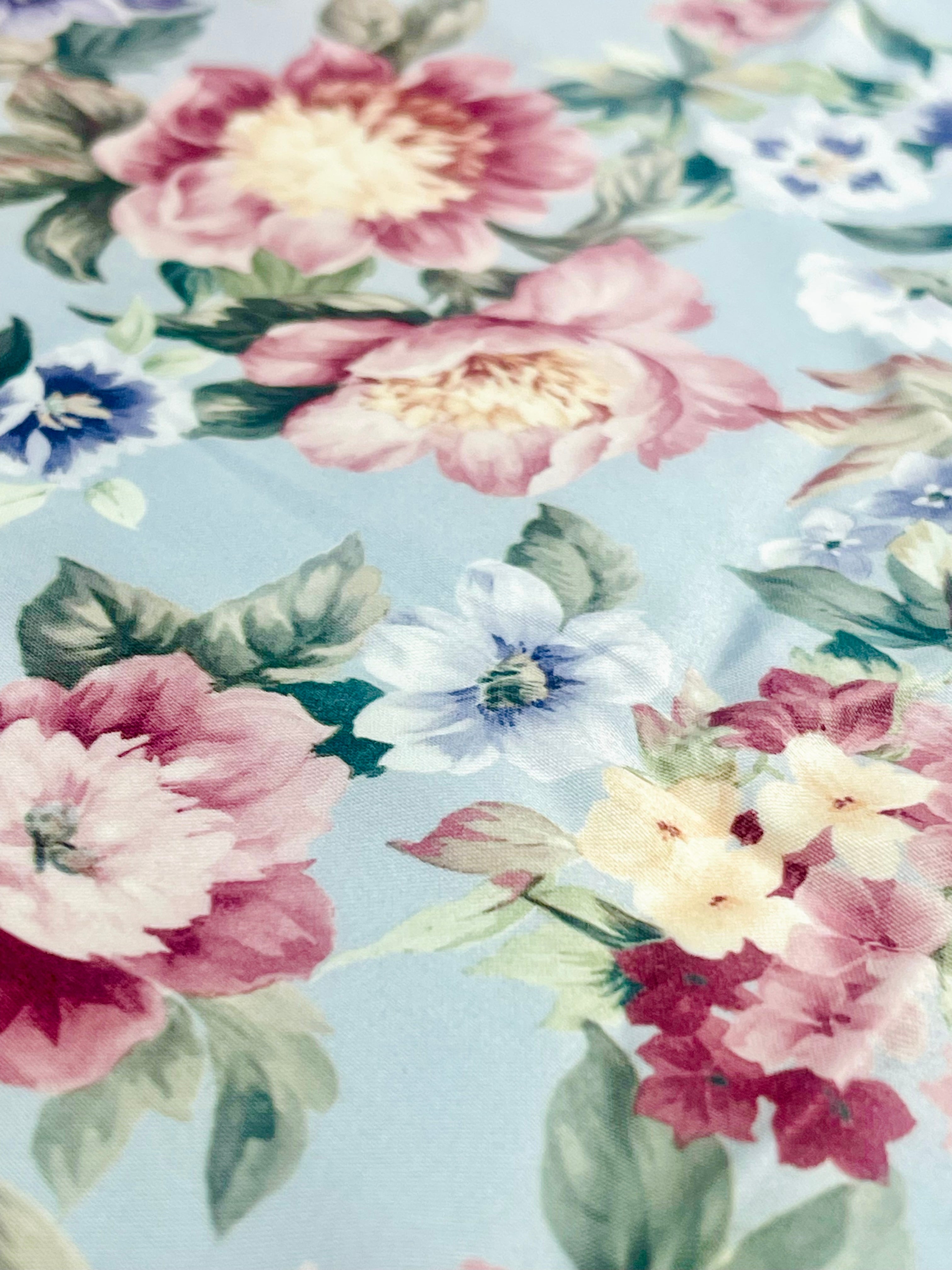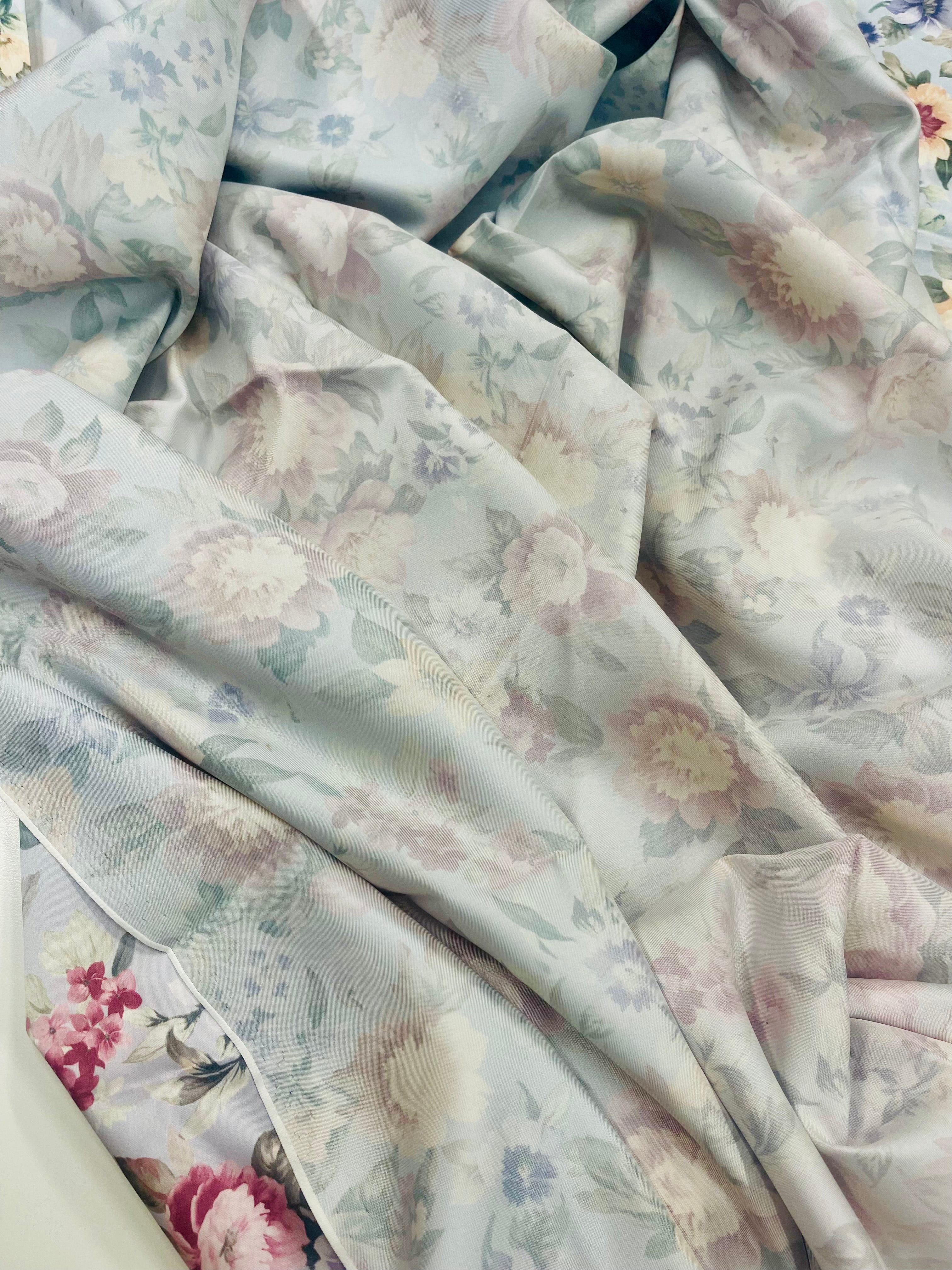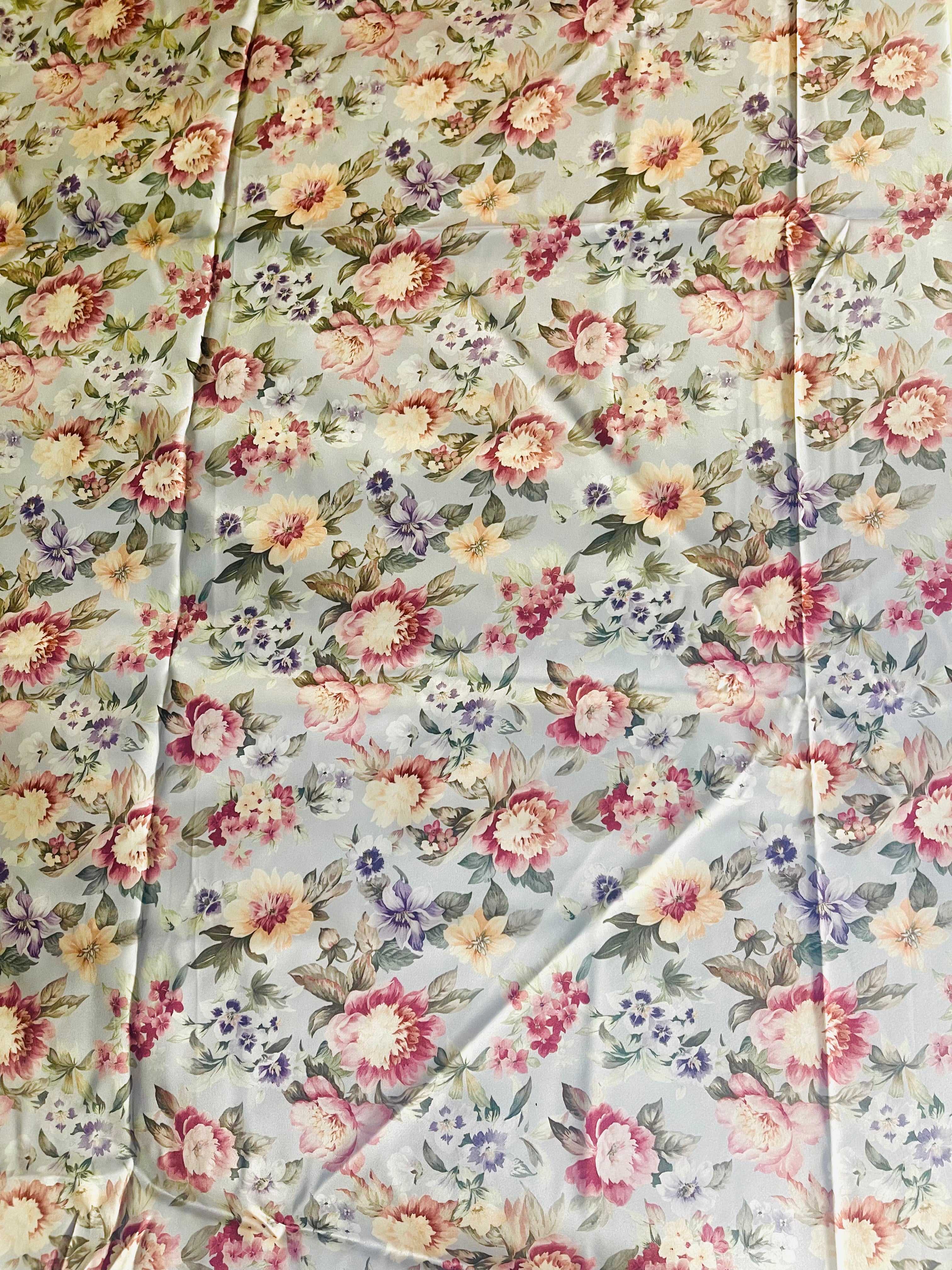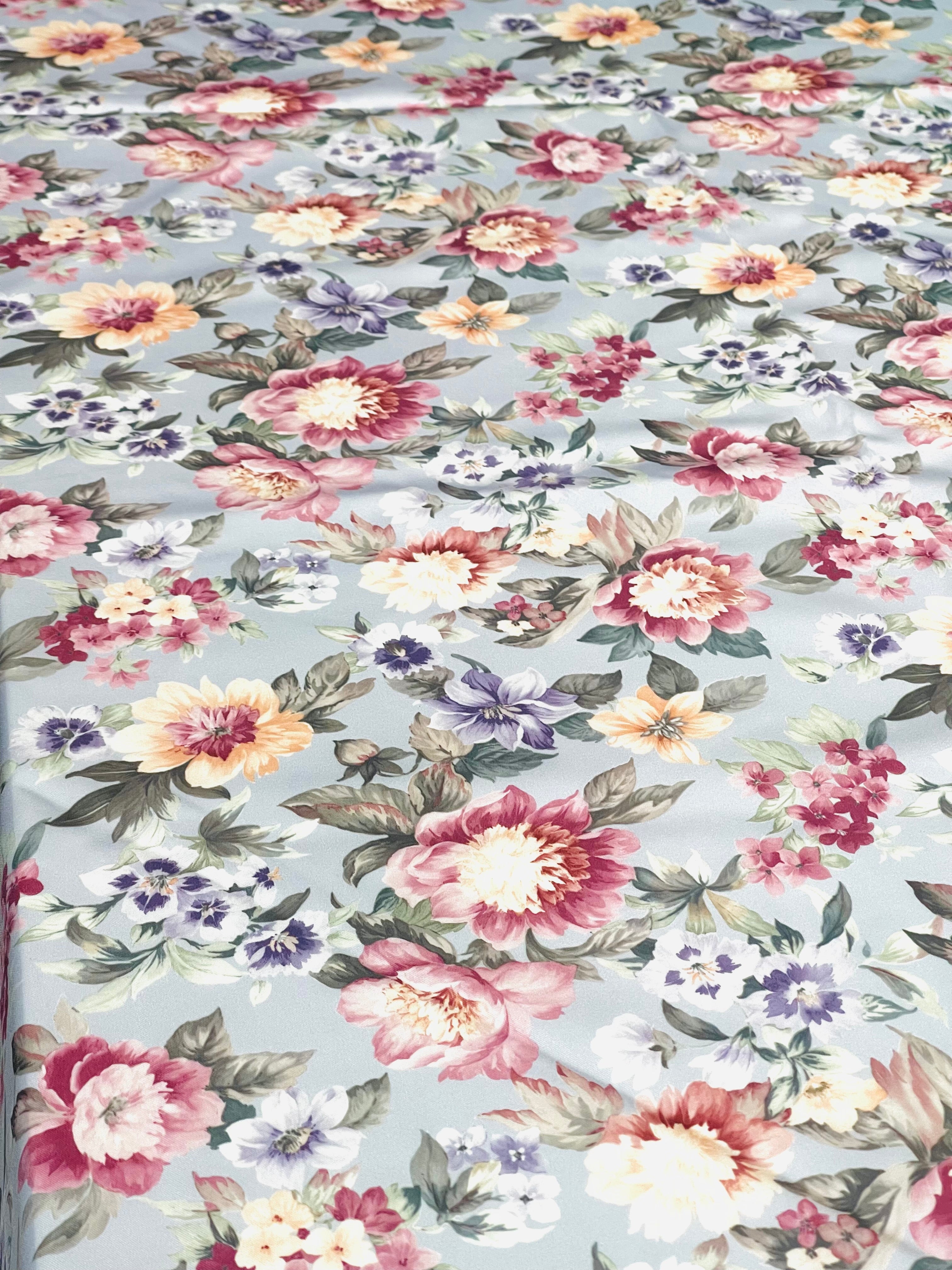 Blommiga gardiner i glatt, lent tyg. Botten är gråblått till grålila, beroende på var i längden man ser.