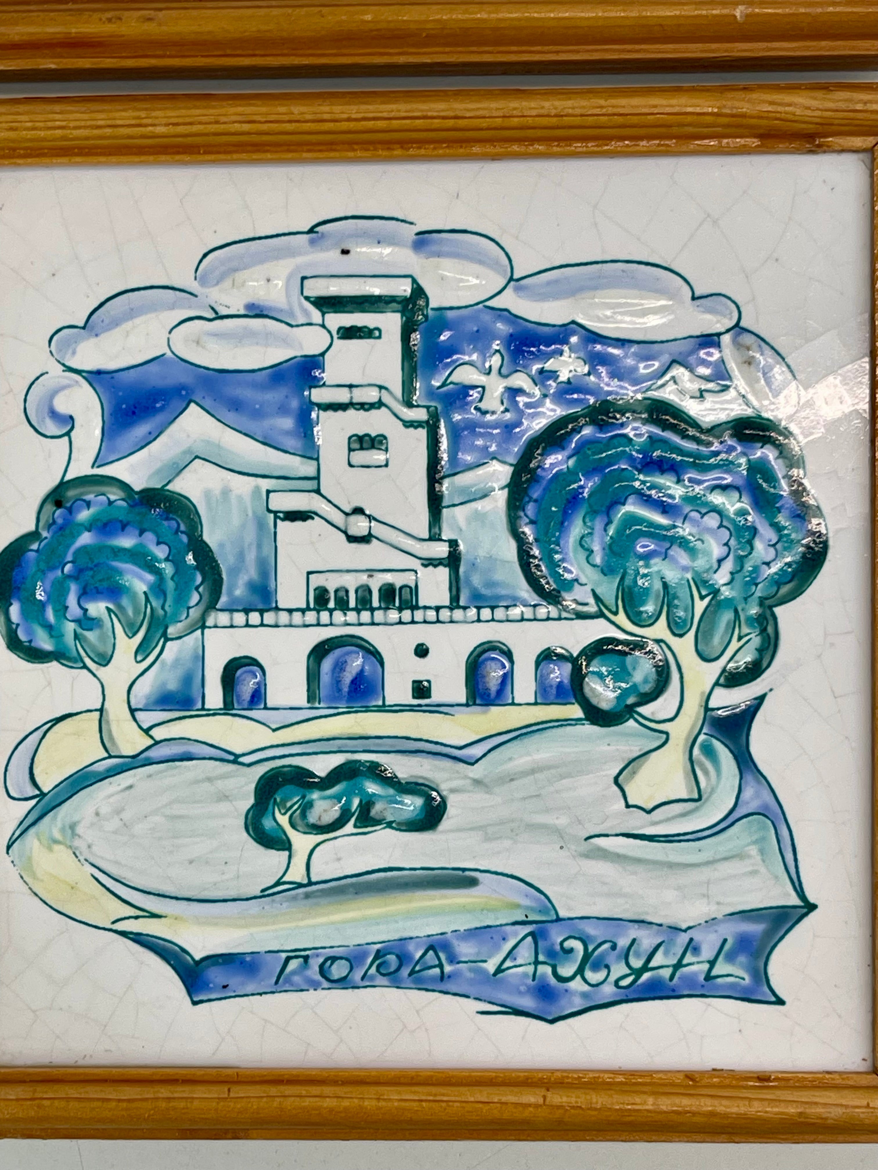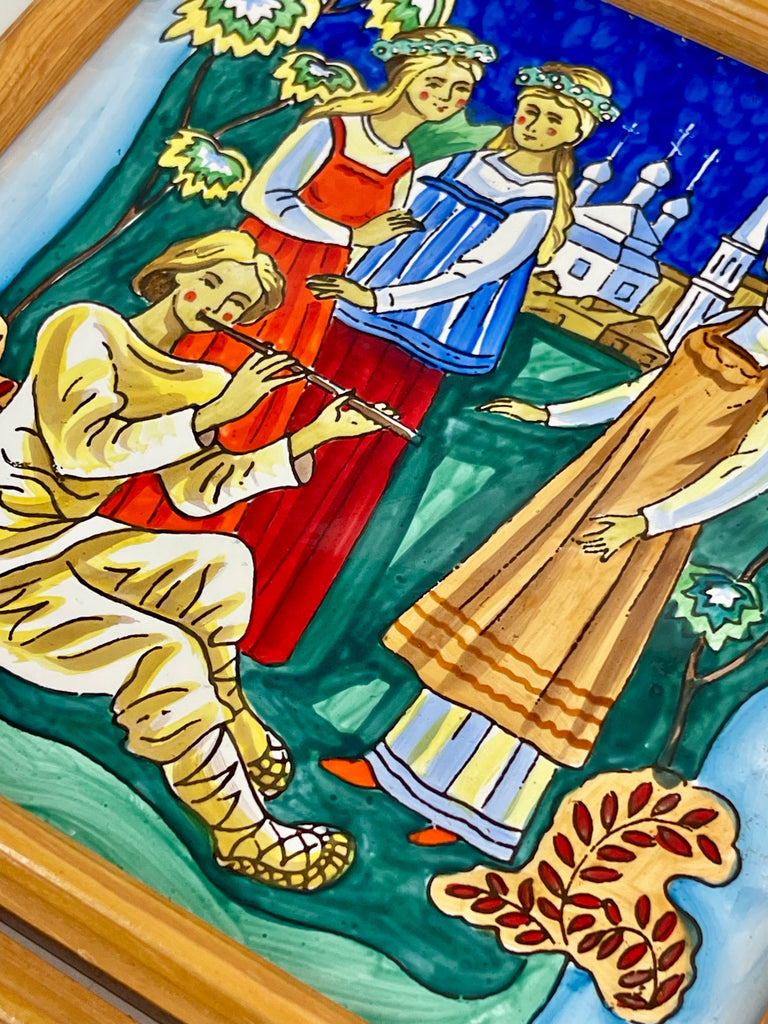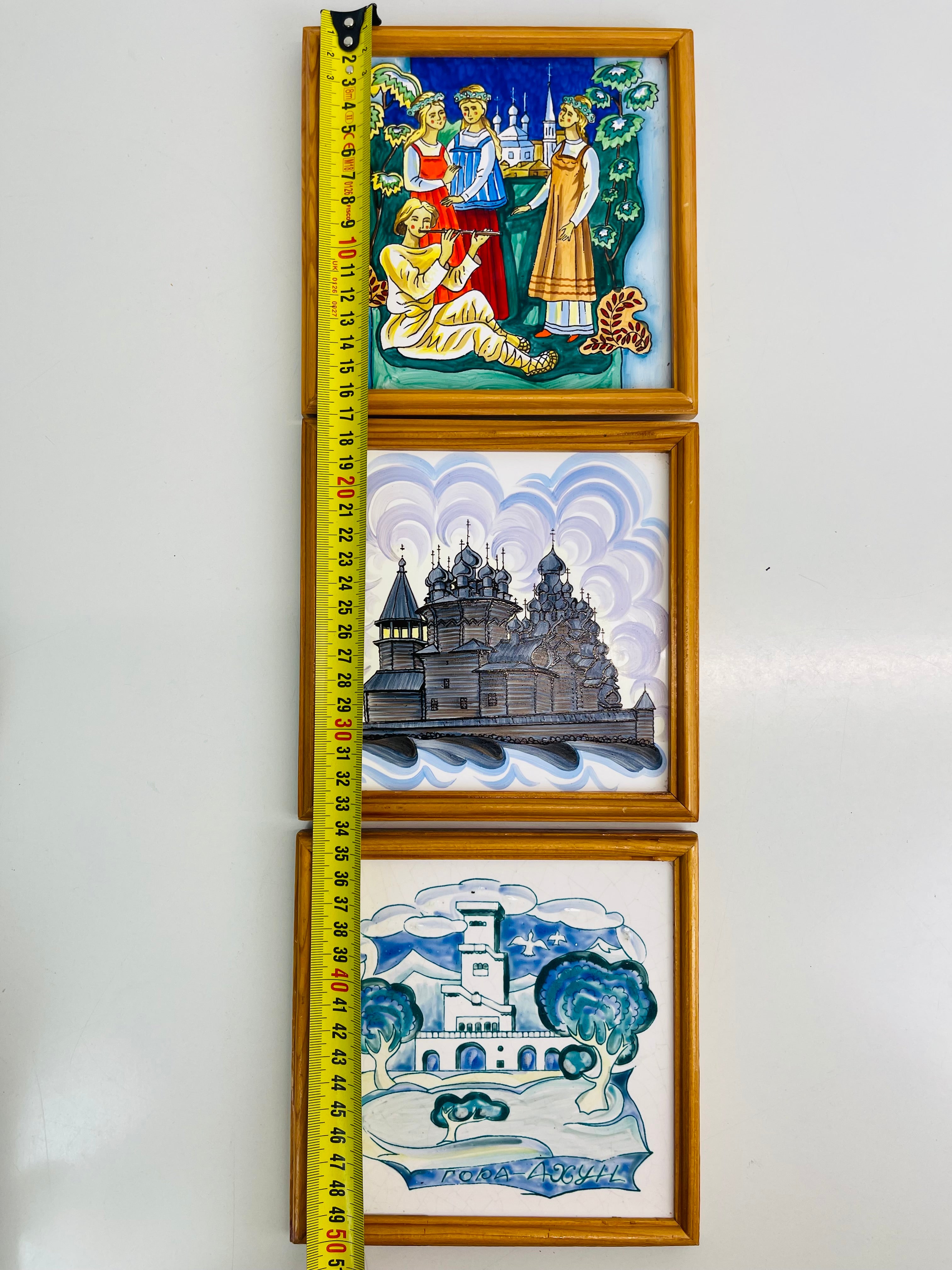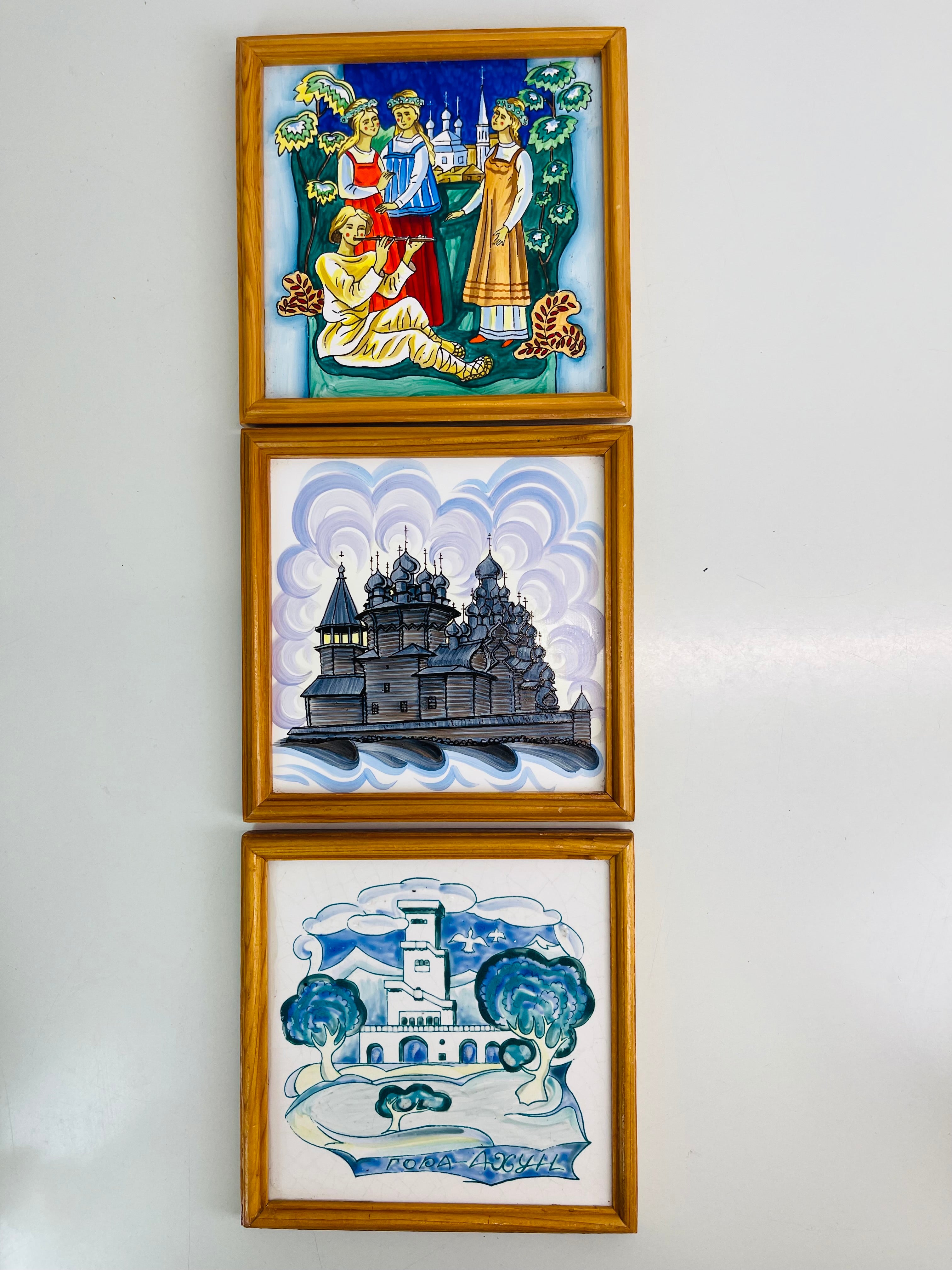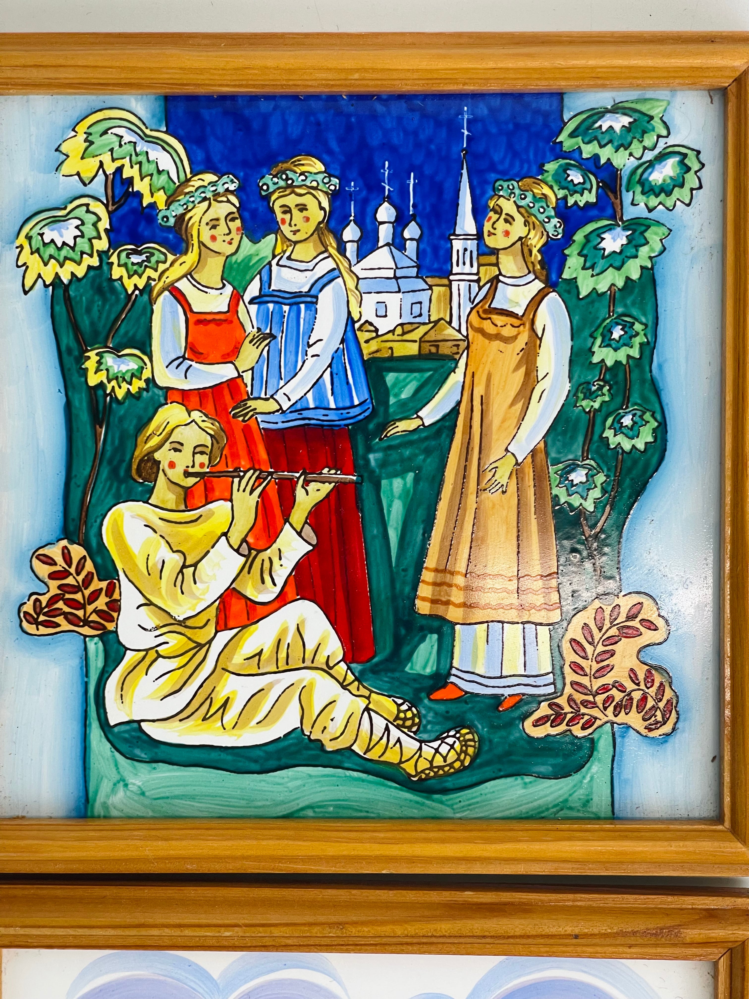 Vackert bemålade kakelplattor med inramning av trä. Sovjetiskt ursprung, fint skick, en kakelplatta är krakelerad (se bilder!).