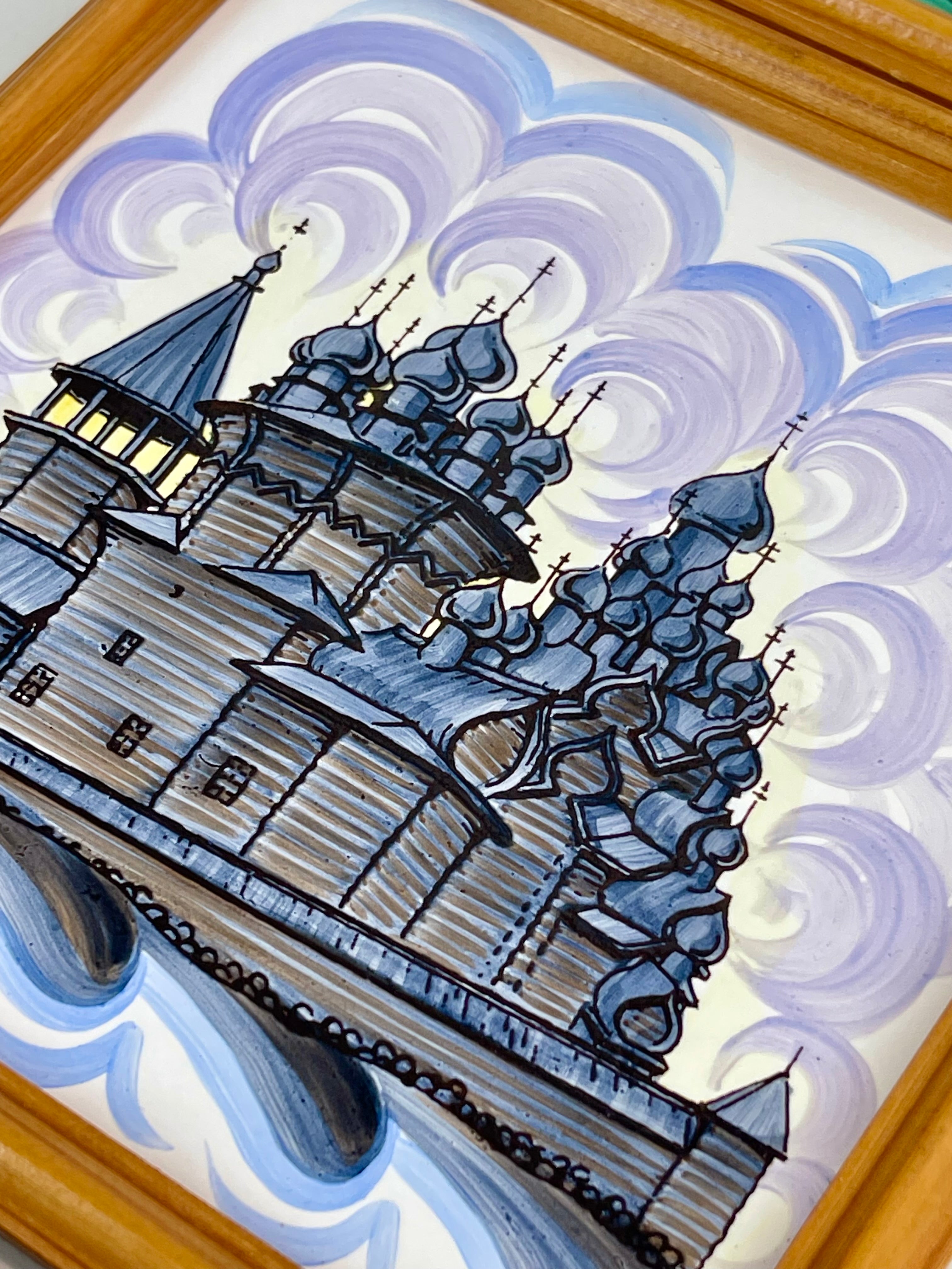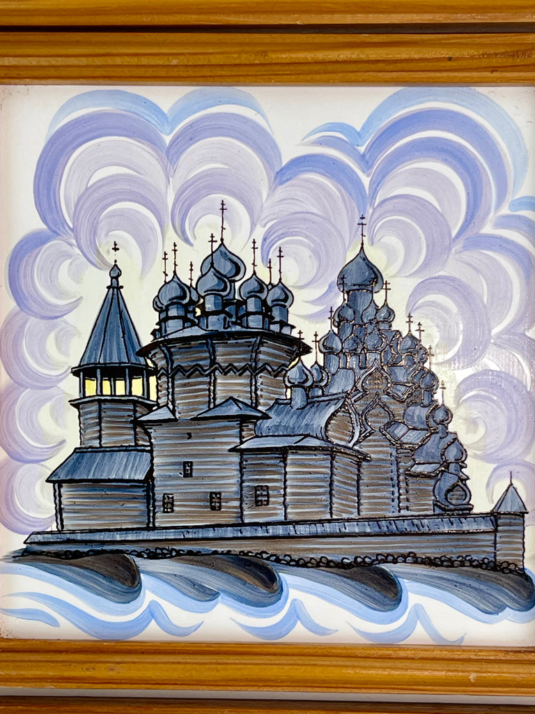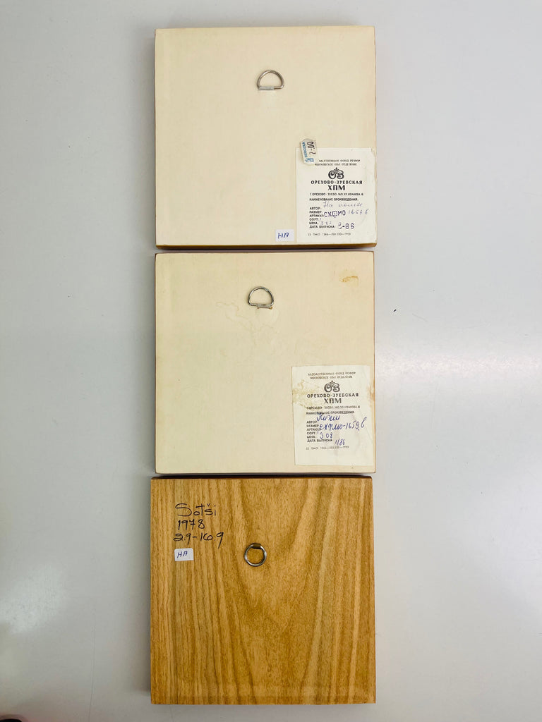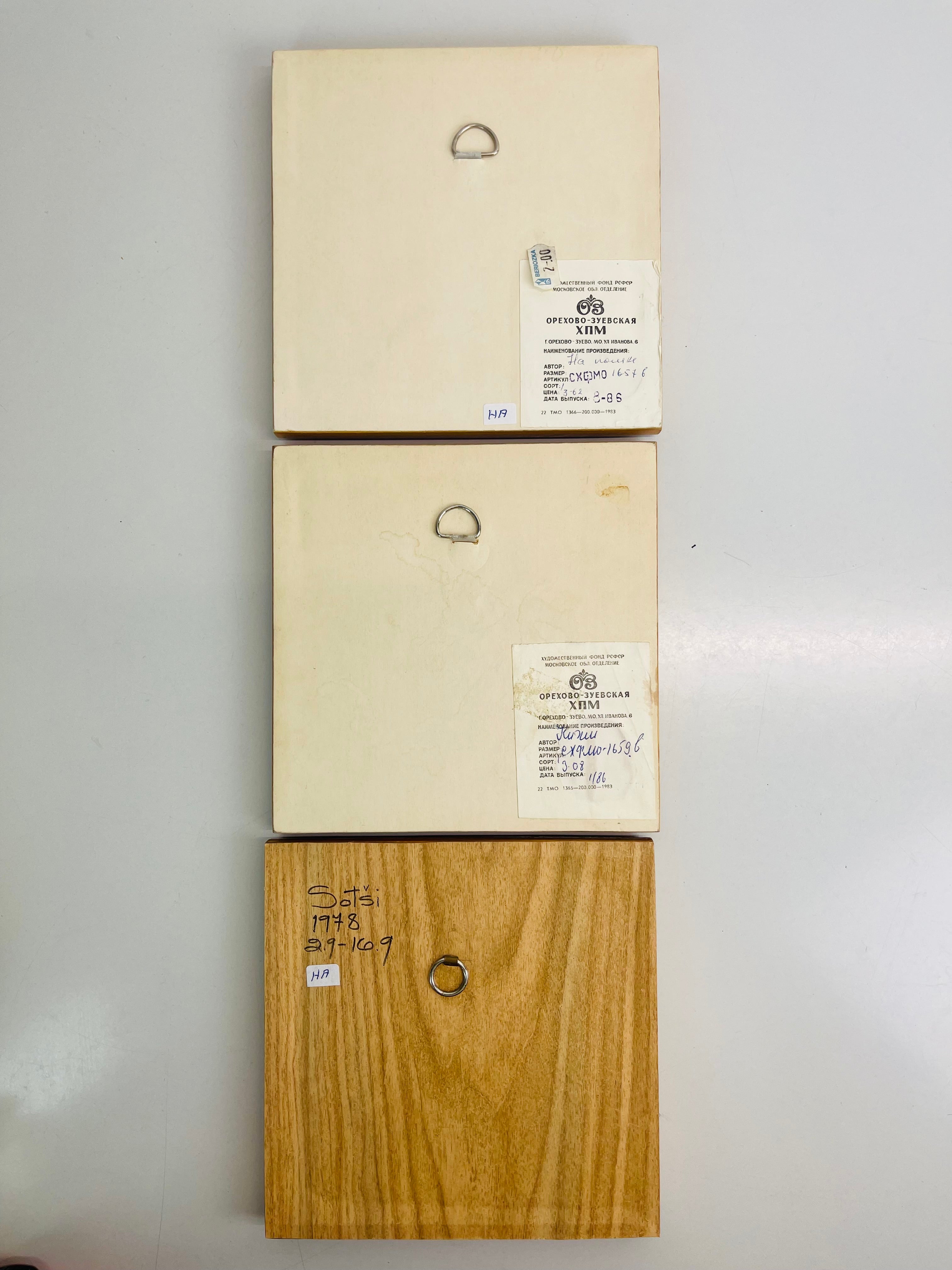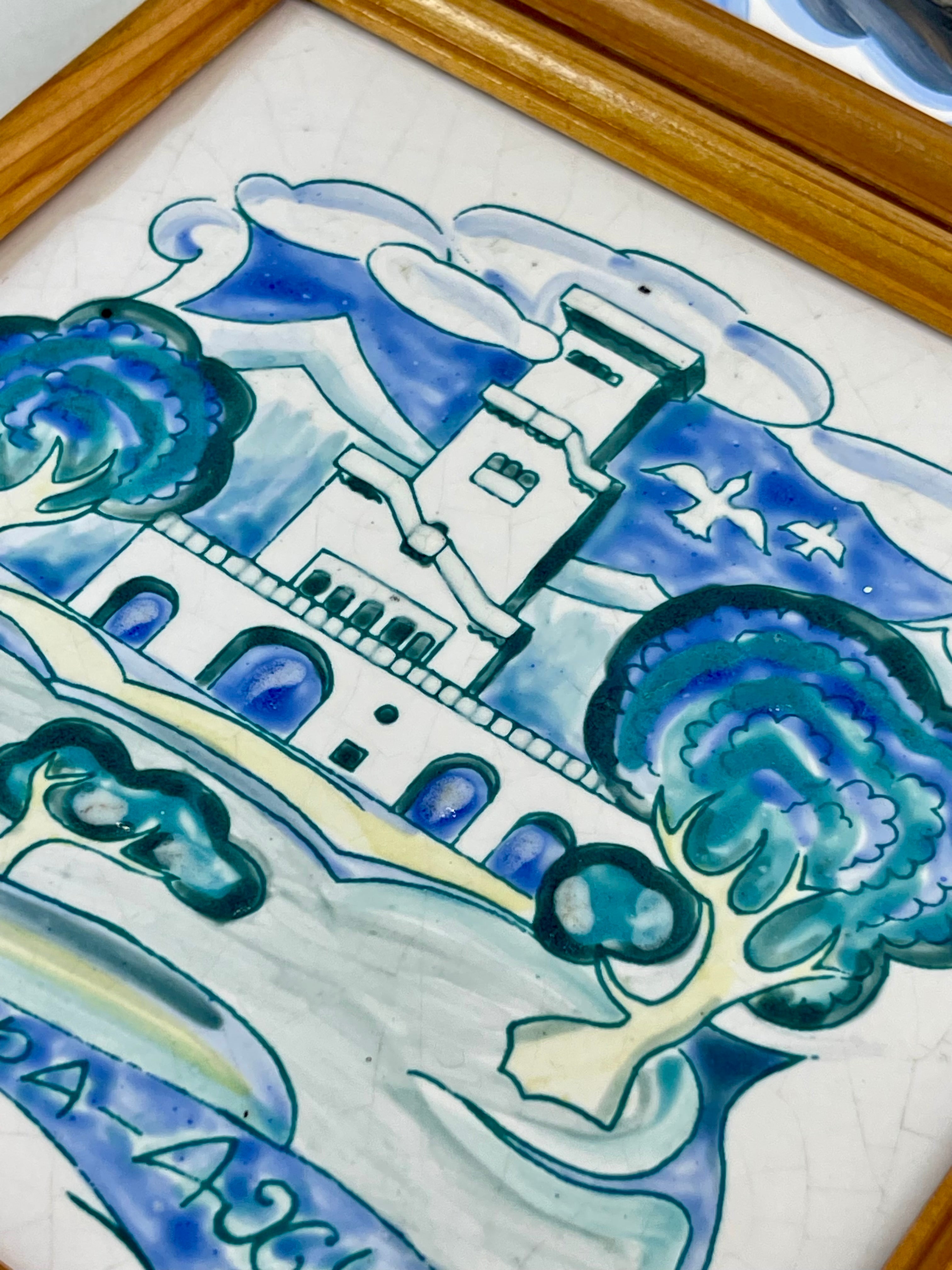 Vackert bemålade kakelplattor med inramning av trä. Sovjetiskt ursprung, fint skick, en kakelplatta är krakelerad (se bilder!).