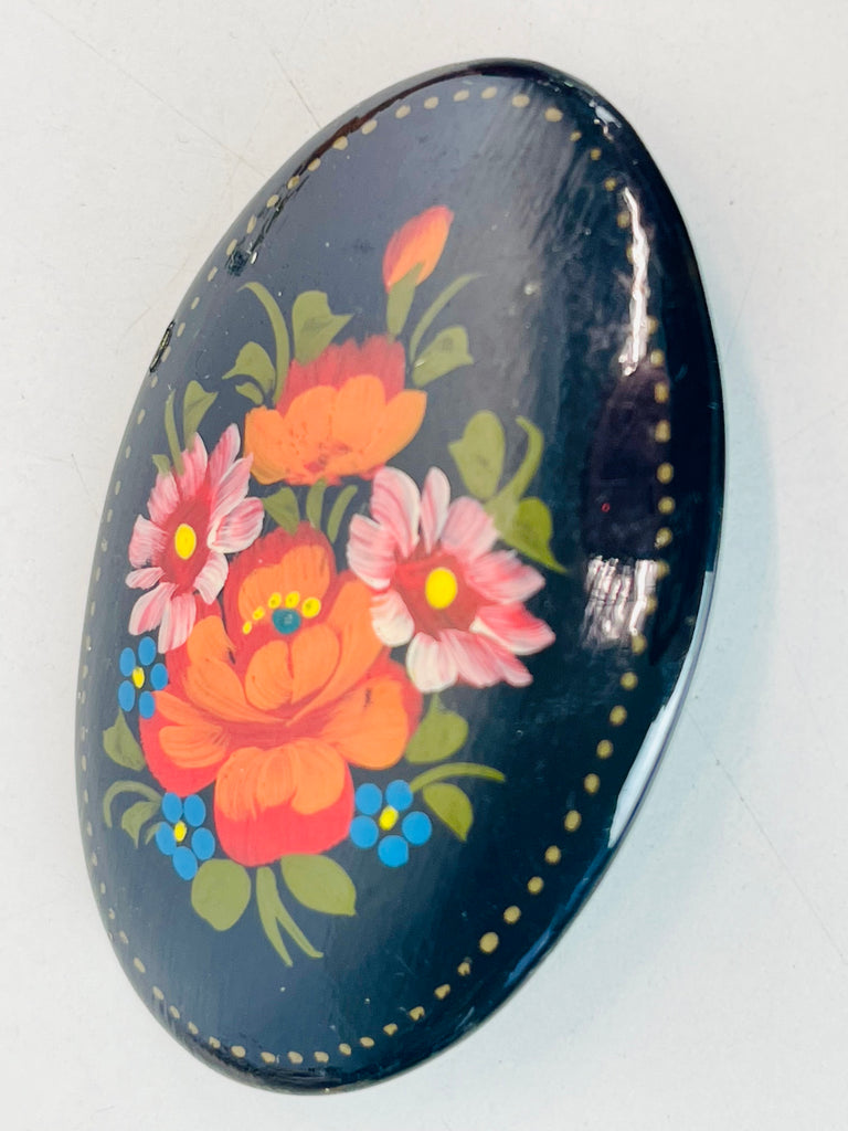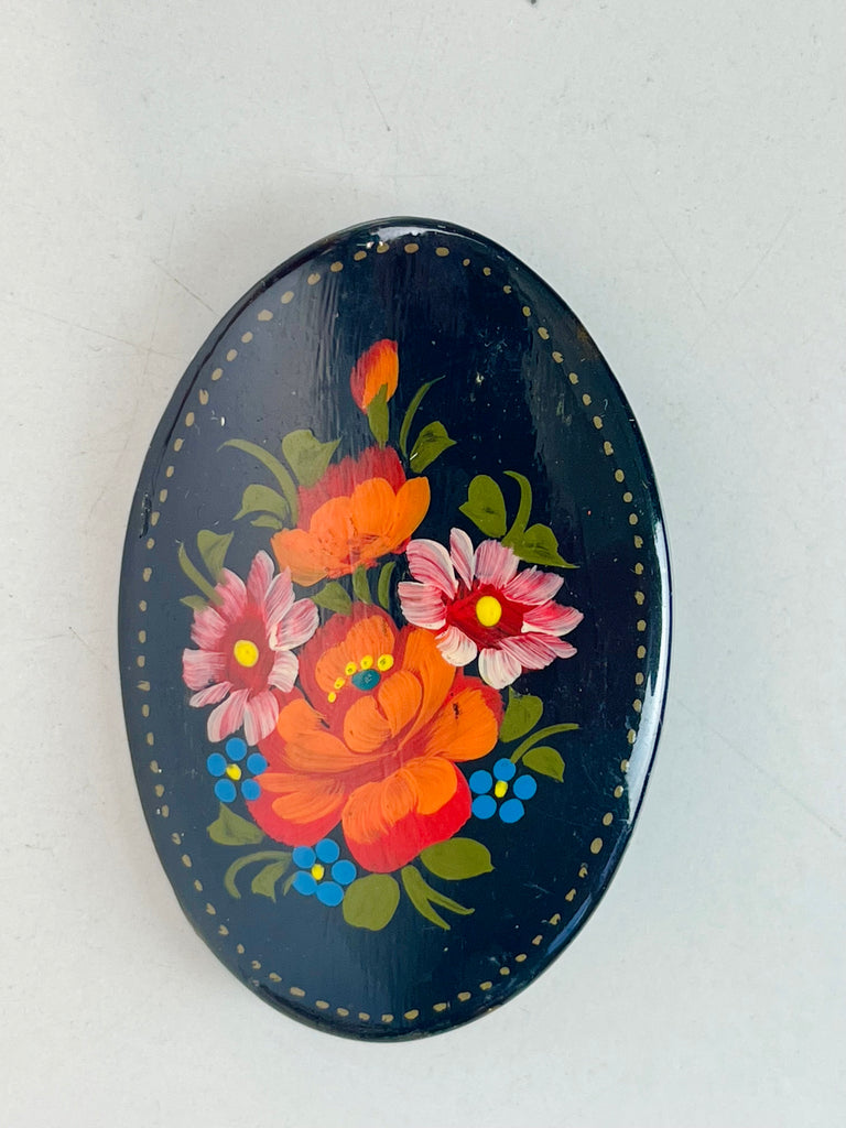 En vacker, handmålad, sovjetisk brosch i trä. Fint skick, enligt bilder!