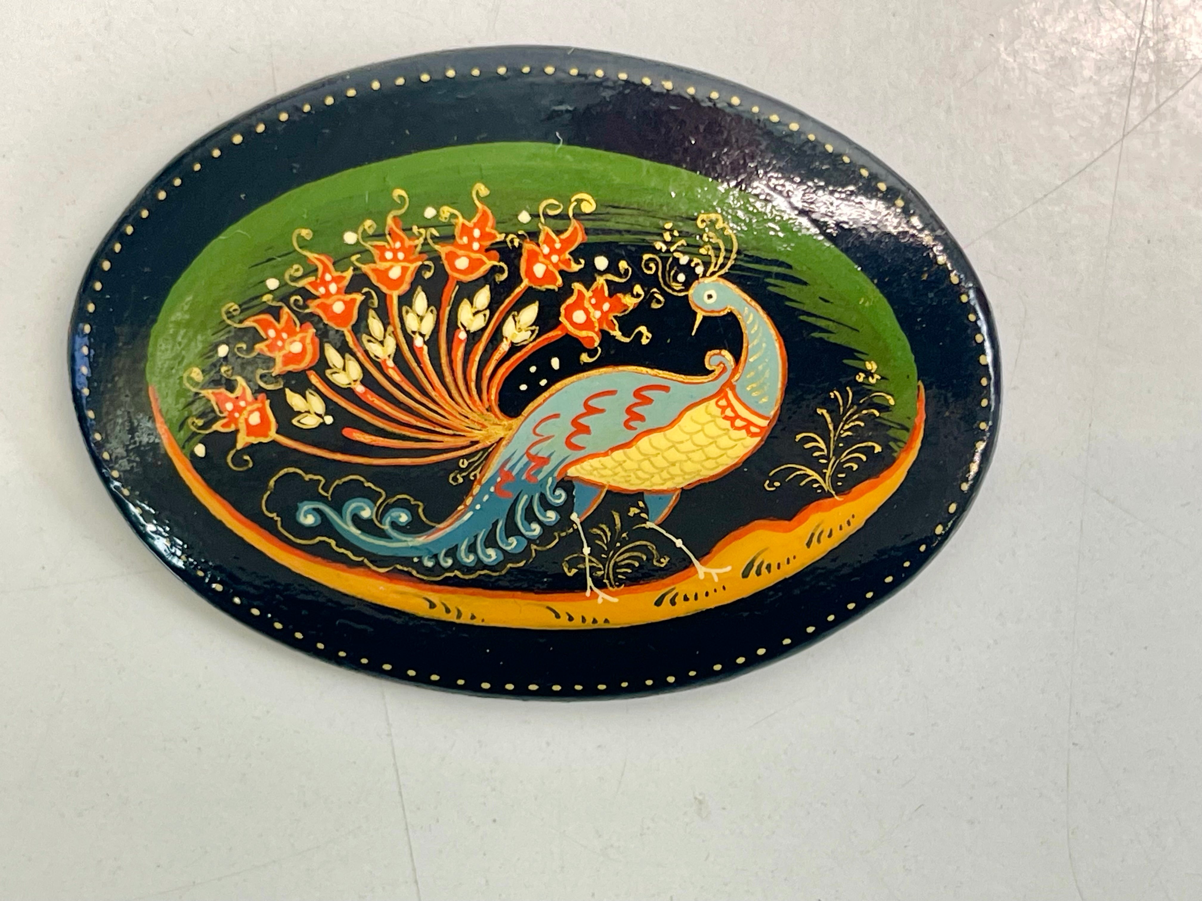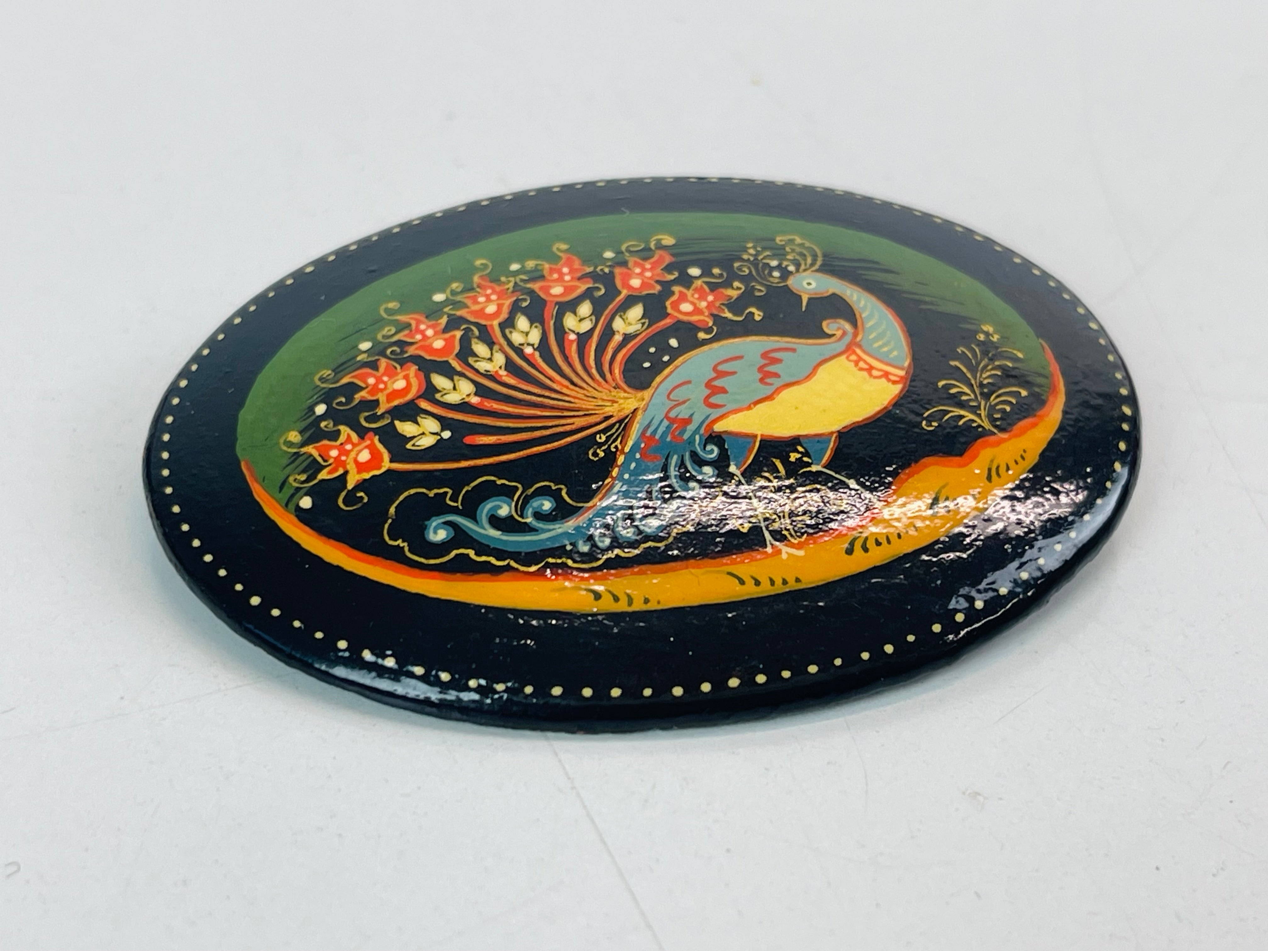En vacker, handmålad, sovjetisk brosch i trä. Fint skick, enligt bilder!