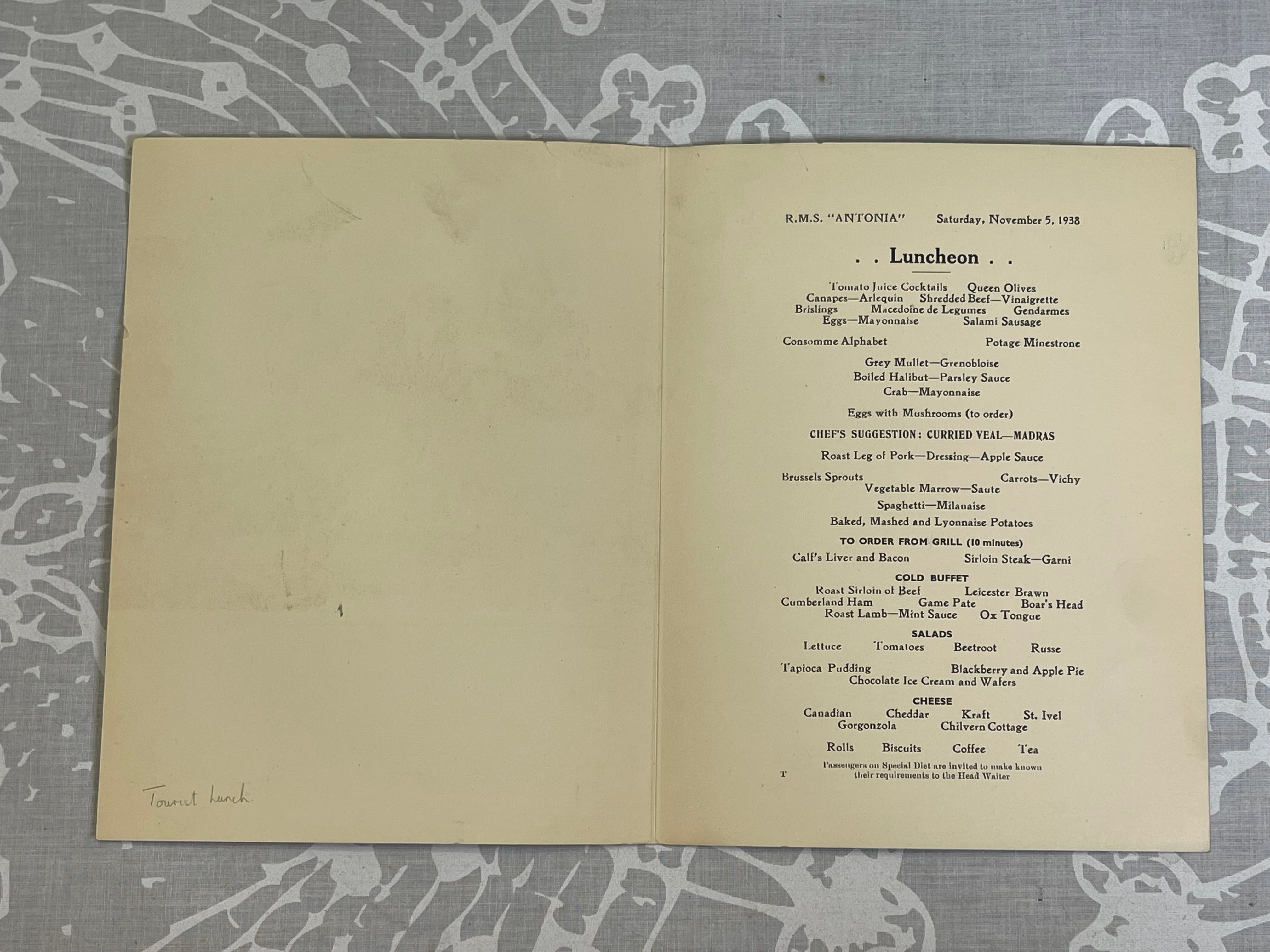 RMS Antonia, Cunard White Starin ruokalista vuodelta 1938
