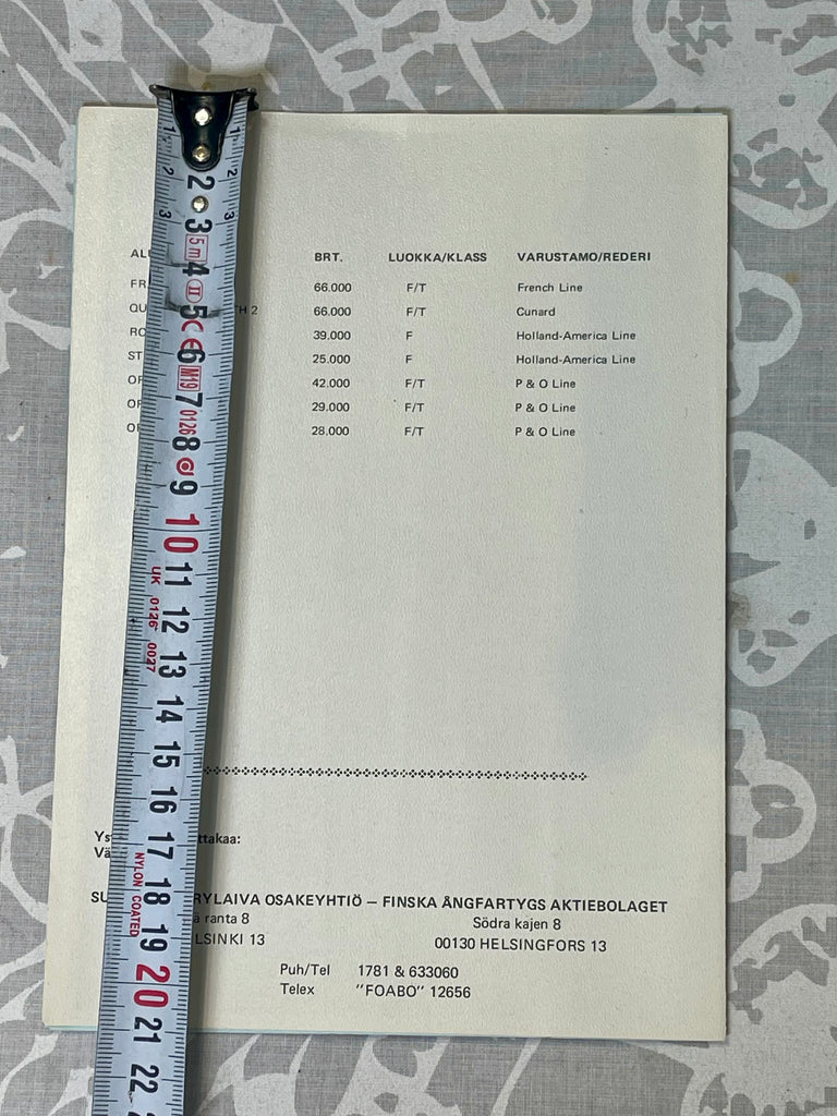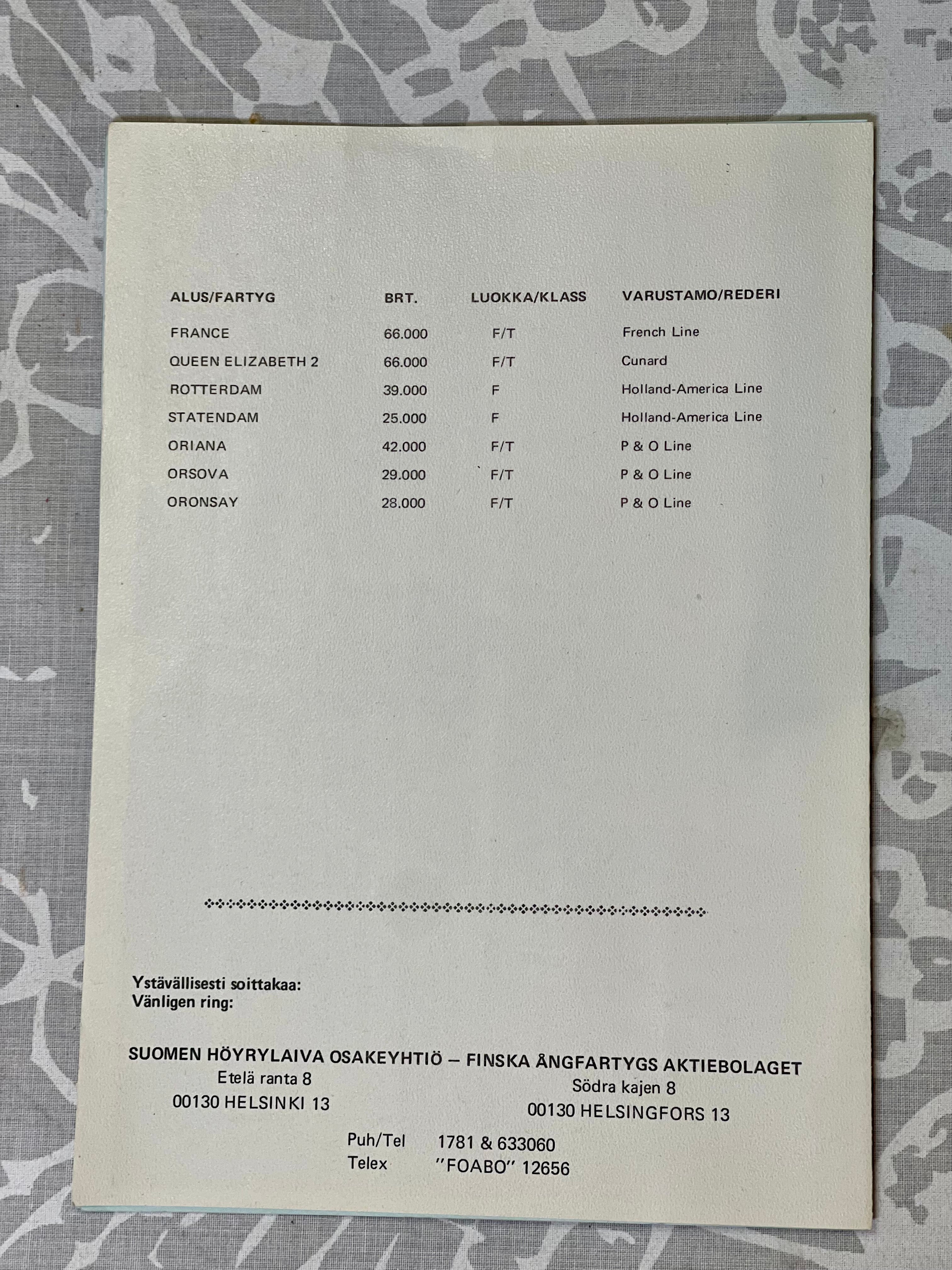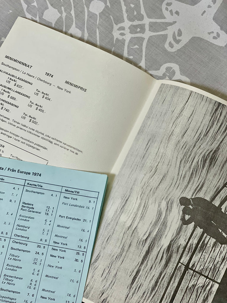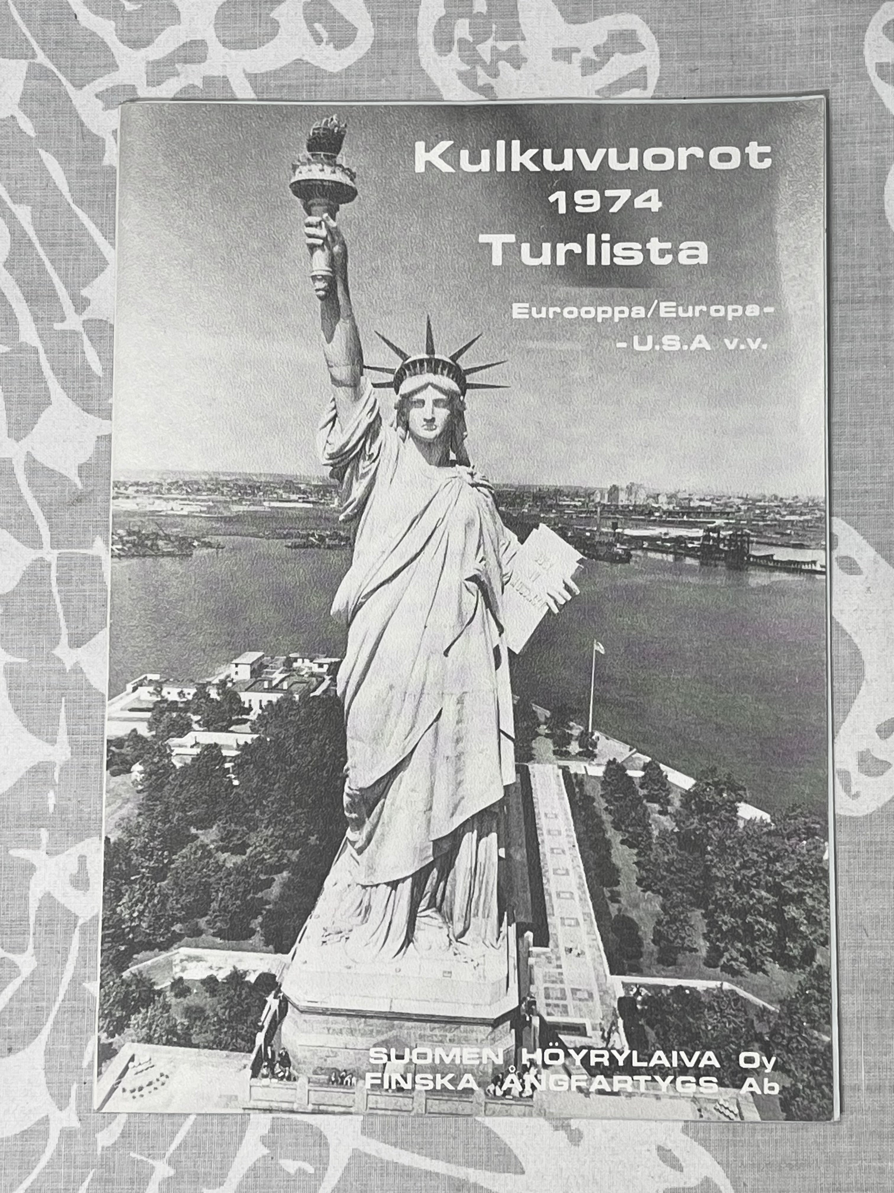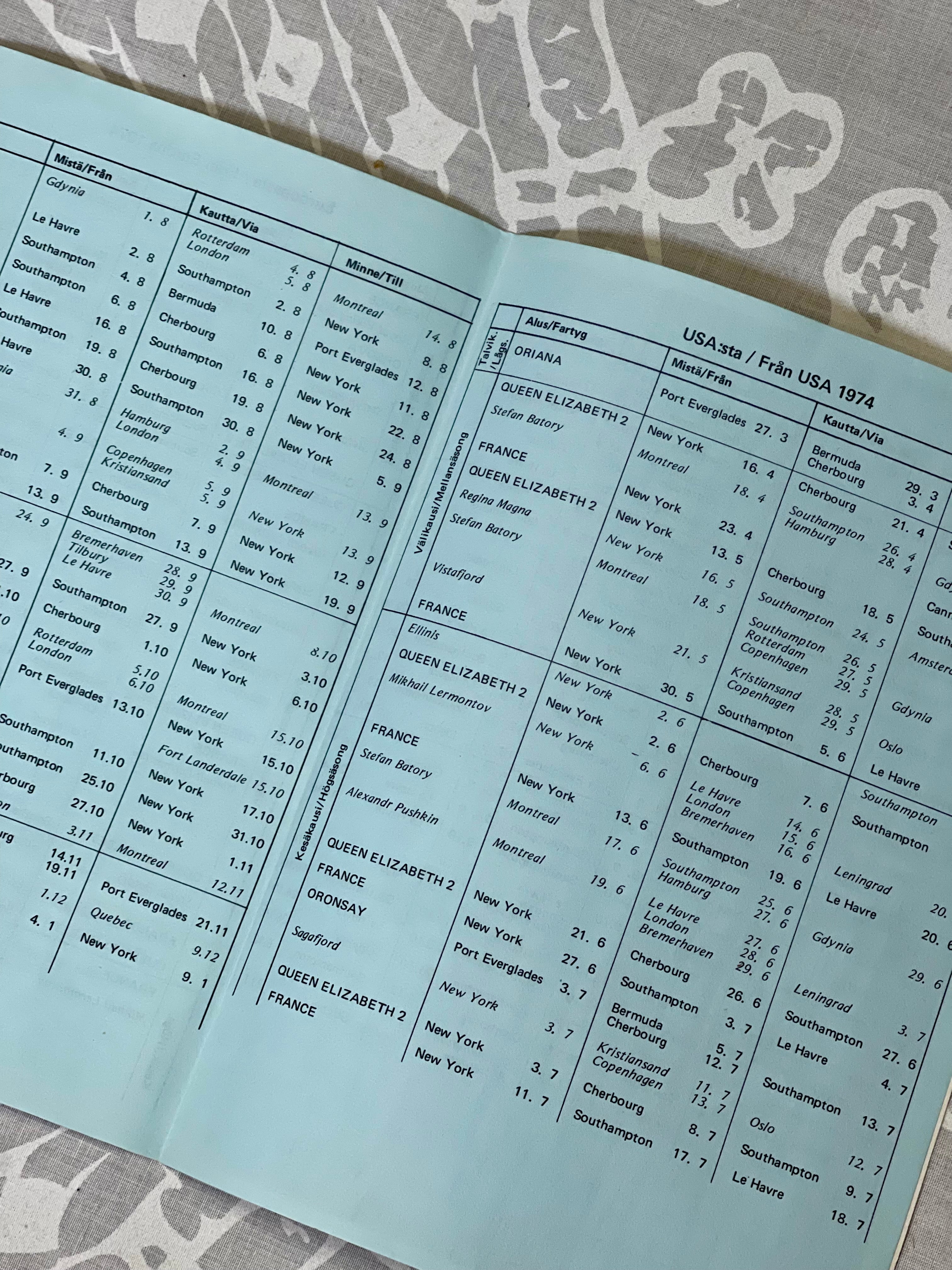 En tidtabell från 1974 för sjöresor mellan Europa och USA, utgiven av Suomen Höyrylaiva Oy Finska Ångfartygs Ab.