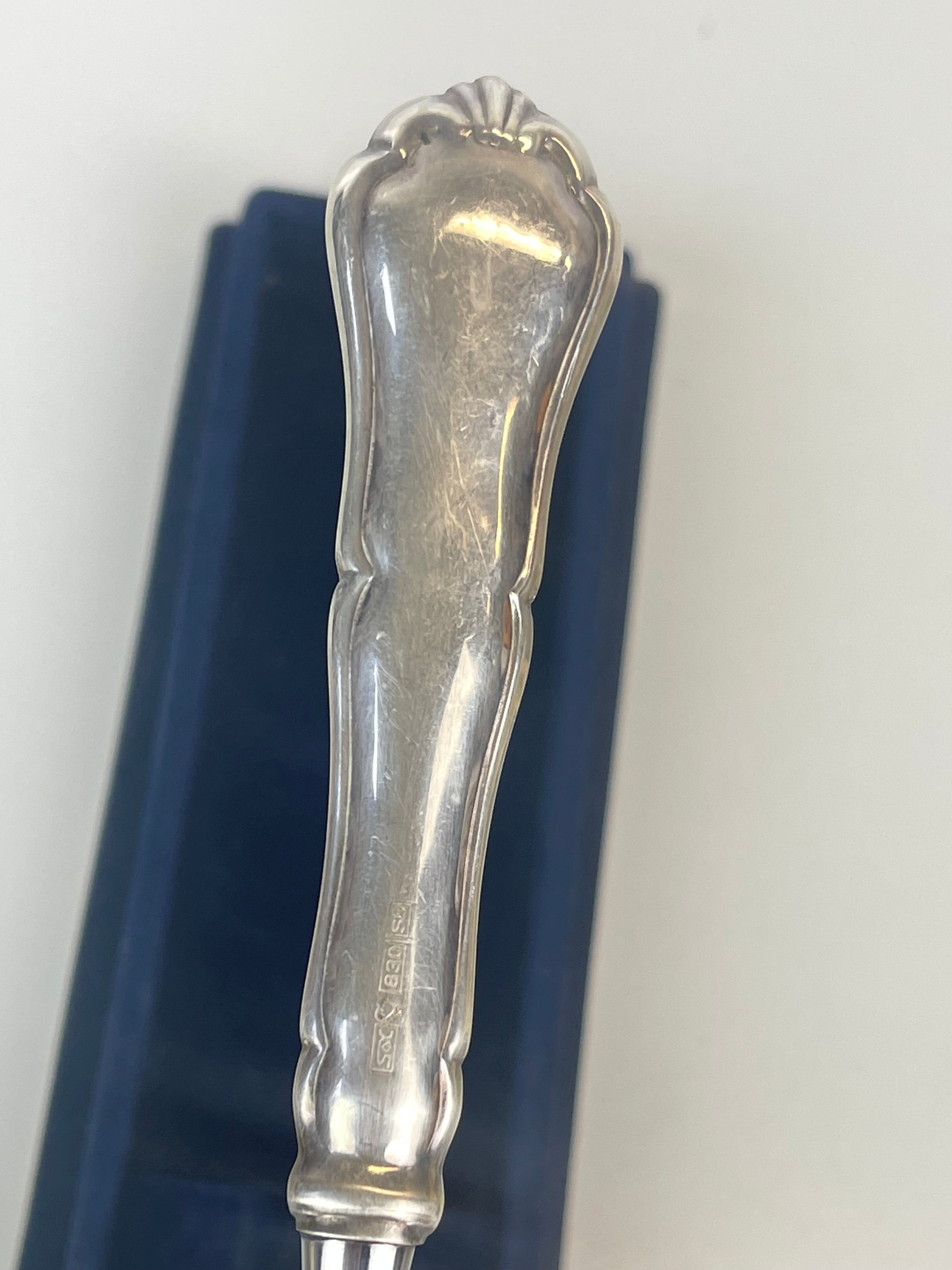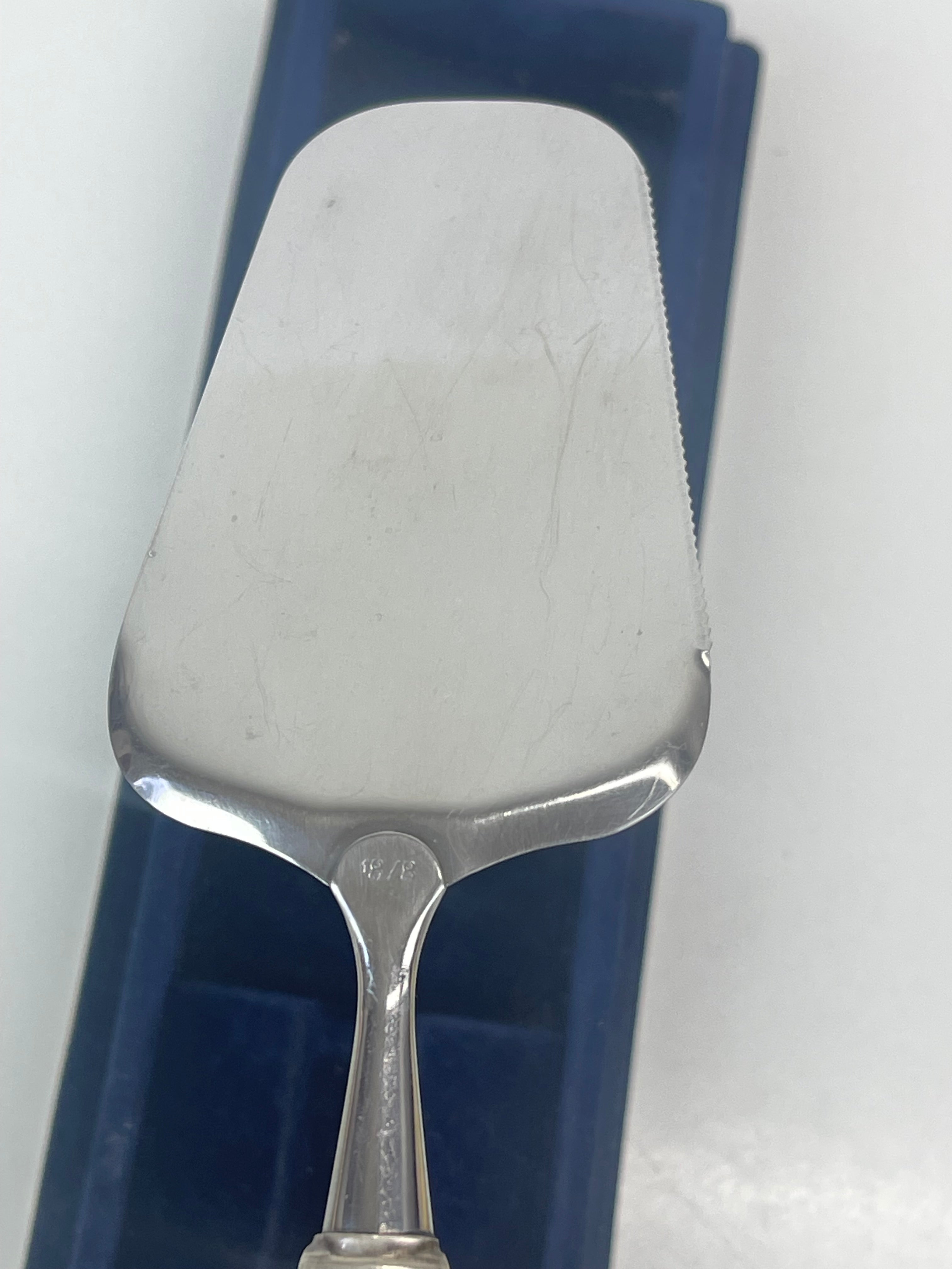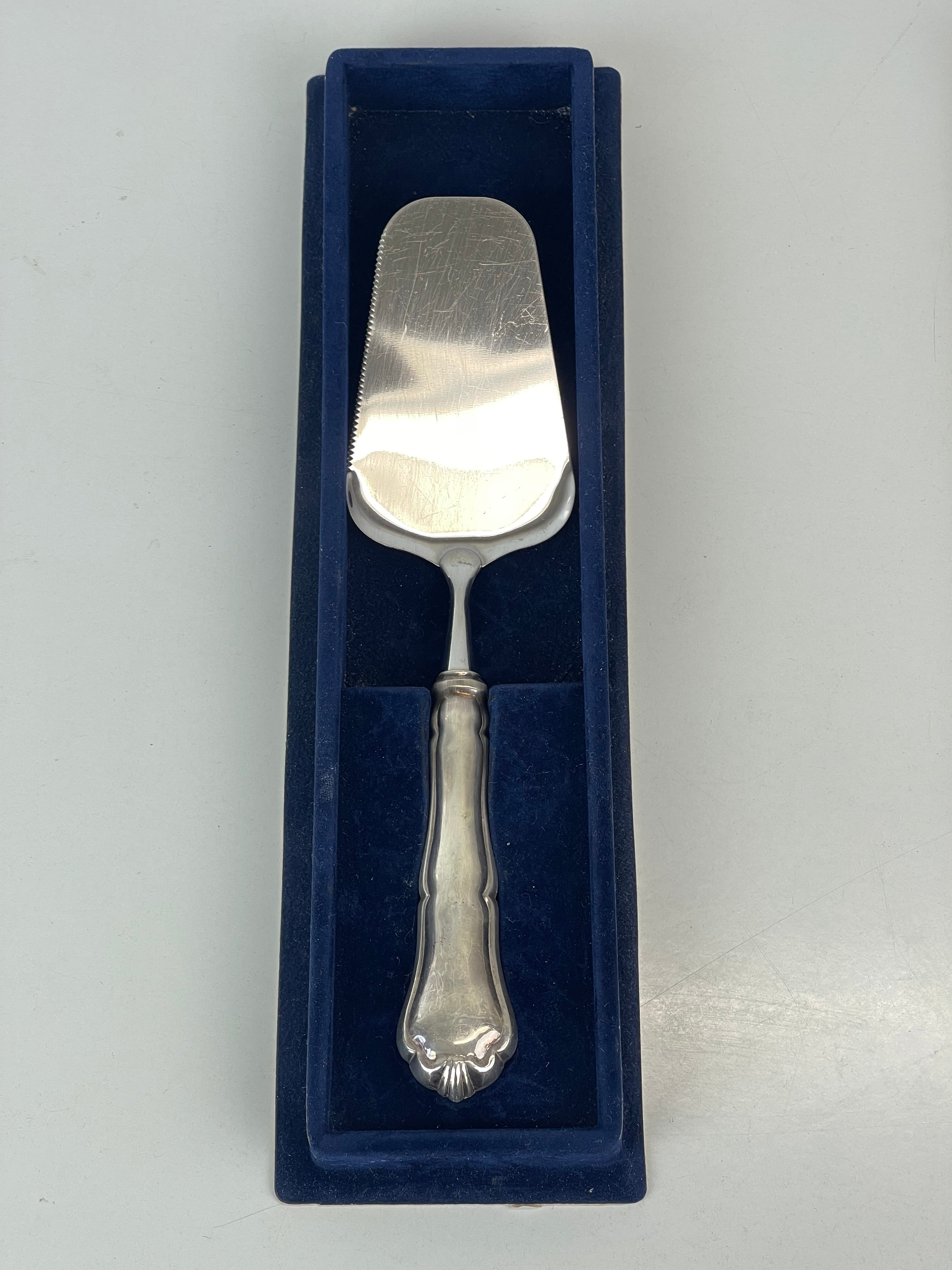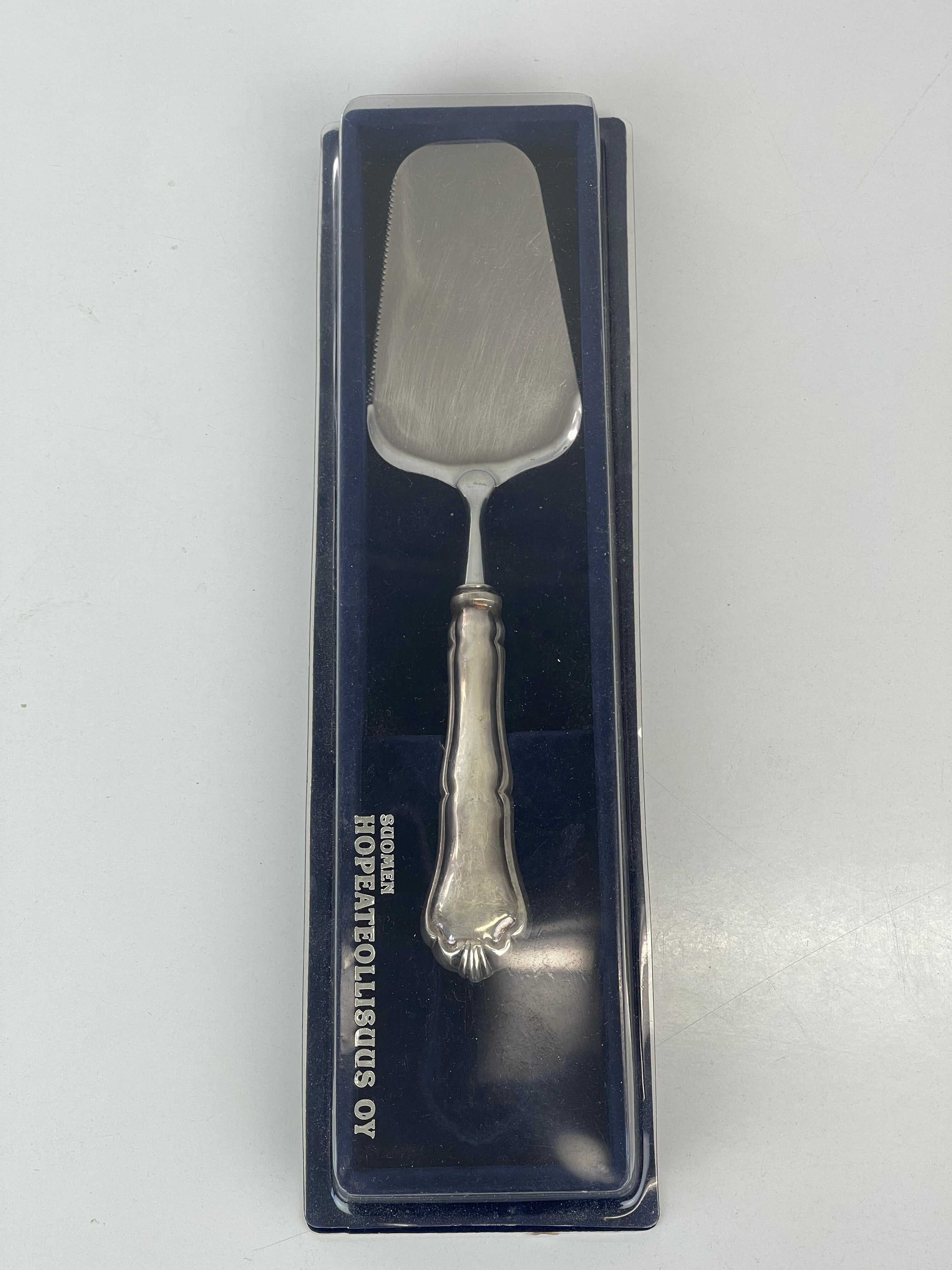 Hyvässä kunnossa, katso kuvat! Leimattua hopeaa, ei kaiverruksia. Kakkulastan alaosa on valmistettu ruostumattomasta teräksestä.