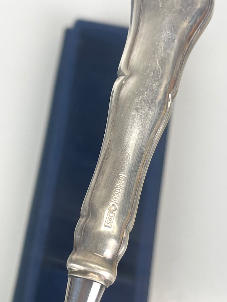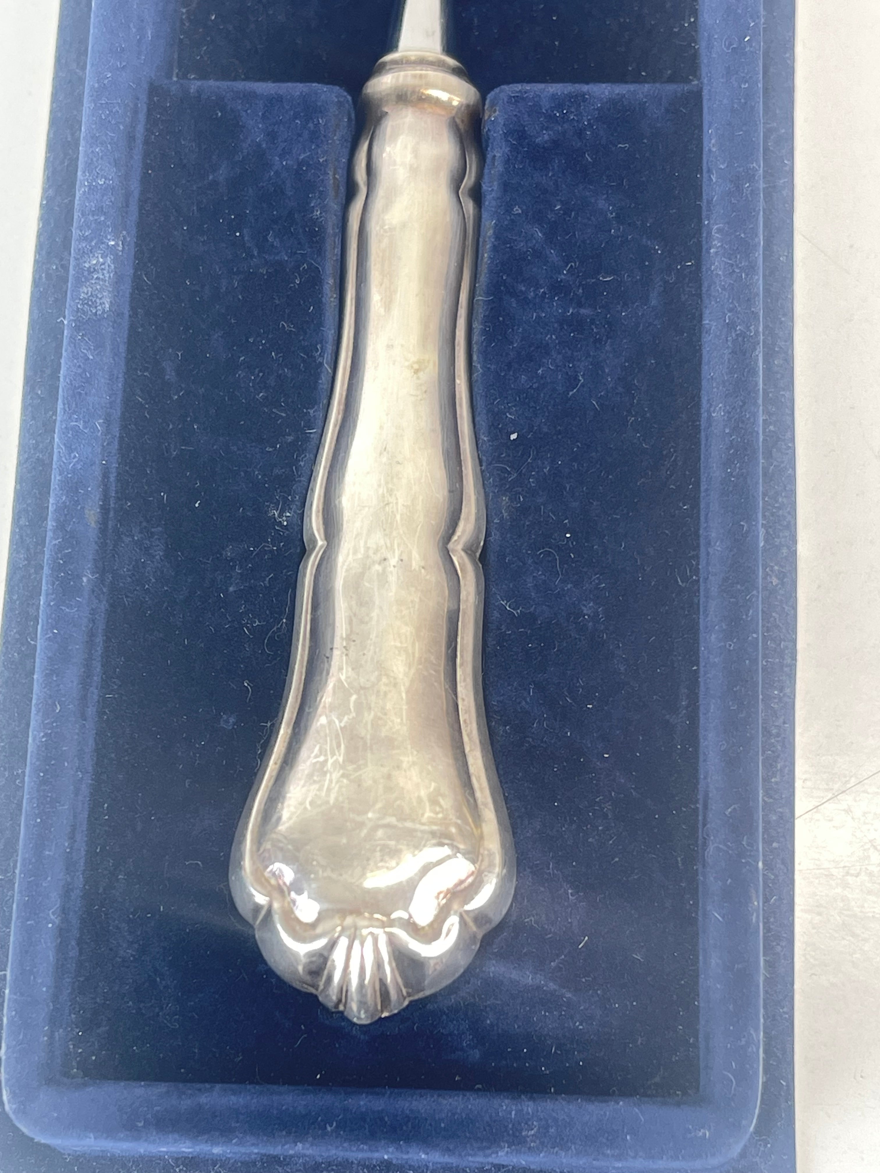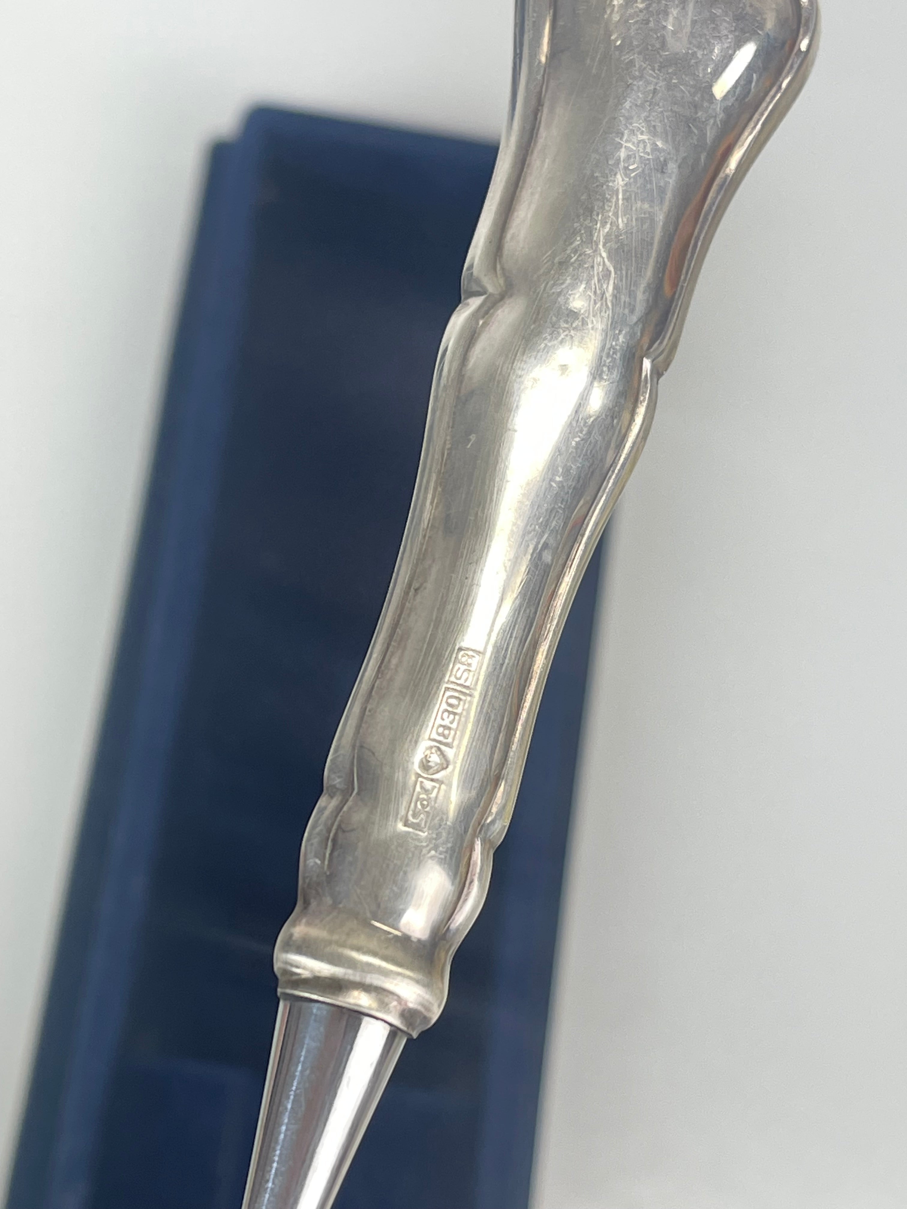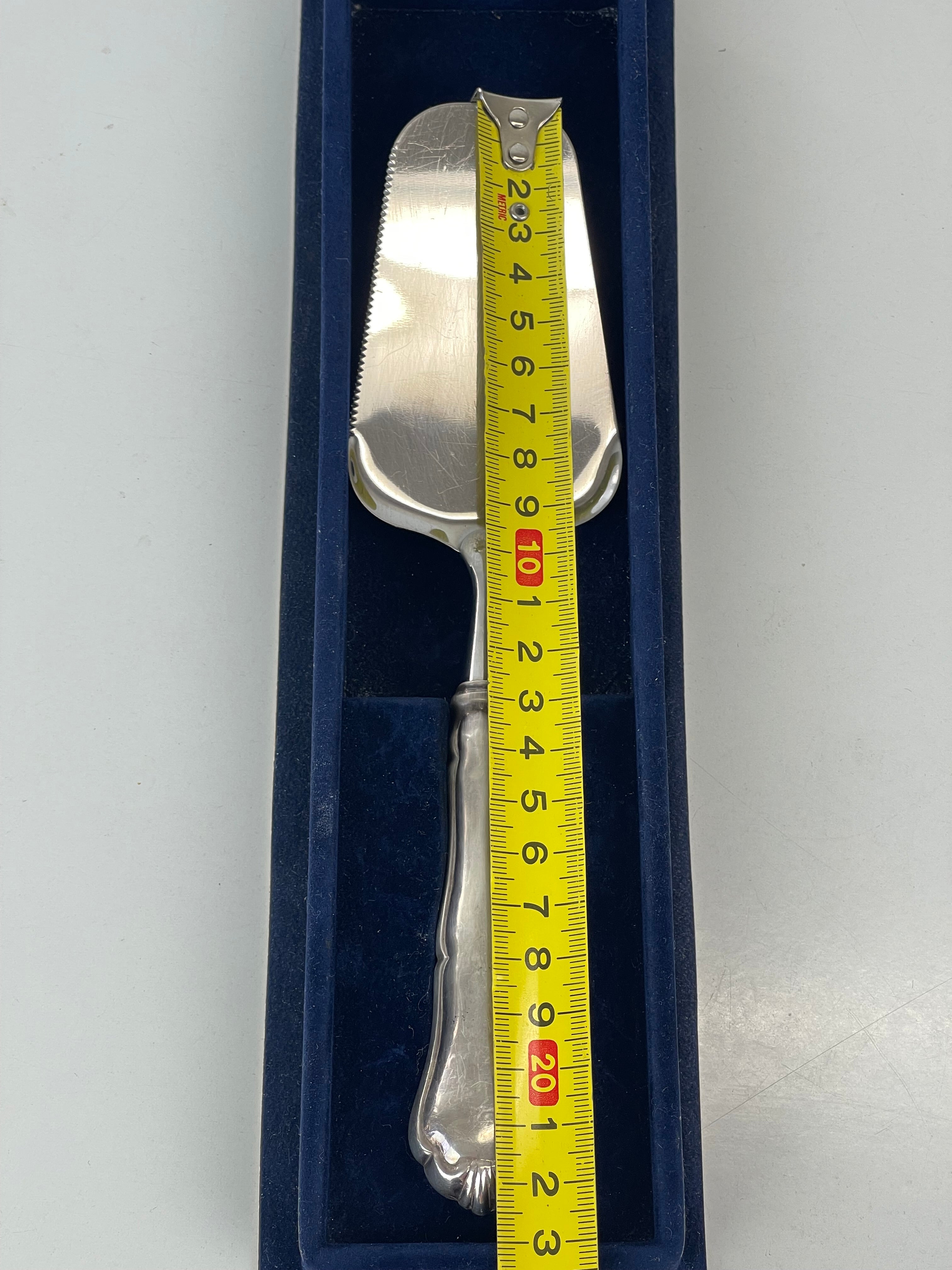 Hyvässä kunnossa, katso kuvat! Leimattua hopeaa, ei kaiverruksia. Kakkulastan alaosa on valmistettu ruostumattomasta teräksestä.