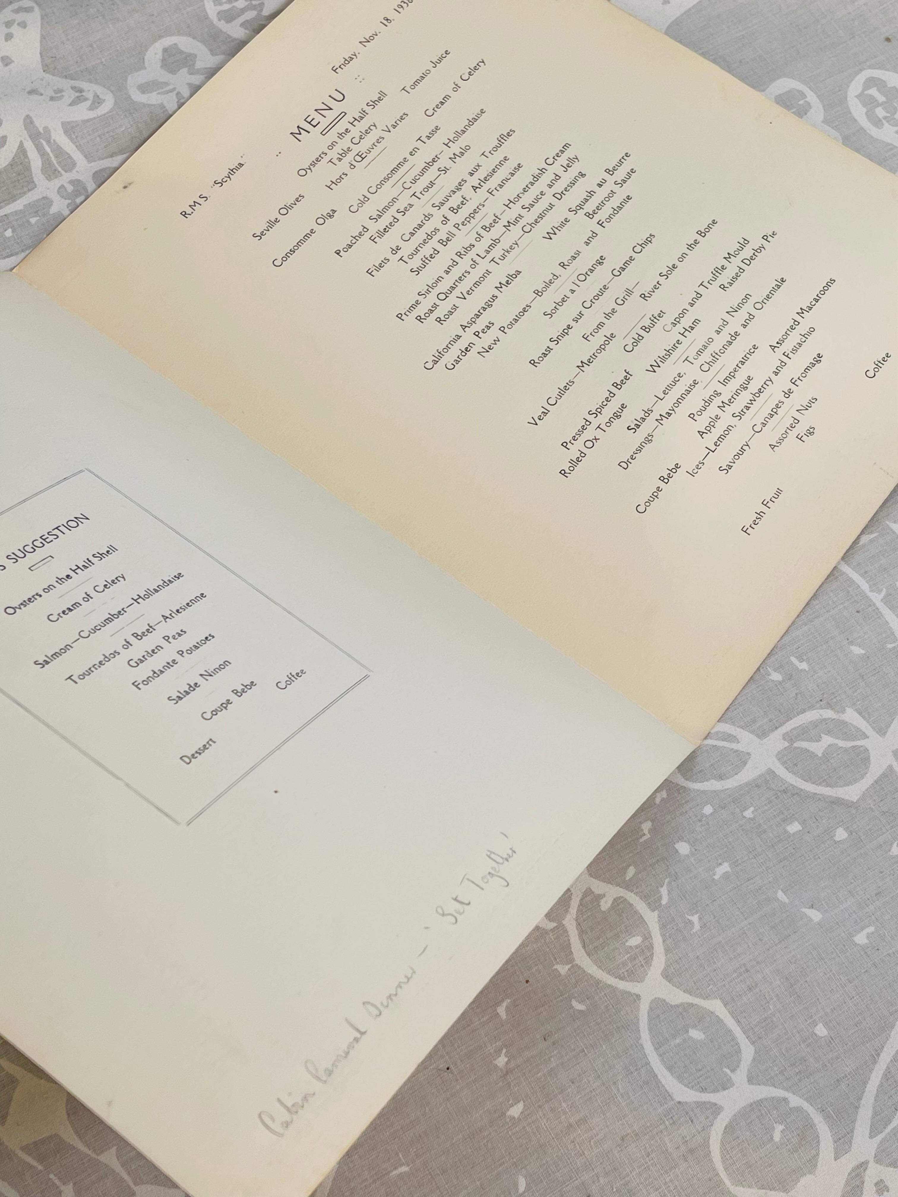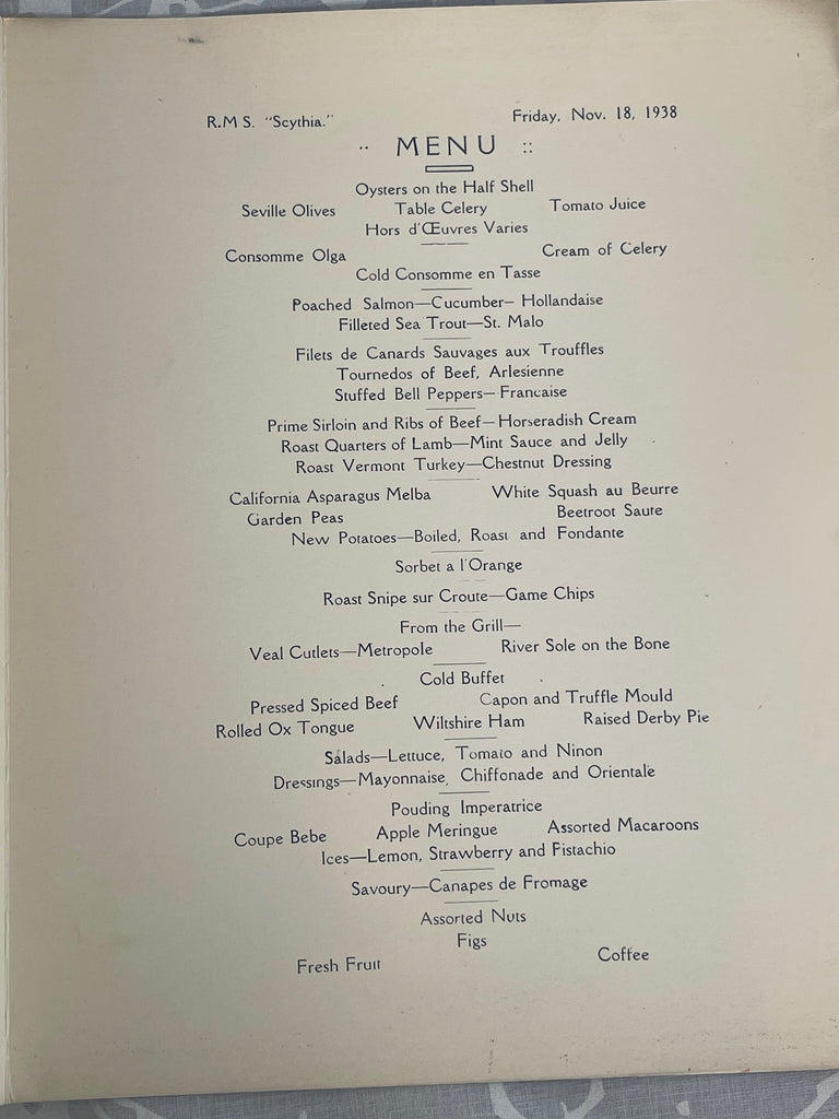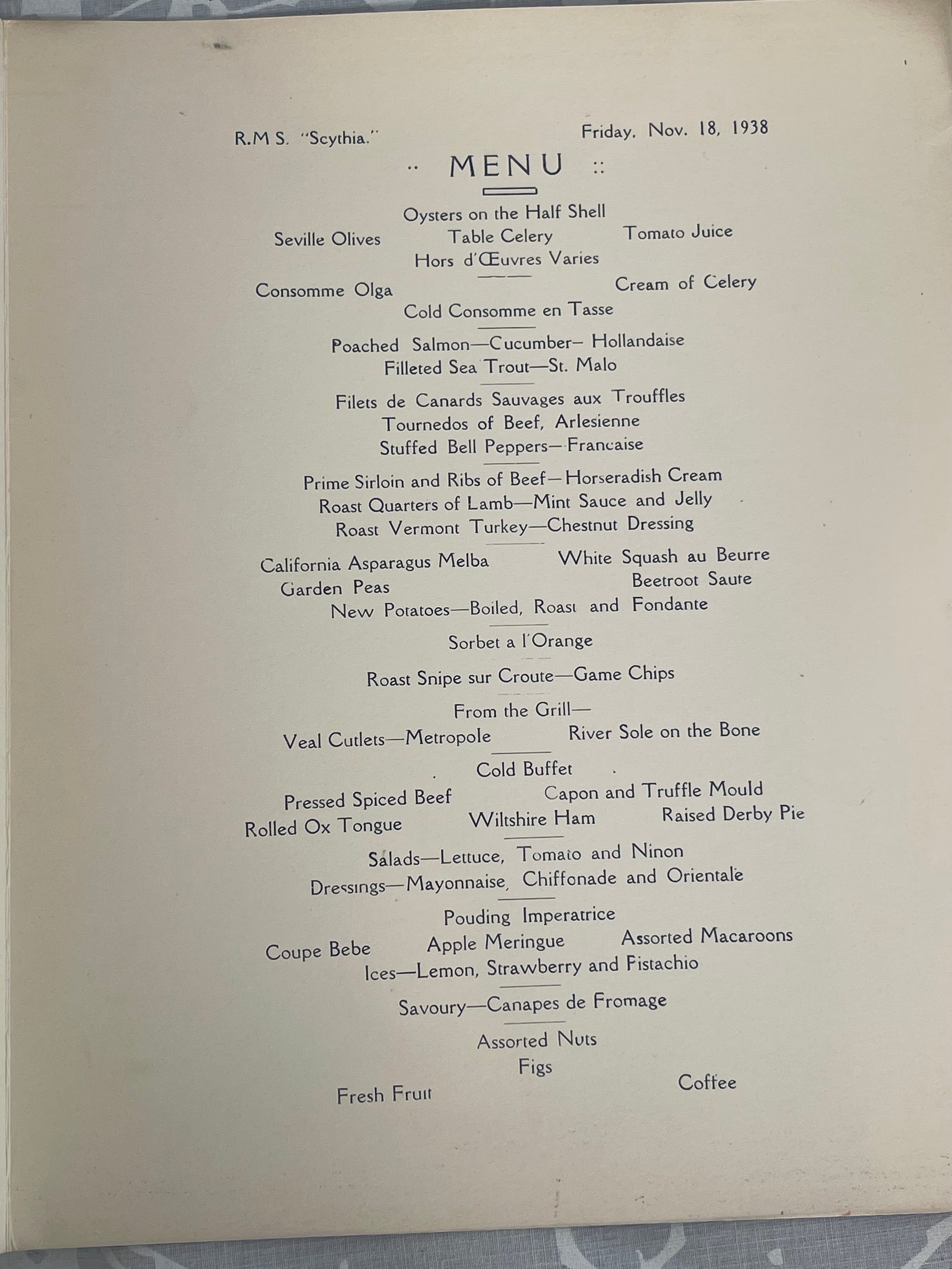 Meny November 18, 1938, Scythia, Cunard White Star Line