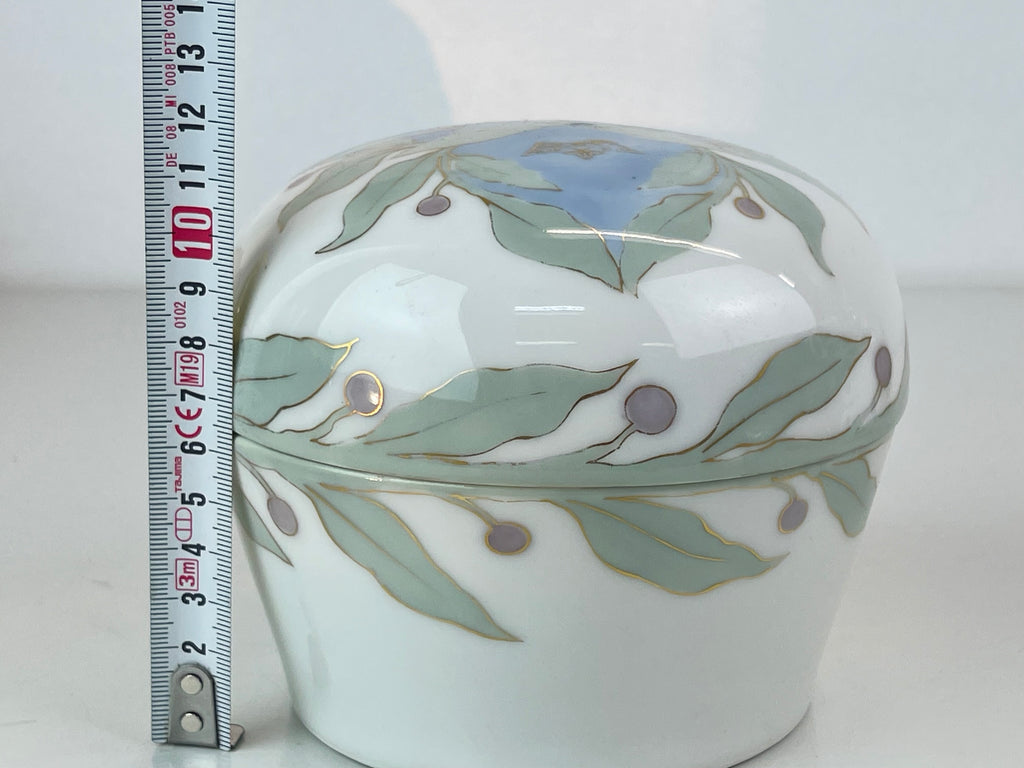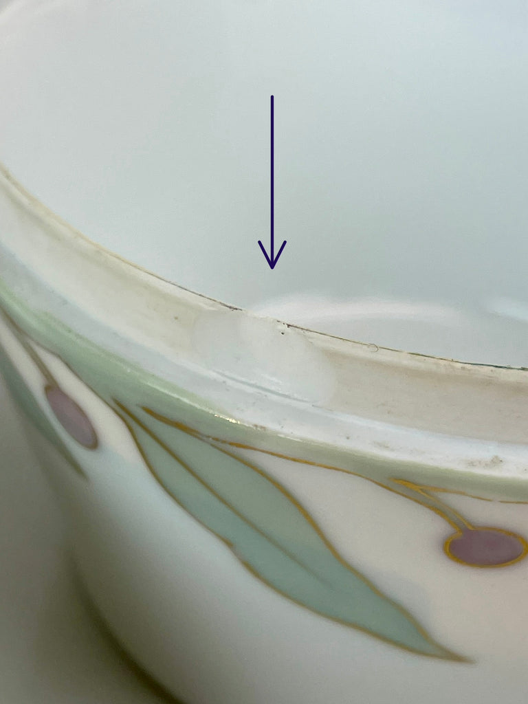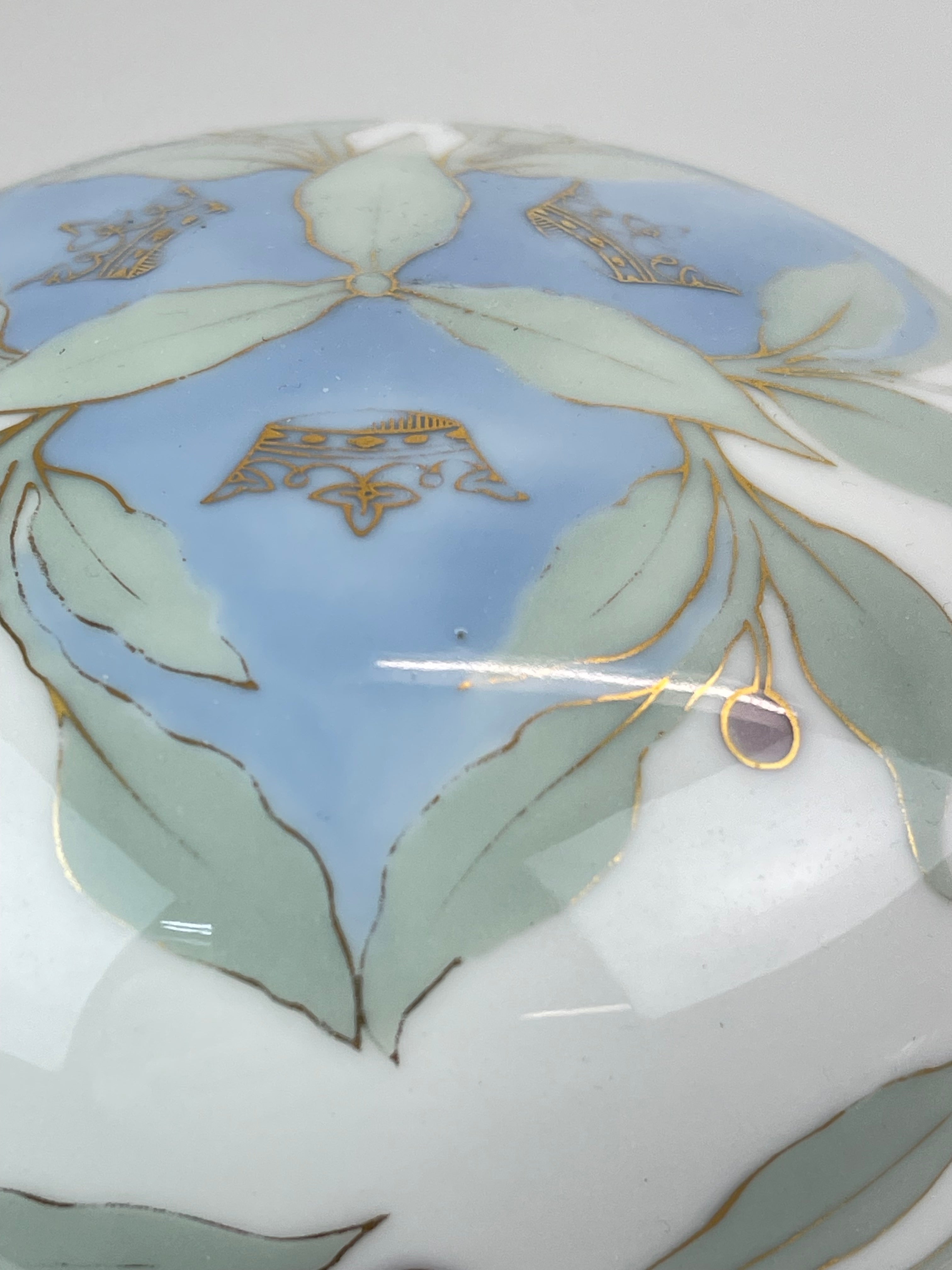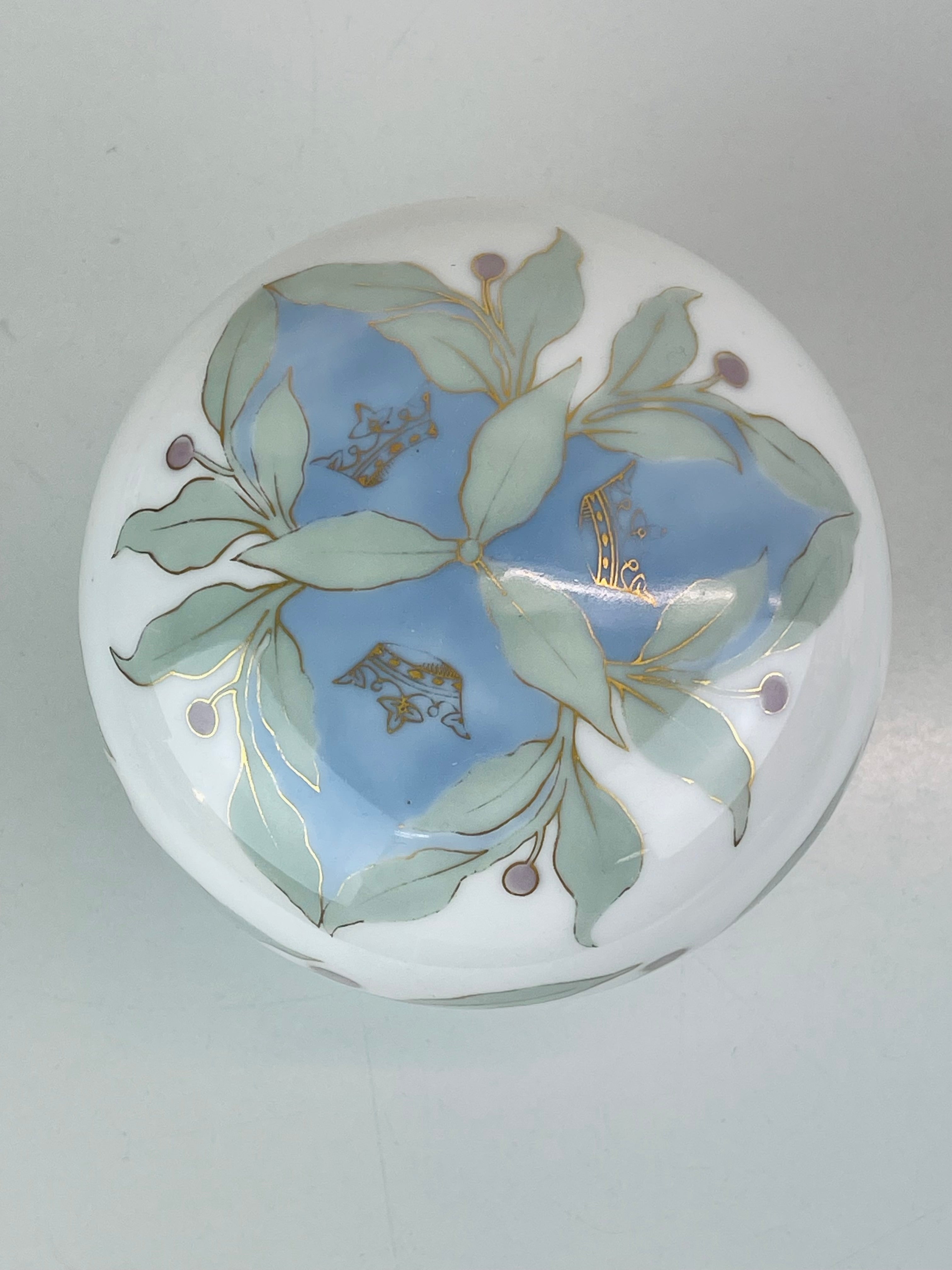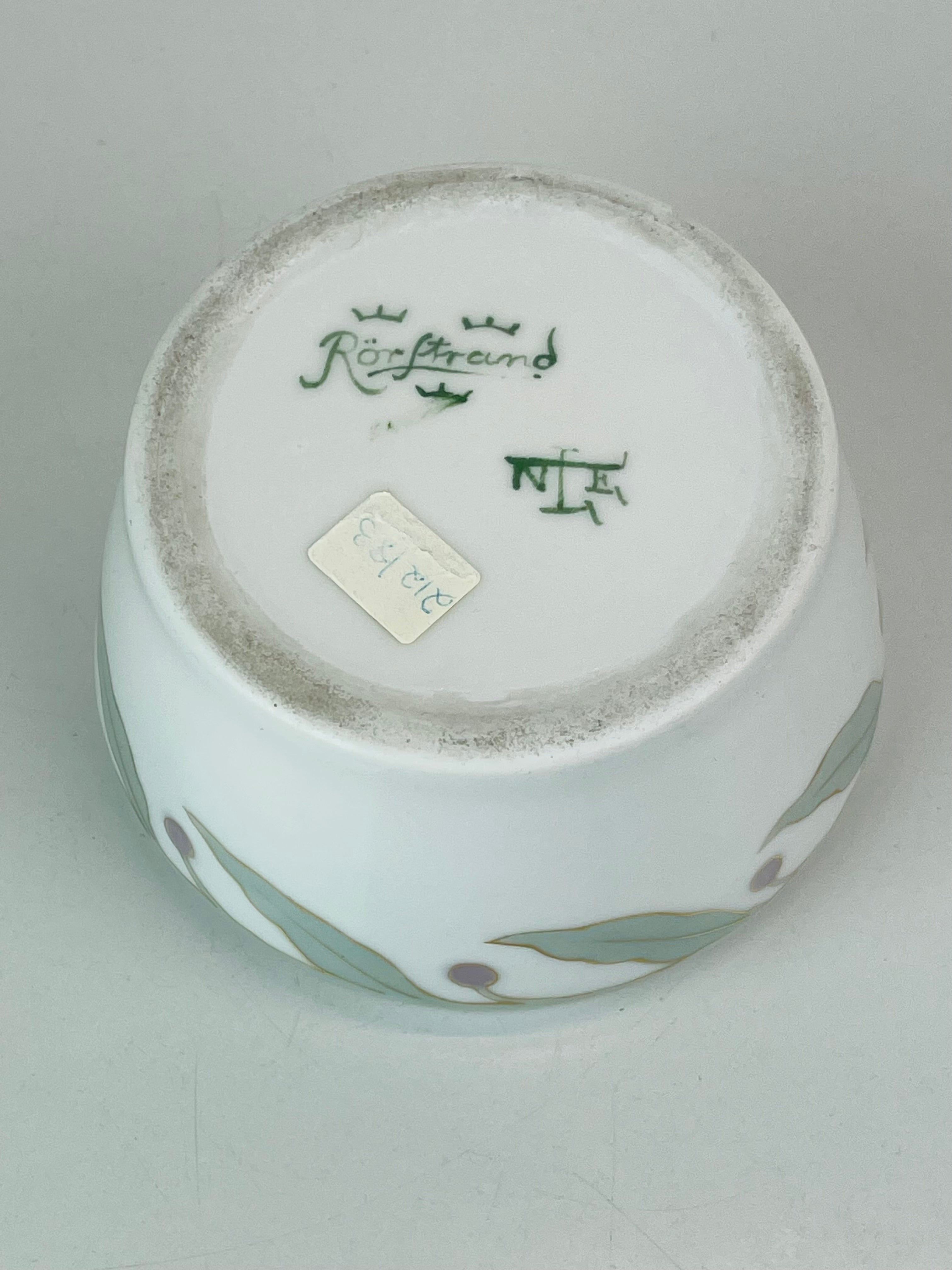 Handmålad lockurna i porslin, signerad med Nils Emil Lundströms signatur. Lockurnan är i gott skick men har tyvärr ett nagg i kanten av den nedre delens övre kant, se bilder.