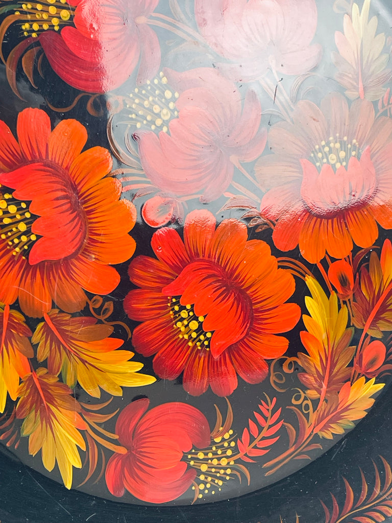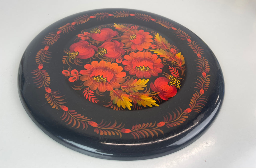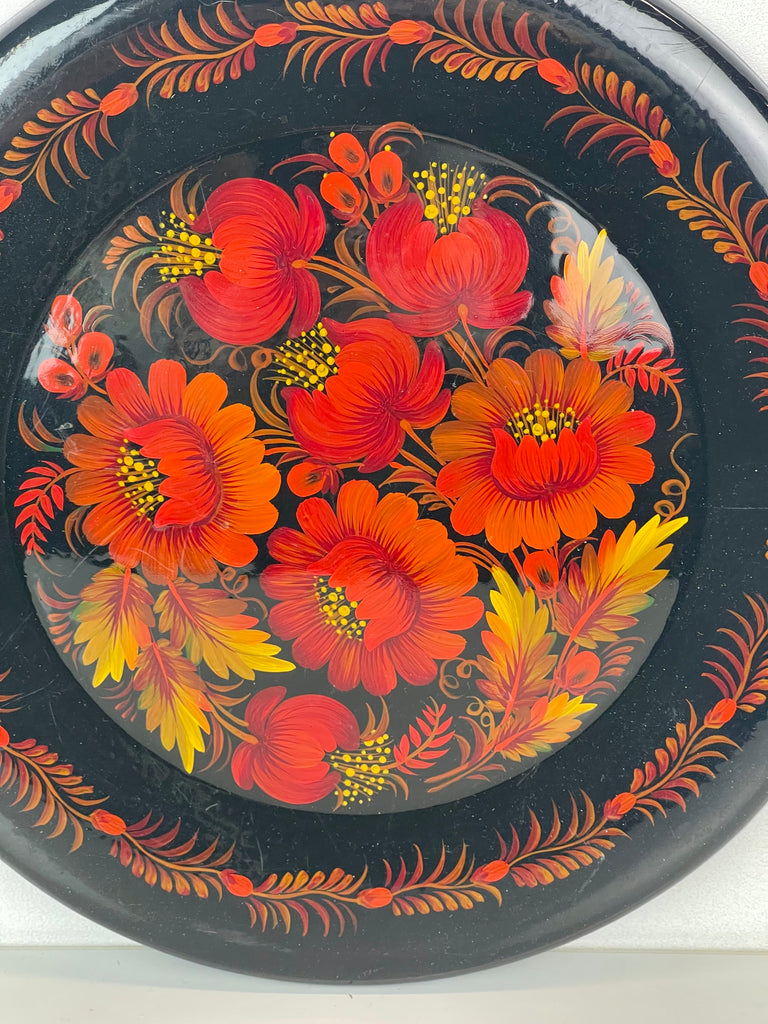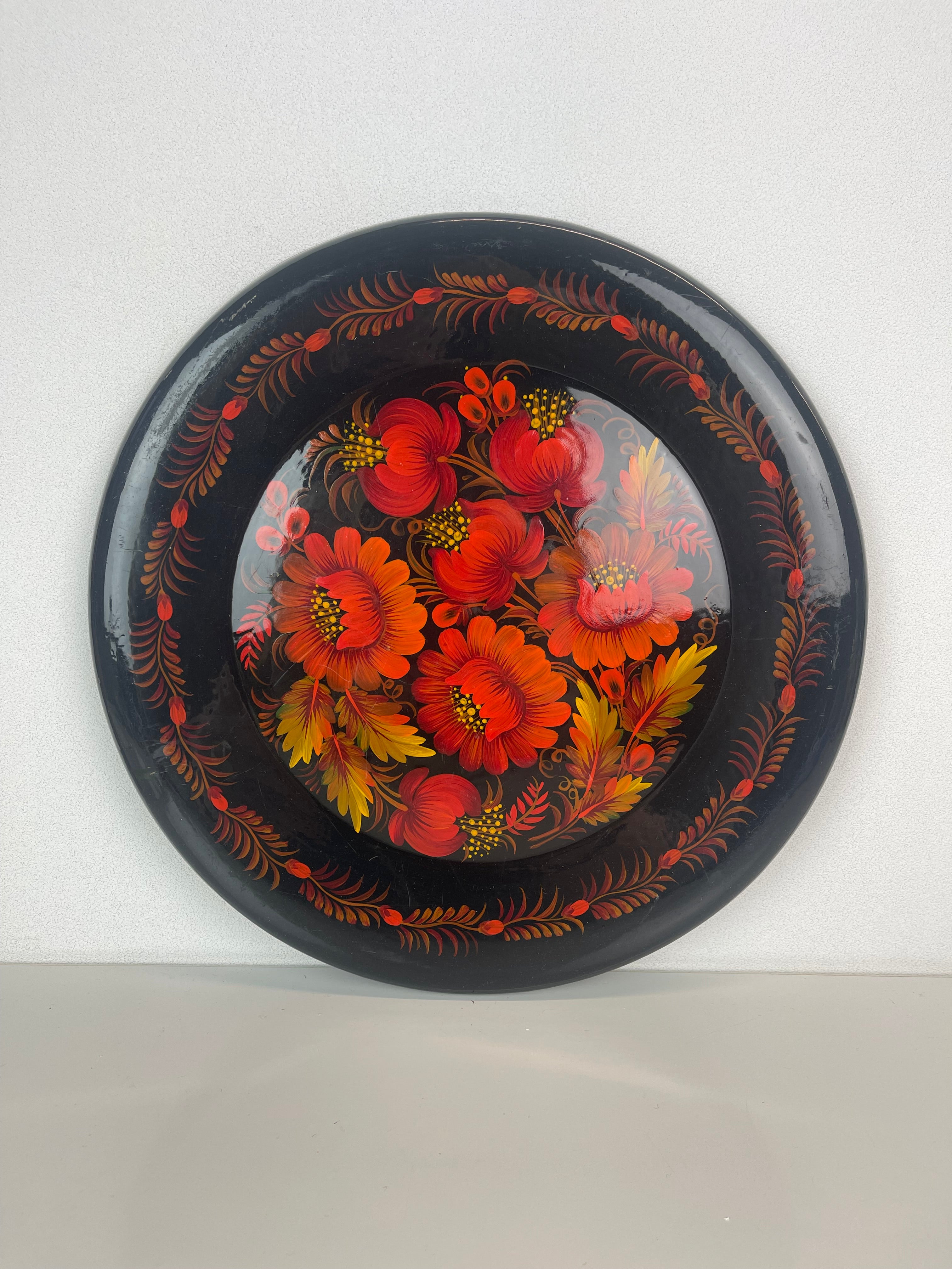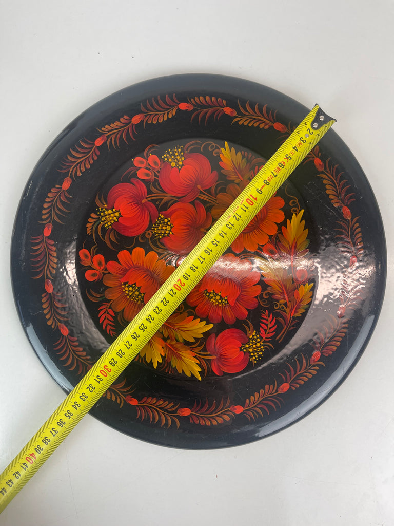 Neuvostoliittolainen/ukrainalainen tarjoiluvati maalatulla puulla. Hyvässä kunnossa ja kauniilla kansanperinteen teemalla. Seinäteline, jotta sen voi ripustaa seinälle.