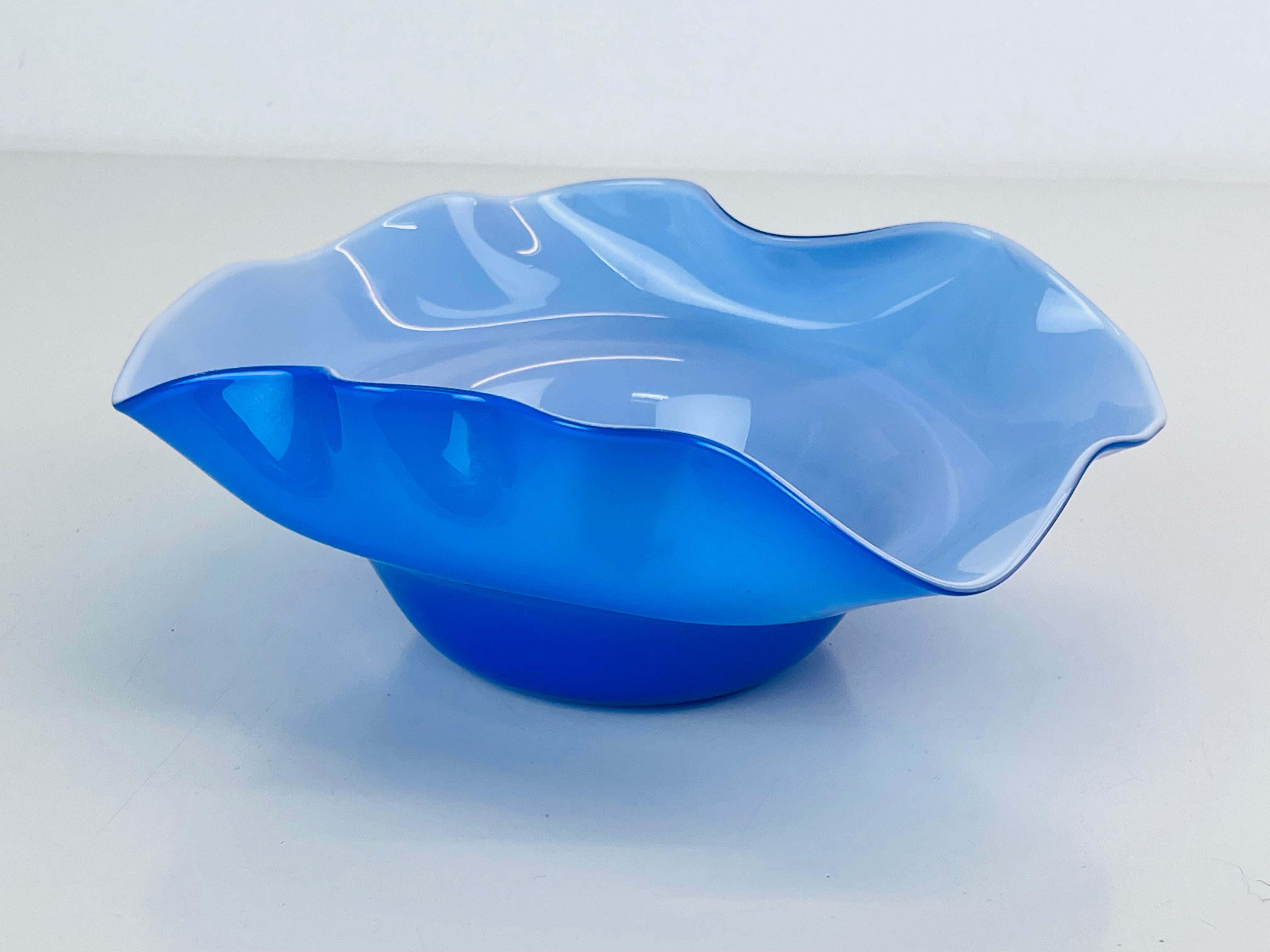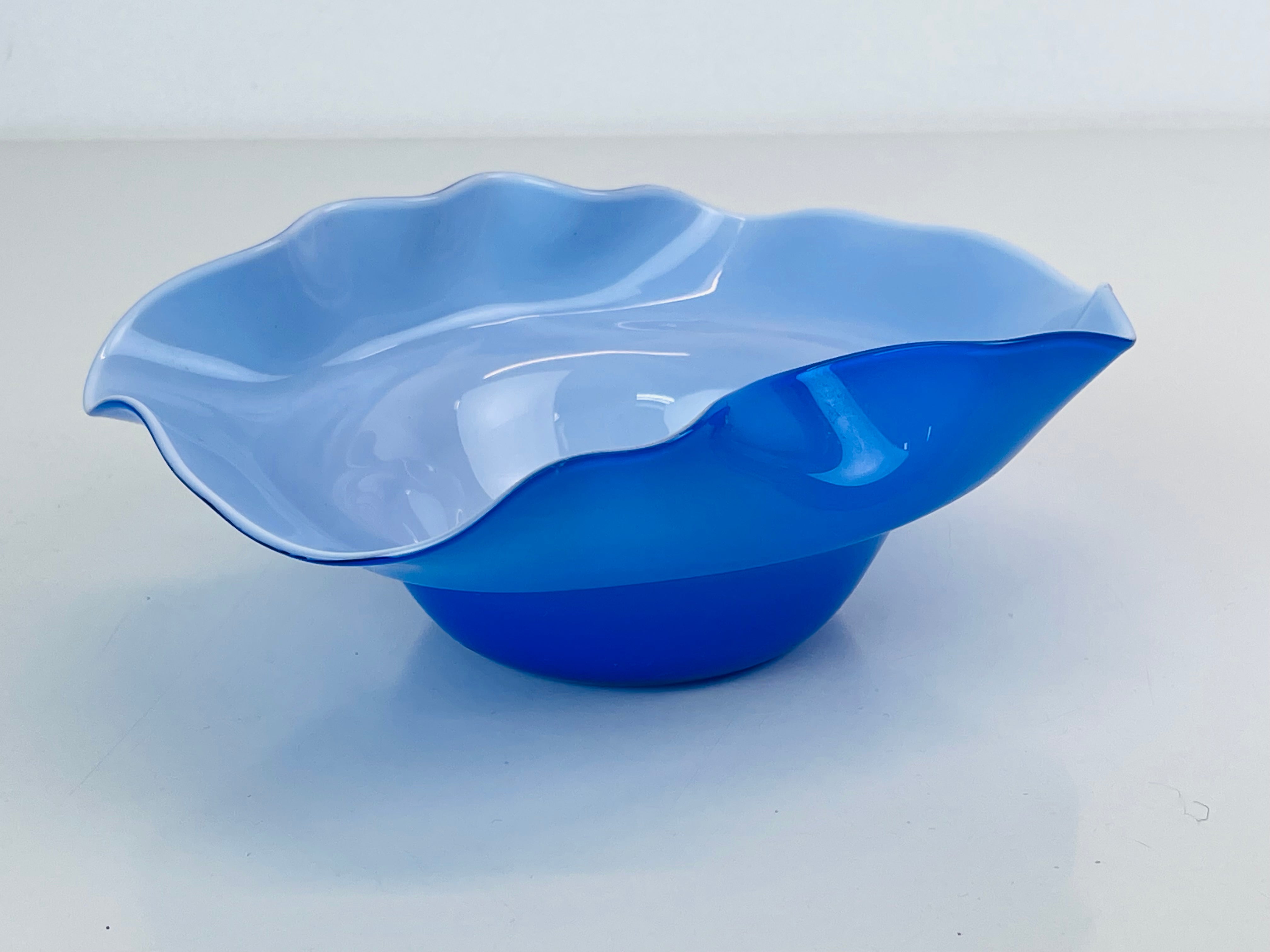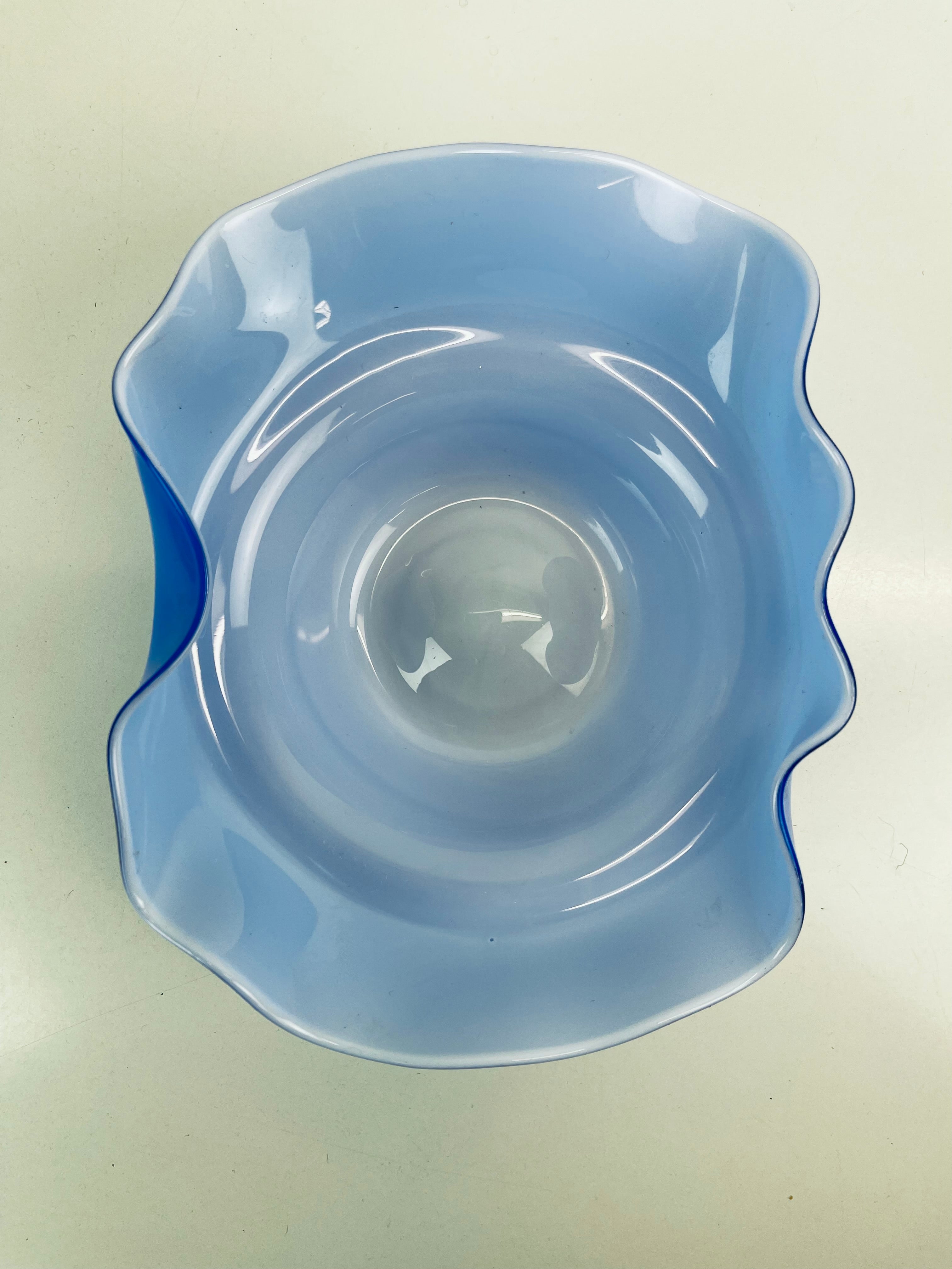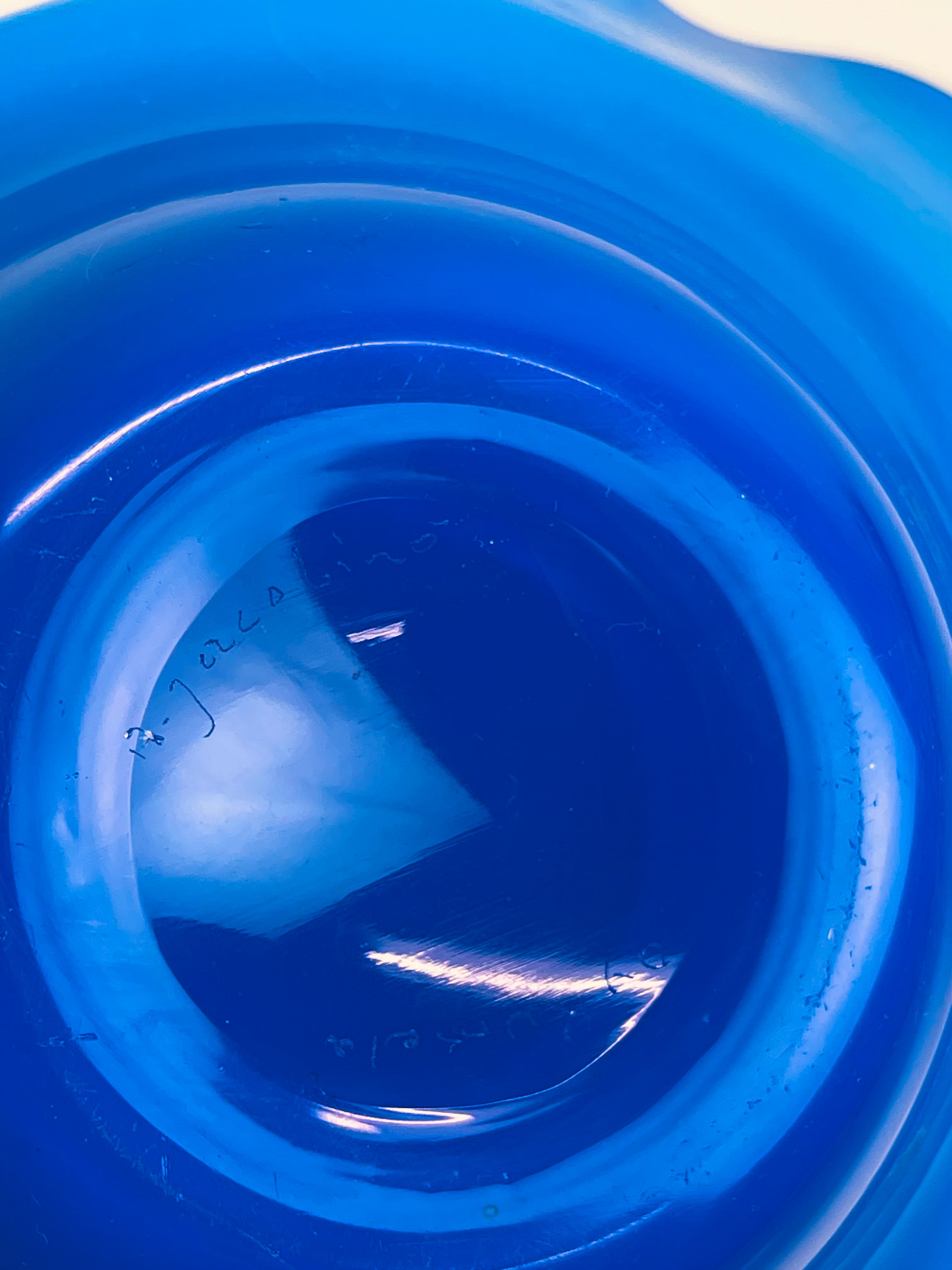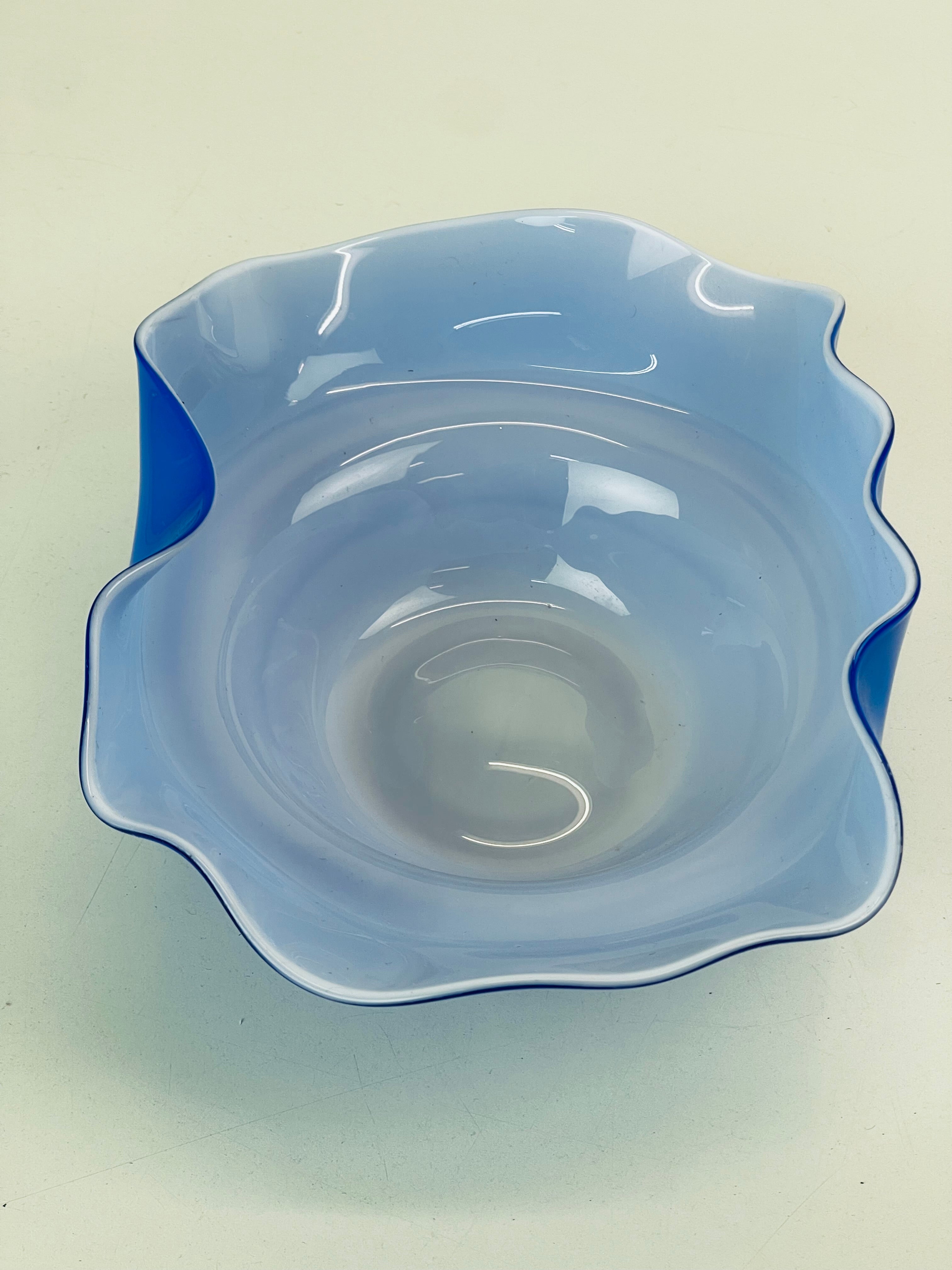 Signerad skål, konstglas, i blått och vitt. Signerad ”Oy Kumela, A Jacobino.