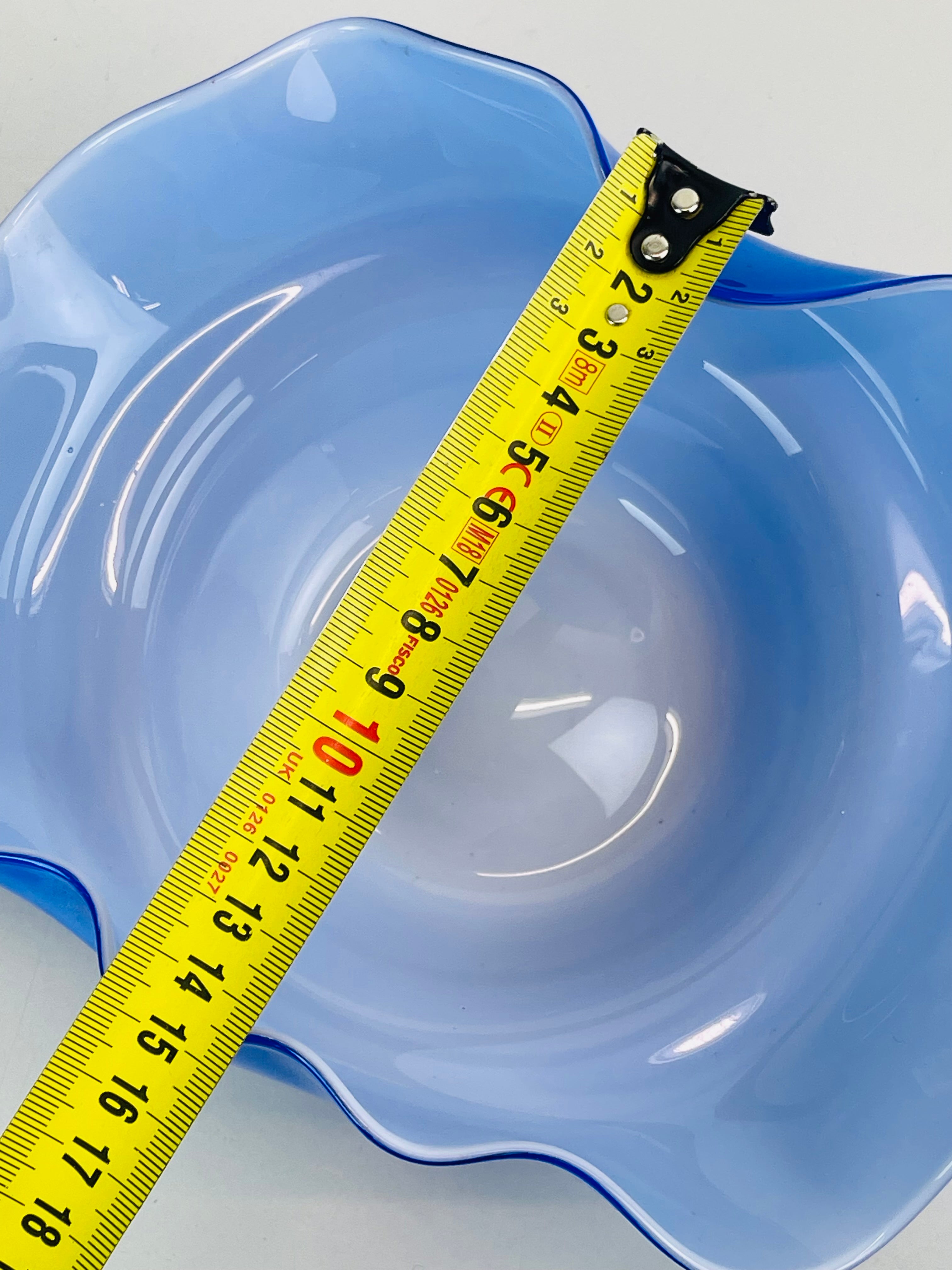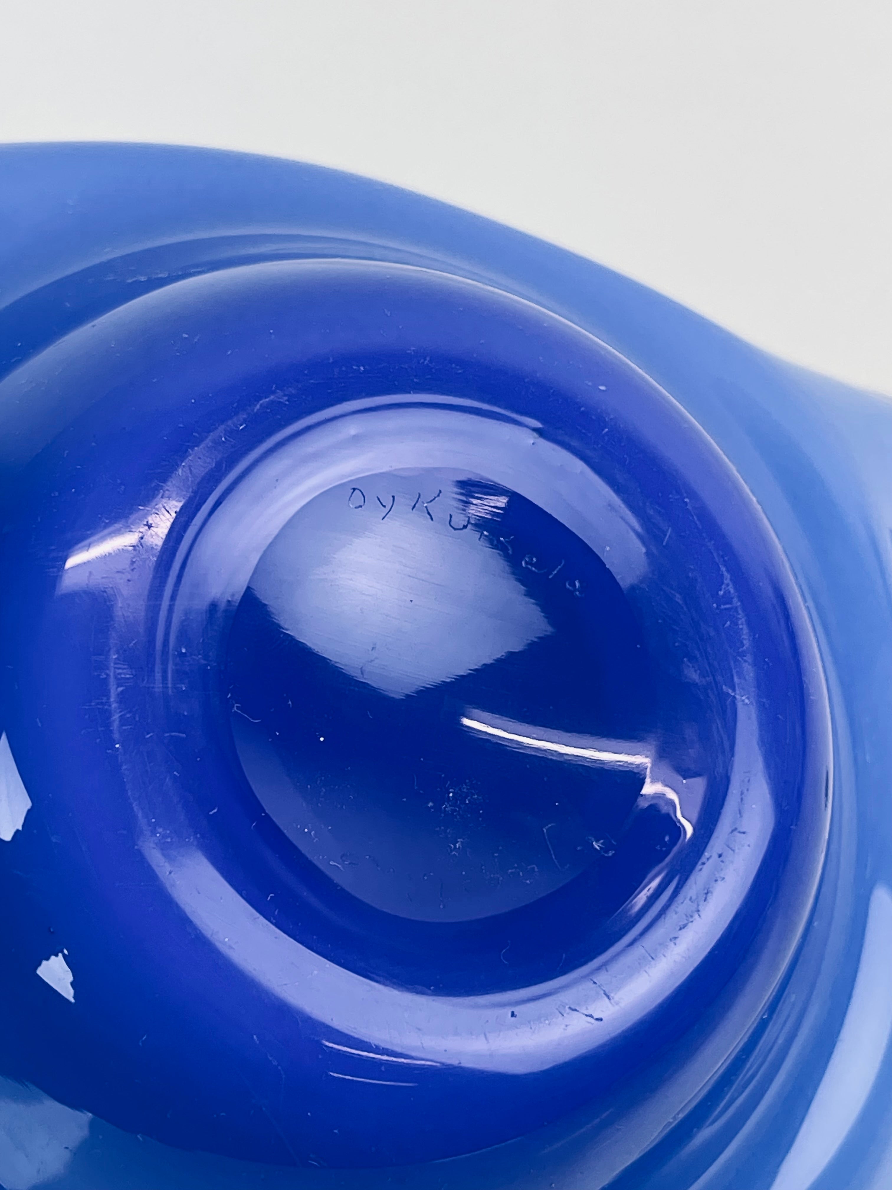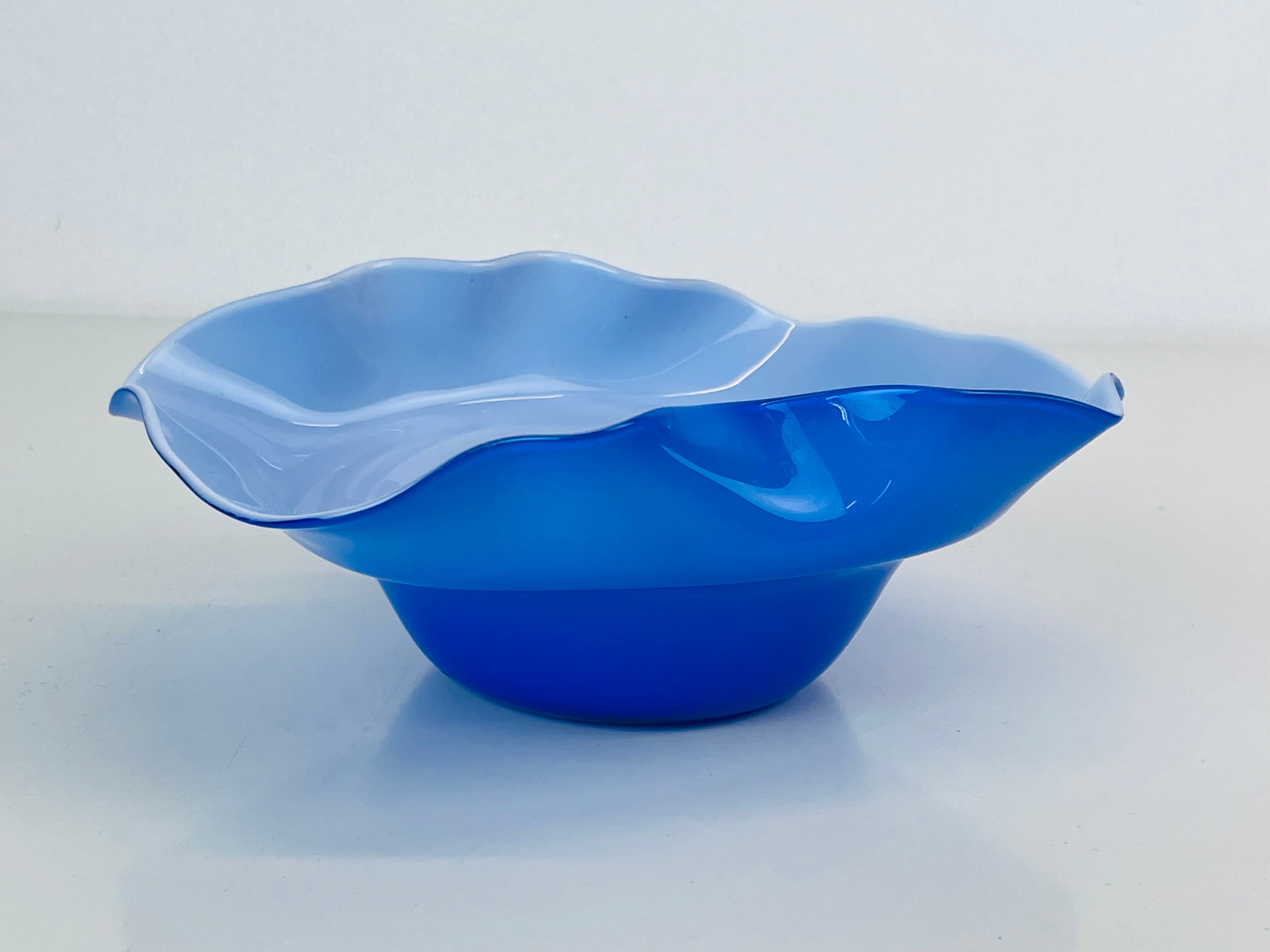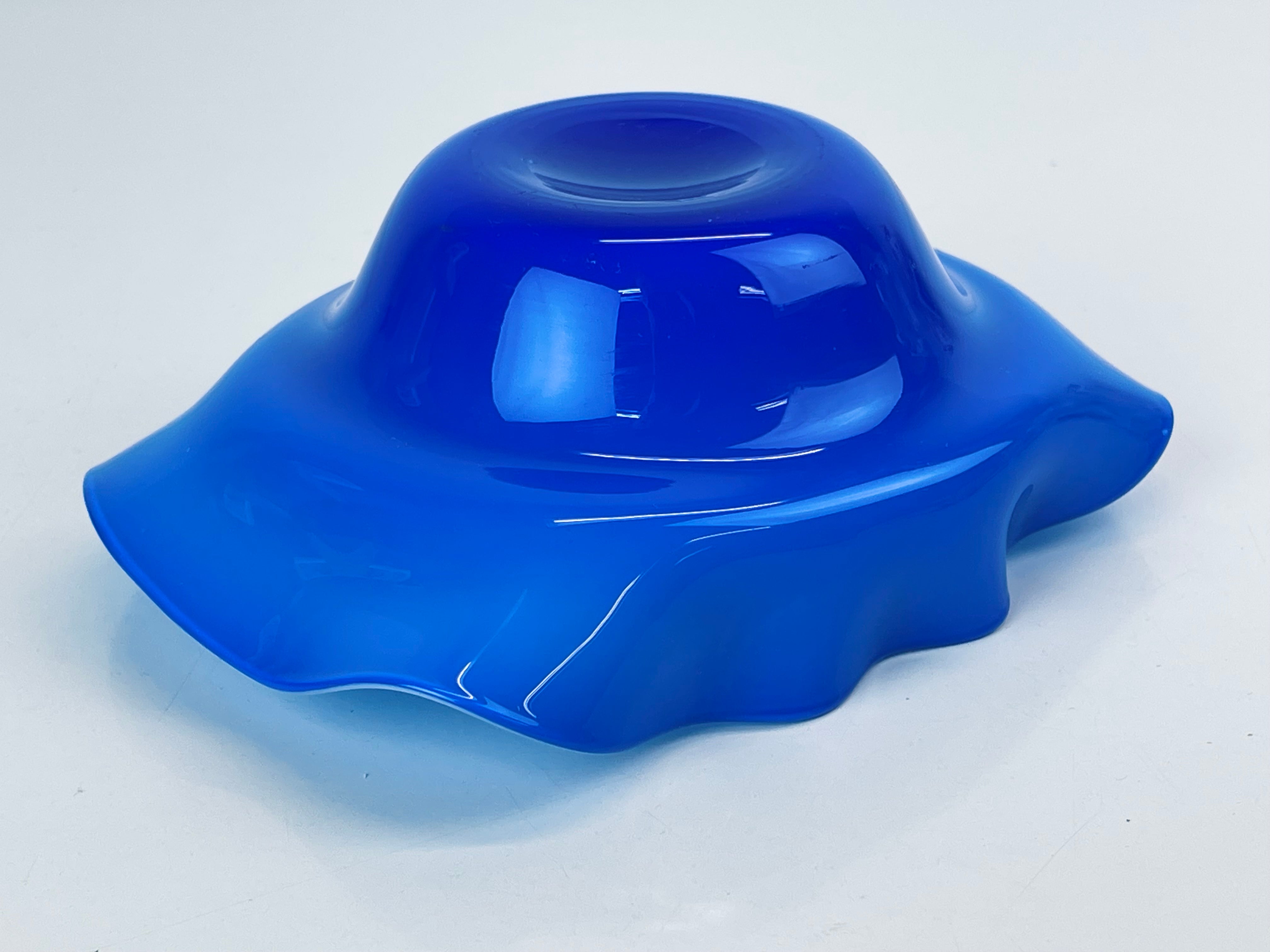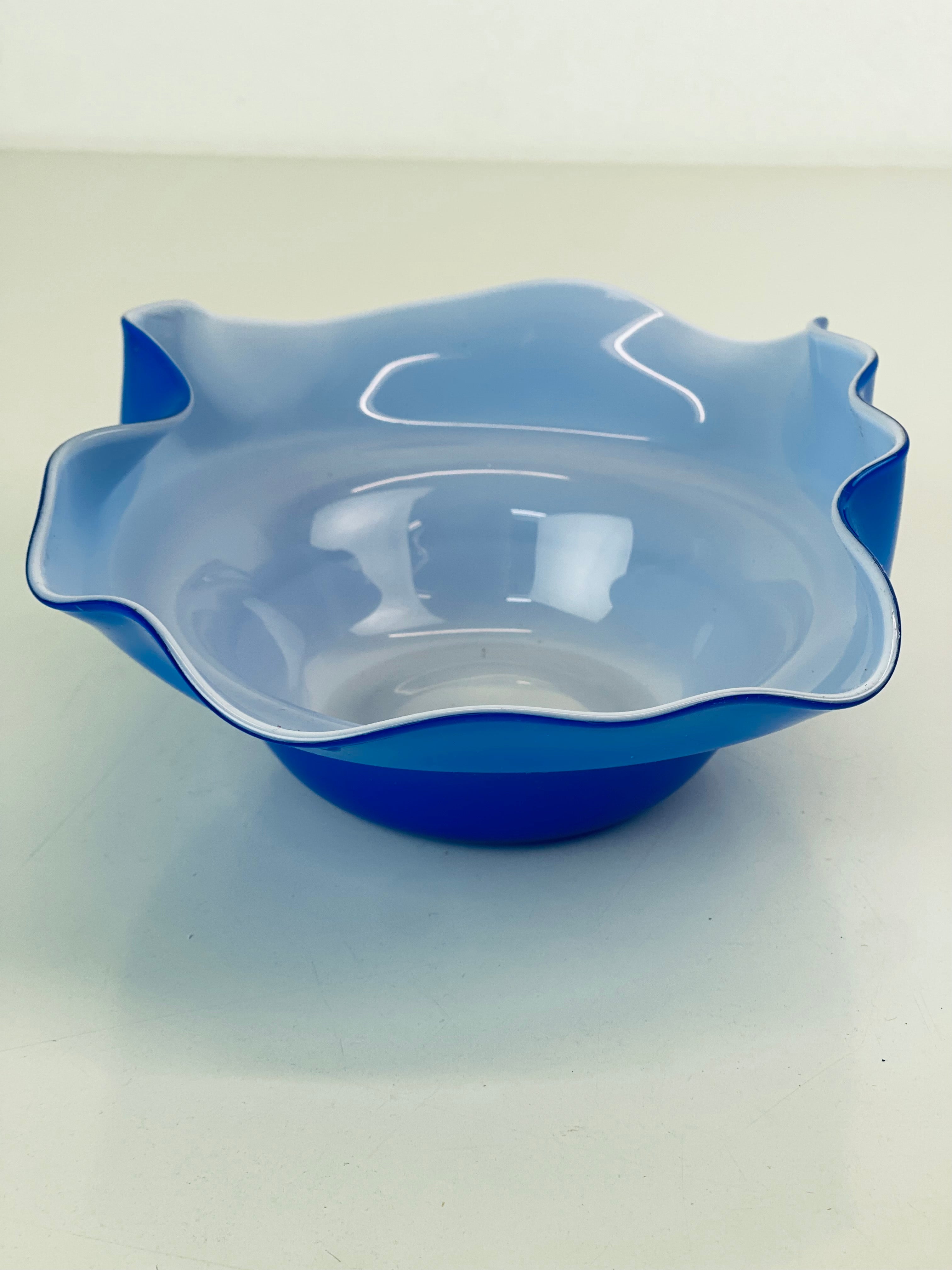 Signerad skål, konstglas, i blått och vitt. Signerad ”Oy Kumela, A Jacobino.