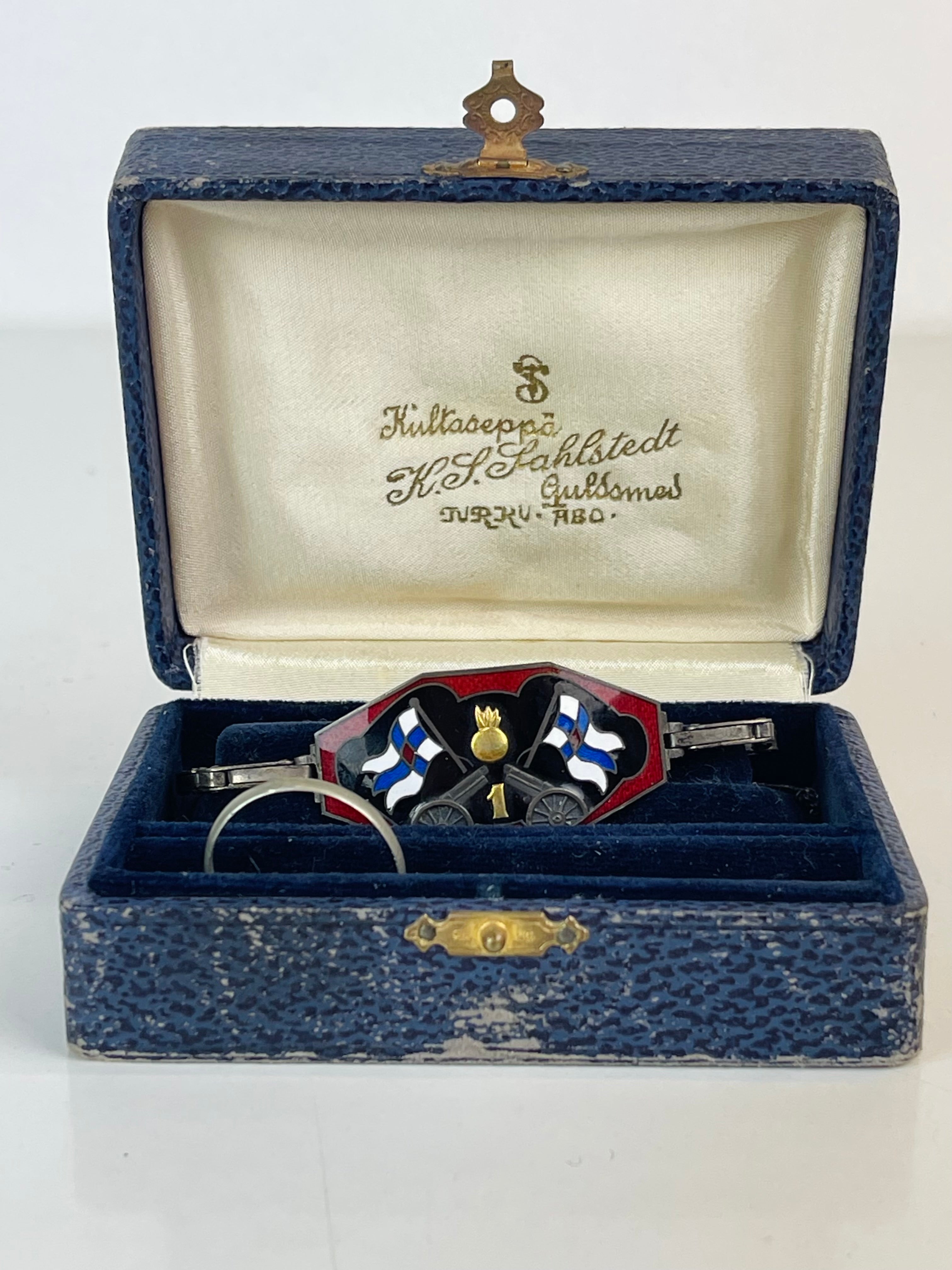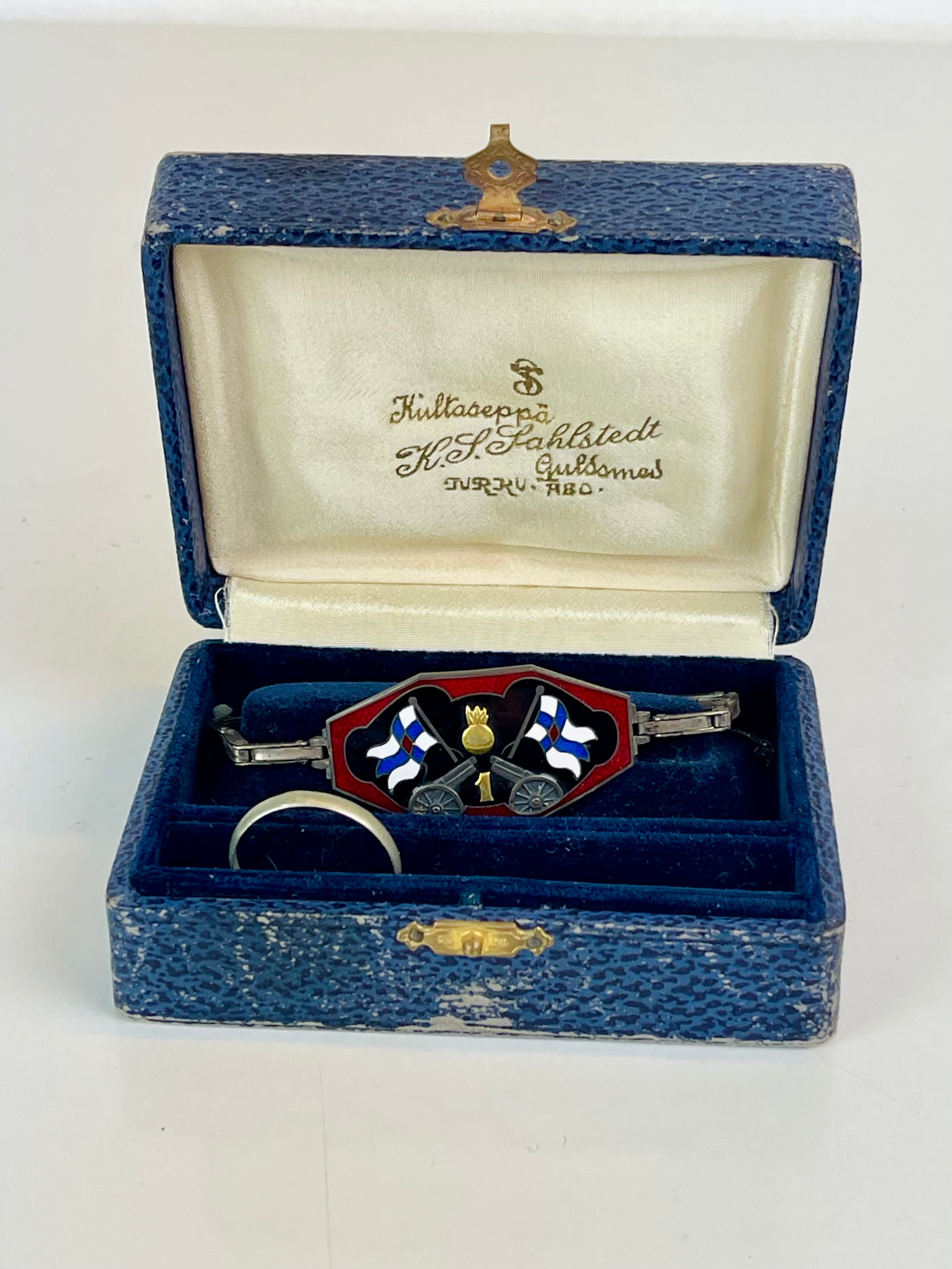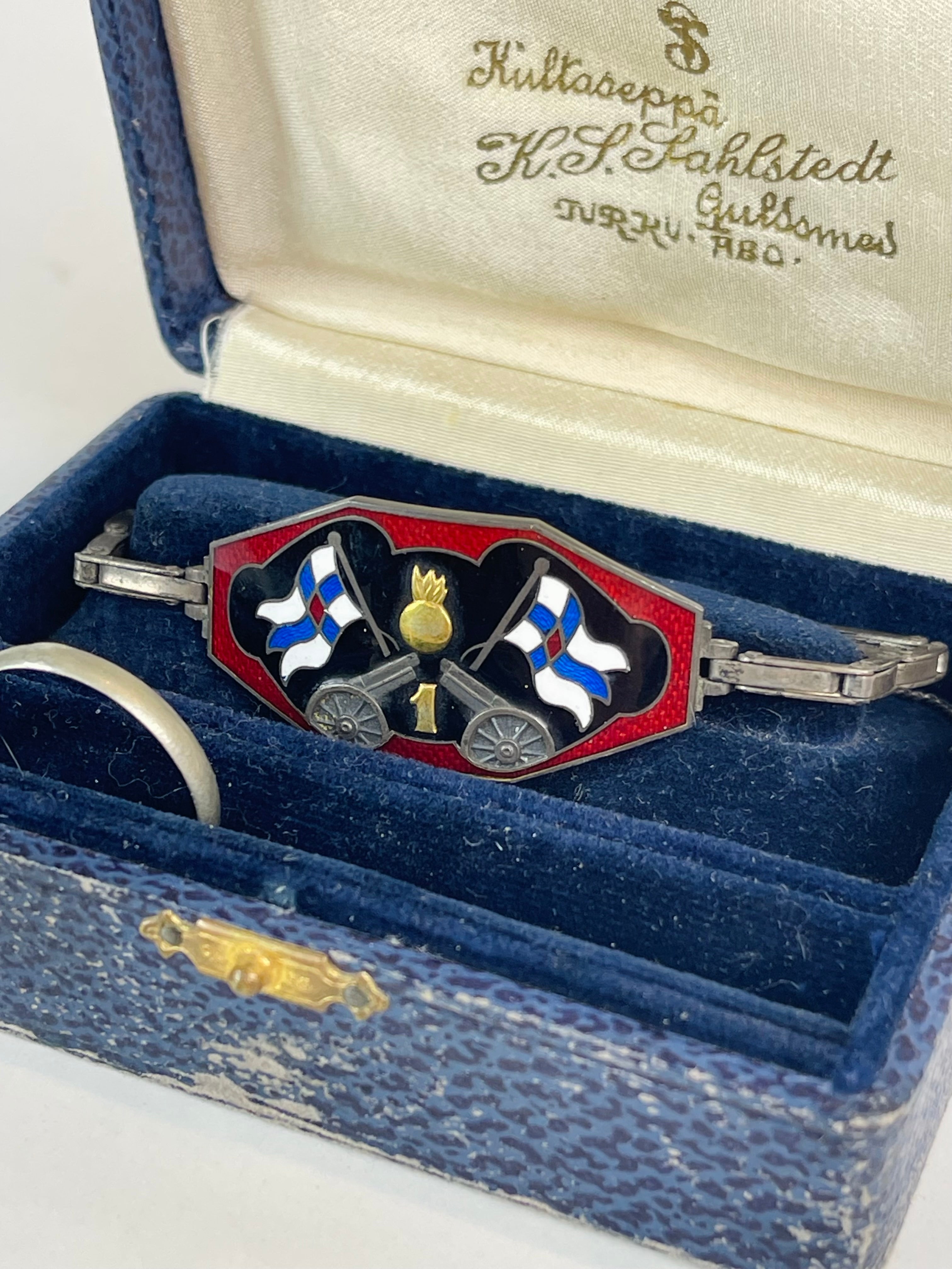 En järnring samt ett armband i emaljerat silver. Armbandet är daterat och graverat på insidan och vittnar om att det är från 1930. Järnringen ägdes av samma man, men ringen är odaterad.