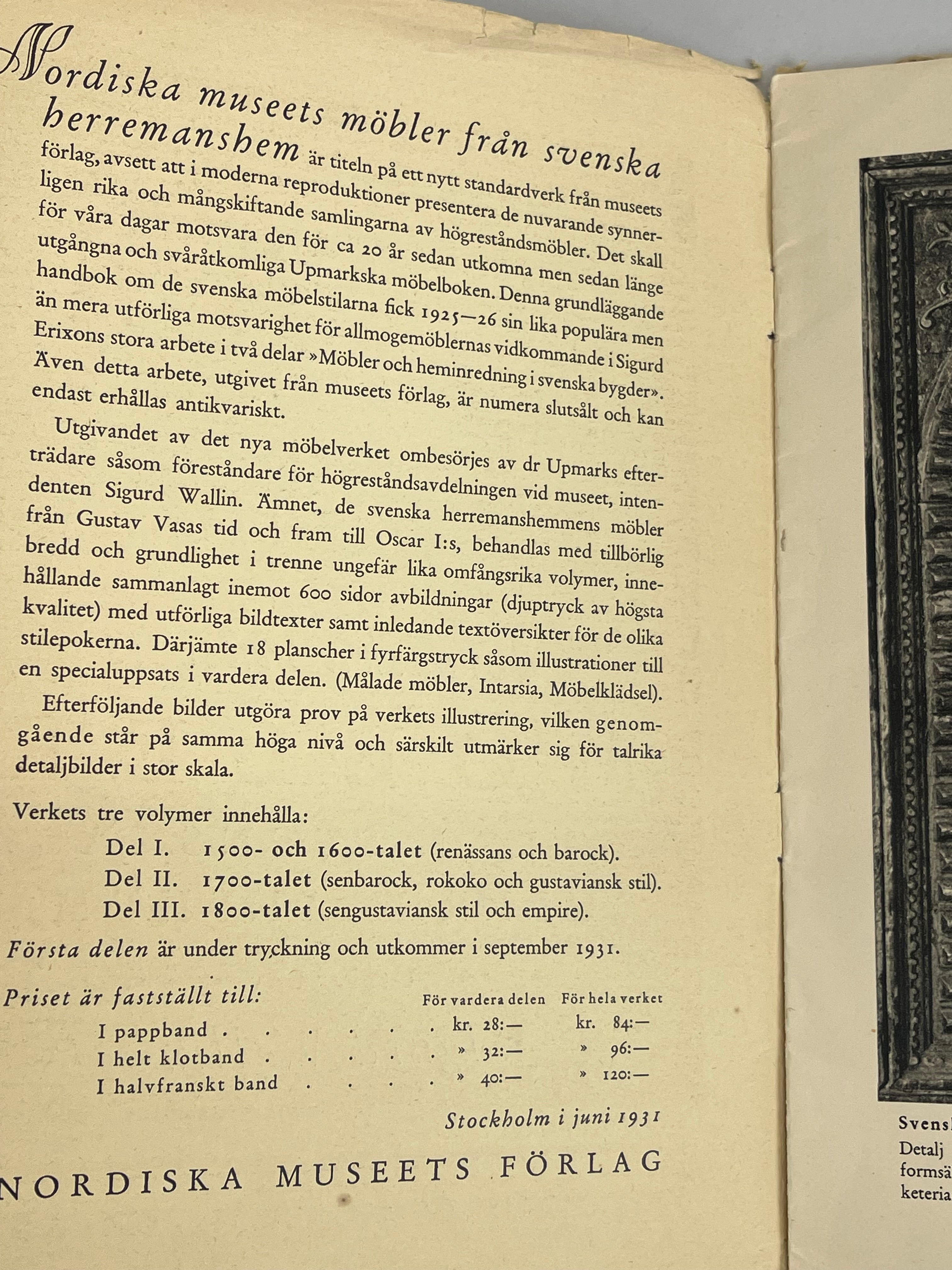 Nordiska museets möbler från svenska herremanshem, Sigurd Wallin, reklamblad Backorderd