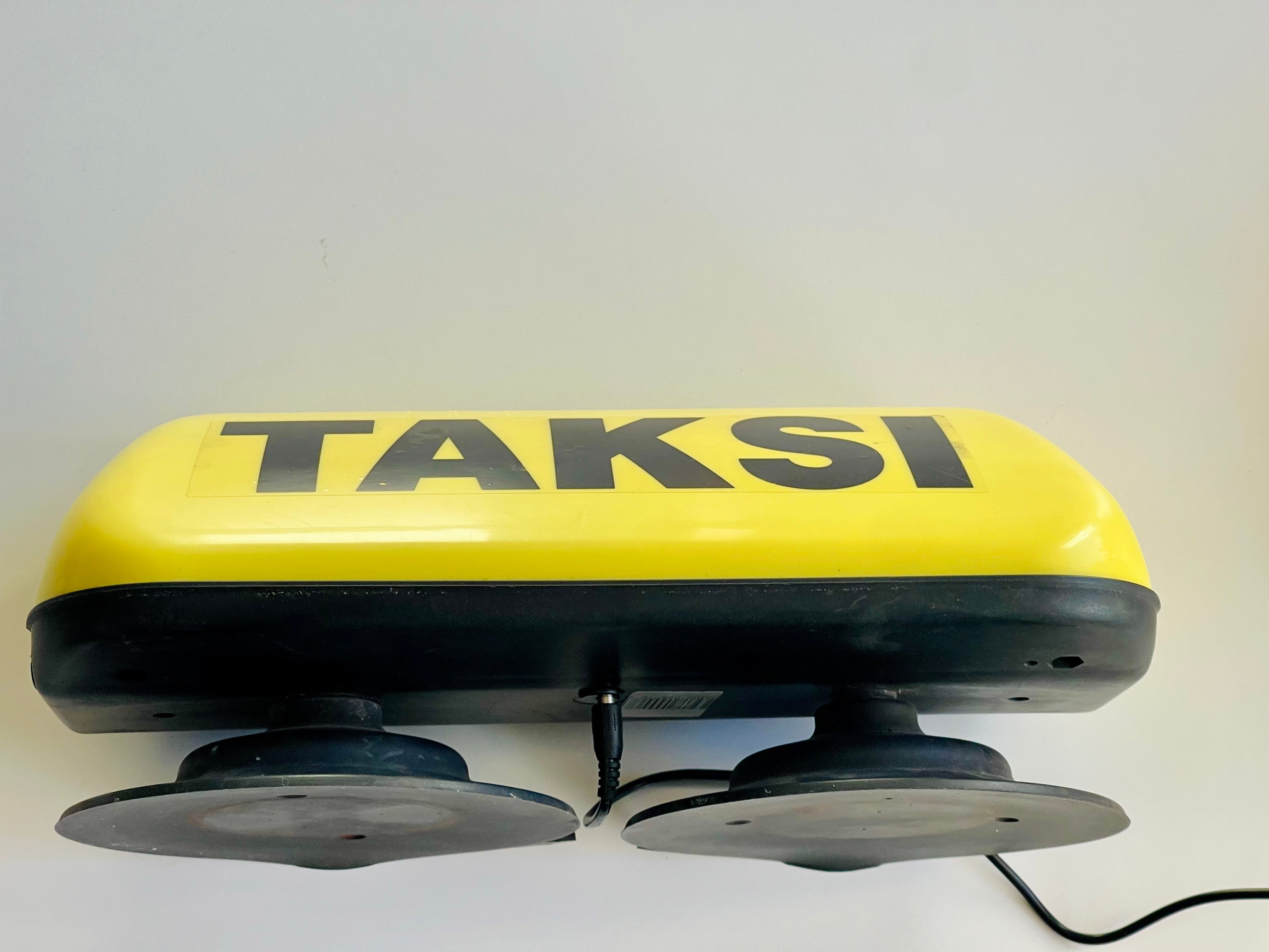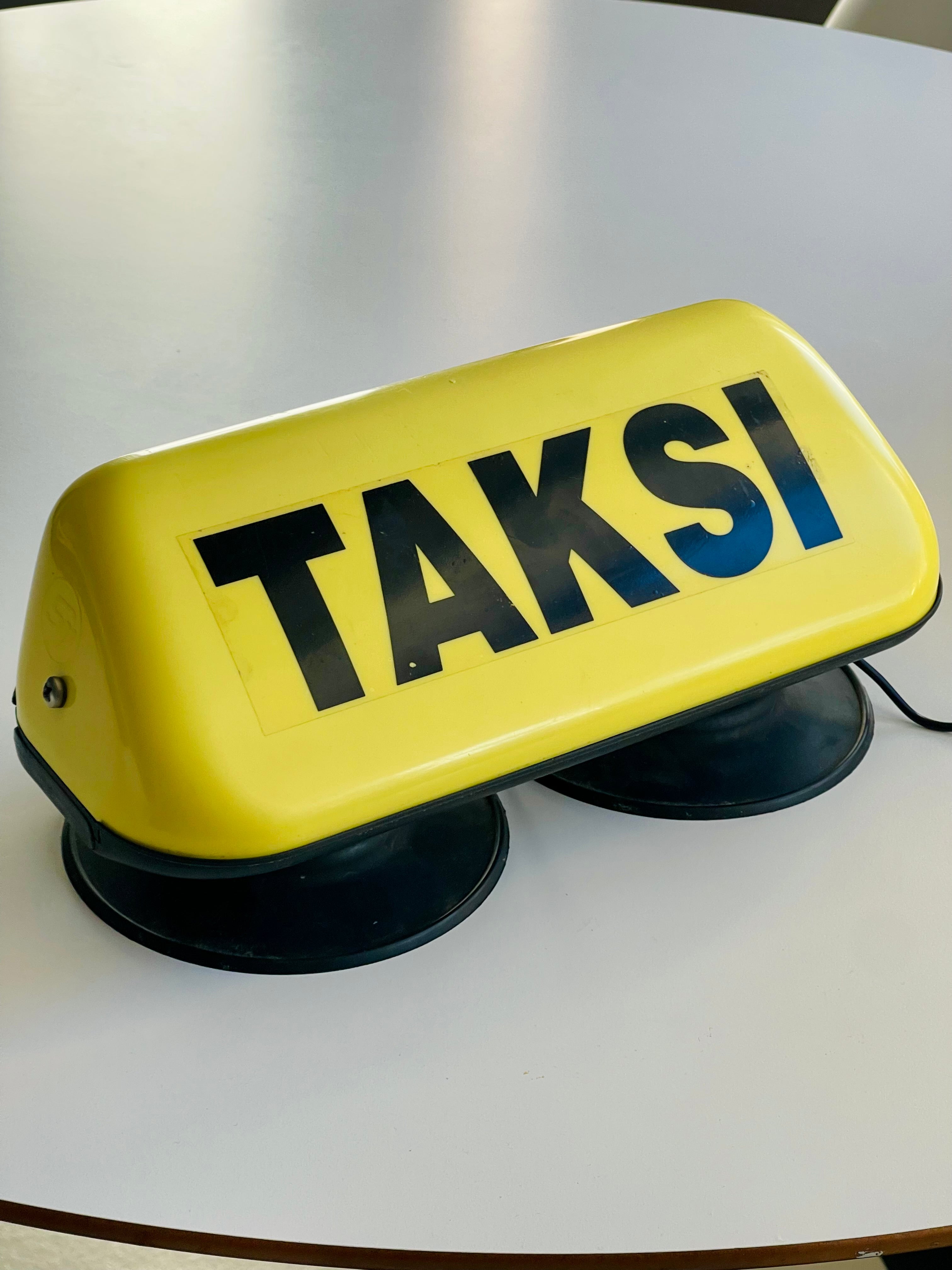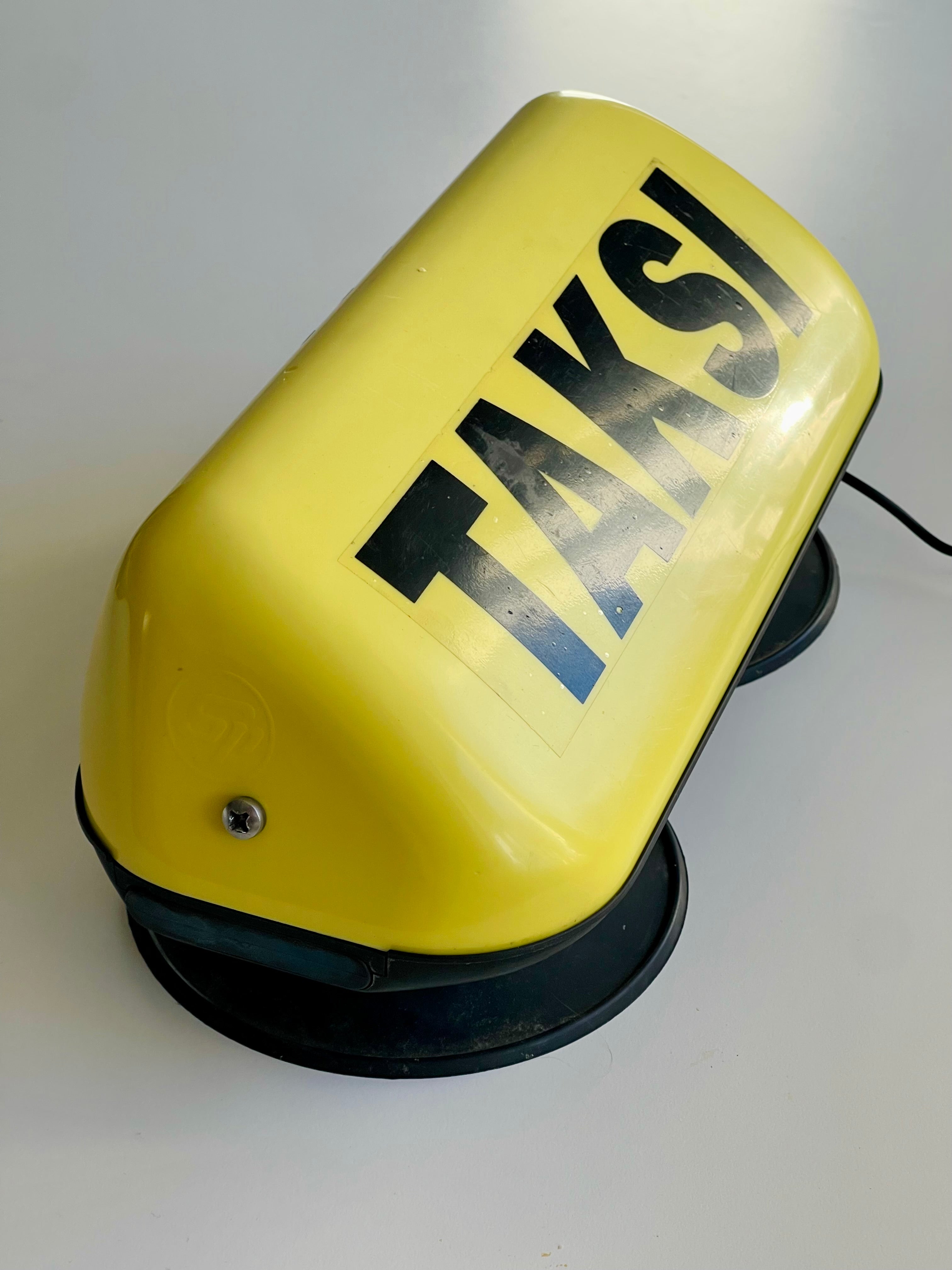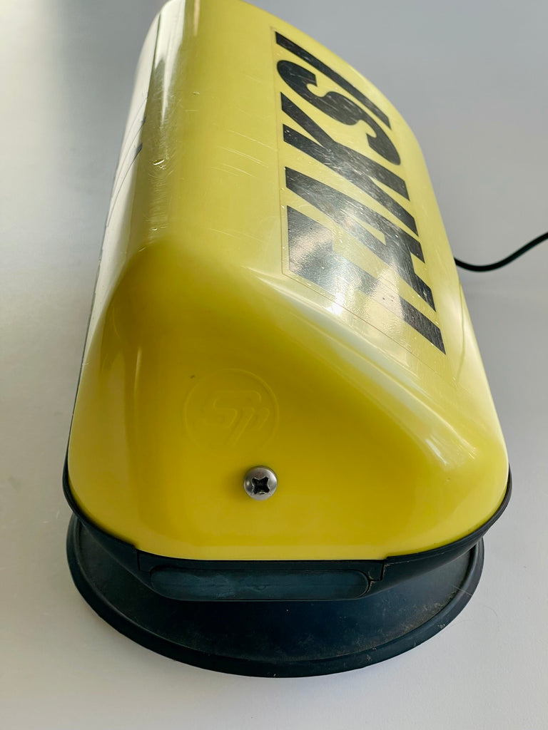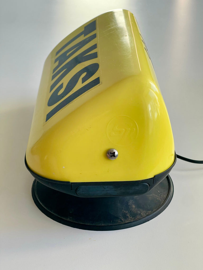 En gammal taxi-lampa omgjord till bordslampa. Har varit i användning på riktigt ute i trafiken, sedan rengjord och fått elen bytt. Förekommer således små repor och liknande, men överlag i jättefint skick.