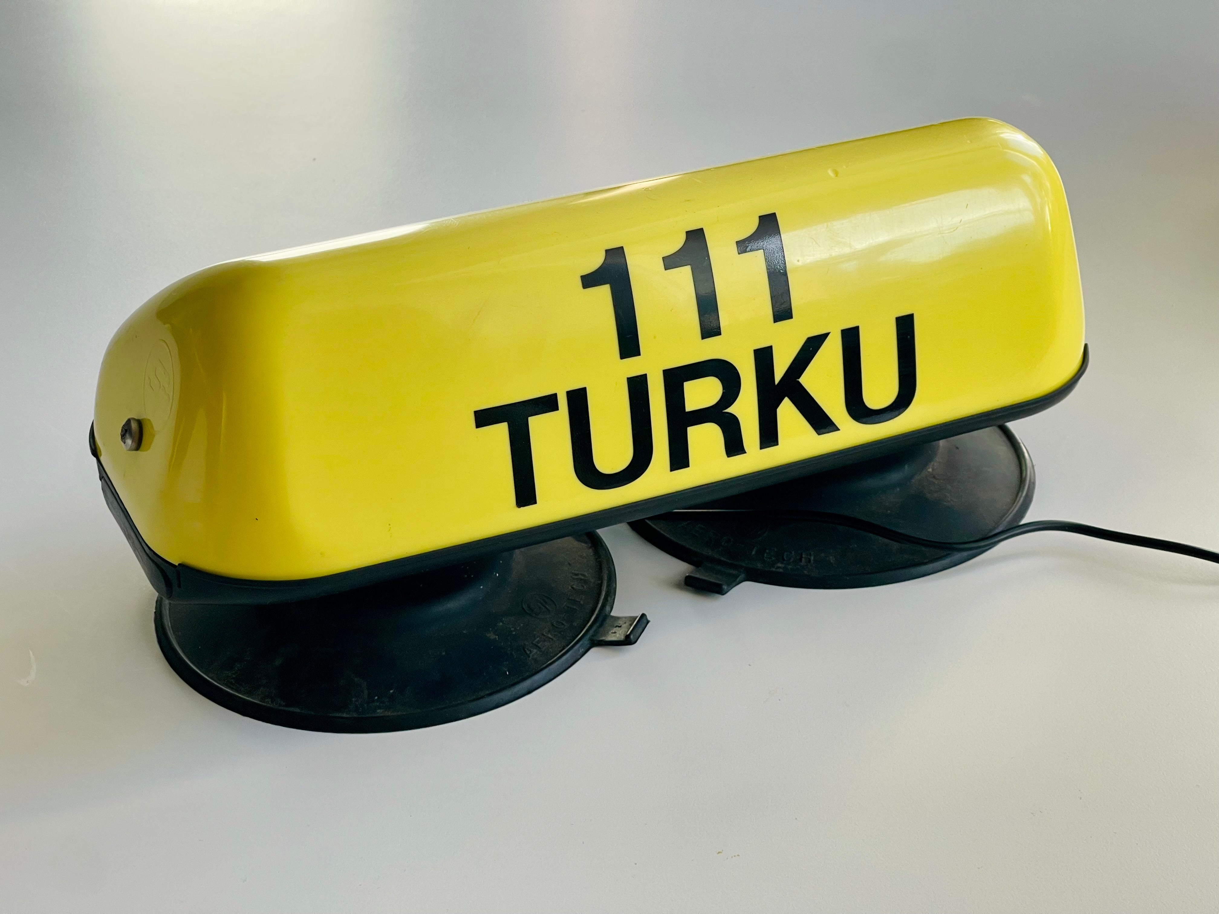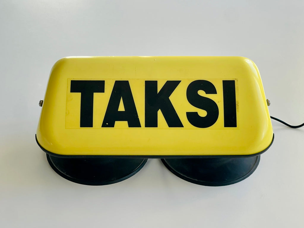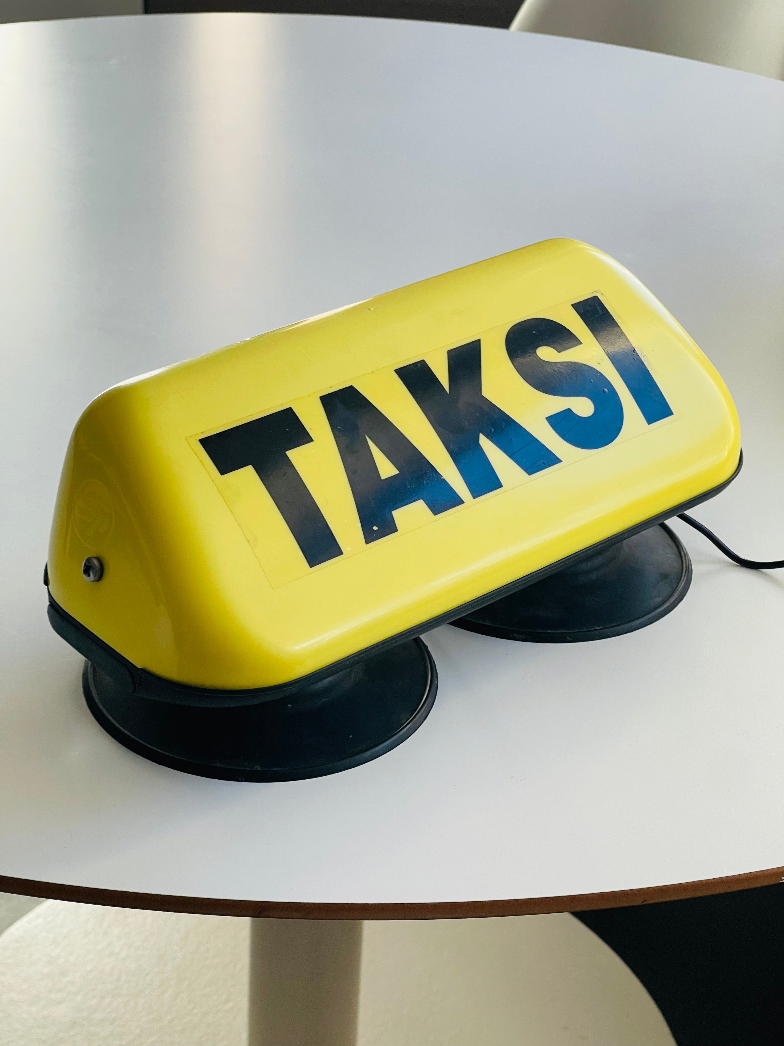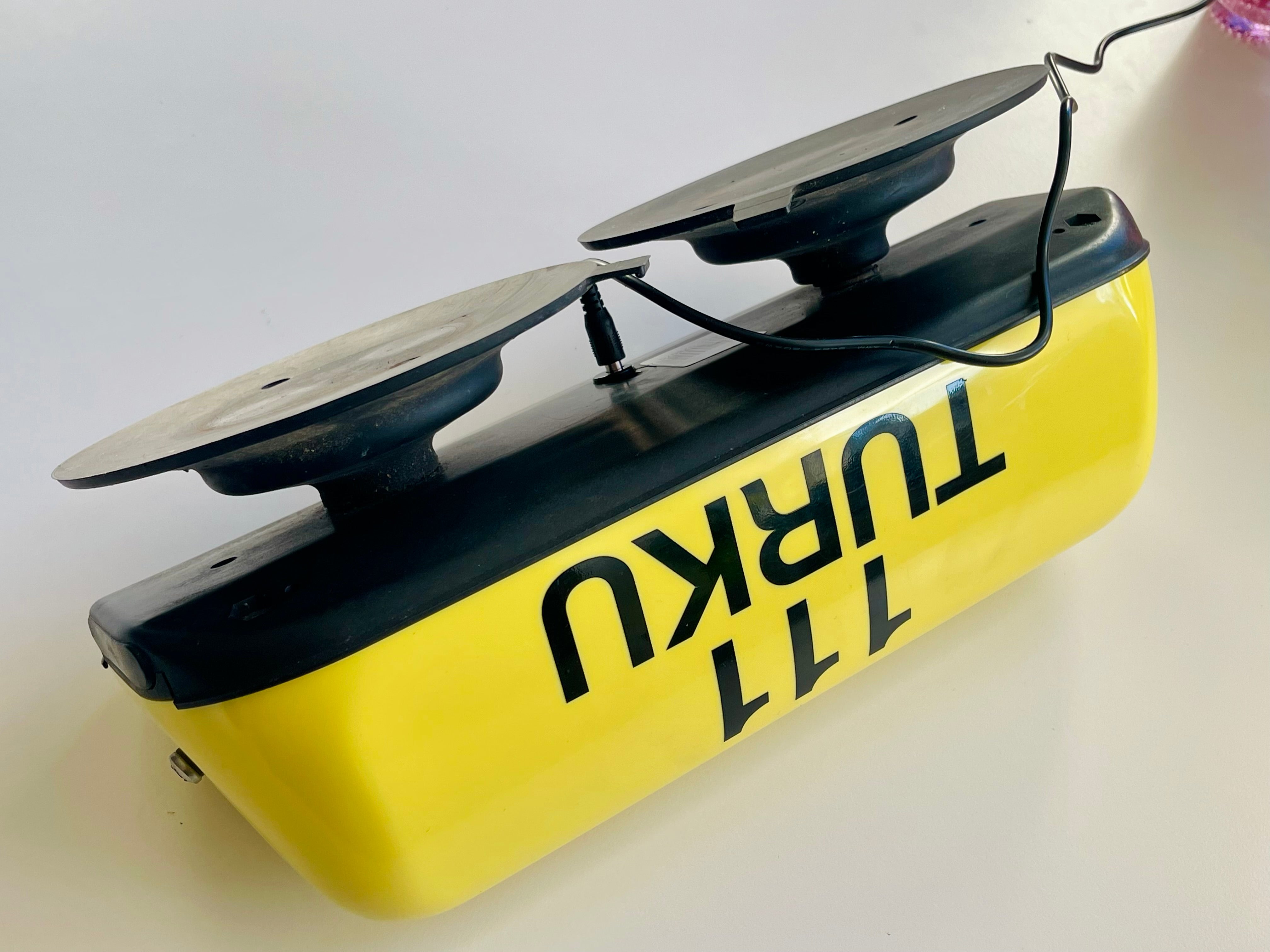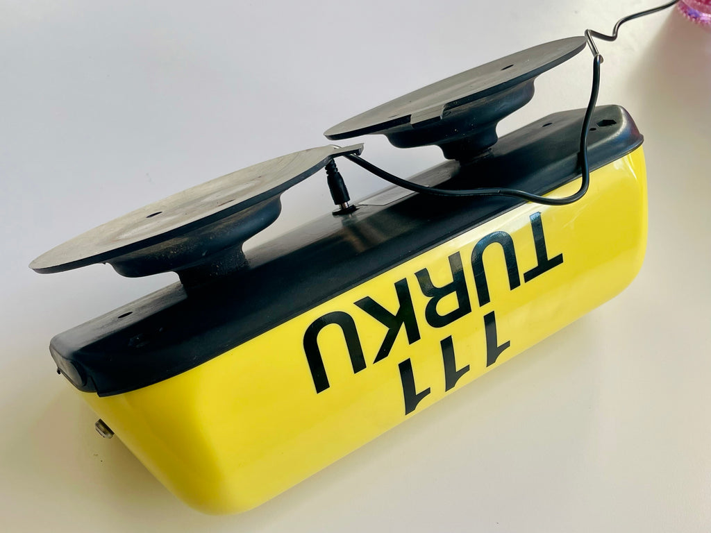 En gammal taxi-lampa omgjord till bordslampa. Har varit i användning på riktigt ute i trafiken, sedan rengjord och fått elen bytt. Förekommer således små repor och liknande, men överlag i jättefint skick.