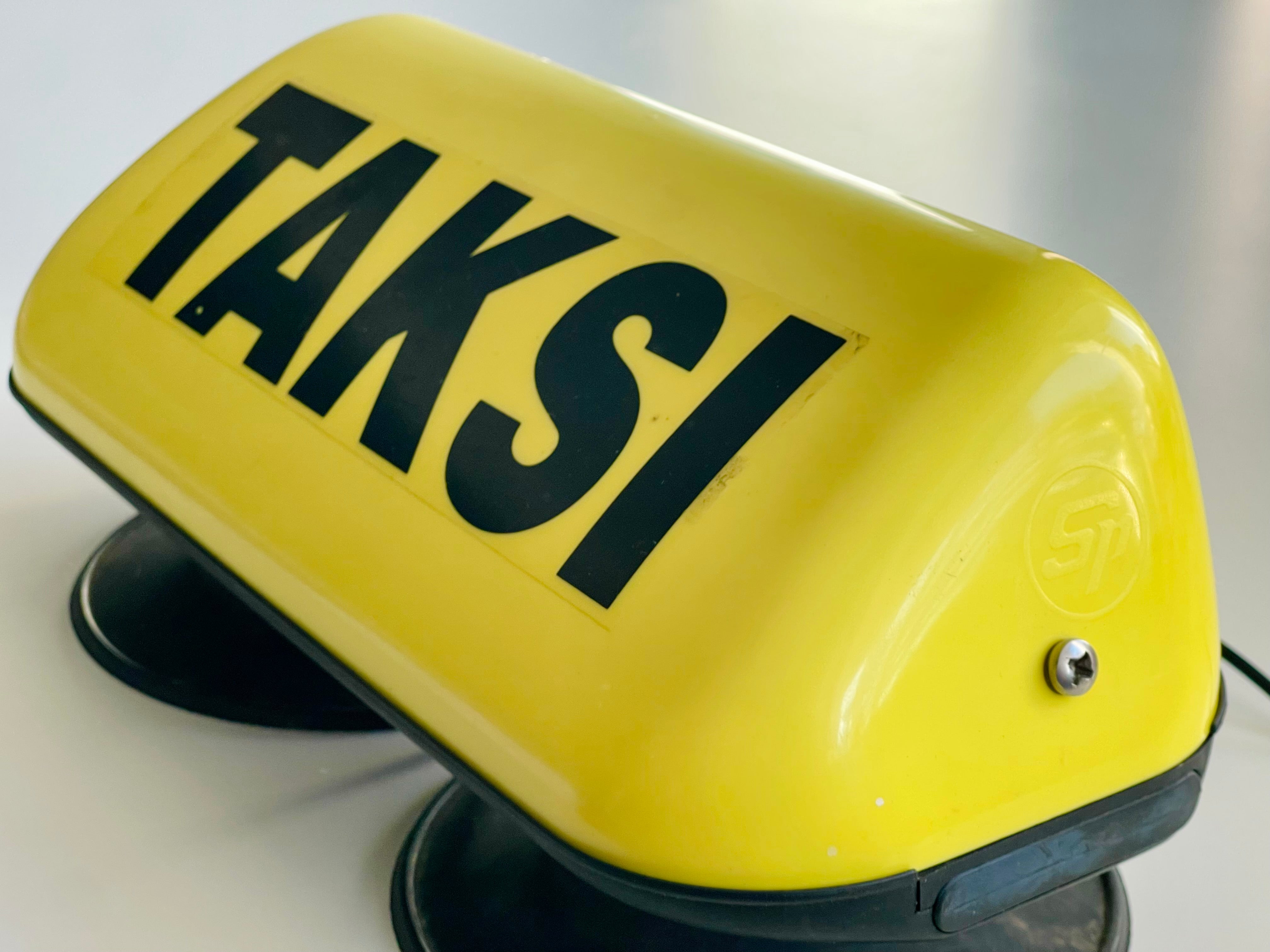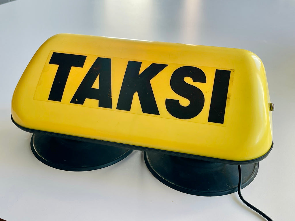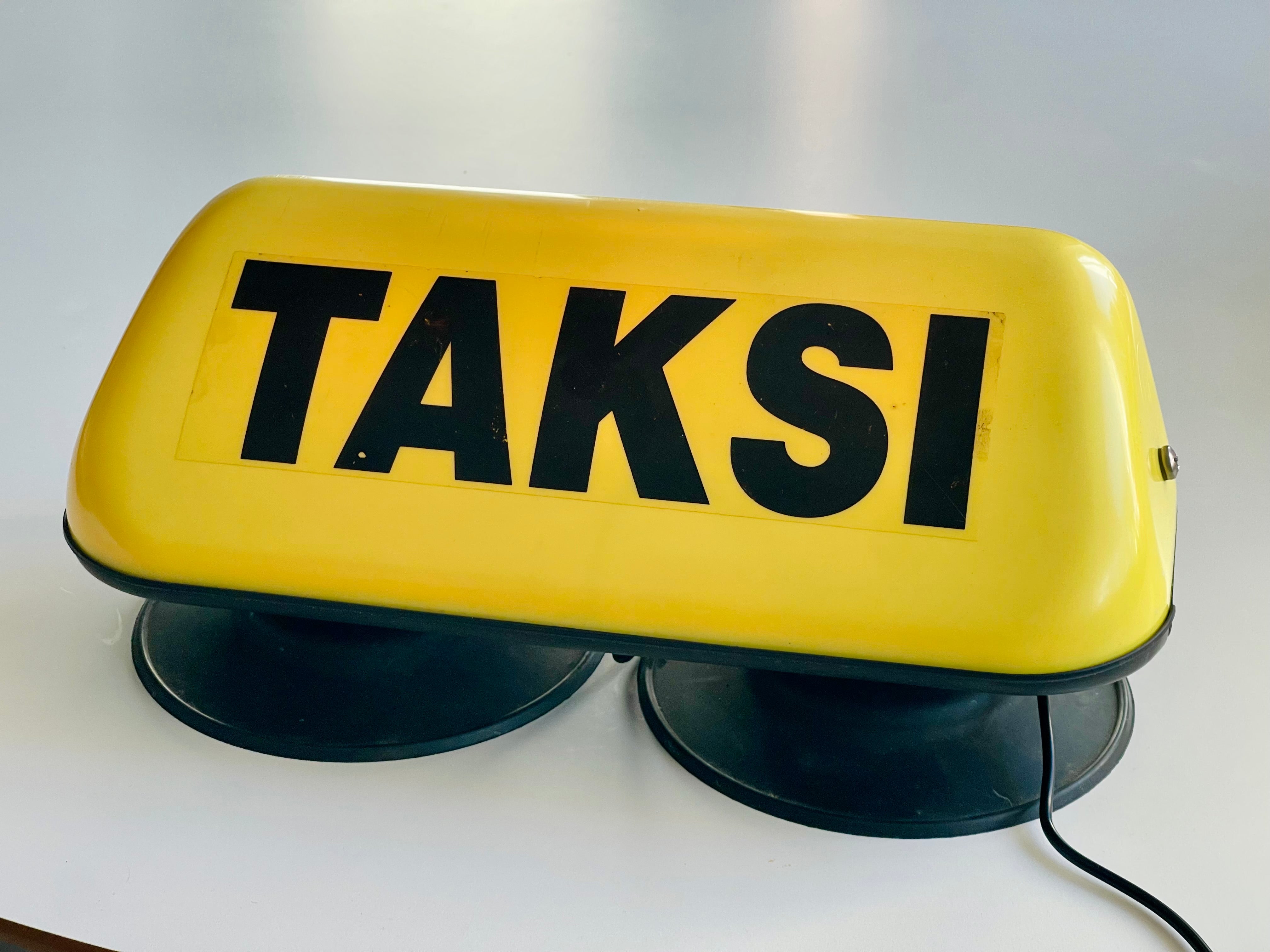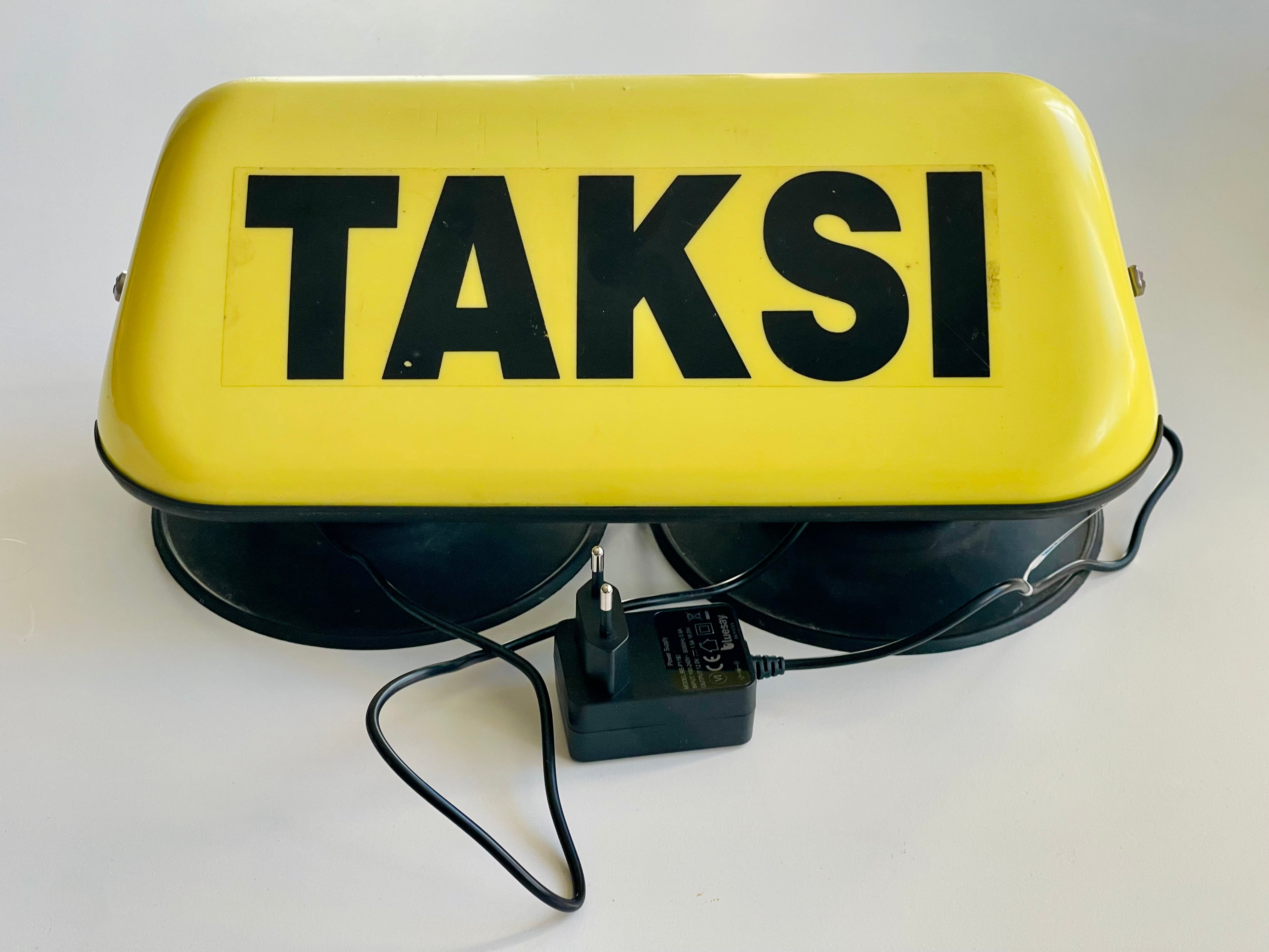 En gammal taxi-lampa omgjord till bordslampa. Har varit i användning på riktigt ute i trafiken, sedan rengjord och fått elen bytt. Förekommer således små repor och liknande, men överlag i jättefint skick.