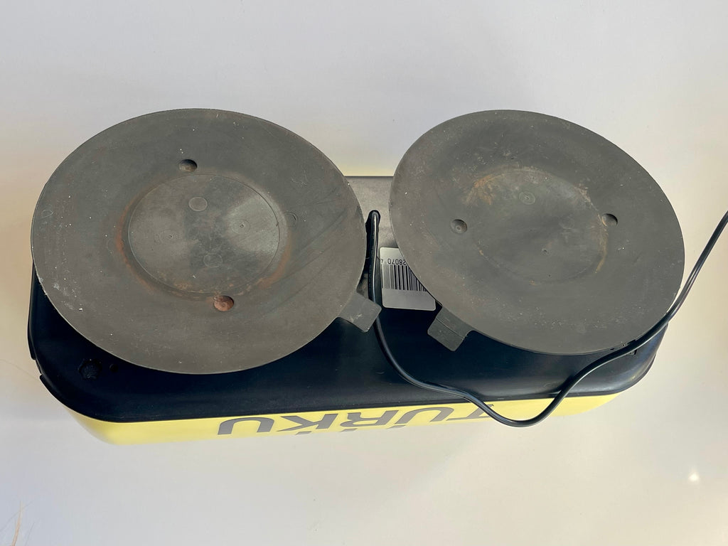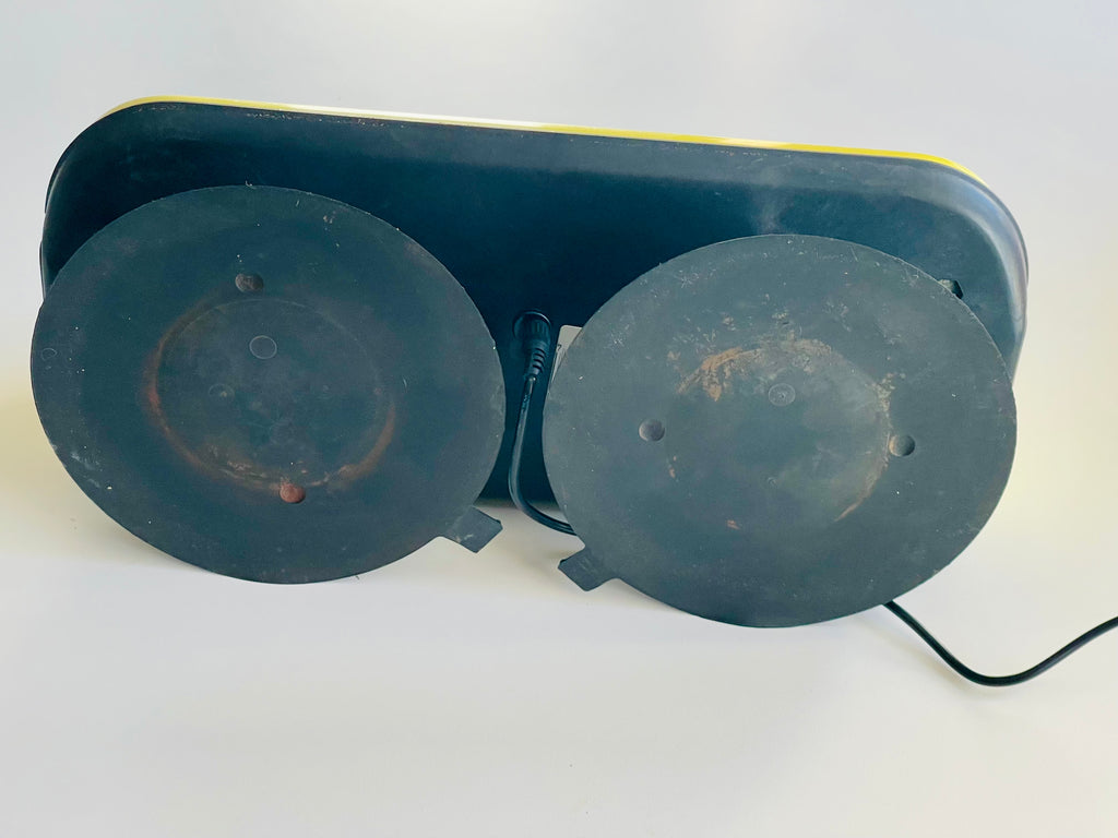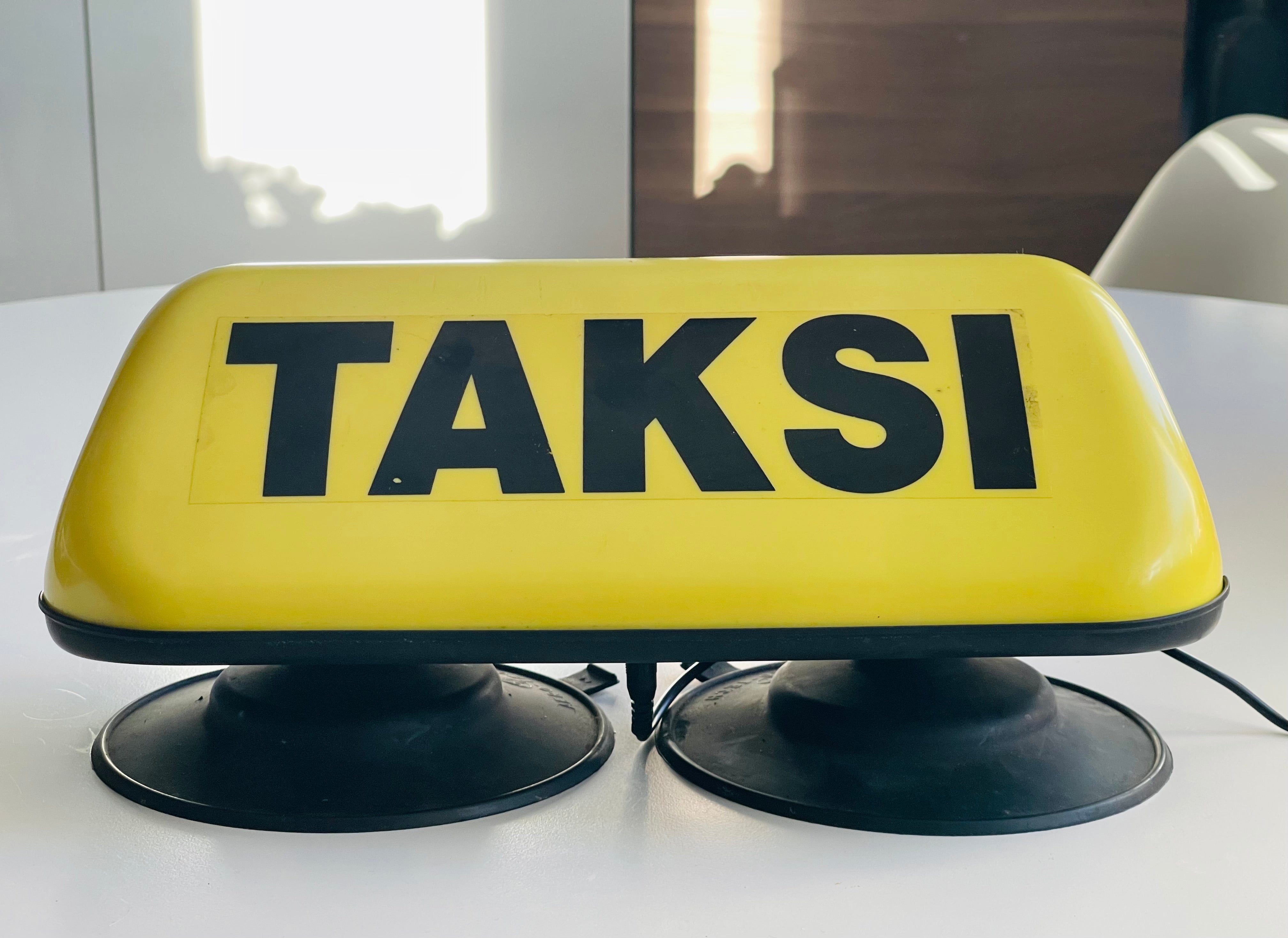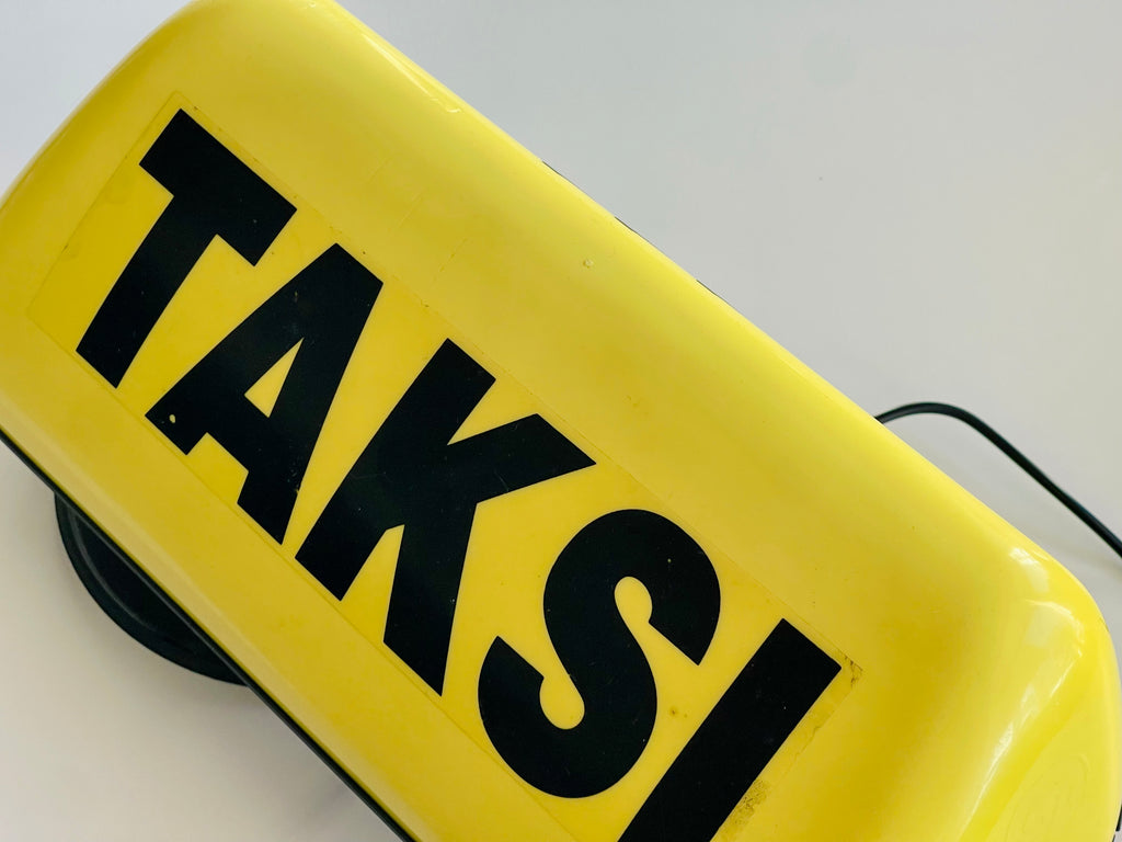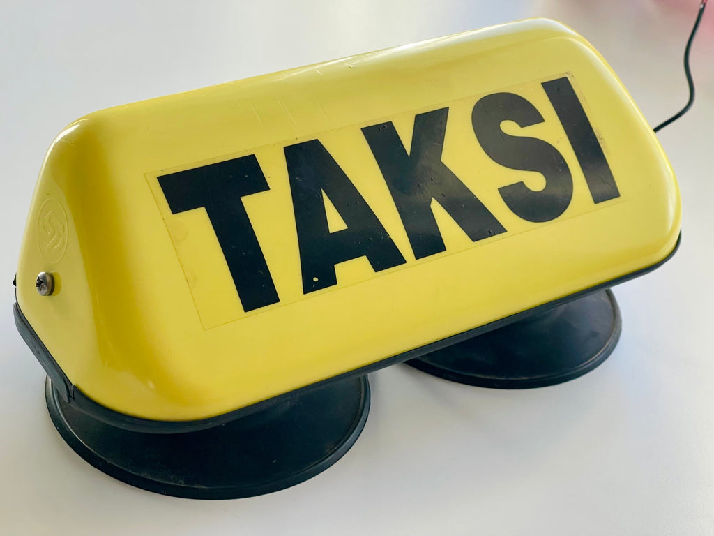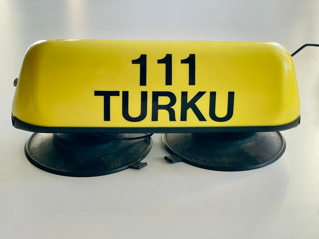 En gammal taxi-lampa omgjord till bordslampa. Har varit i användning på riktigt ute i trafiken, sedan rengjord och fått elen bytt. Förekommer således små repor och liknande, men överlag i jättefint skick.