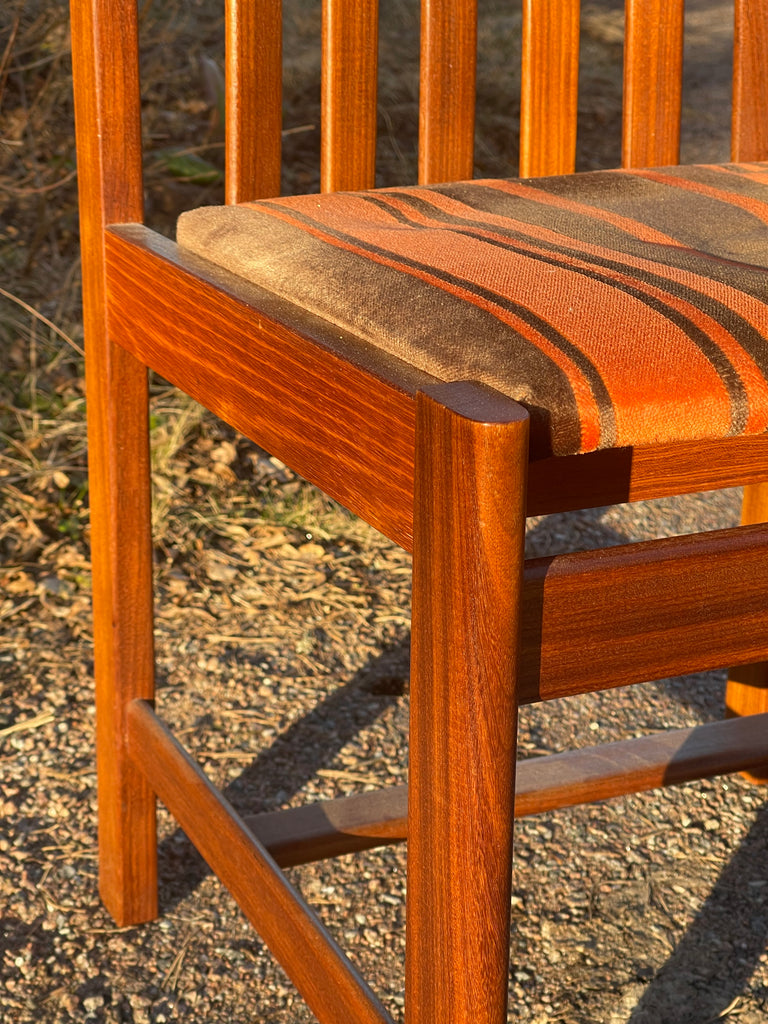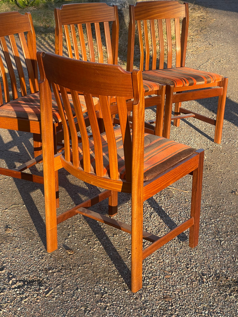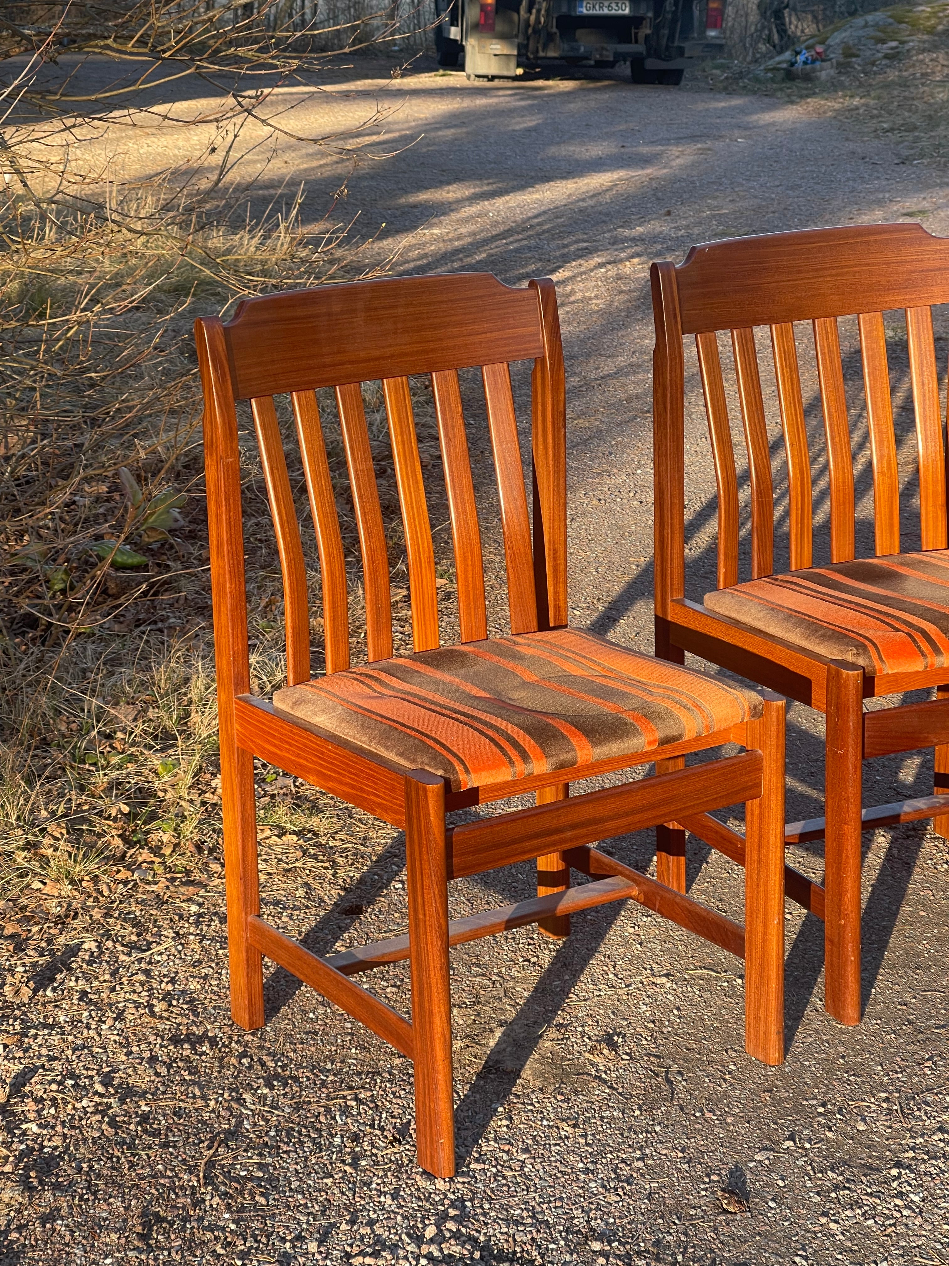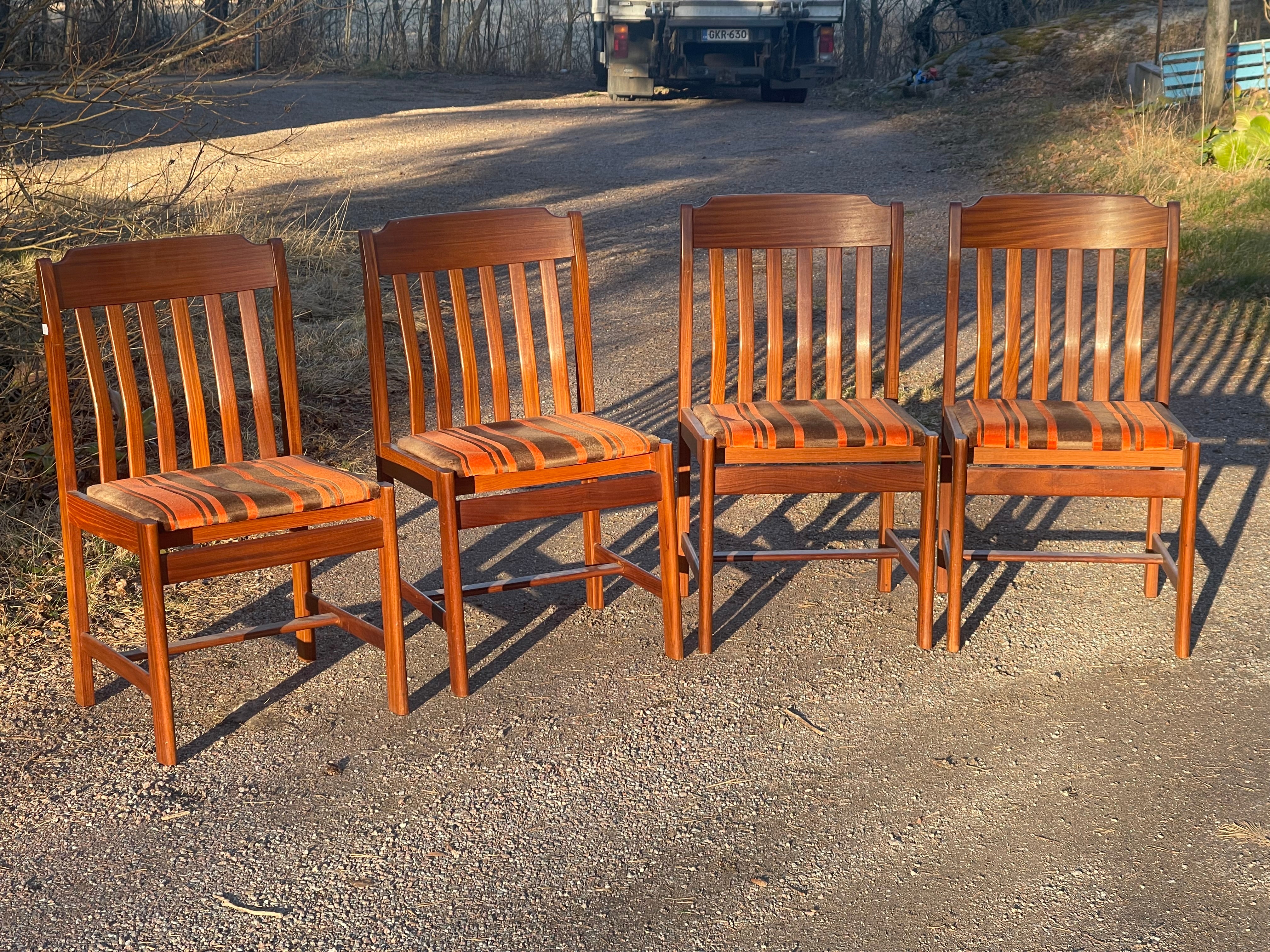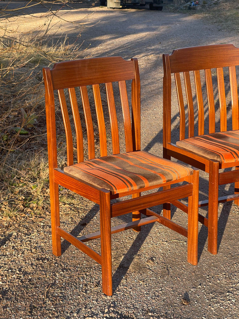 Stolar i teak, stadiga och i gott skick. Enkelt att byta sitsens tyg till någonting mer passande.