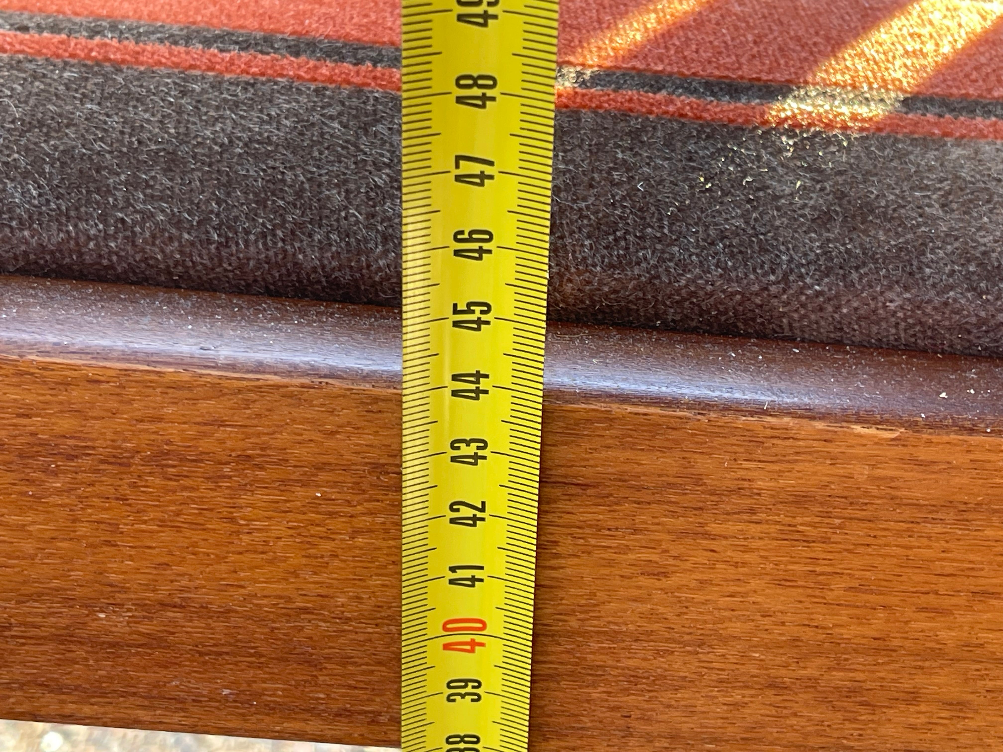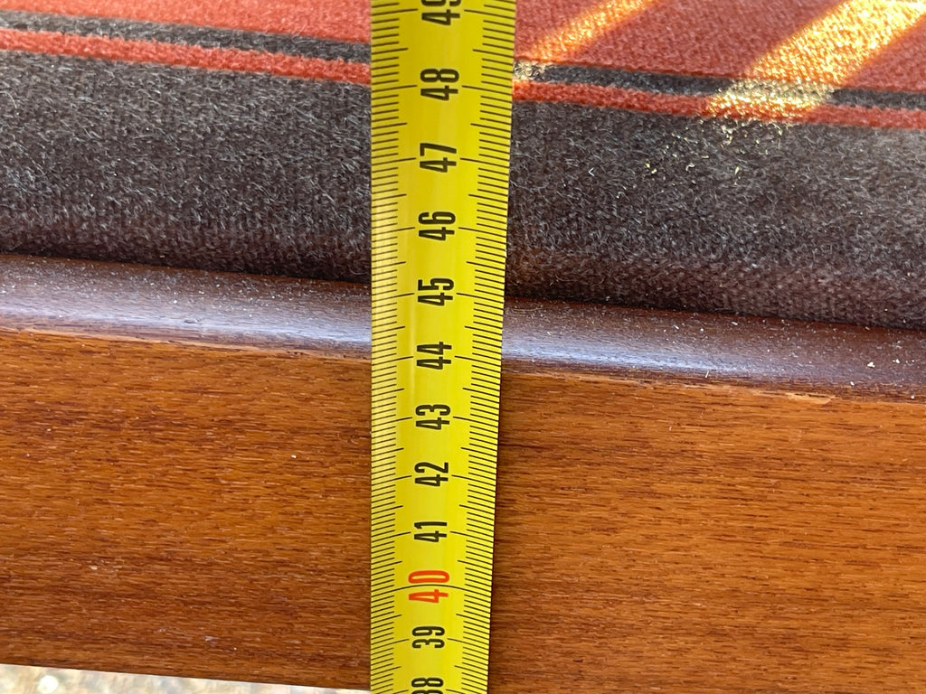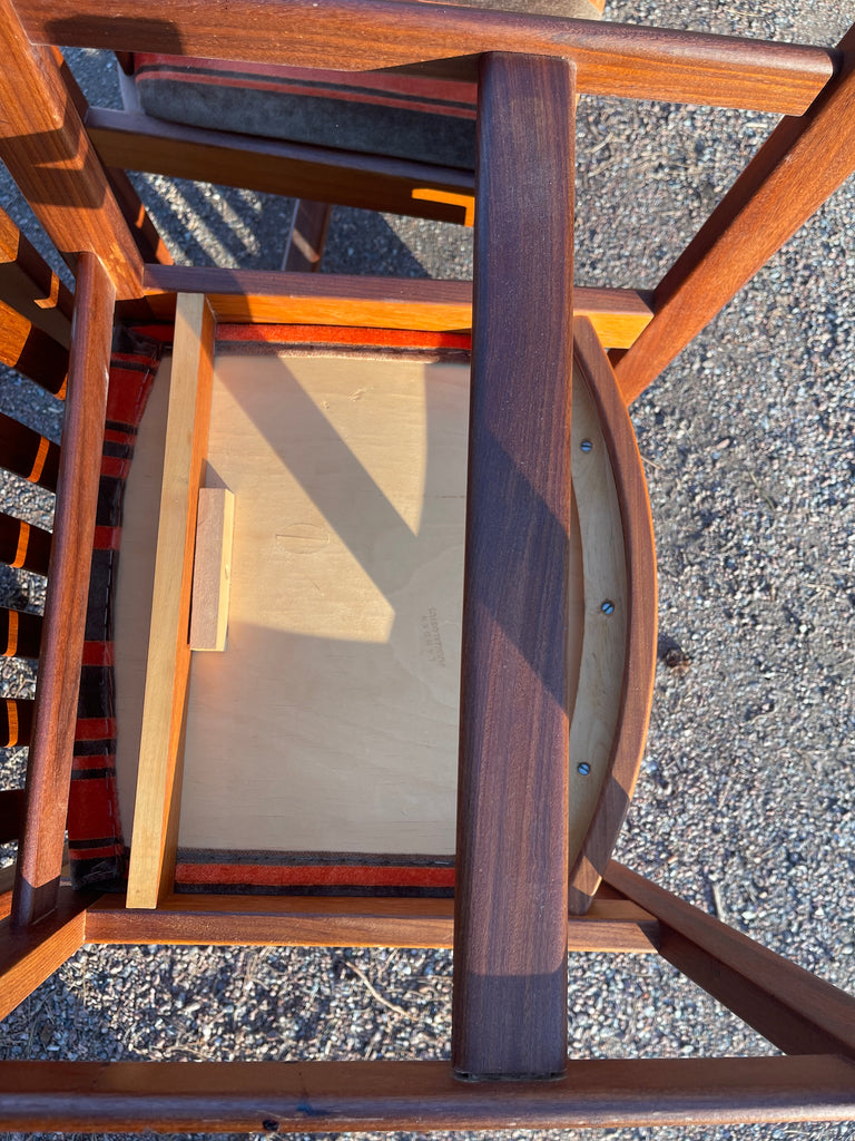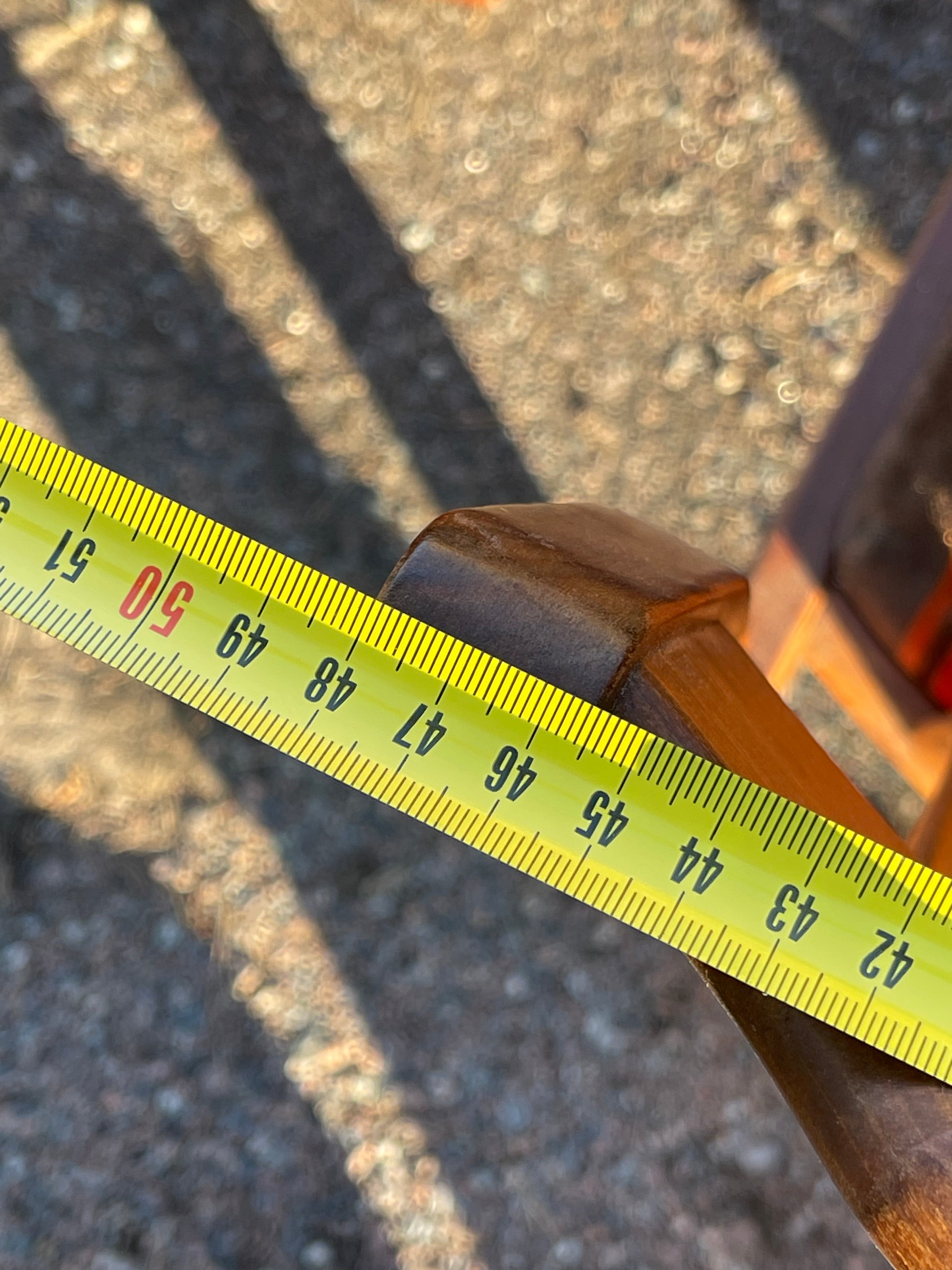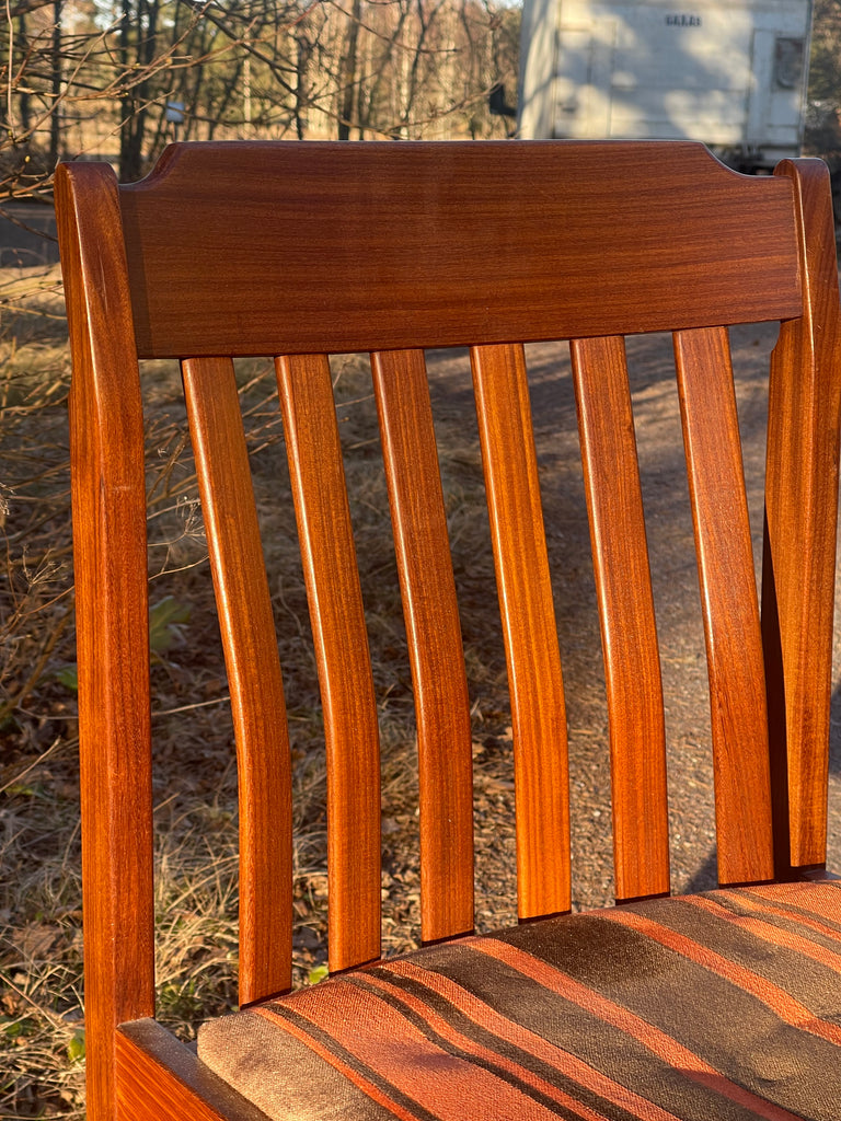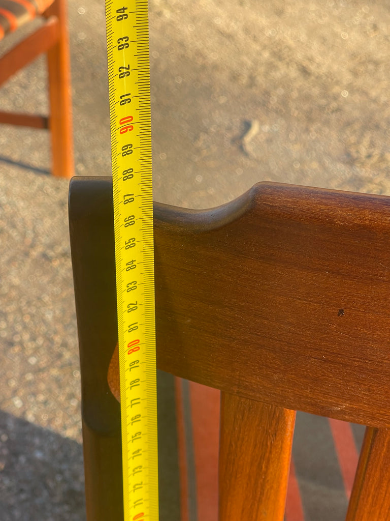 Stolar i teak, stadiga och i gott skick. Enkelt att byta sitsens tyg till någonting mer passande.